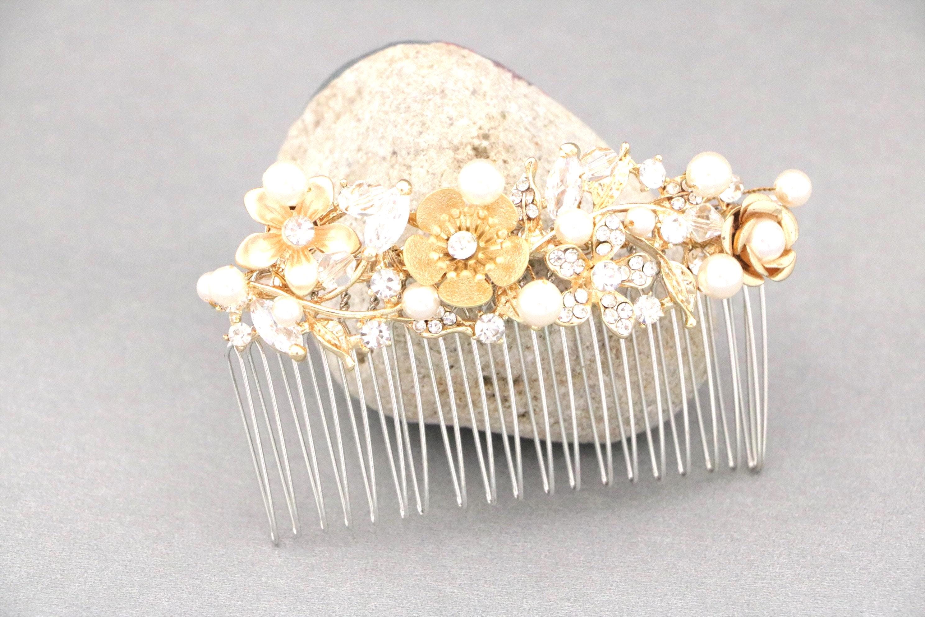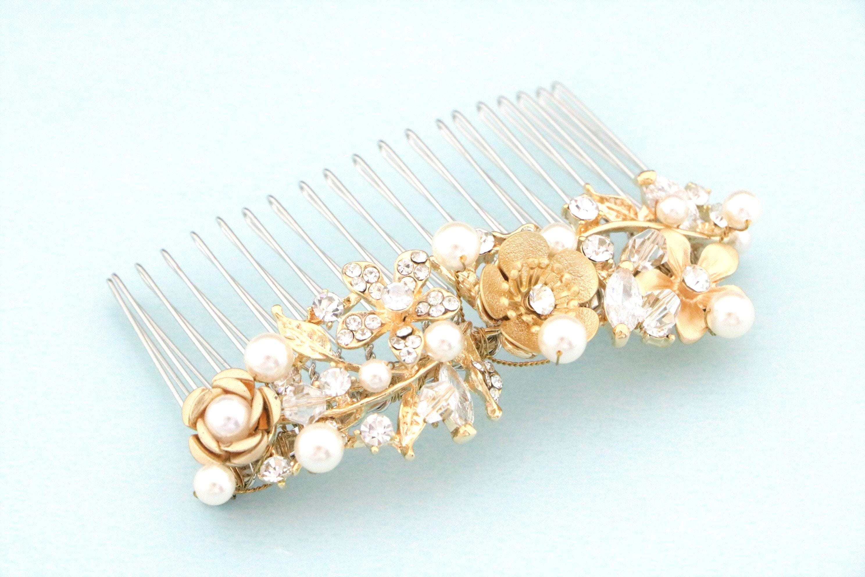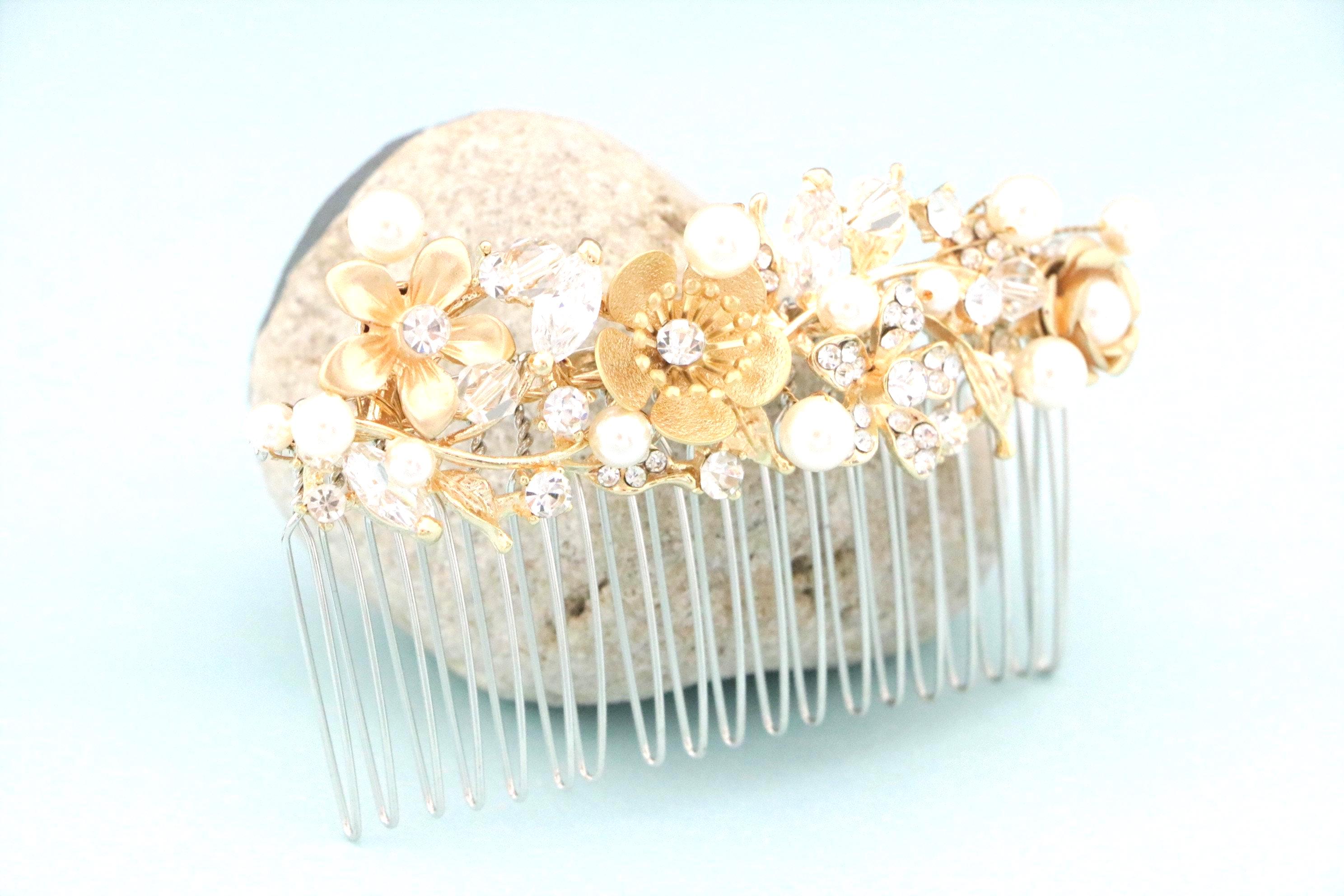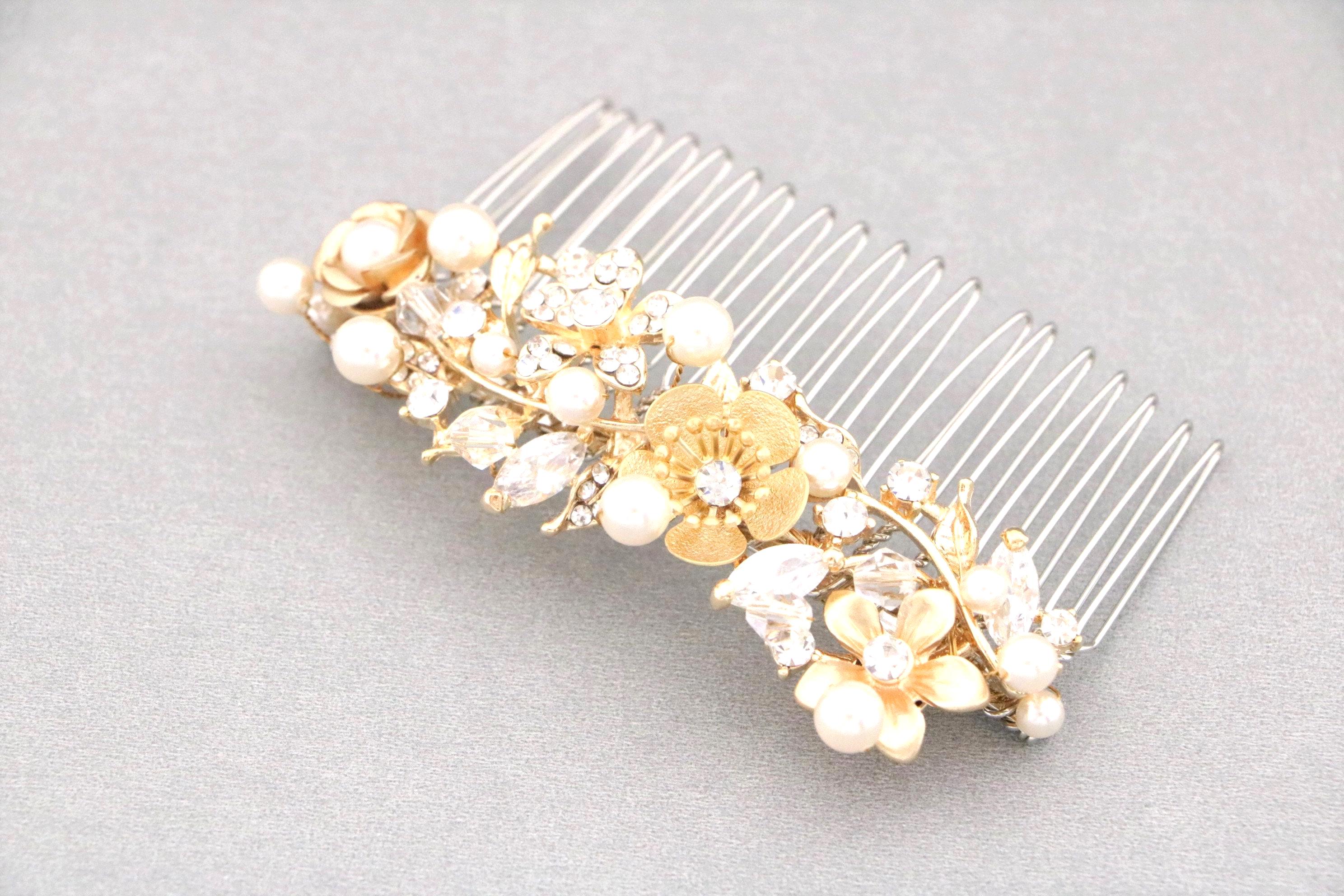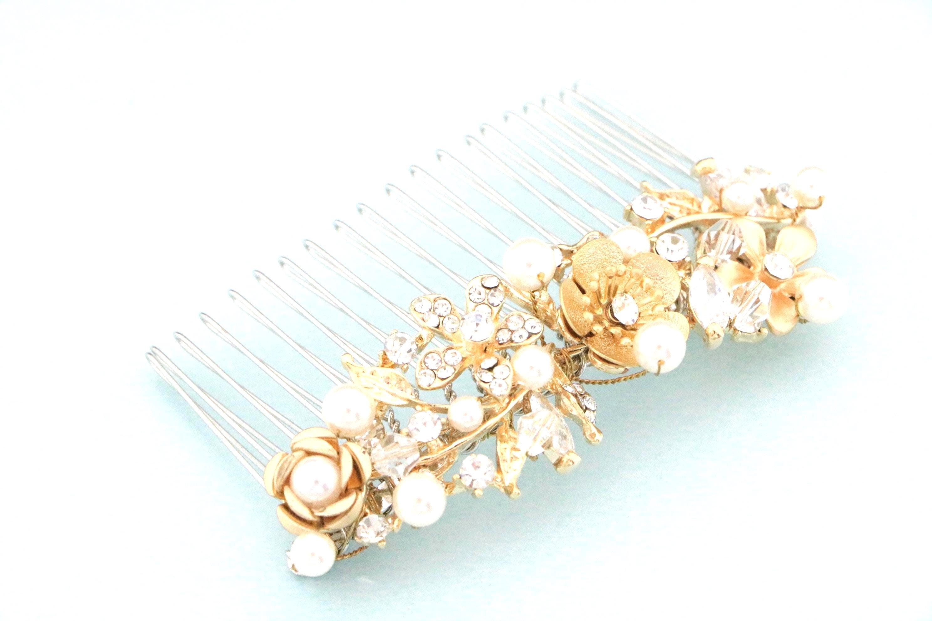This sparkle Gold rhinestone hair comb features a very beautiful vintage style rhinestone piece and Swarovski pearls. Gold Rhinestone piece and pearls are set on a silver tone metal comb. The rhinestone part measures approximately 3.5 X 1 inches.