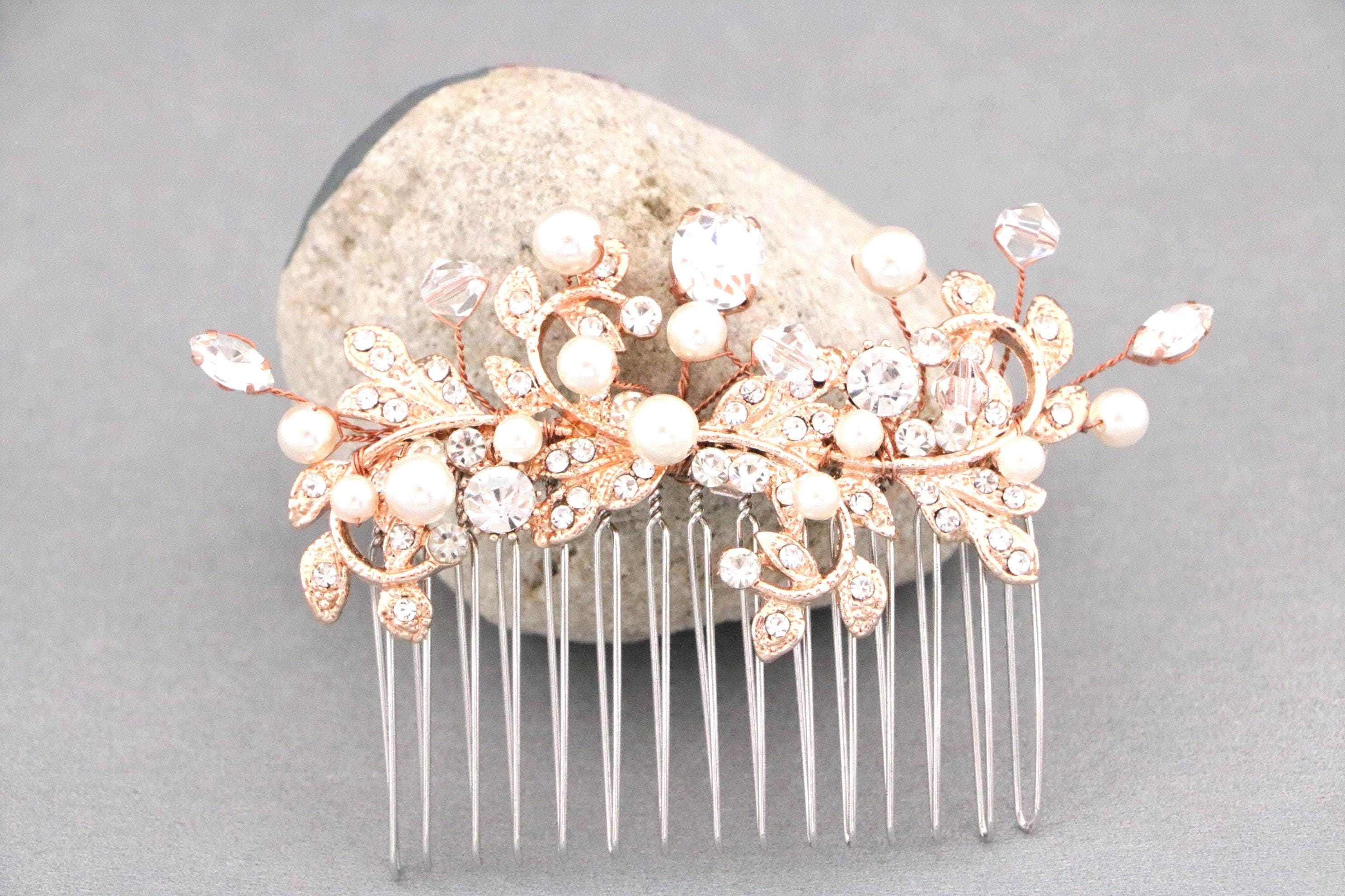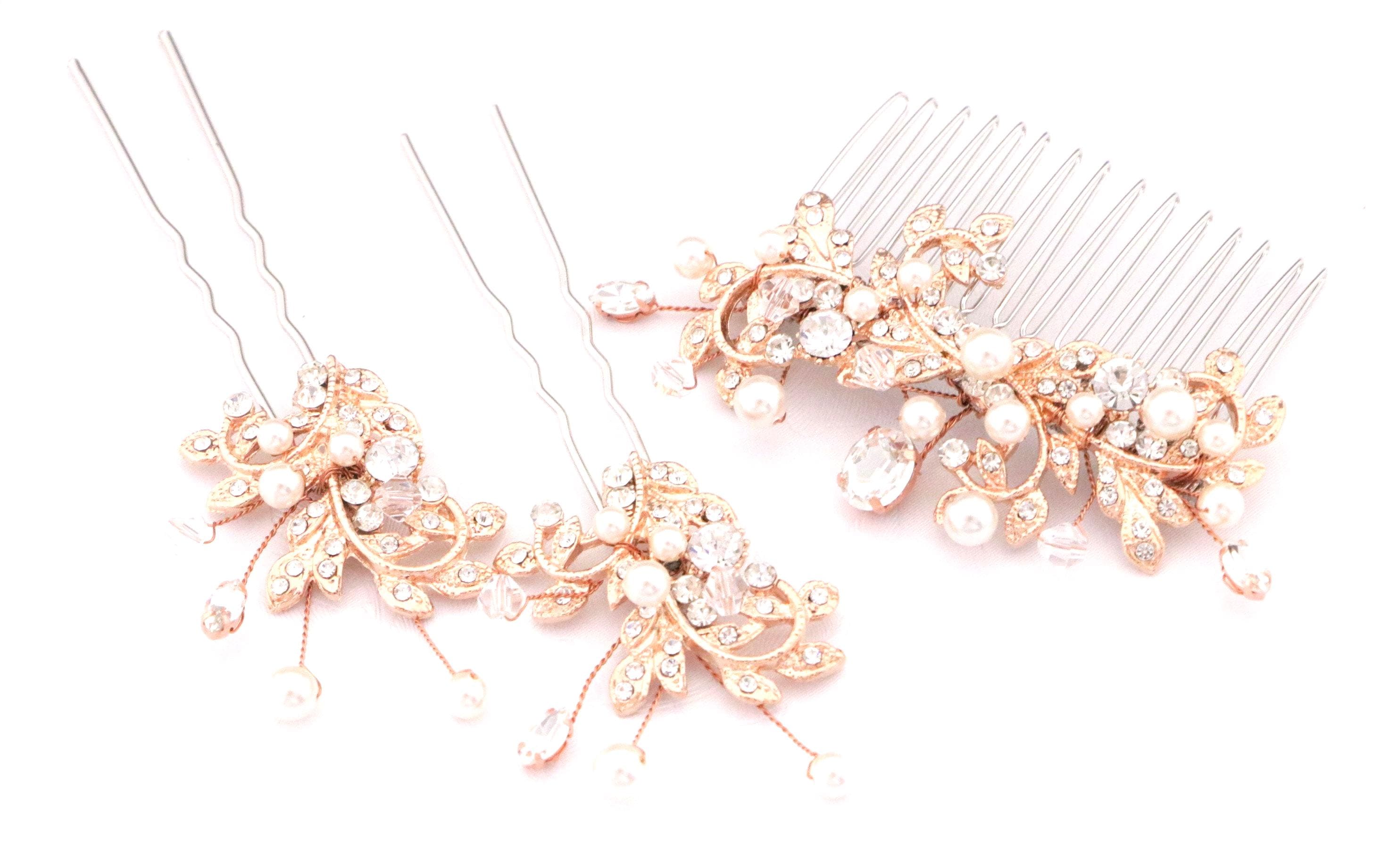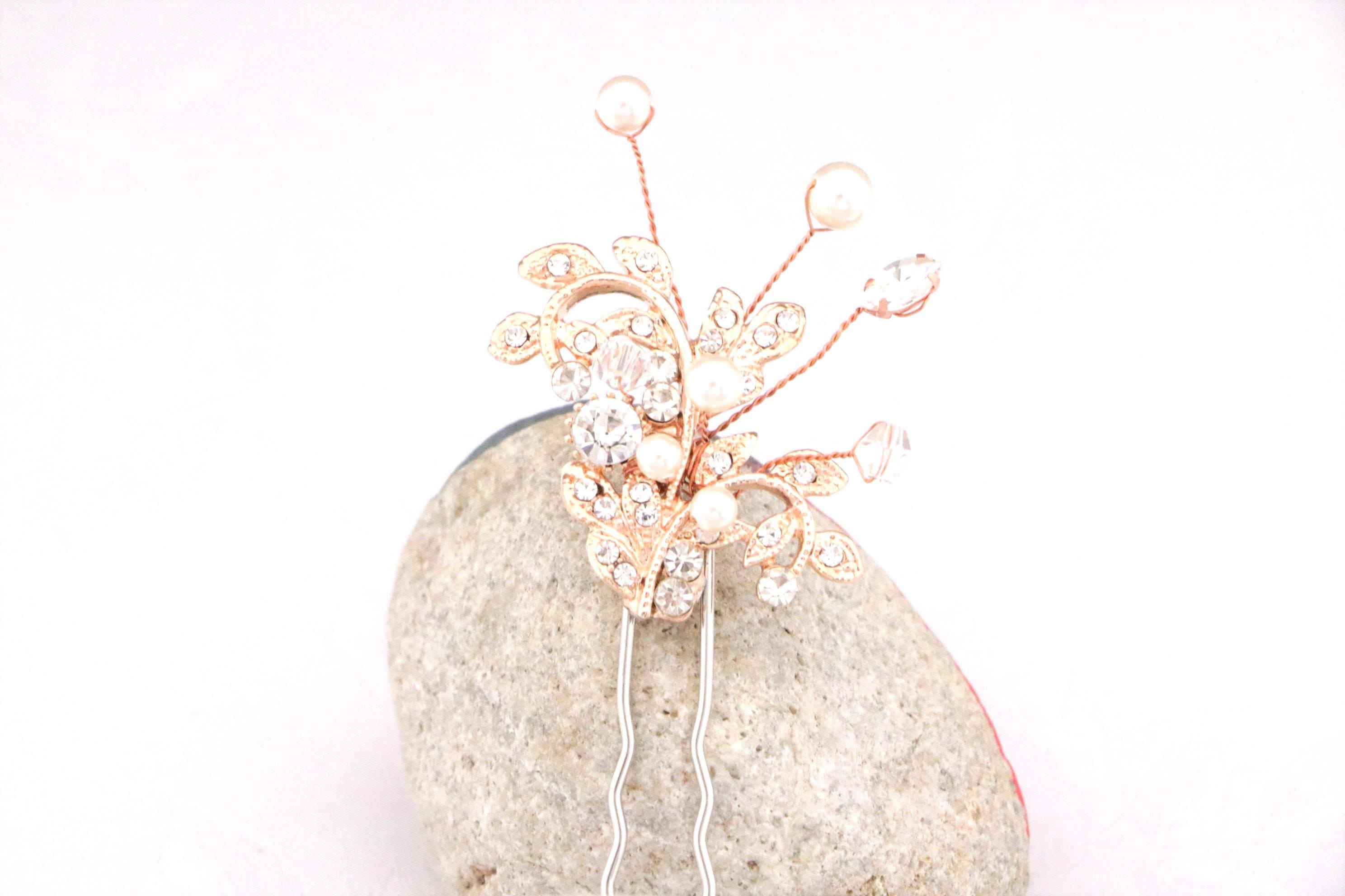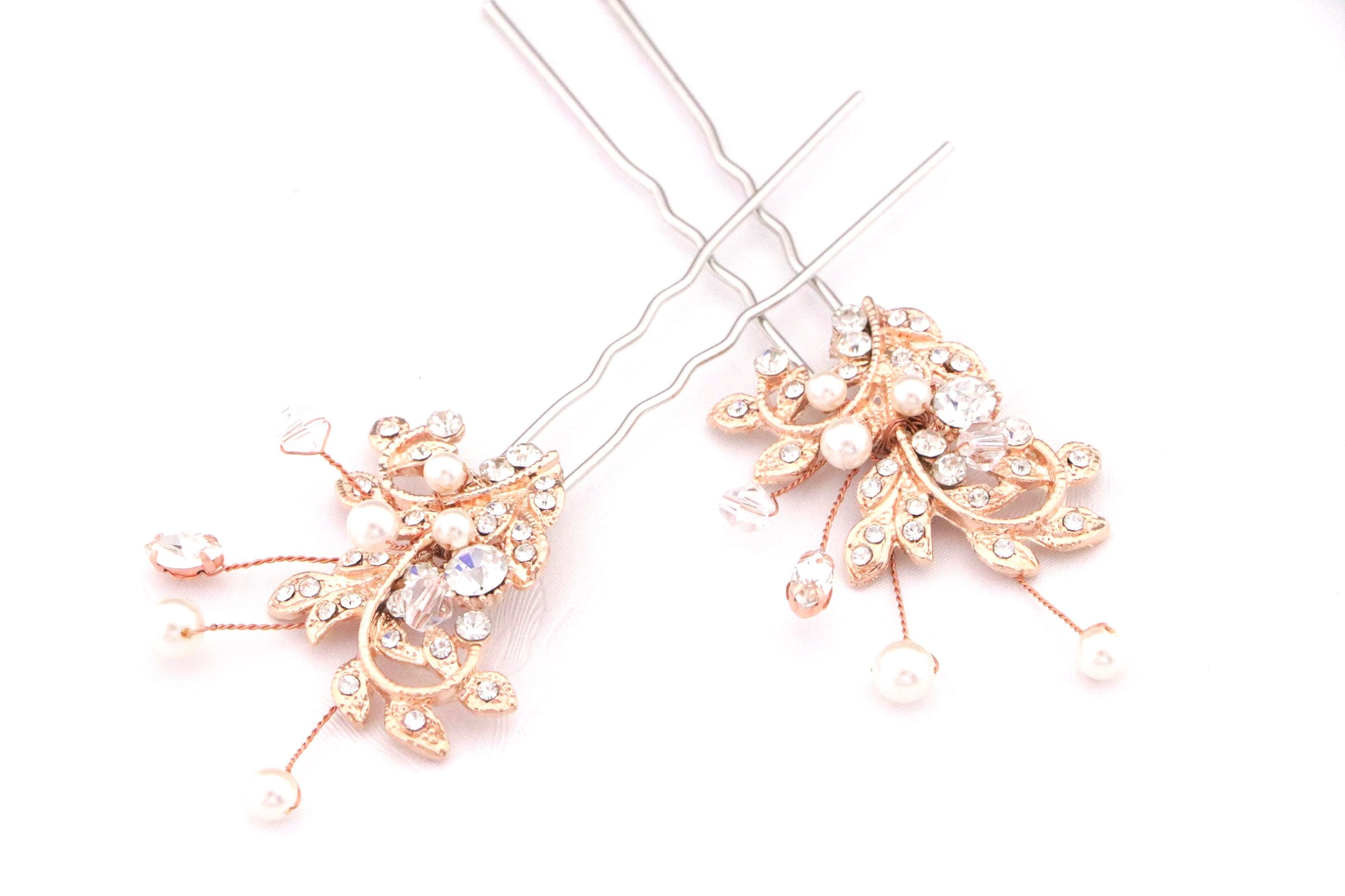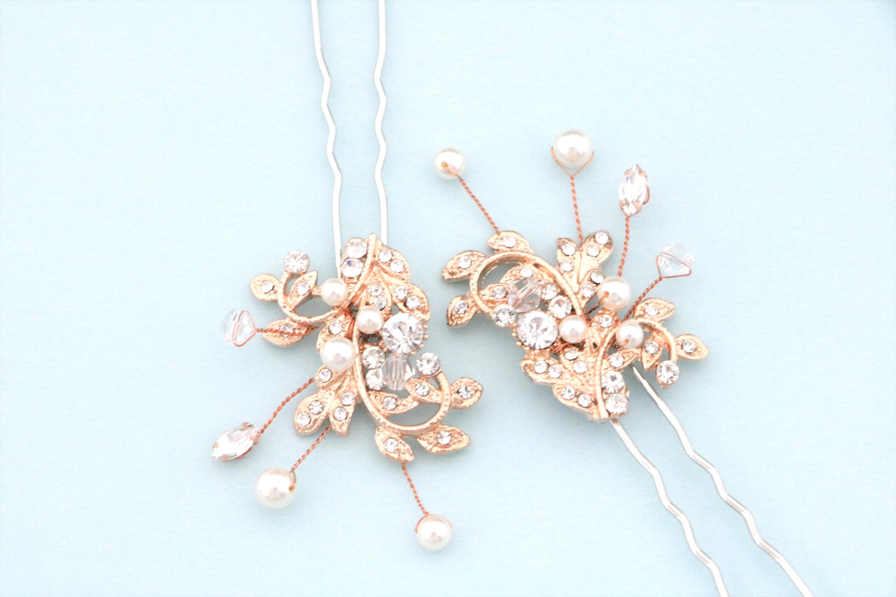 Set of 2 This beautiful Clear rhinestone and Rose Gold tone flower hair pin is a perfect compliment for the wedding party and can easily fit into any hair style.