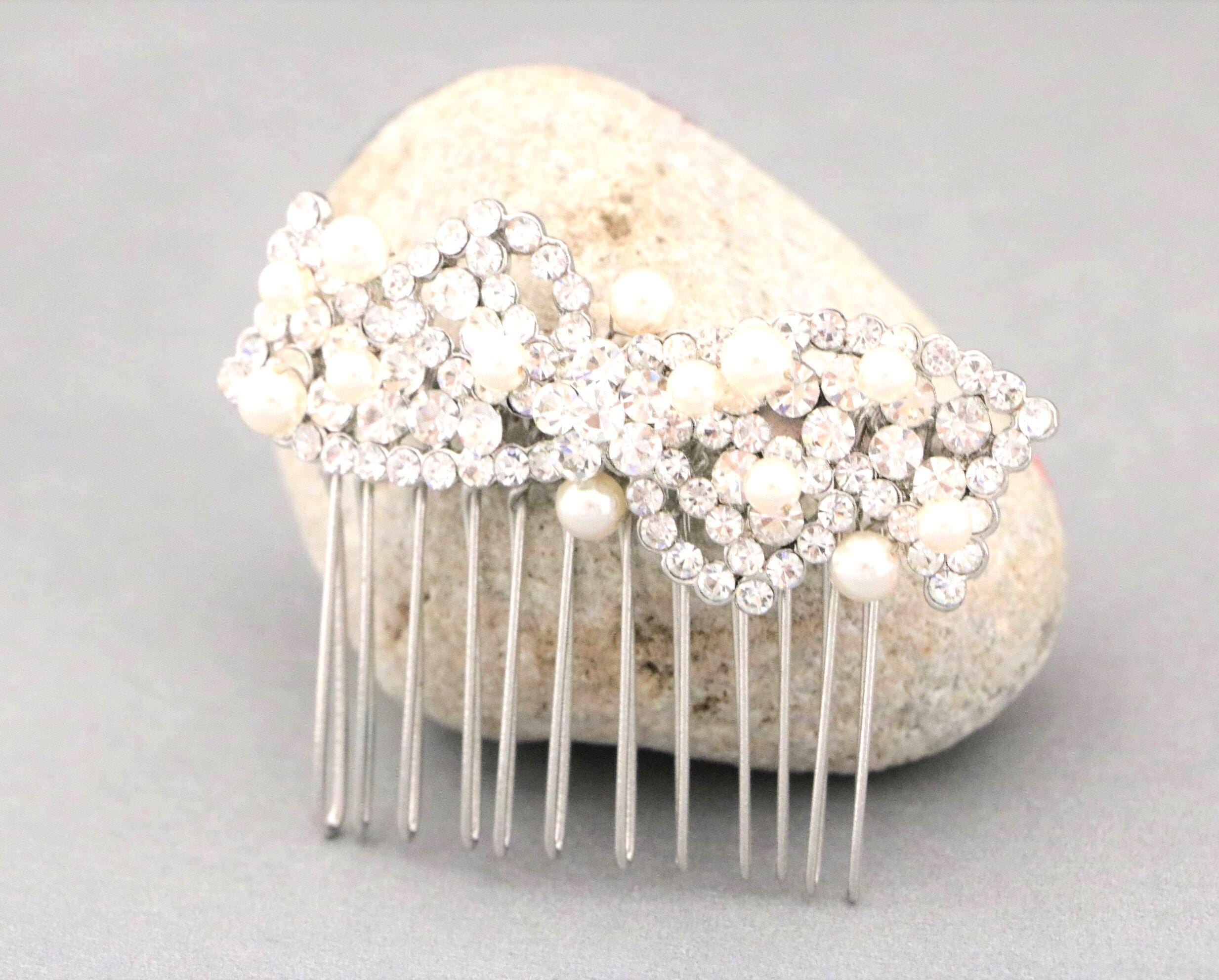 This sparkle rhinestone hair comb features a very beautiful vintage style rhinestone piece and Swarovski ivory pearls. Rhinestone piece and pearls are wired on a silver tone metal comb. The rhinestone part measures approximately 2.5 X 1 inches.