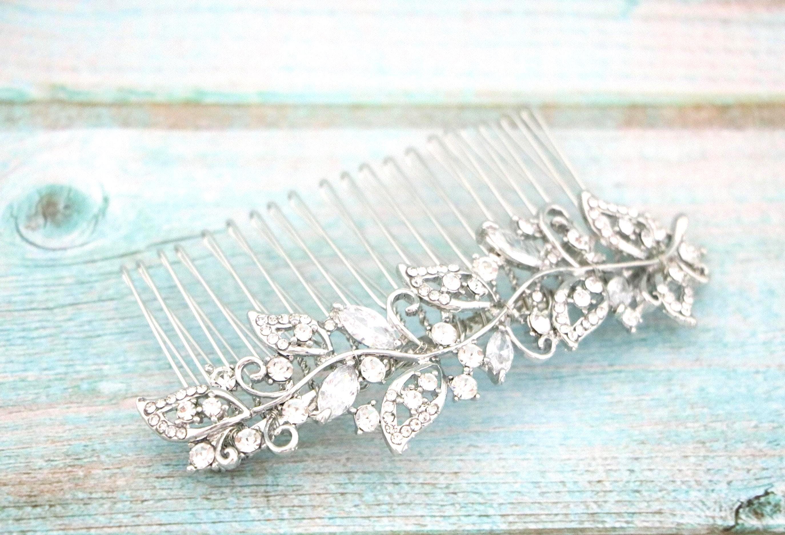 This sparkle rhinestone hair comb features a very beautiful vintage style rhinestone piece. Rhinestone piece can set on a metal barrette or on a metal hair comb. The rhinestone part measures approximately 3.75 X 1 inches.