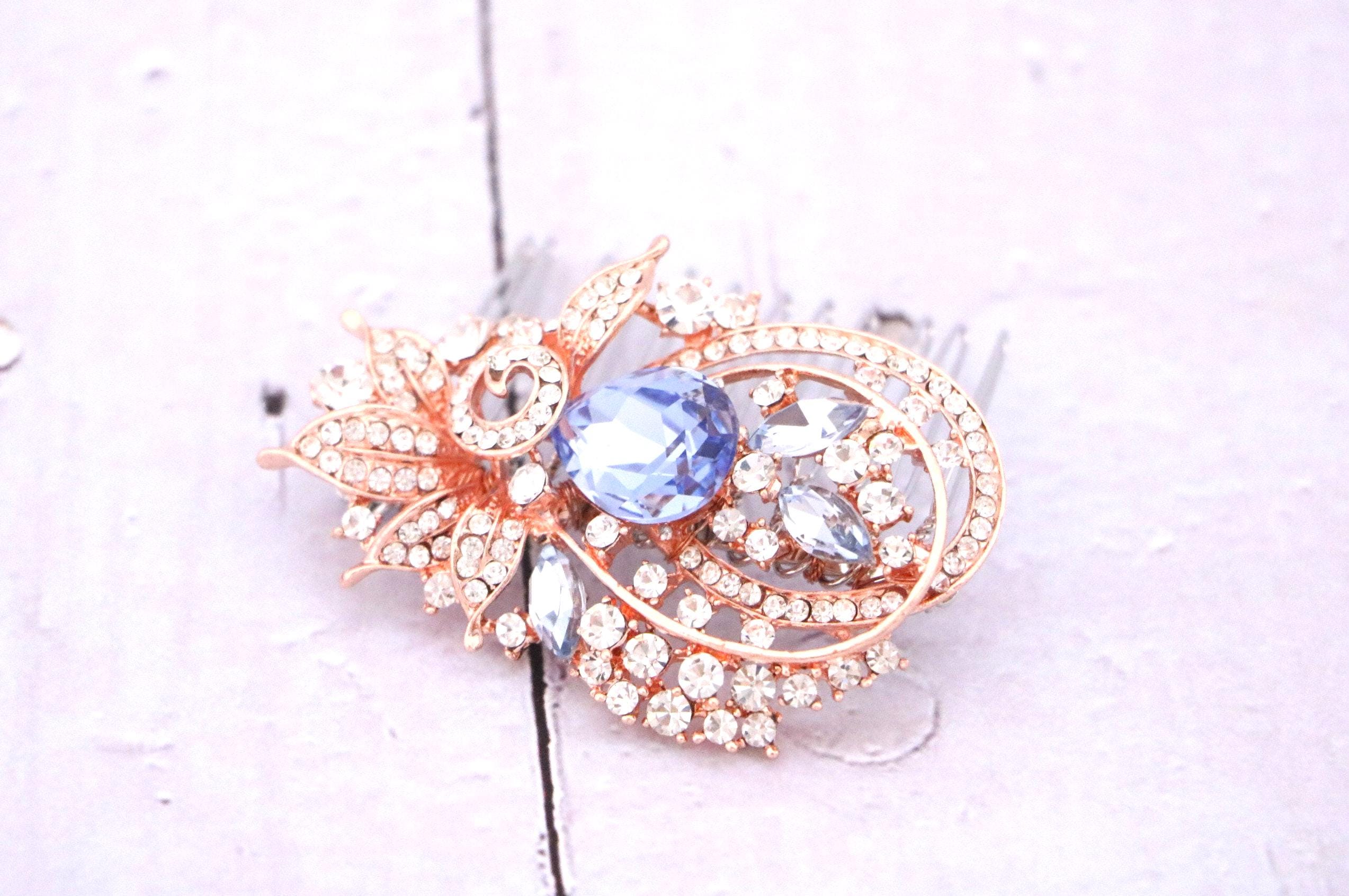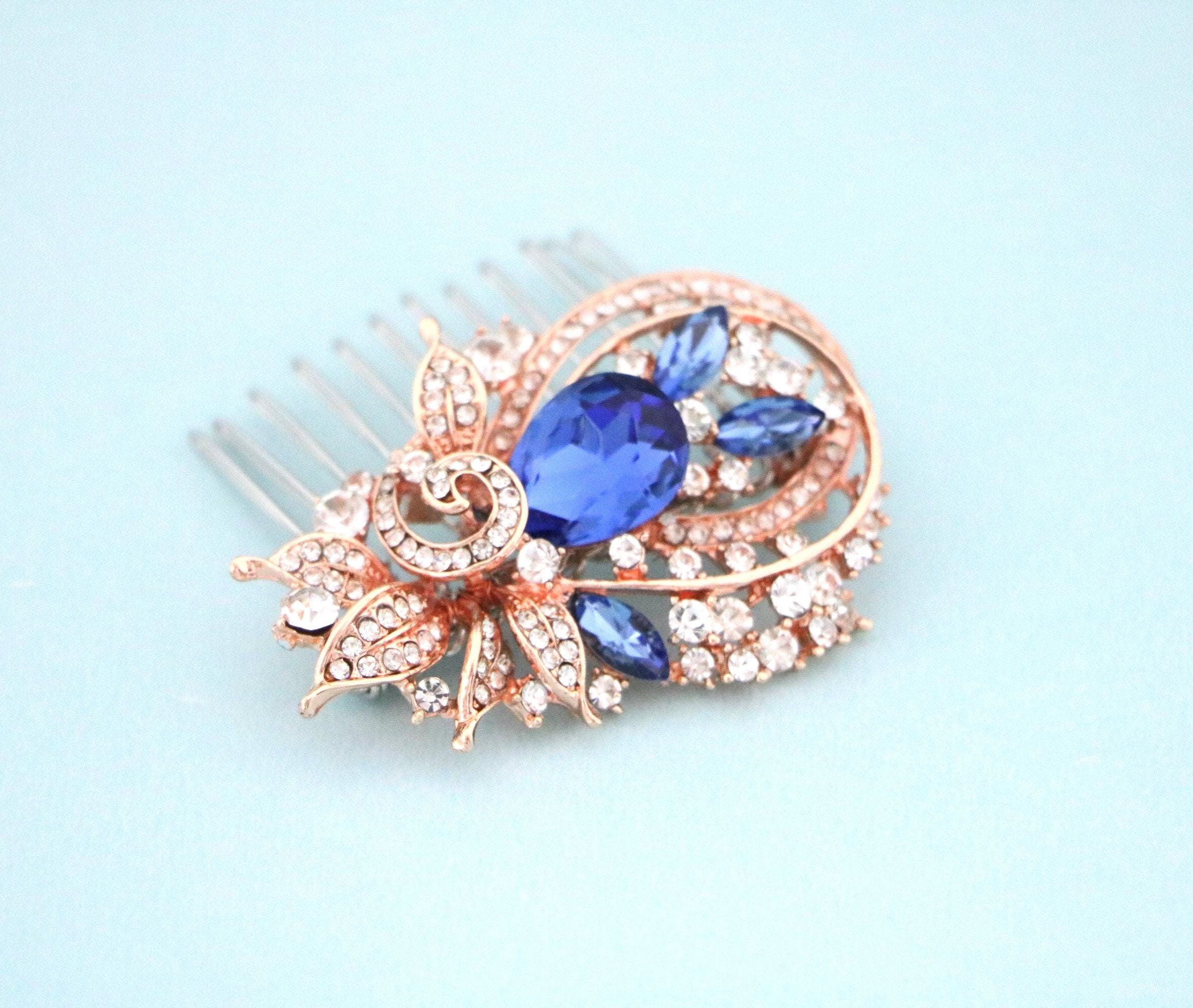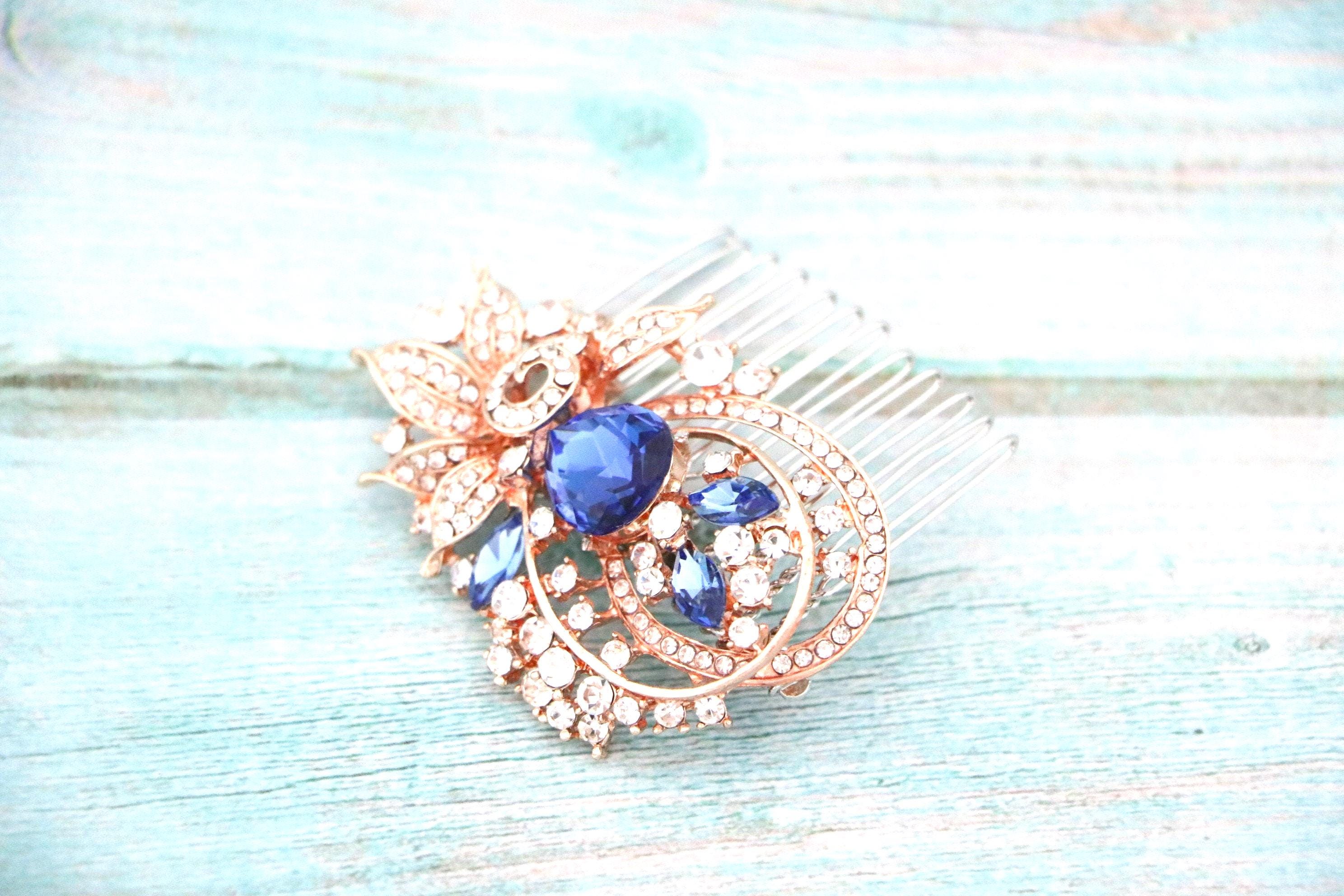 Bridal Sapphire Blue Crystals Rose Gold OR Silver Hair Comb Vine Wedding Jewelry Flowers