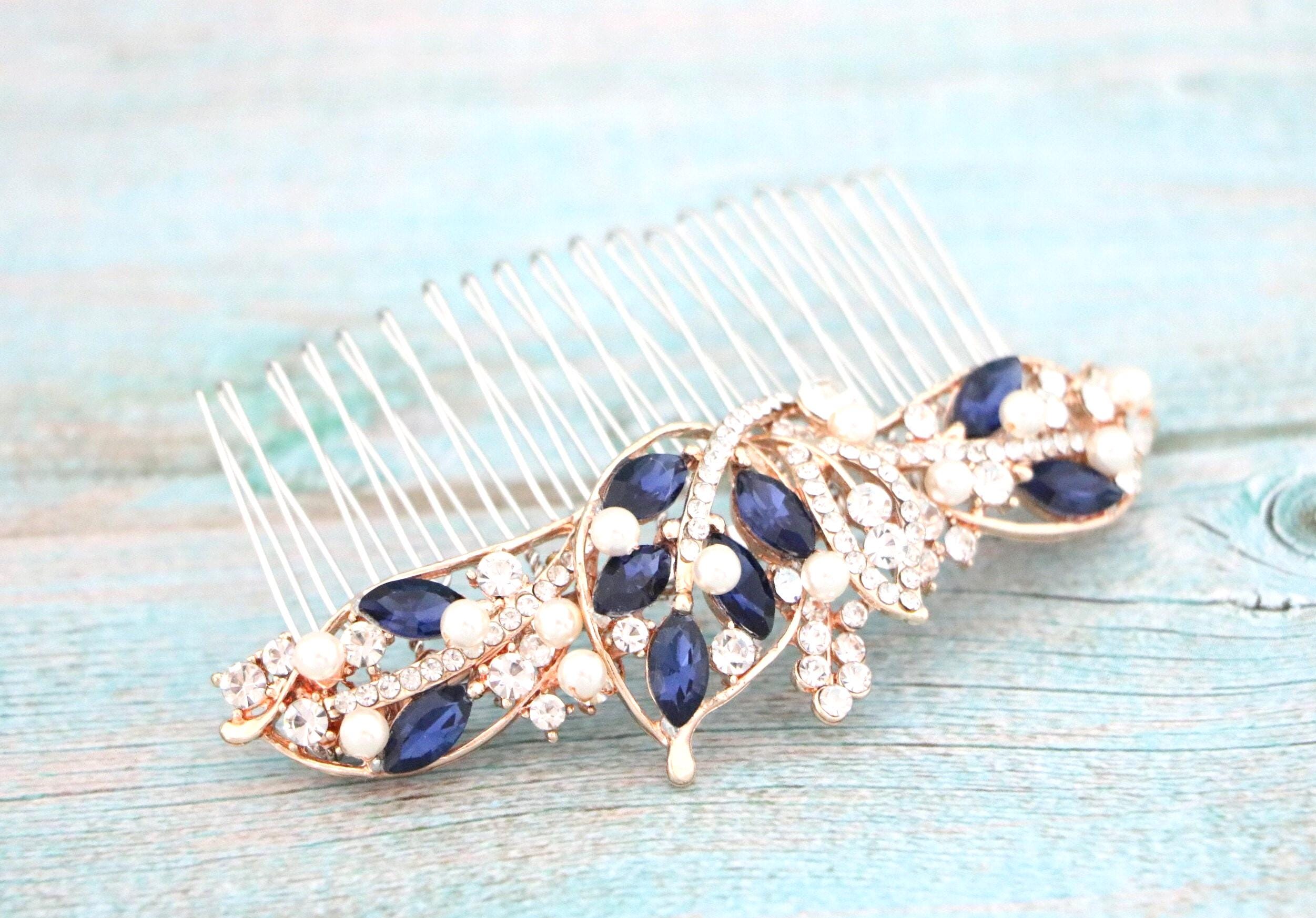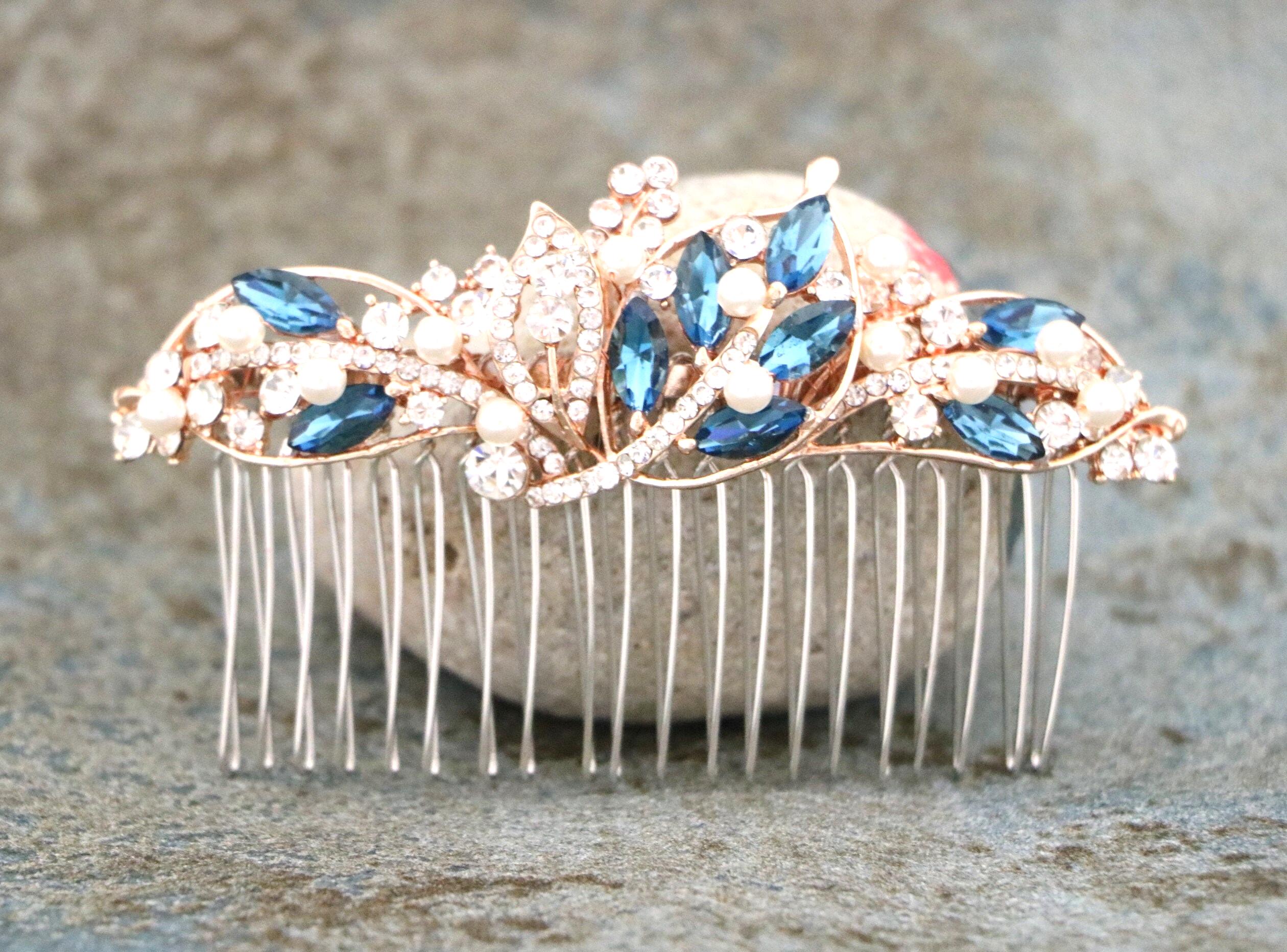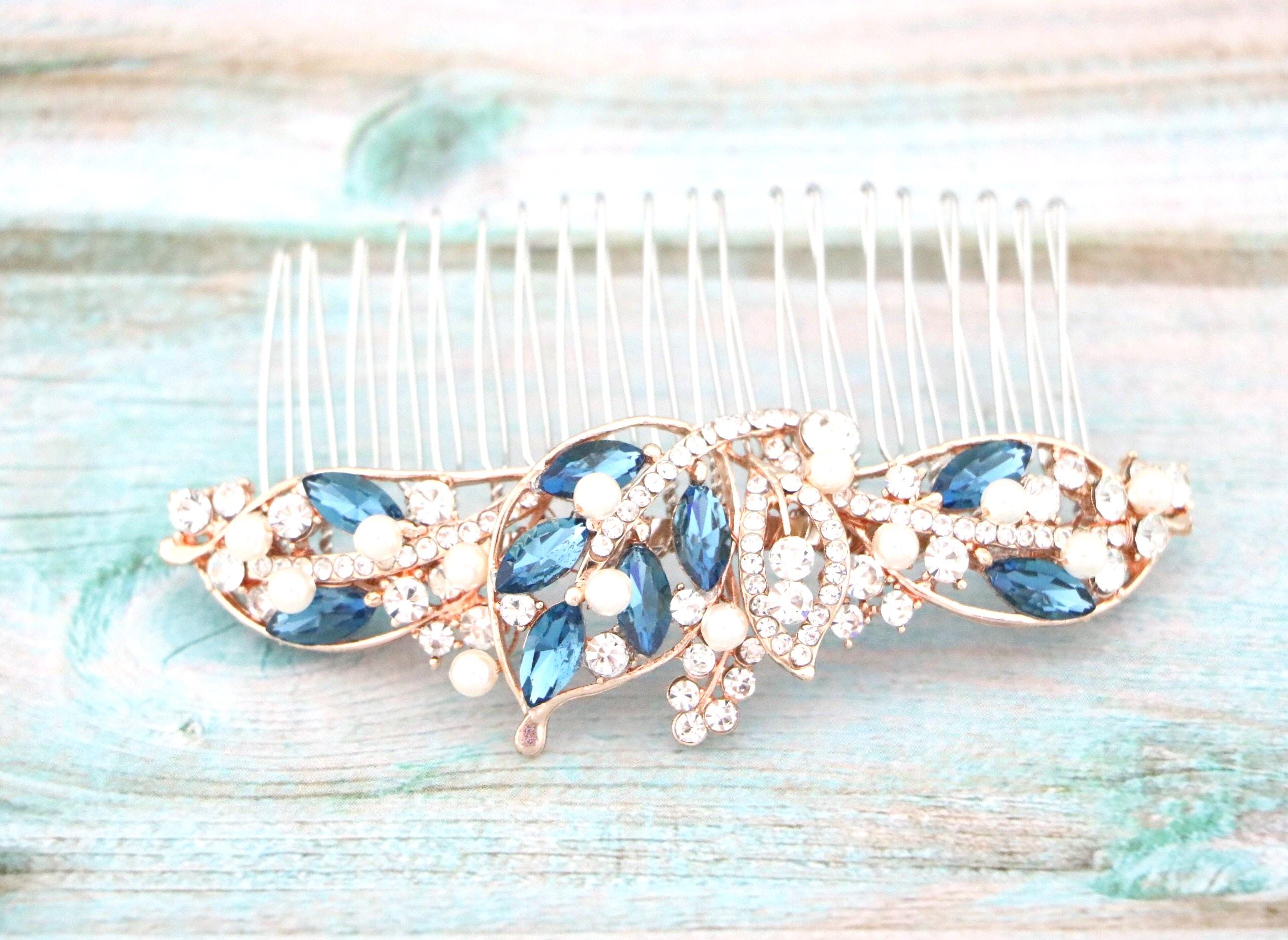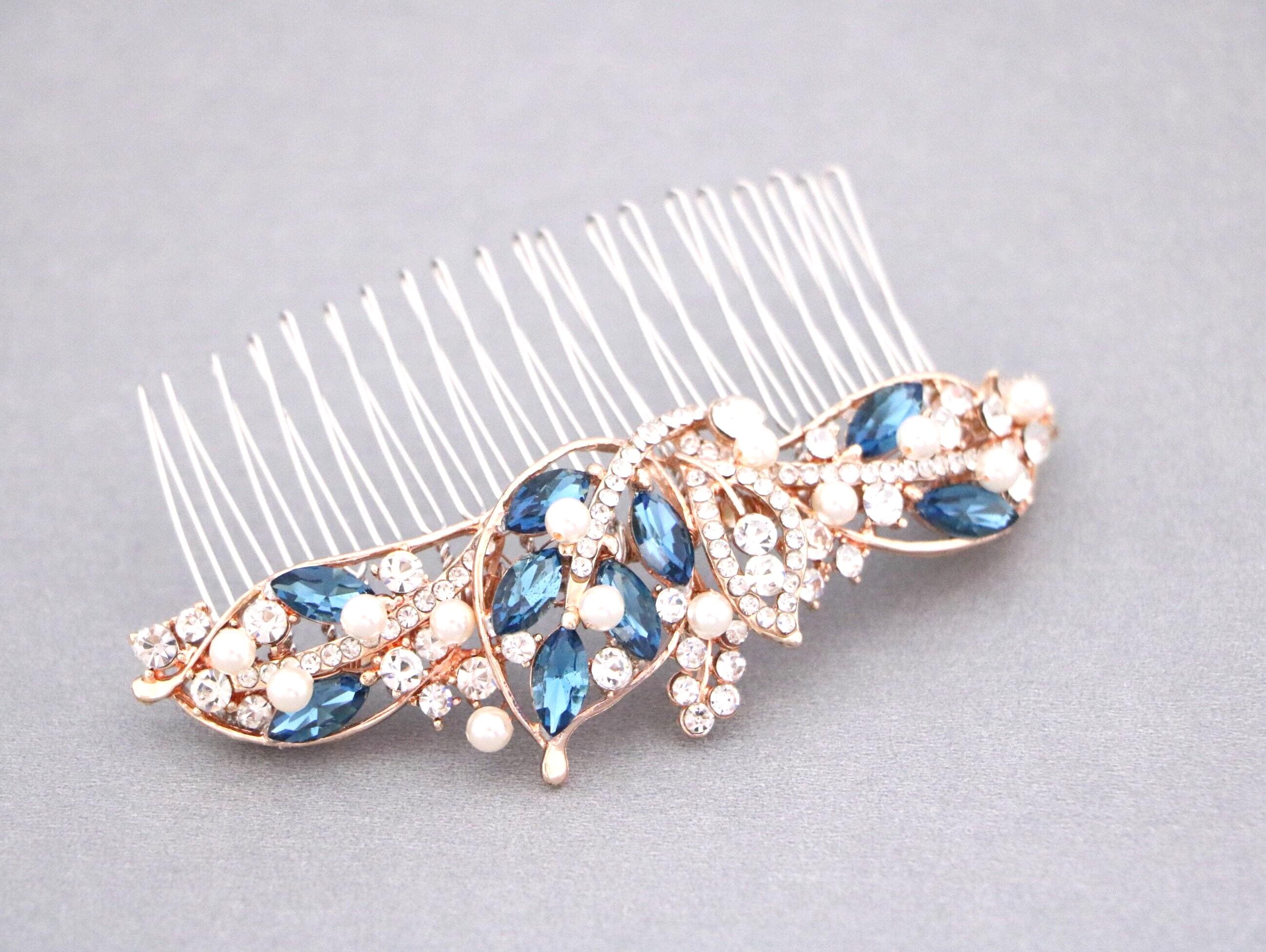 Victorian Style Bridal Hair Accessories, BLUE Swarovski Crystal Wedding Hair Comb, Pearl and Rhinestone Rose Flower Hair Accessories