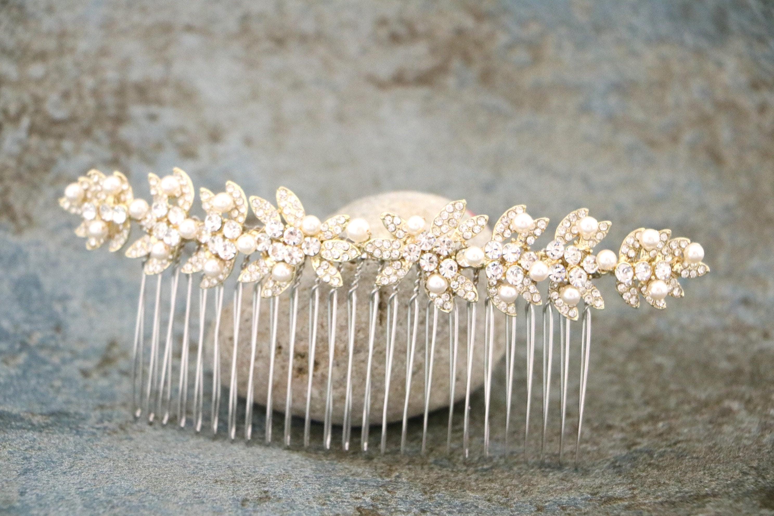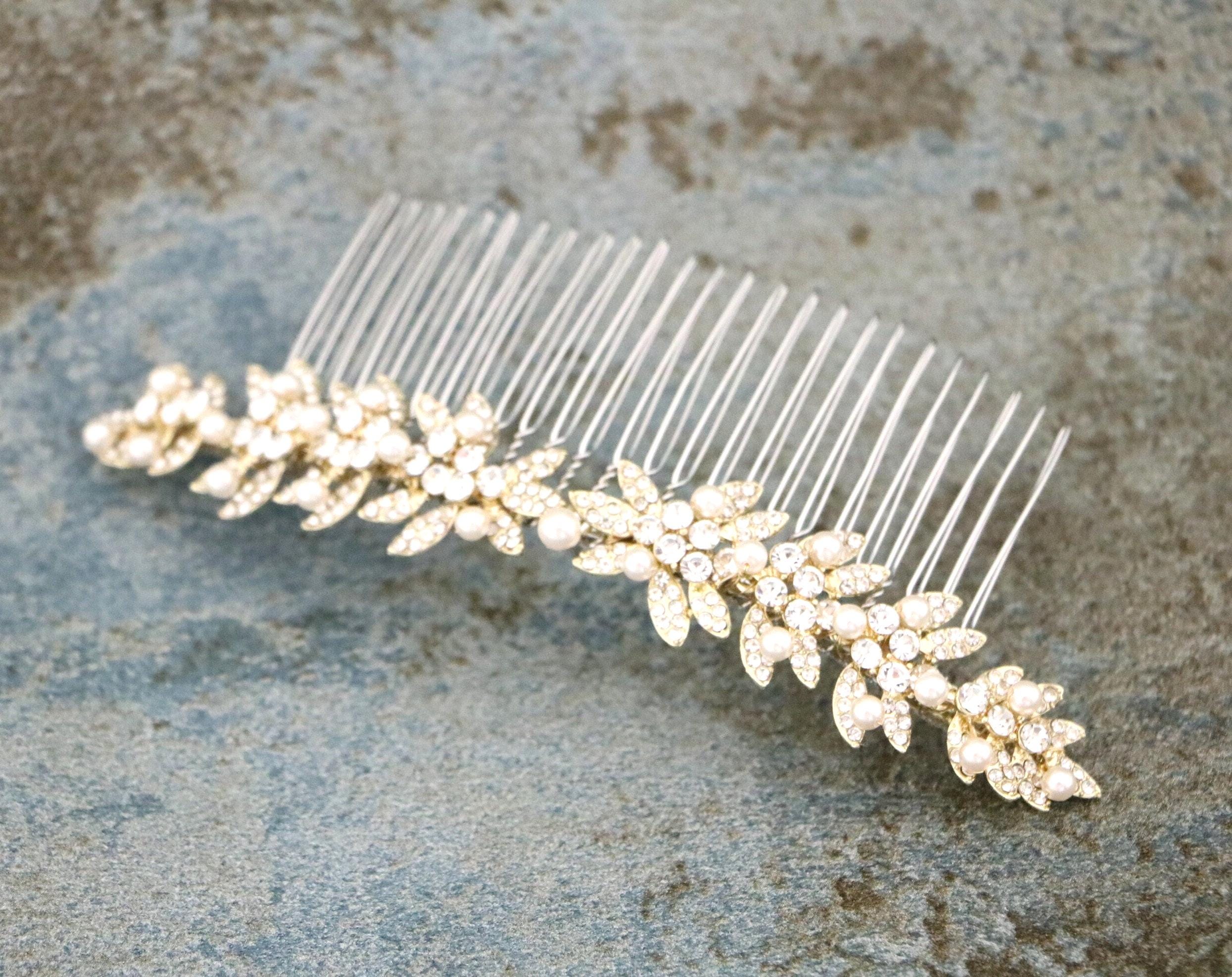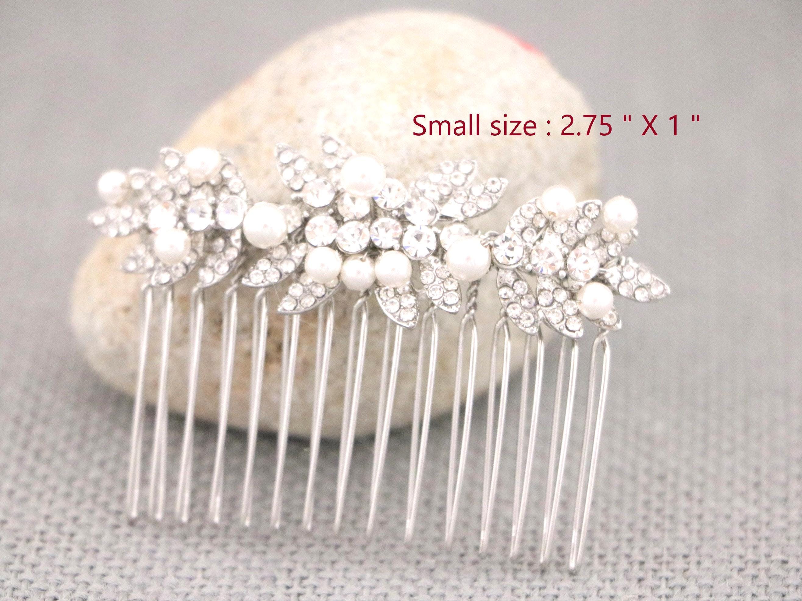 This beautiful Clear rhinestone Swarovski pearl hair comb is a perfect compliment for the wedding party and can easily fit into any hair style.