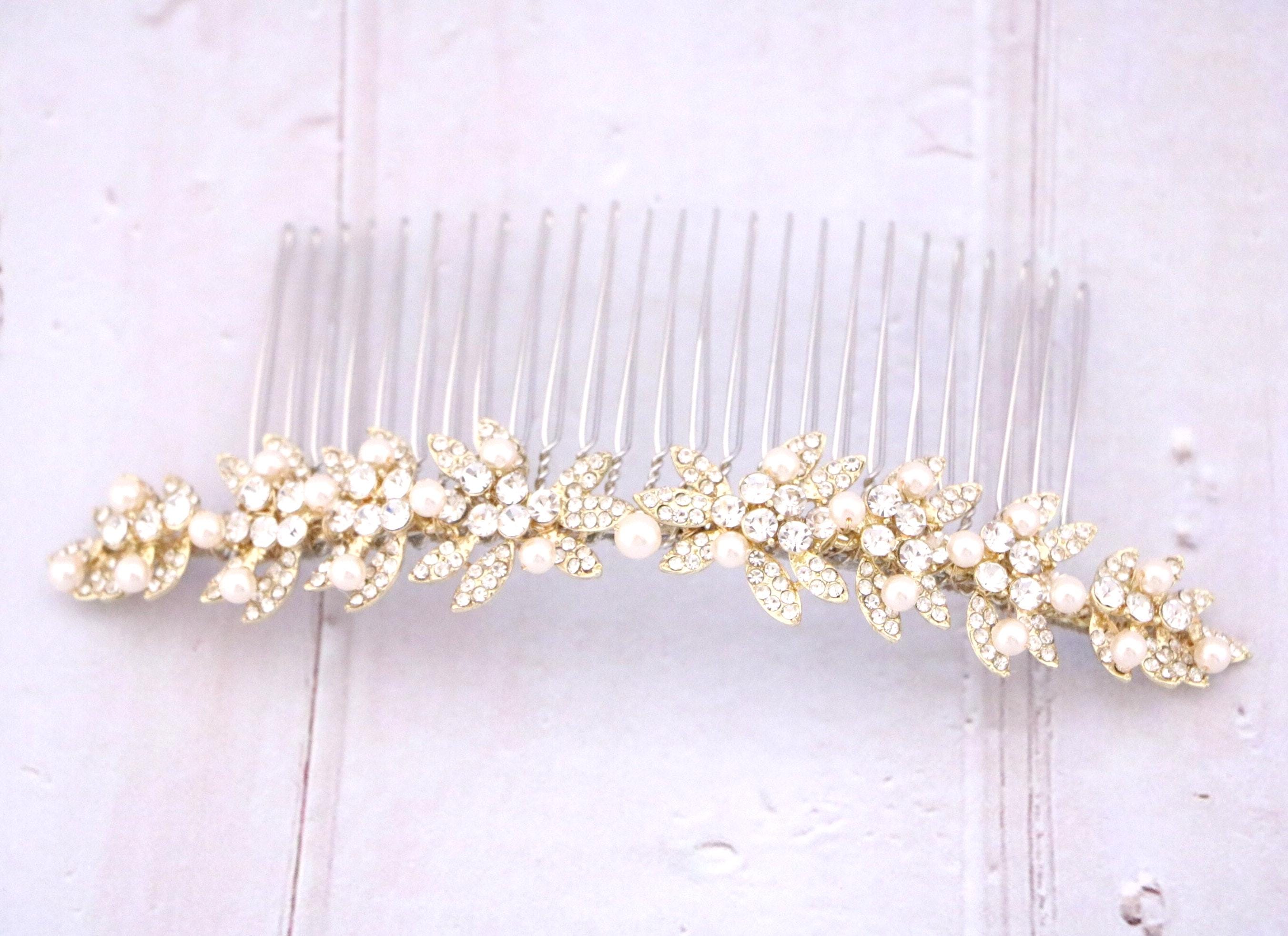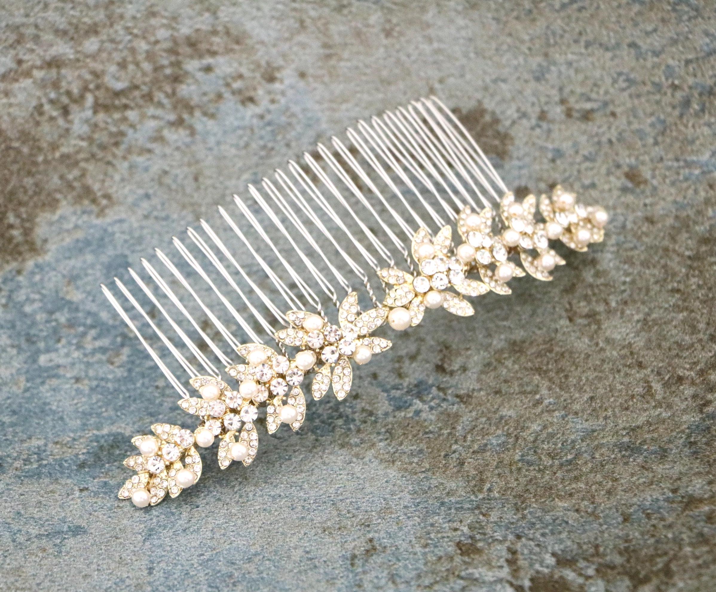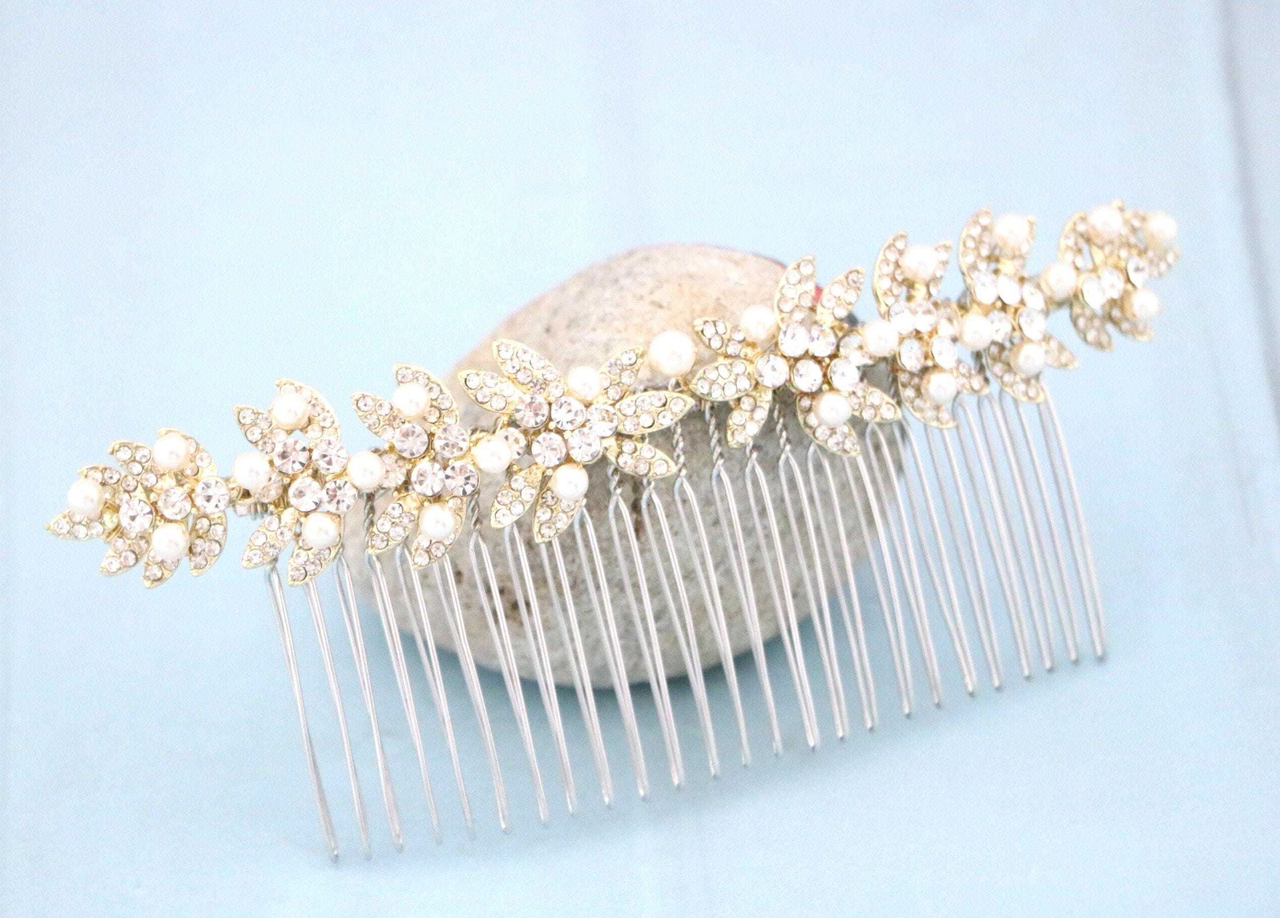 This beautiful Clear rhinestone Swarovski pearl hair comb is a perfect compliment for the wedding party and can easily fit into any hair style.