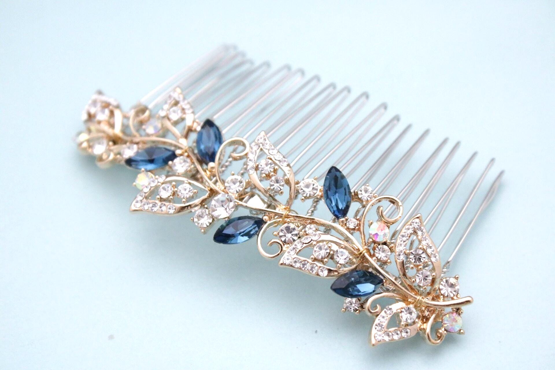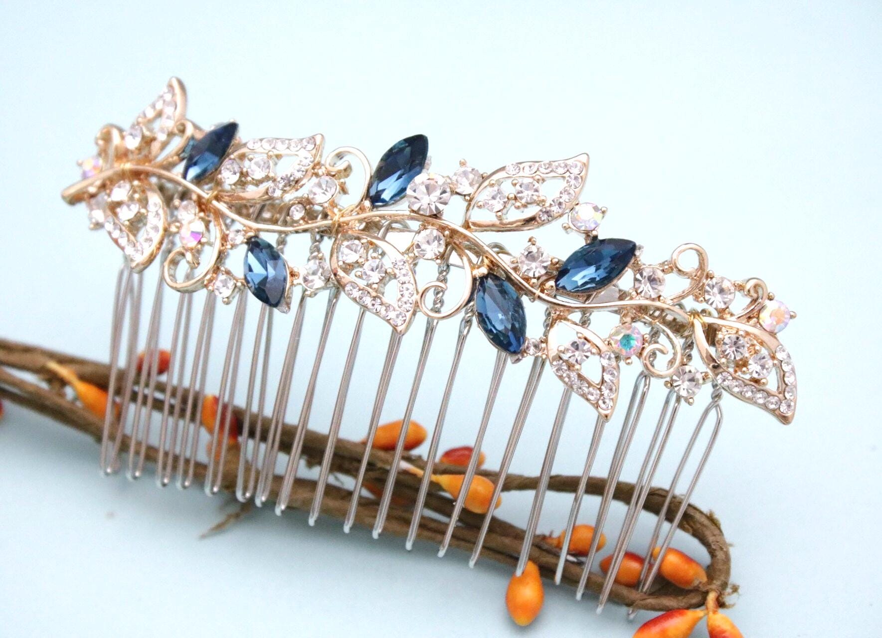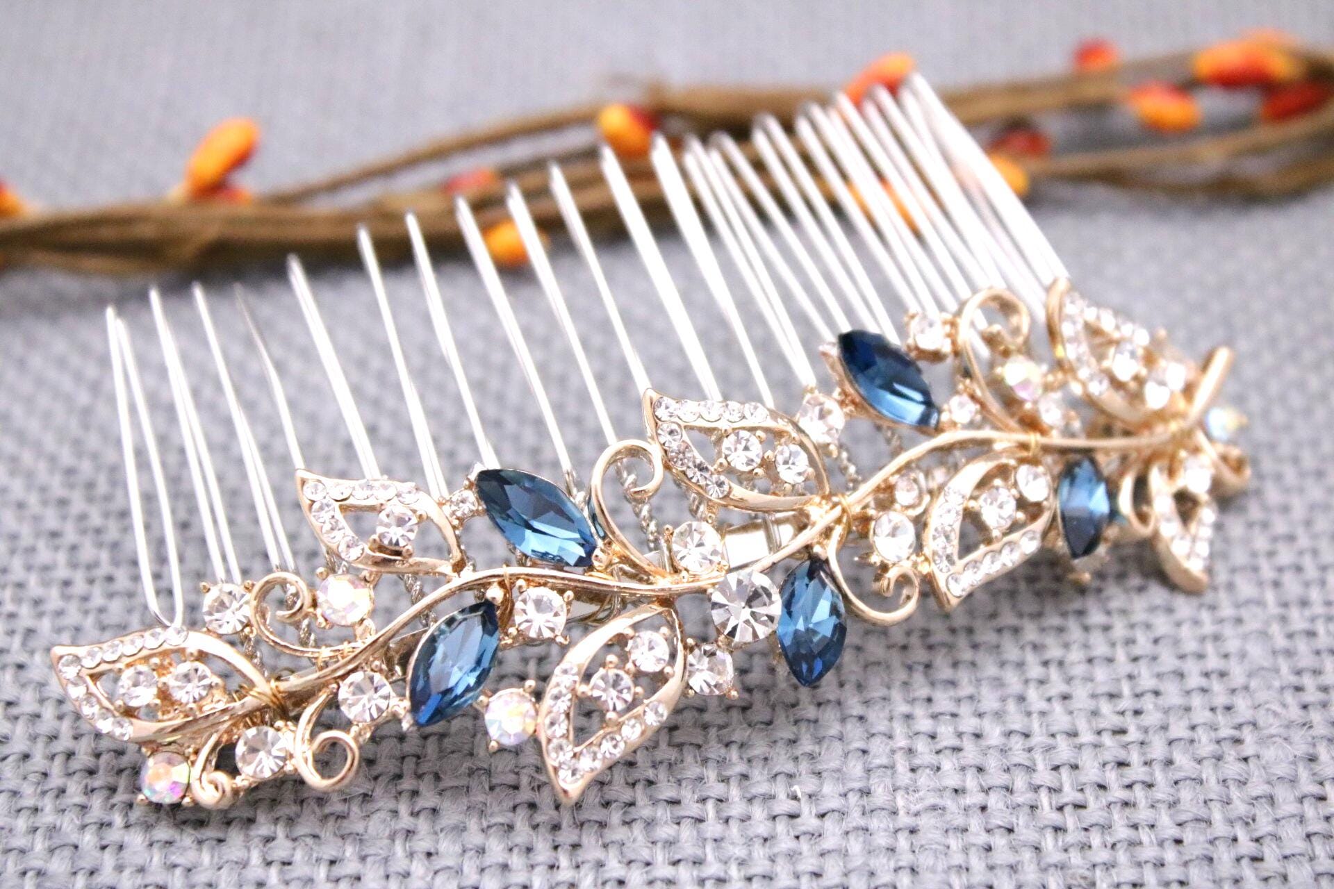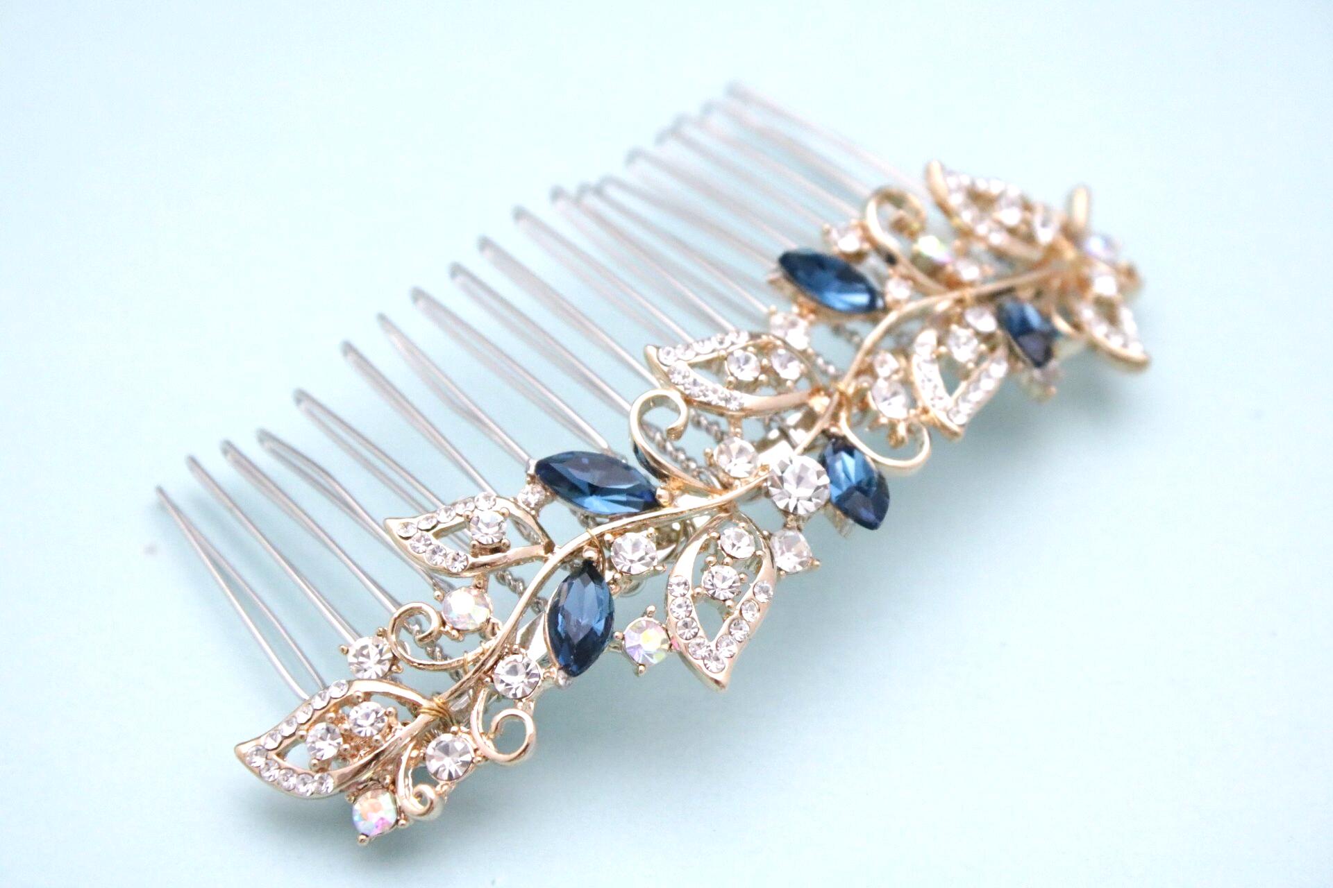 Wedding Hair Accessories, Vintage Style Flower and Leaf Rhinestone Bridal Hair Comb, BLUE Swarovski Crystal and Pearl Wedding Comb
