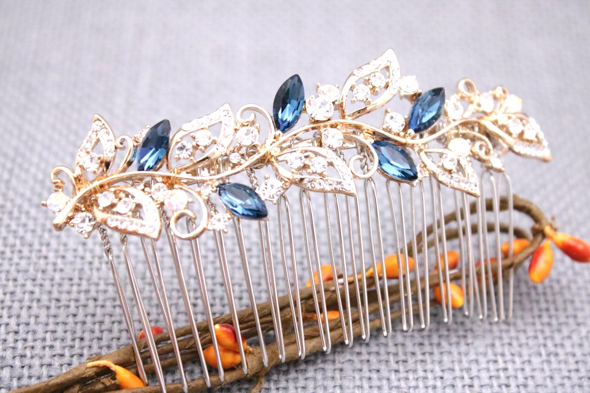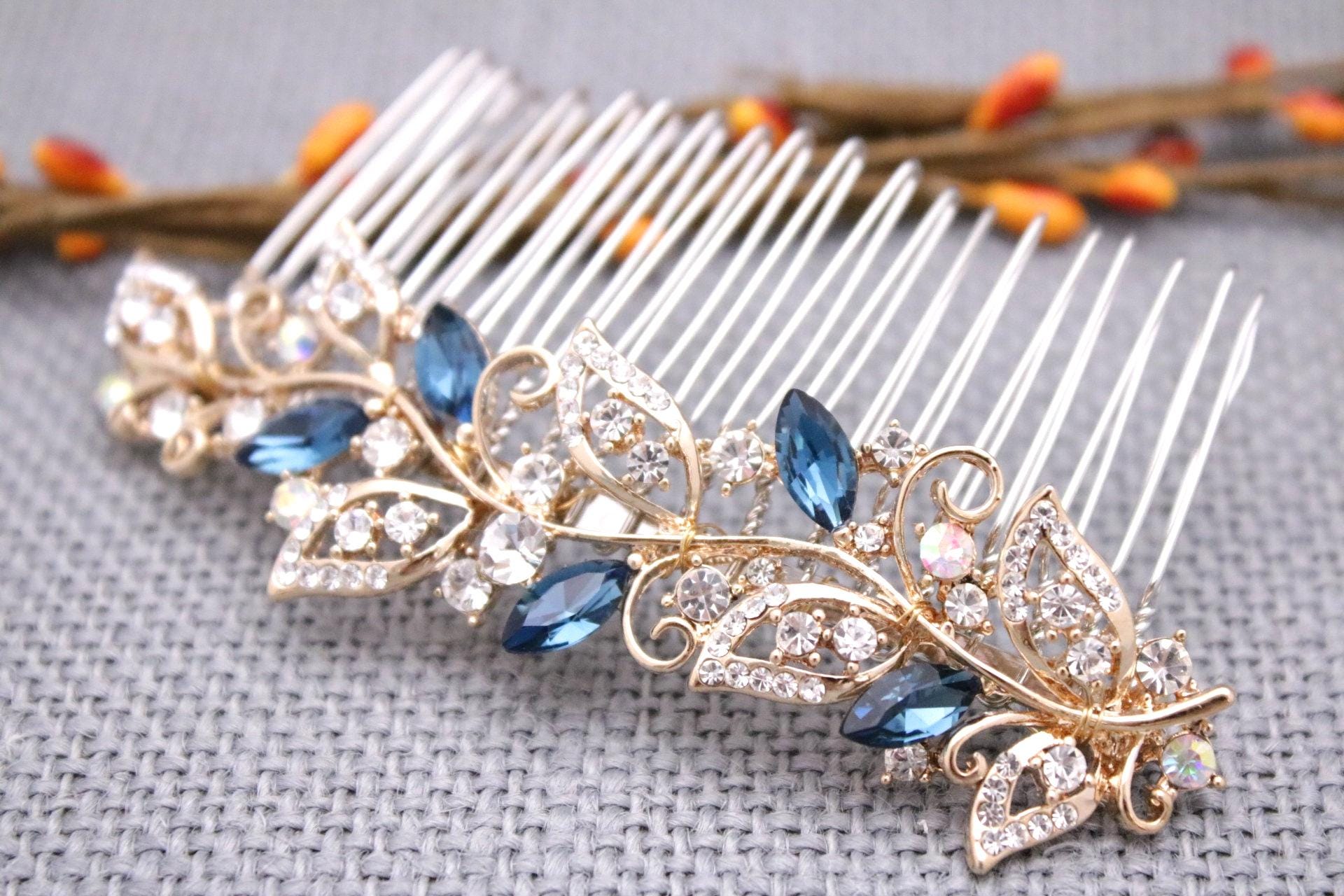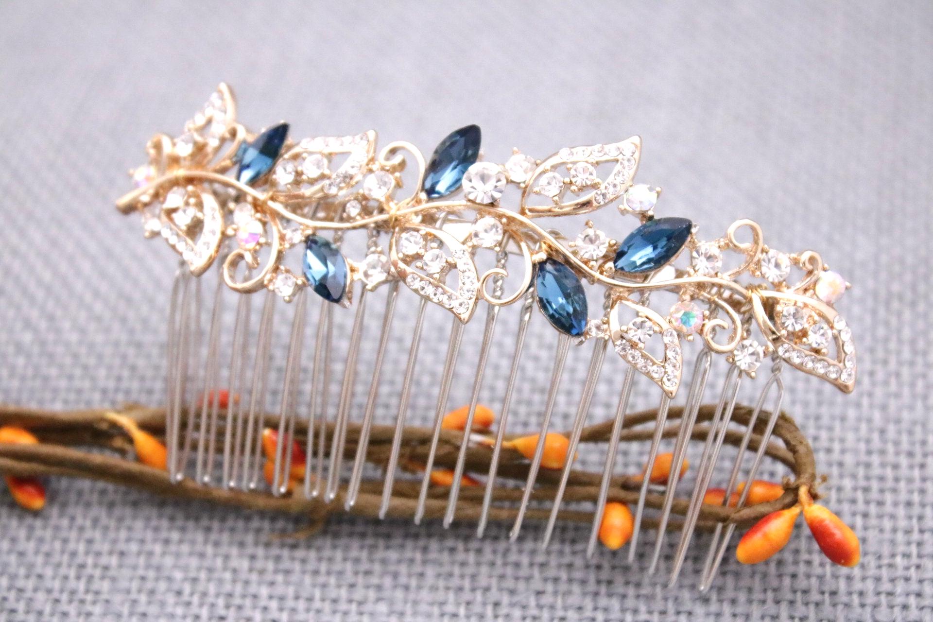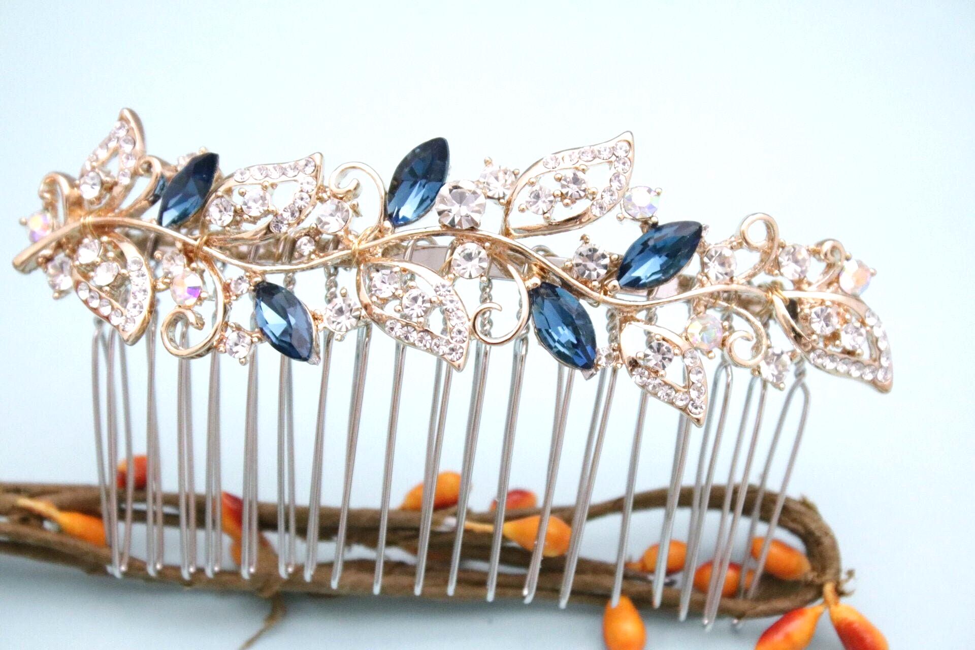 Wedding Hair Accessories, Vintage Style Flower and Leaf Rhinestone Bridal Hair Comb, BLUE Swarovski Crystal and Pearl Wedding Comb