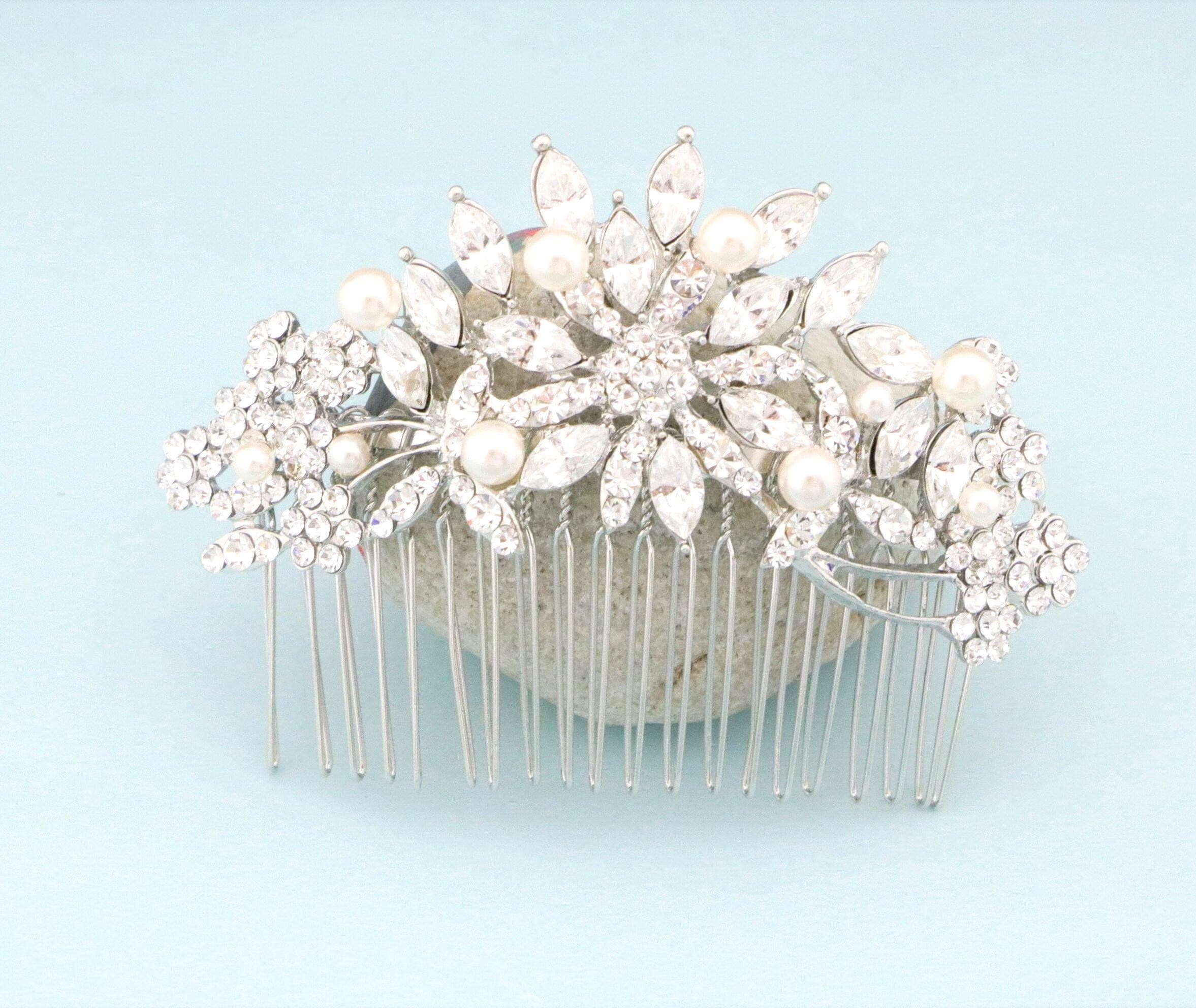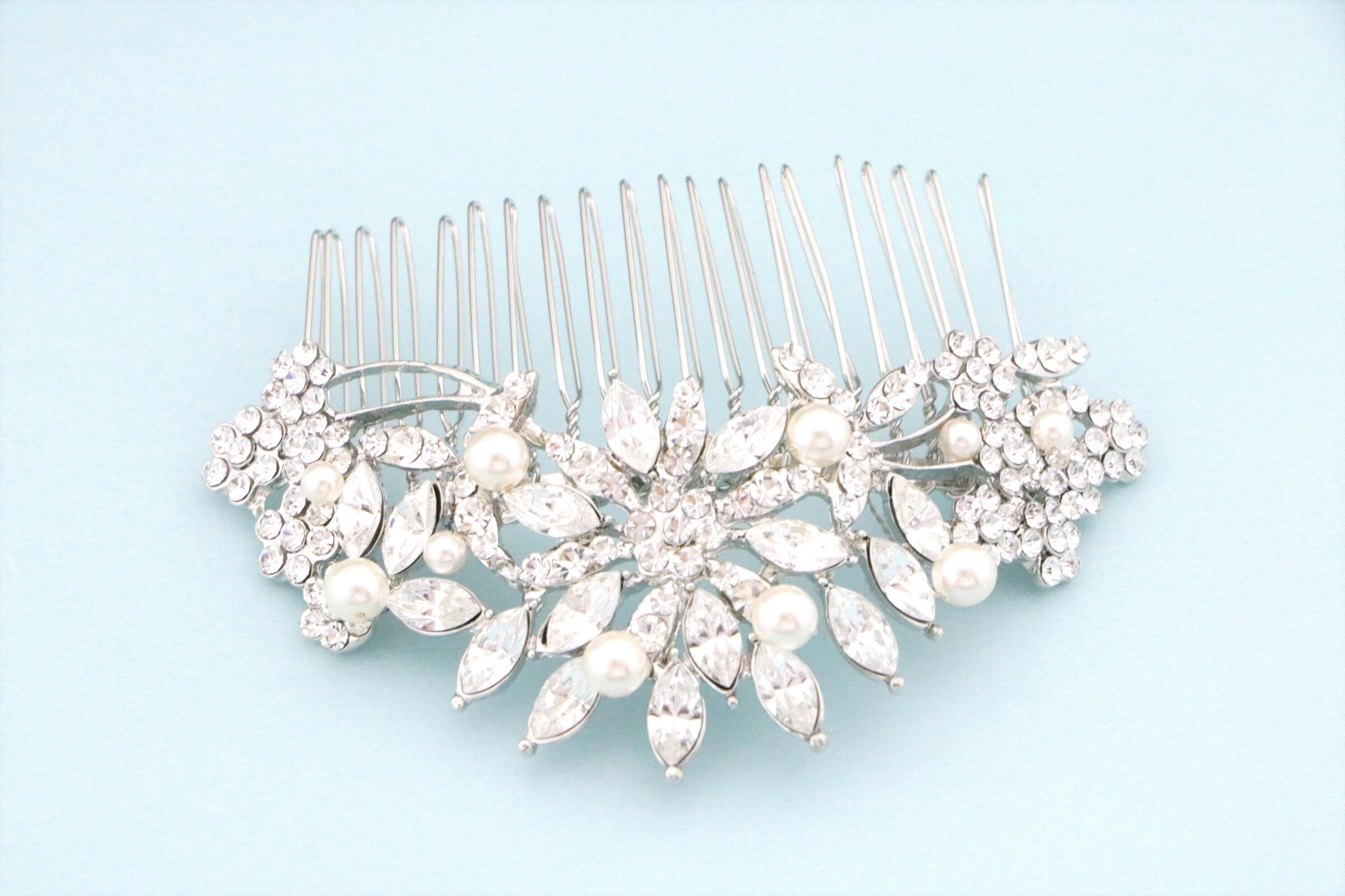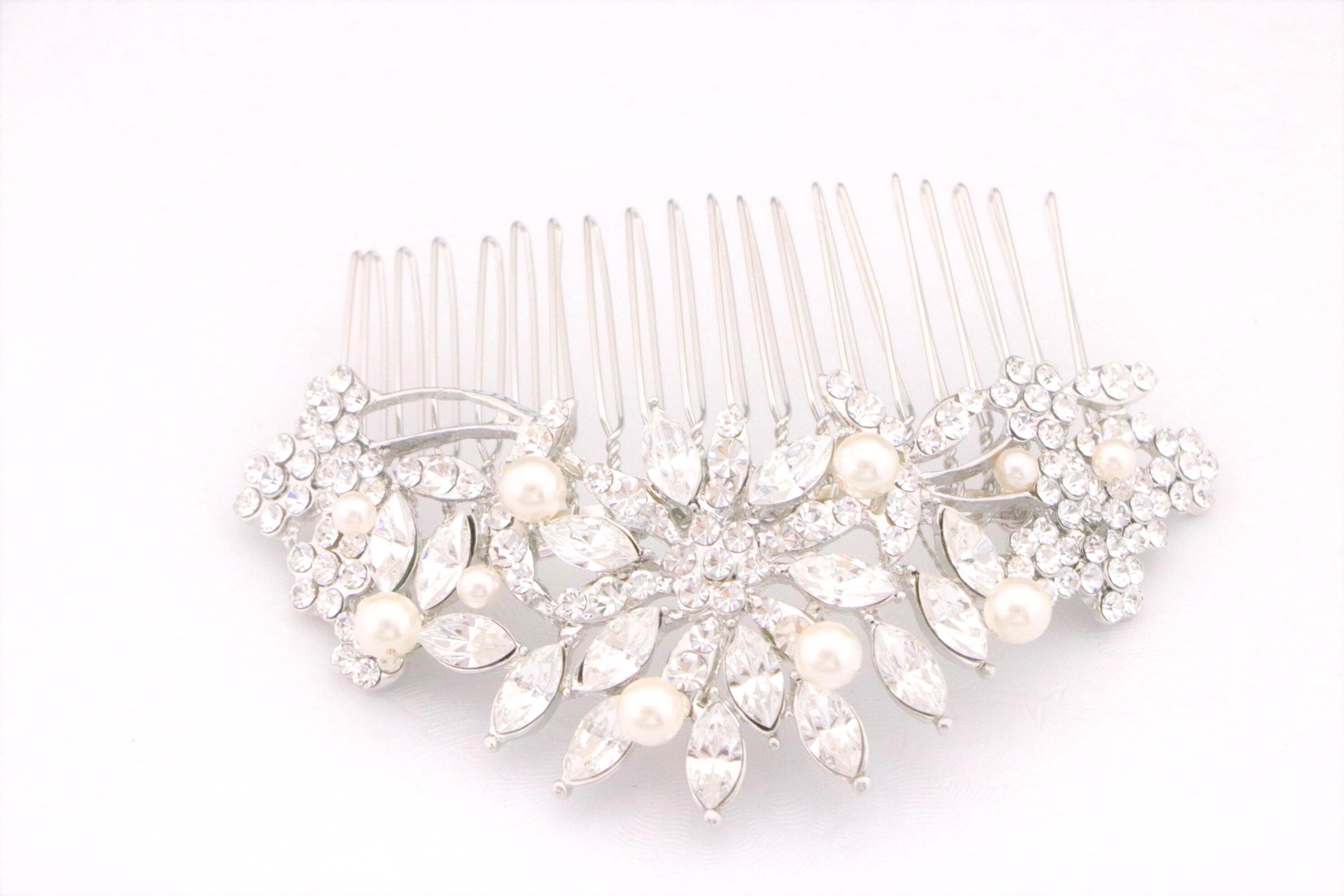 This beautiful Clear rhinestone Swarovski pearl hair comb is a perfect compliment for the wedding party and can easily fit into any hair style.