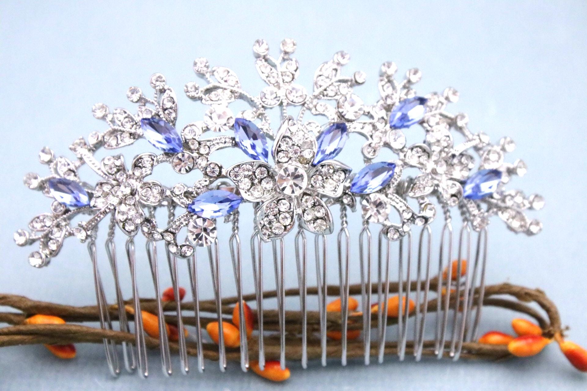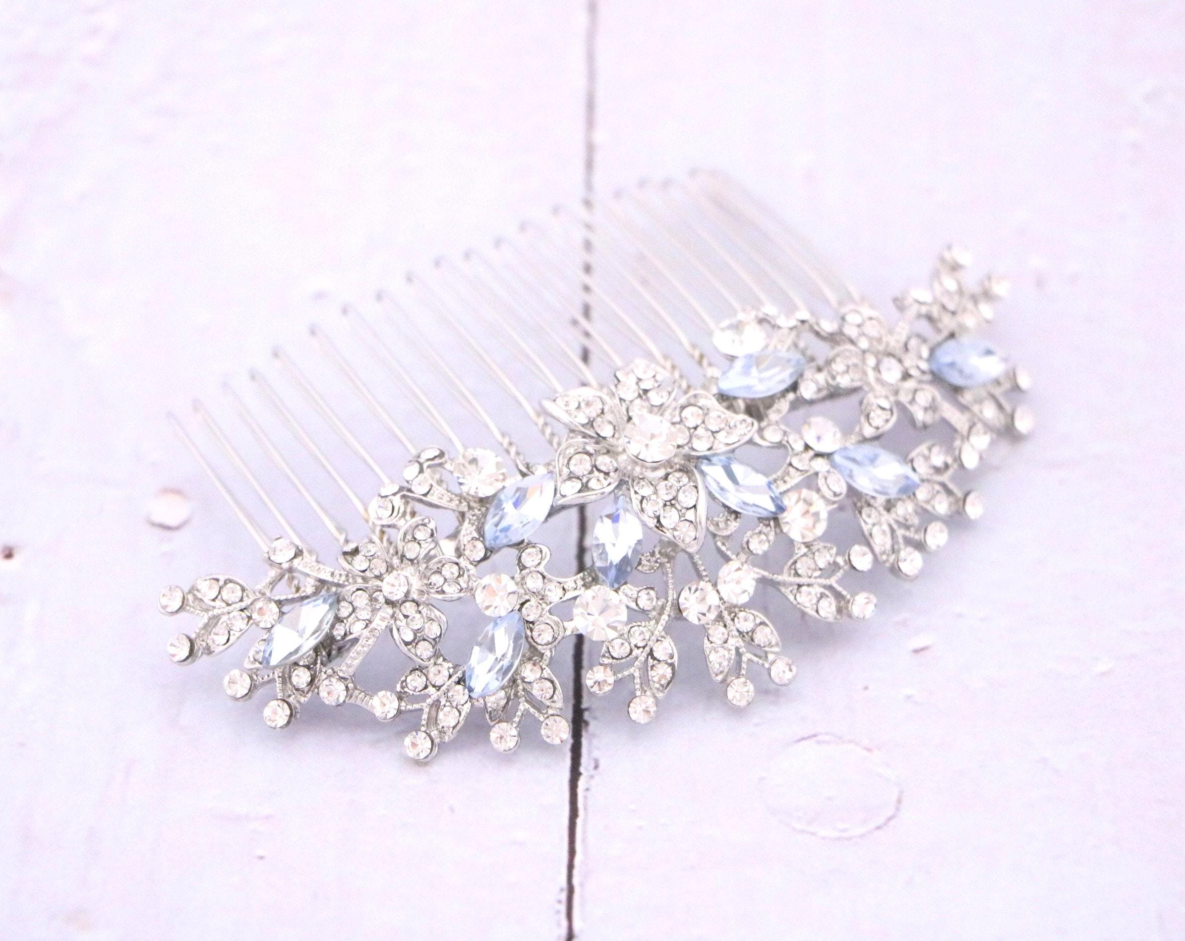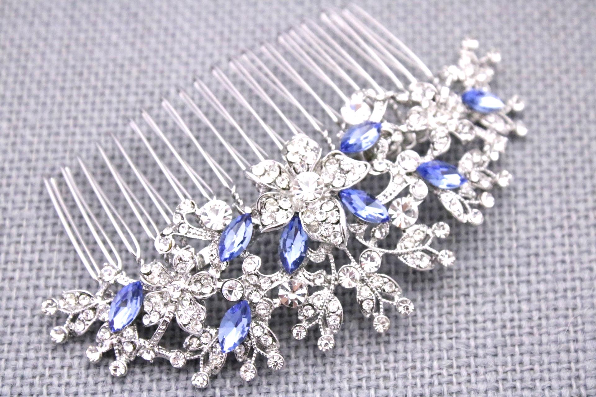 This beautiful Clear rhinestone and Sapphire crystal hair comb is a perfect compliment for the wedding party and can easily fit into any hair style. The Rhinestone part measured approximately 4 X 1.75 inches. and the comb is approximately 3 inches wide.