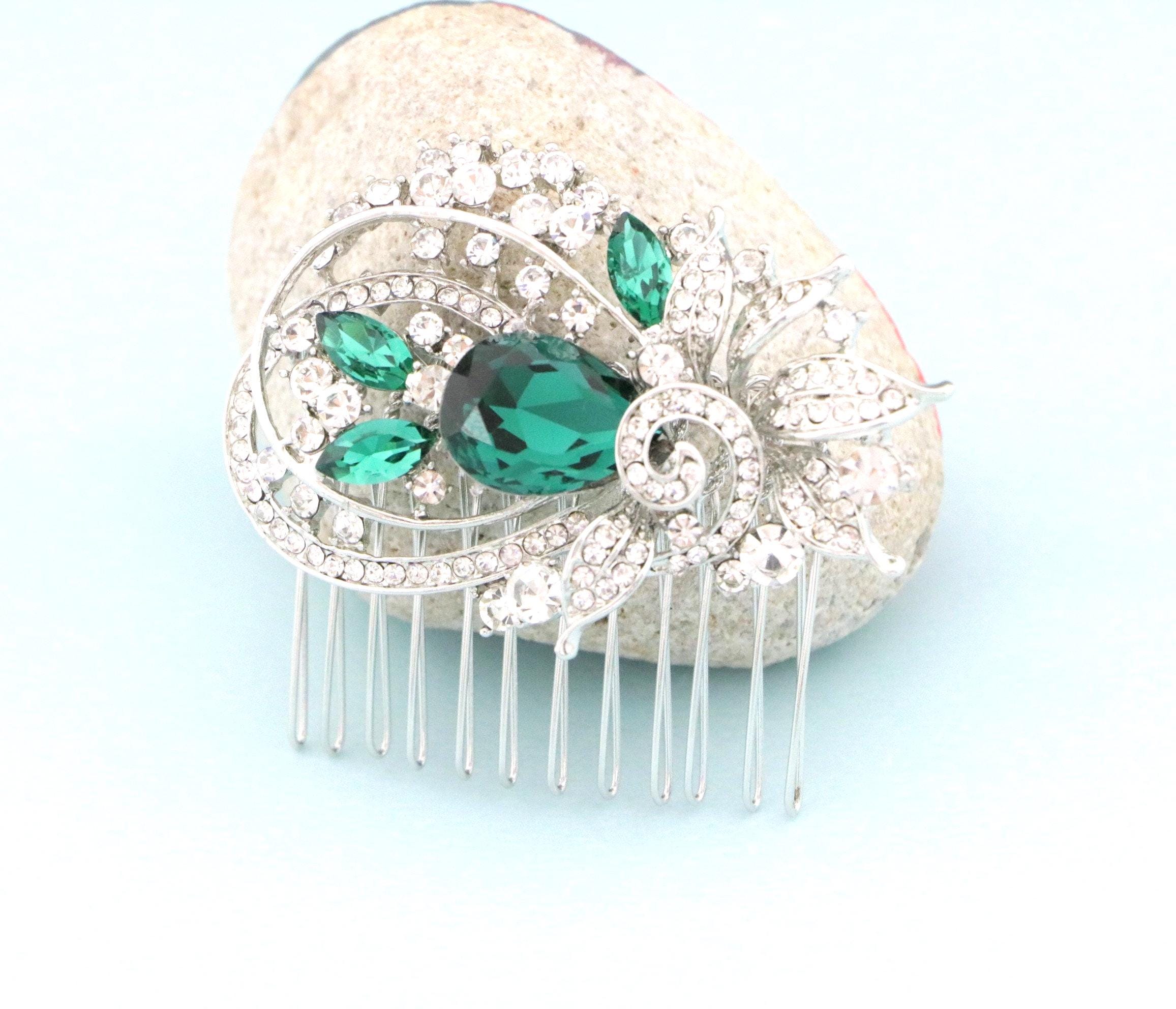 This beautiful Clear rhinestone and Sapphire Crystal hair comb is a perfect compliment for the wedding party and can easily fit into any hair style. The Rhinestone part measured approximately 2.75 X 1.75 inches. and the comb is approximately 2 inches wide.