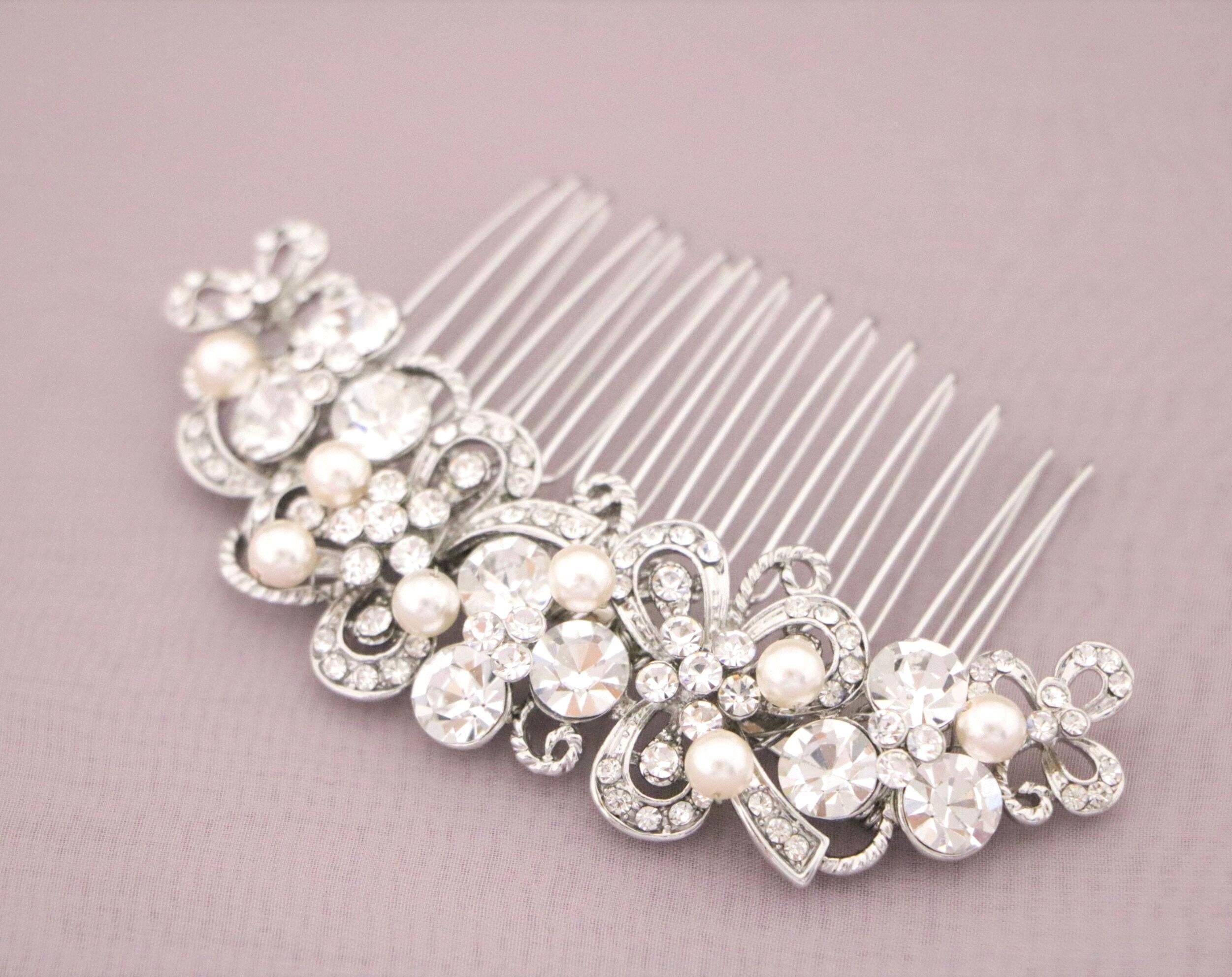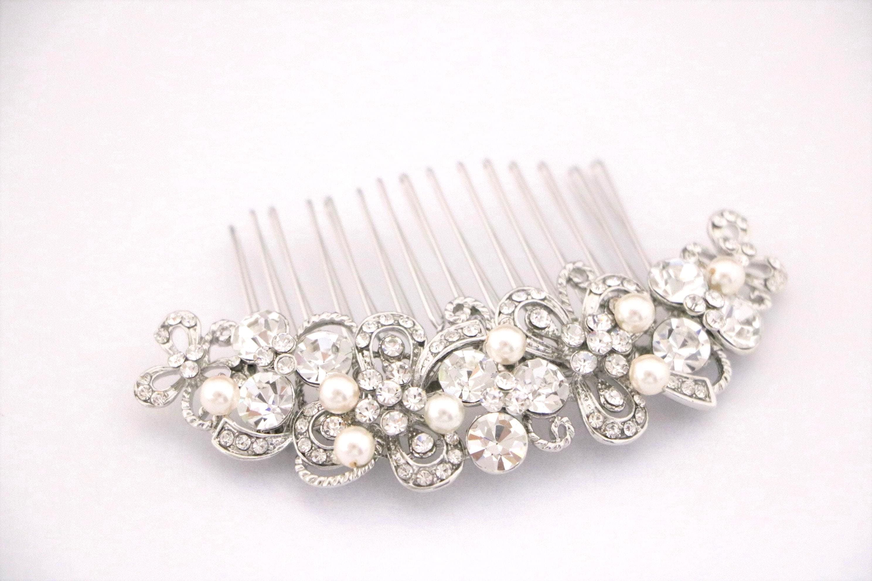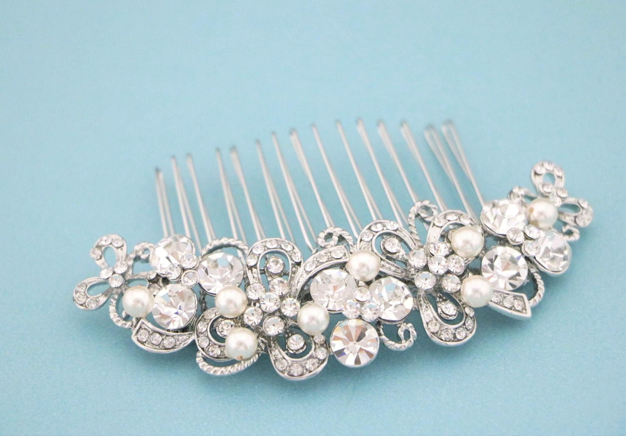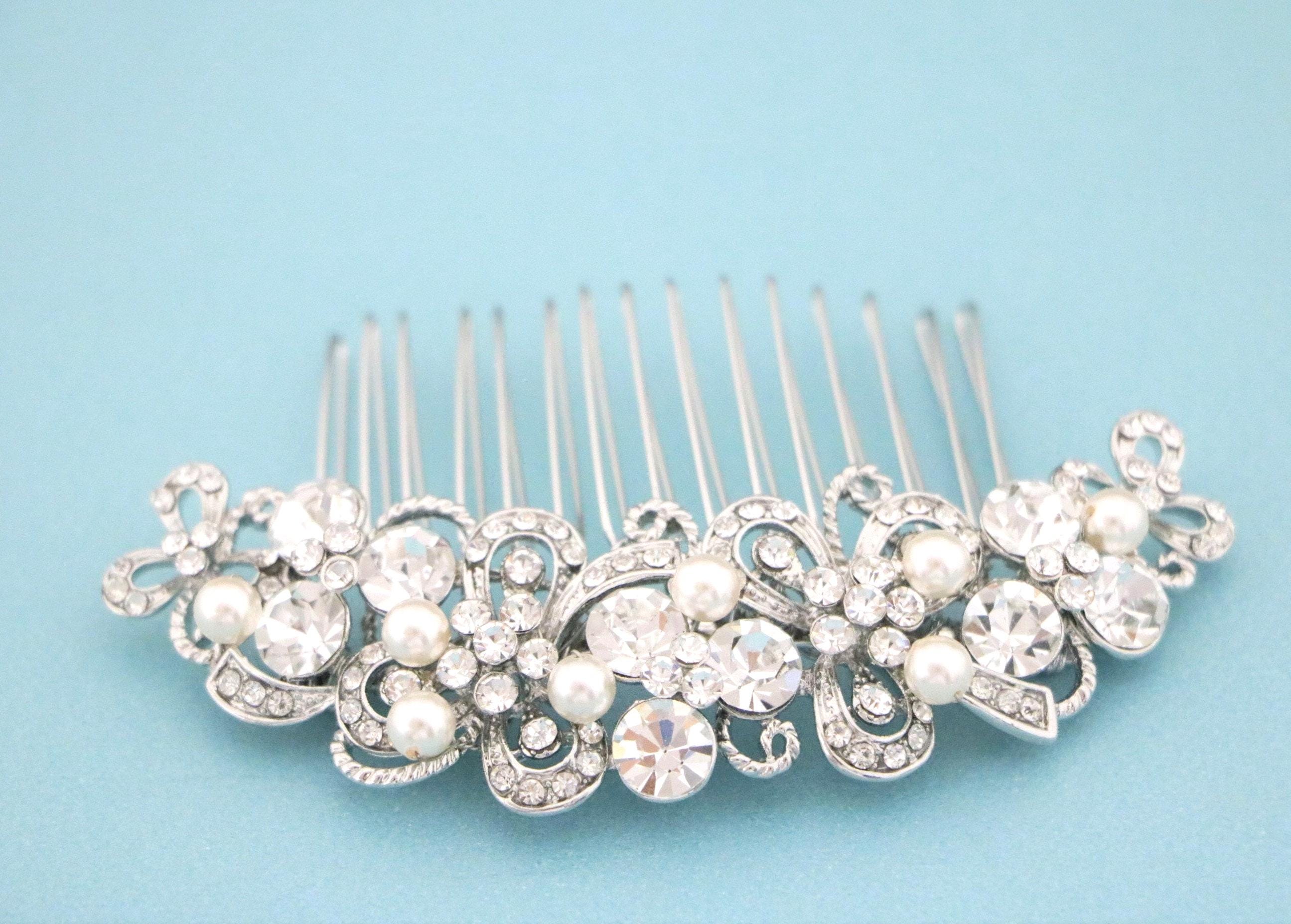 This sparkle rhinestone hair comb features a very beautiful vintage style rhinestone piece and Swarovski ivory pearls. Rhinestone piece and pearls are wired on a silver tone metal comb.