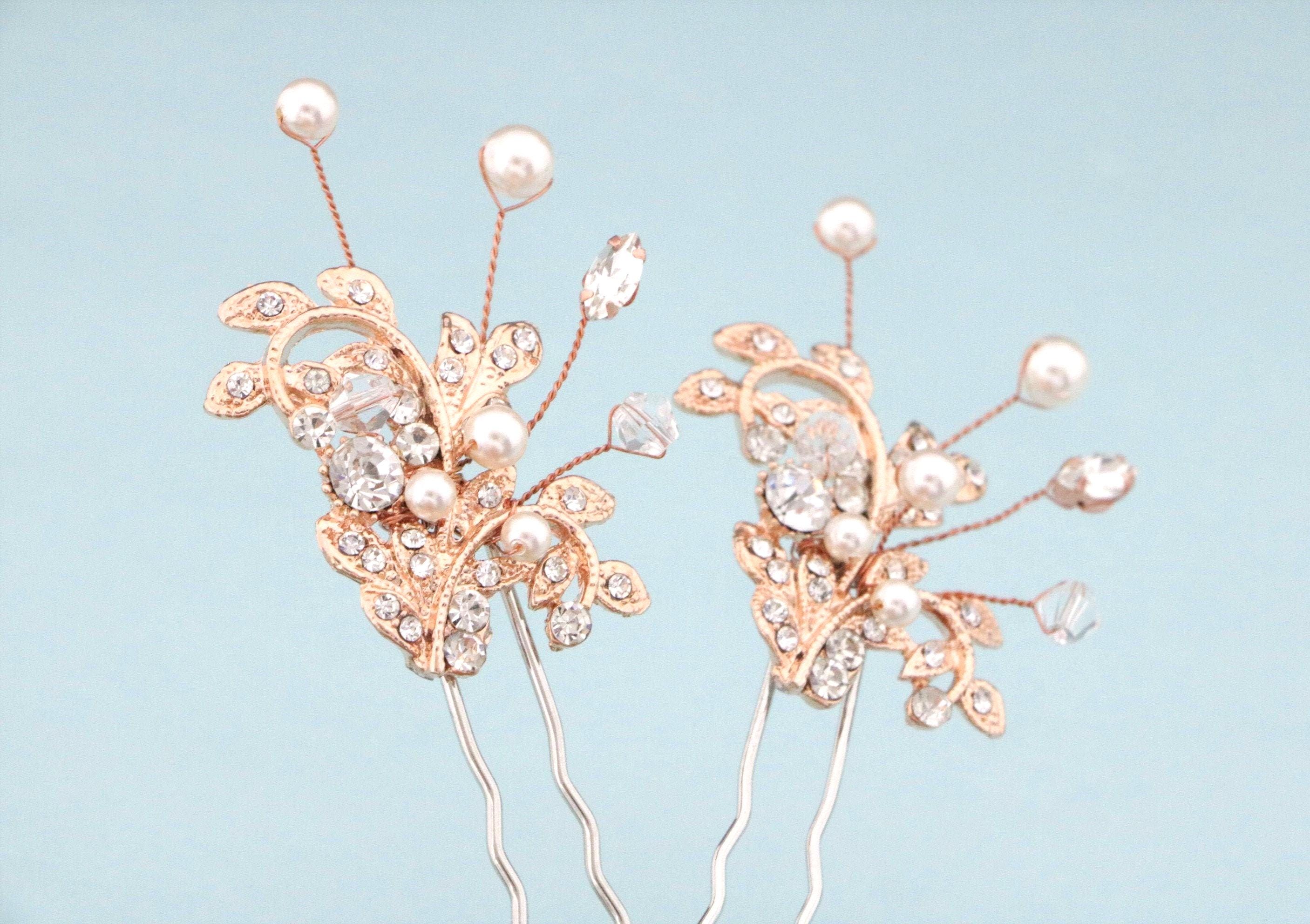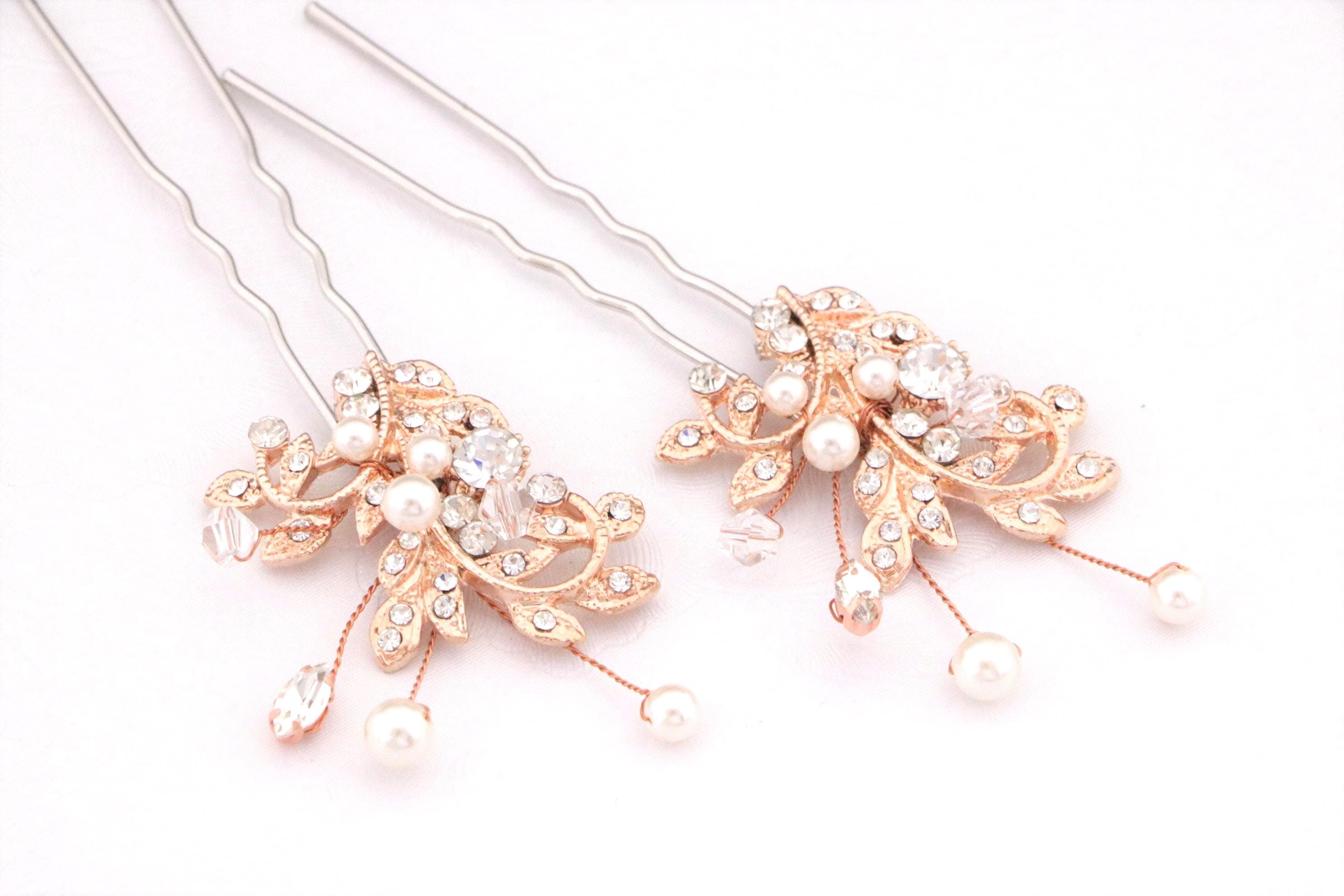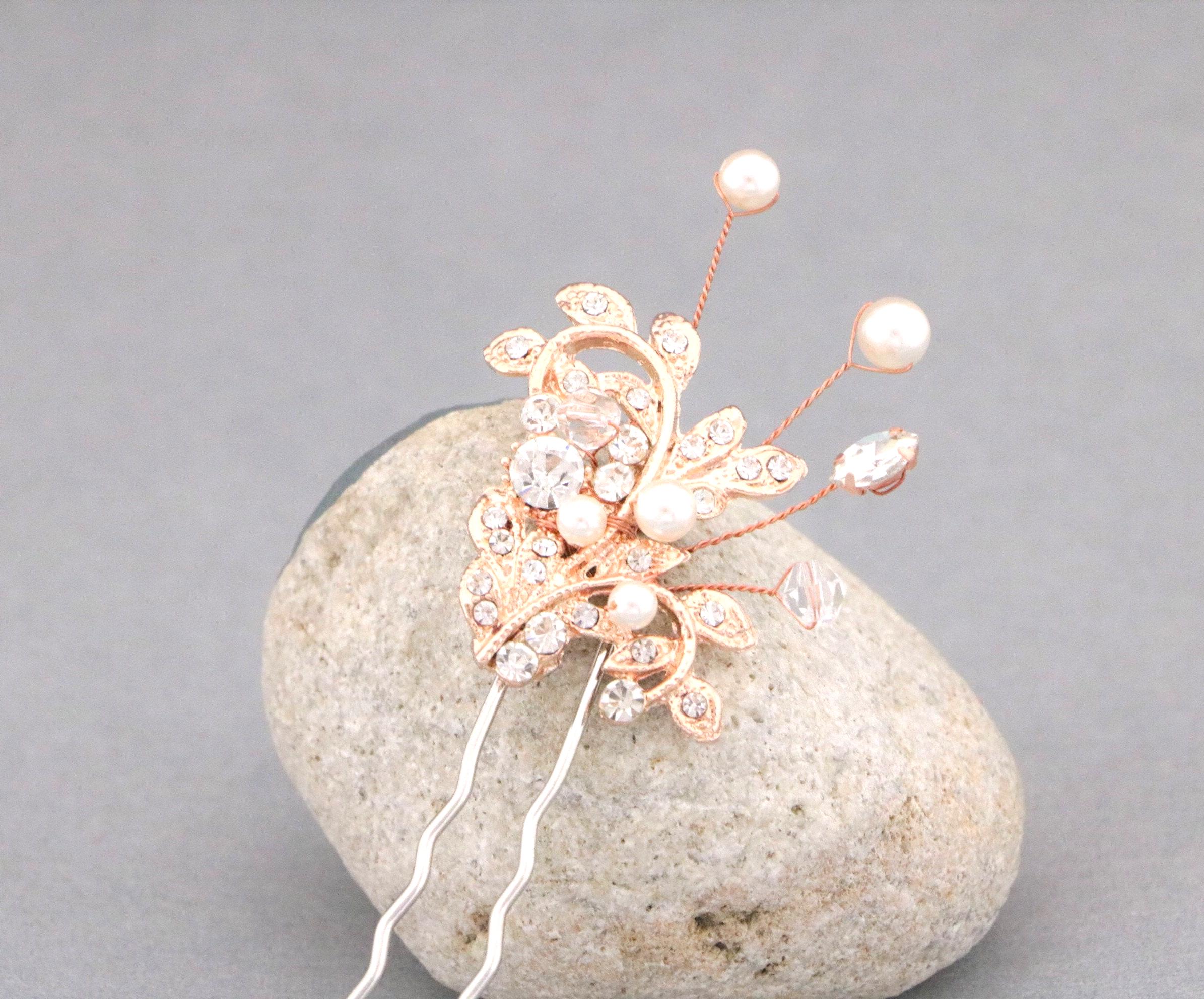 This beautiful Clear rhinestone and Rose Gold tone flower hair pin is a perfect compliment for the wedding party and can easily fit into any hair style.