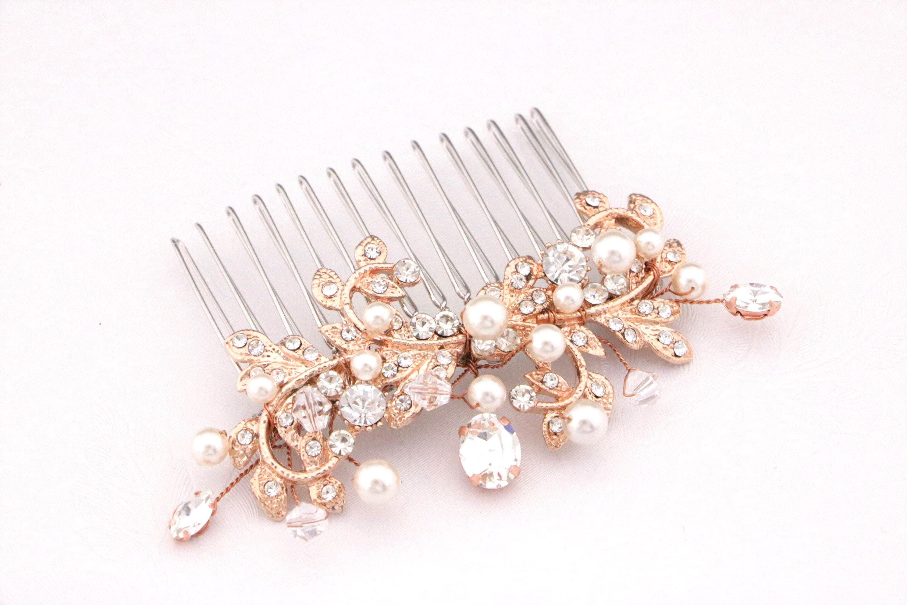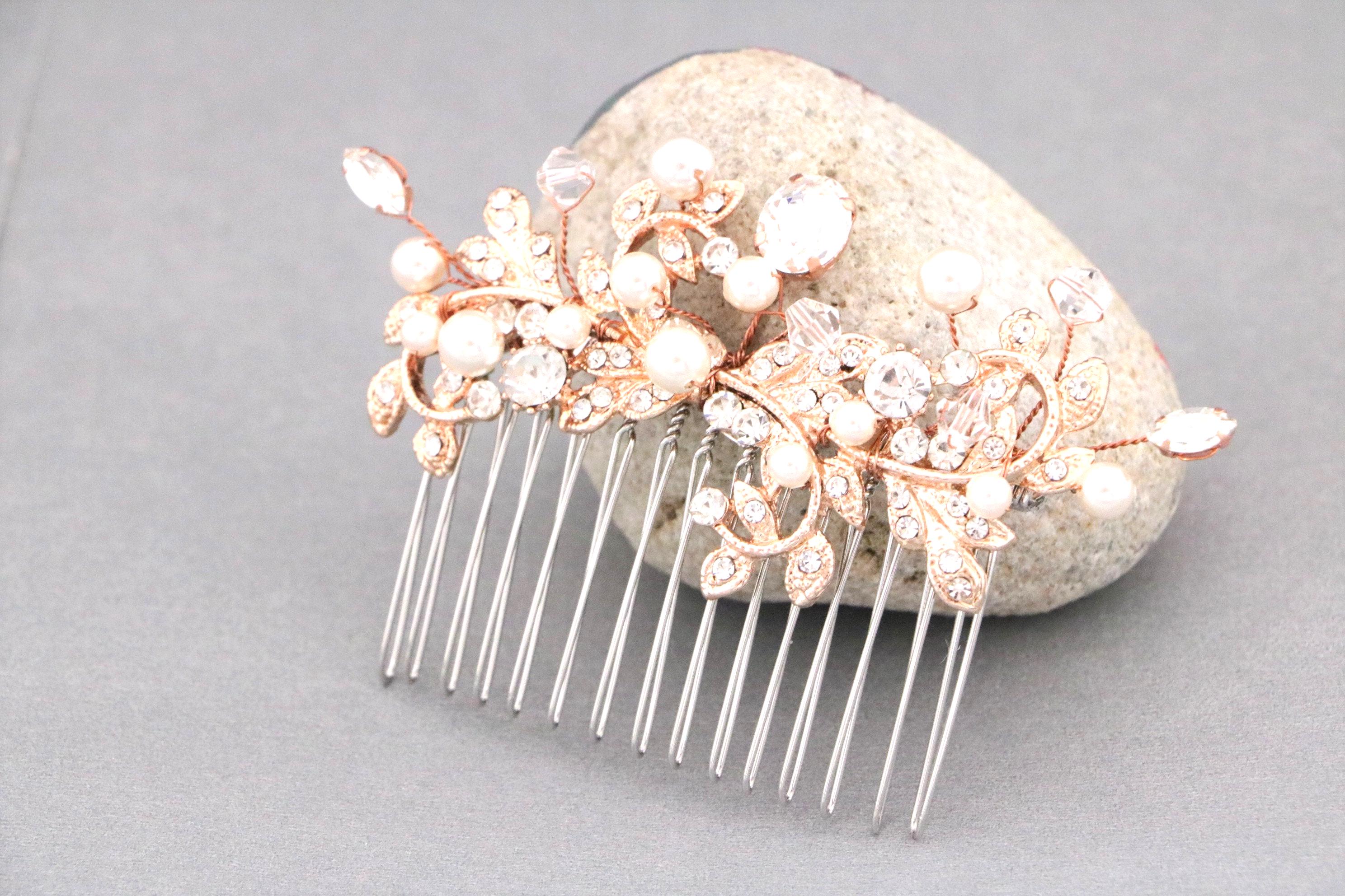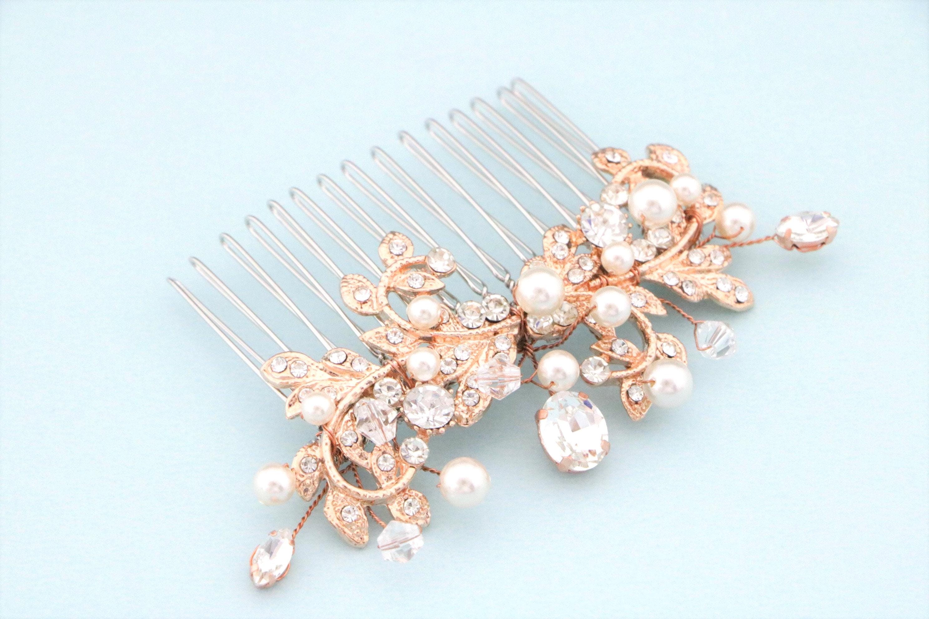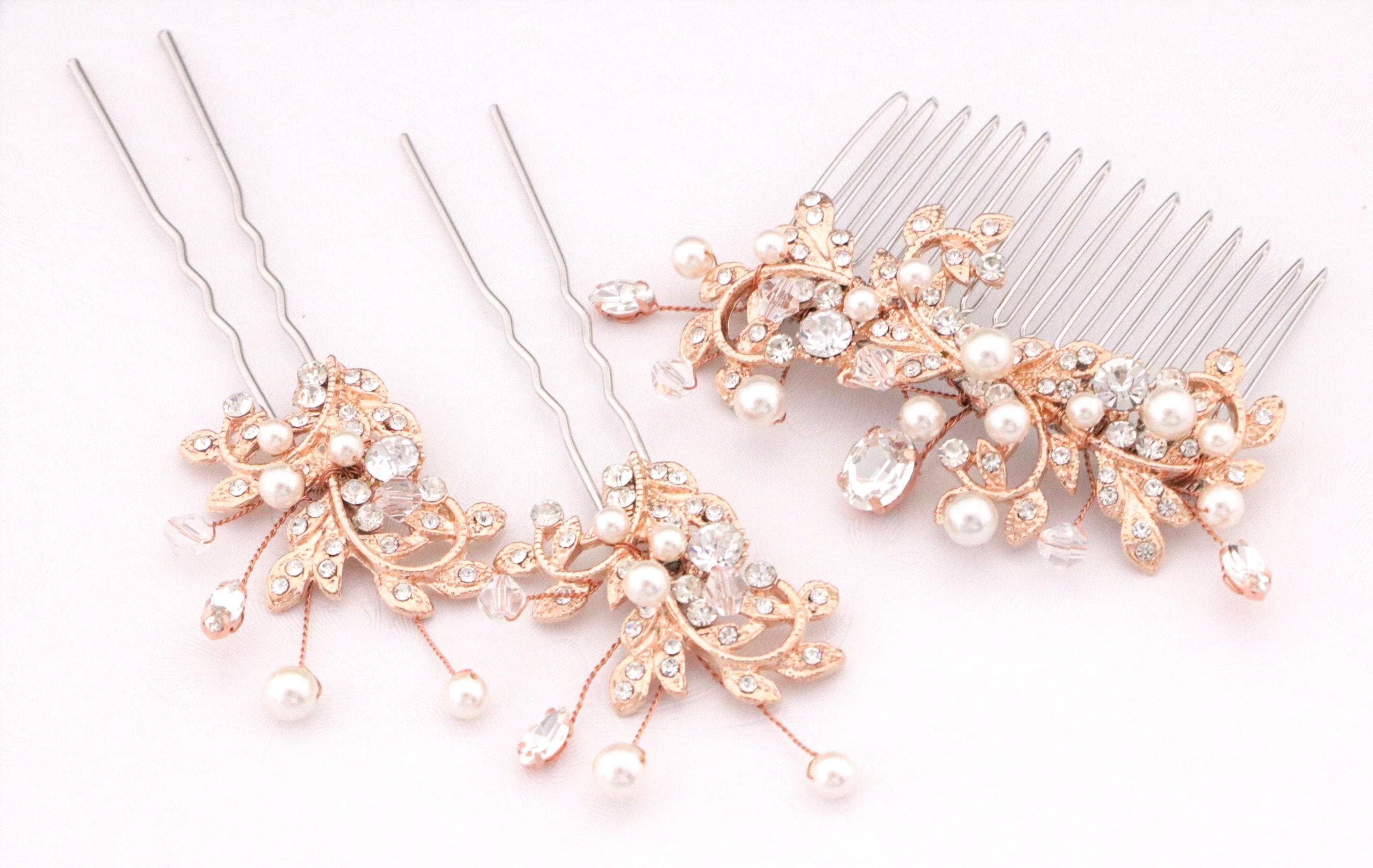 This beautiful Clear rhinestone and Rose Gold tone flower hair pin is a perfect compliment for the wedding party and can easily fit into any hair style.