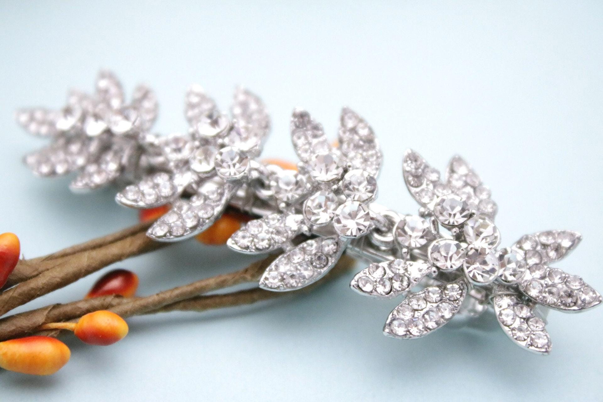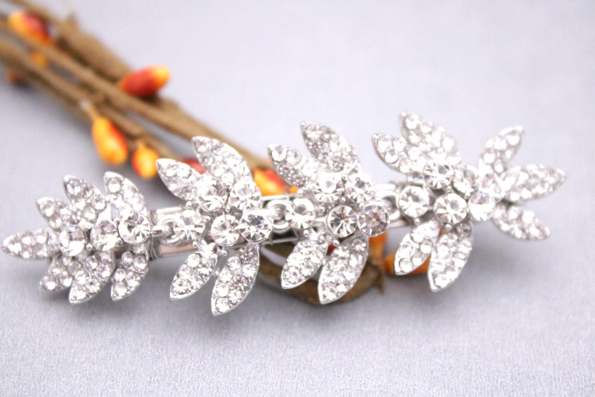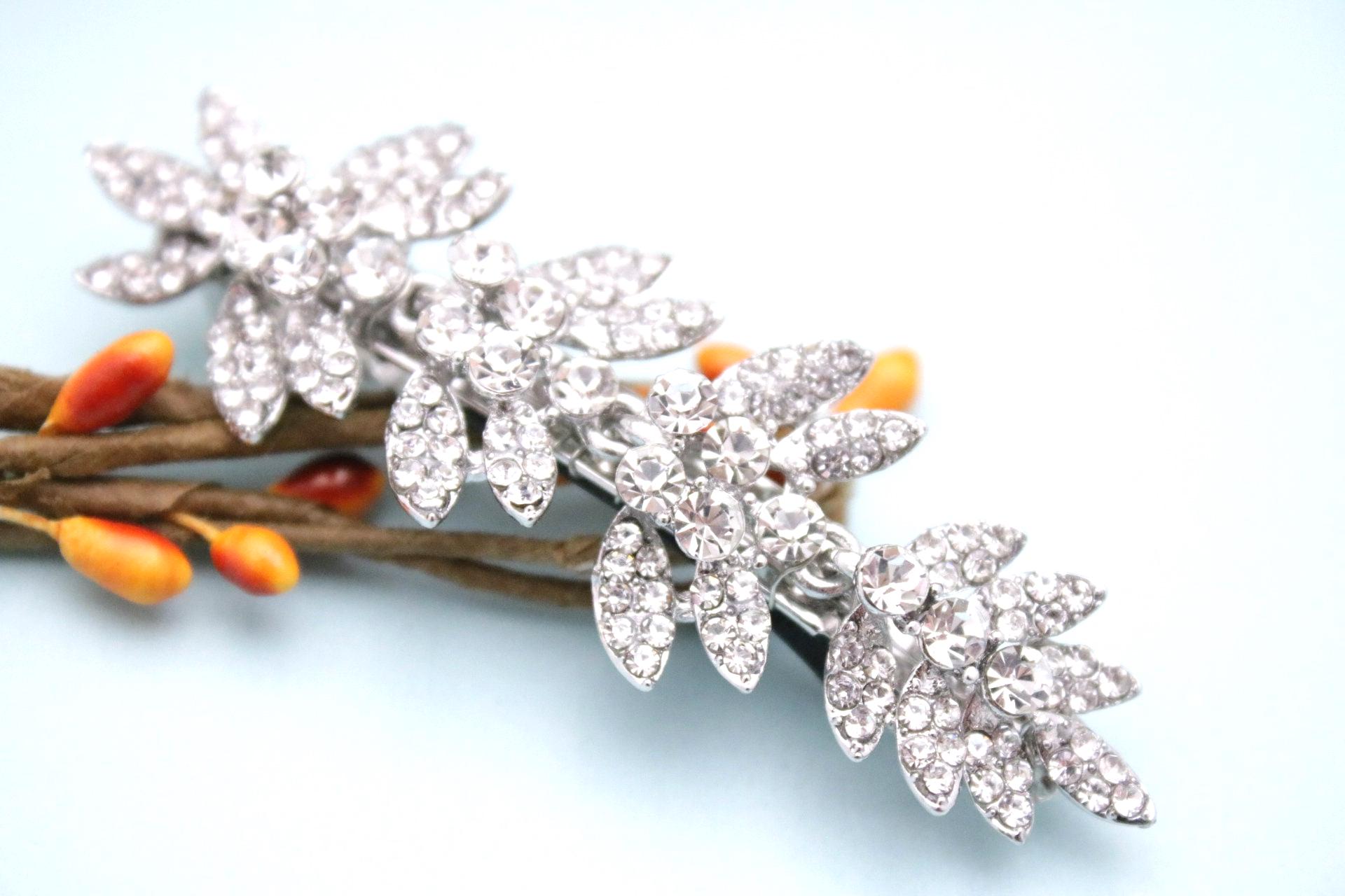 This beautiful Clear rhinestone Hair Barrette is a perfect compliment for the wedding party and can easily fit into any hair style. The brooch is measured approximately 3 X 1 inches.