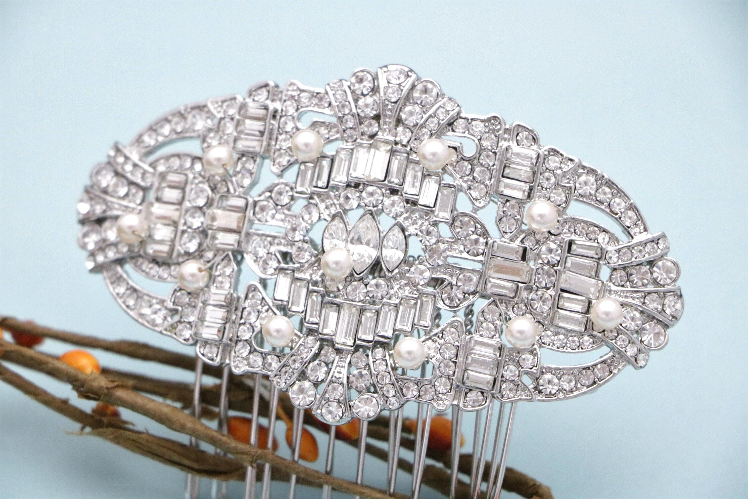 This sparkle rhinestone hair comb features a very beautiful vintage style Rhinestone piece and set it on a metal hair comb. The rhinestone part measures approximately 3.5 X 2 inches.