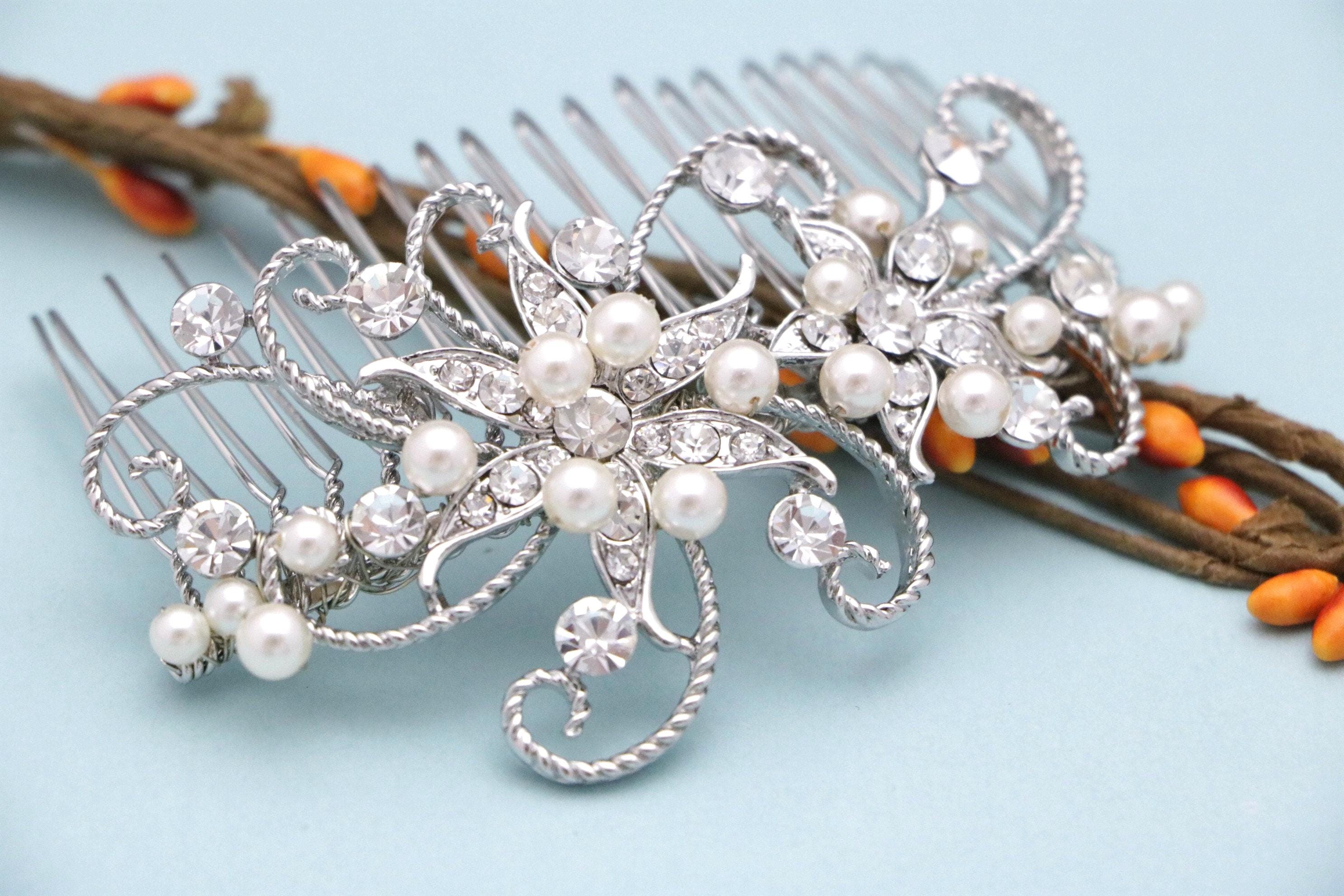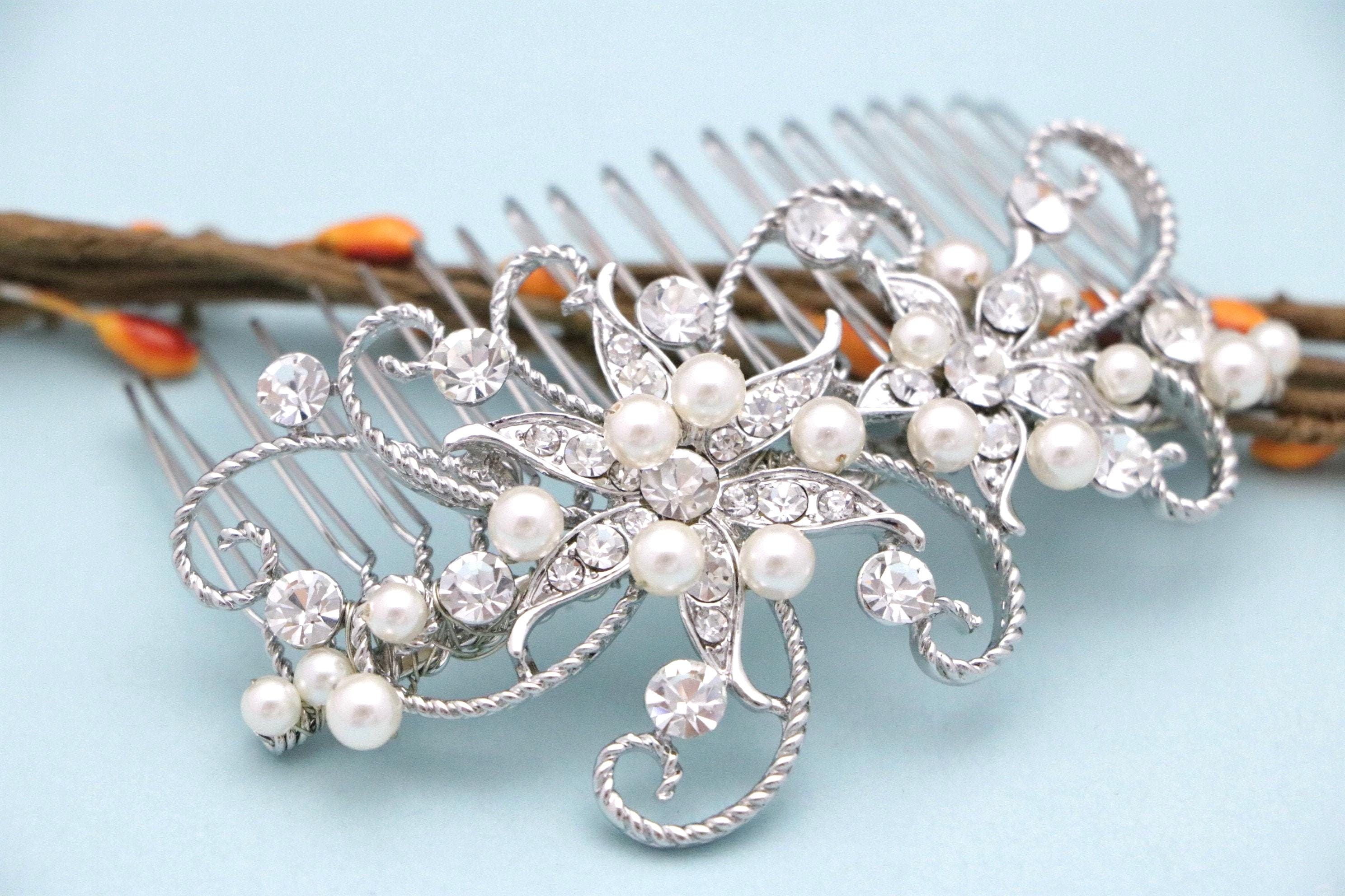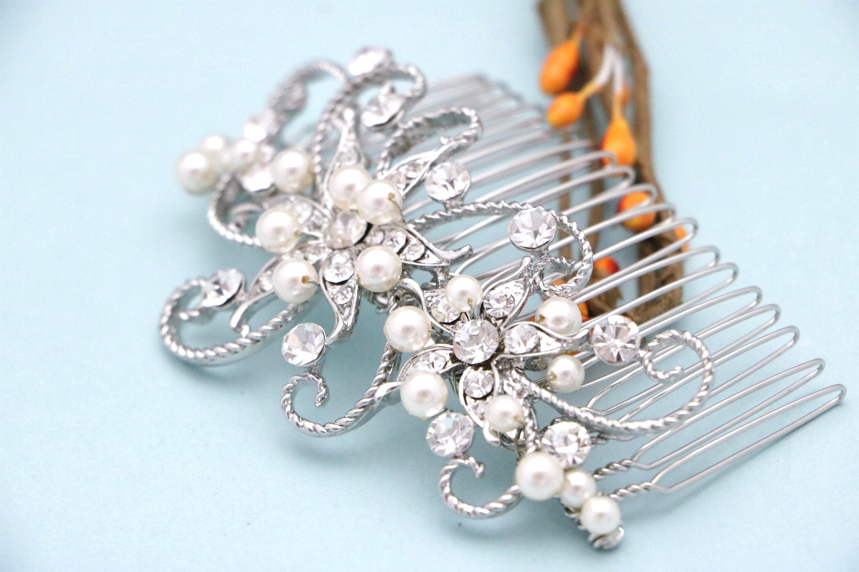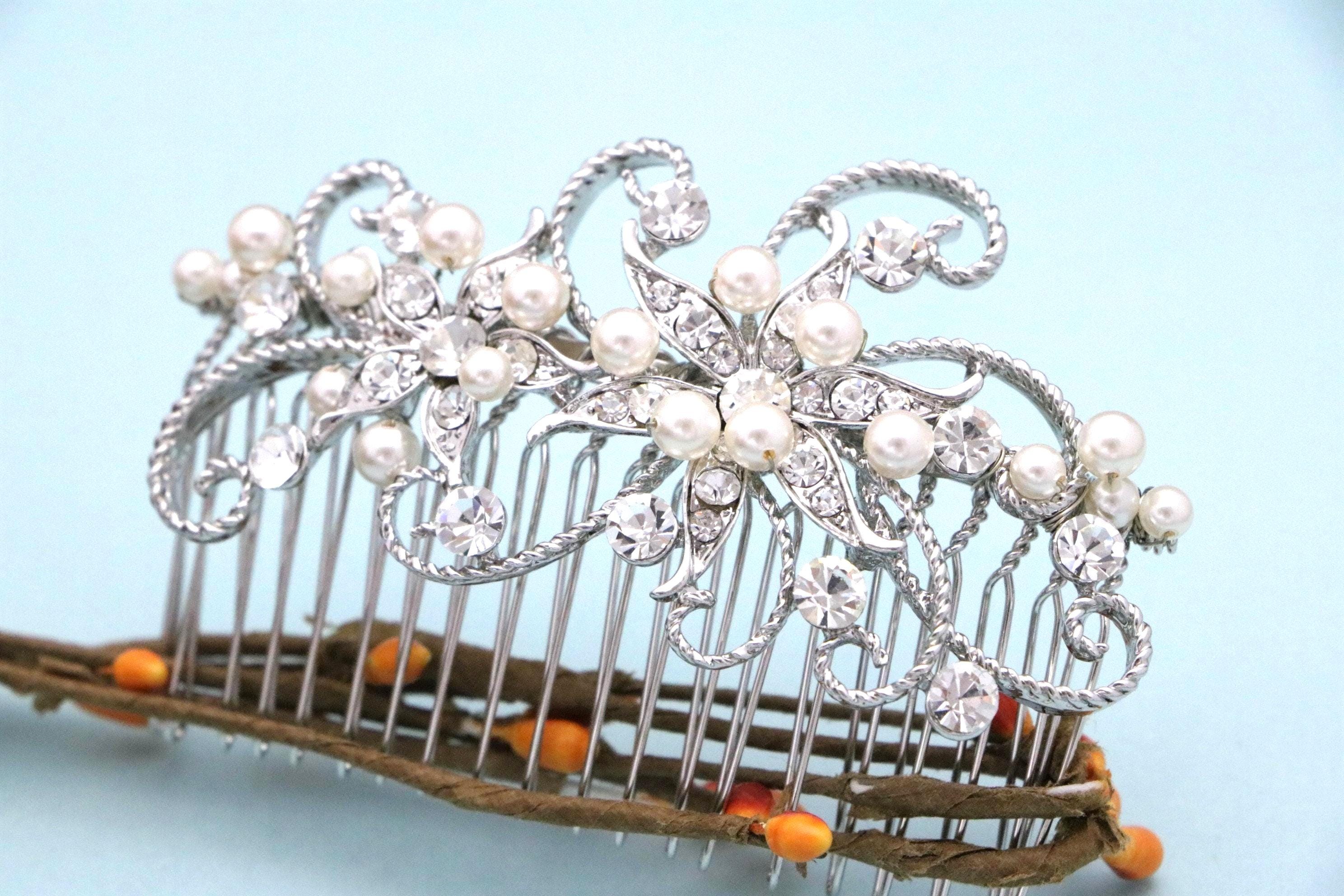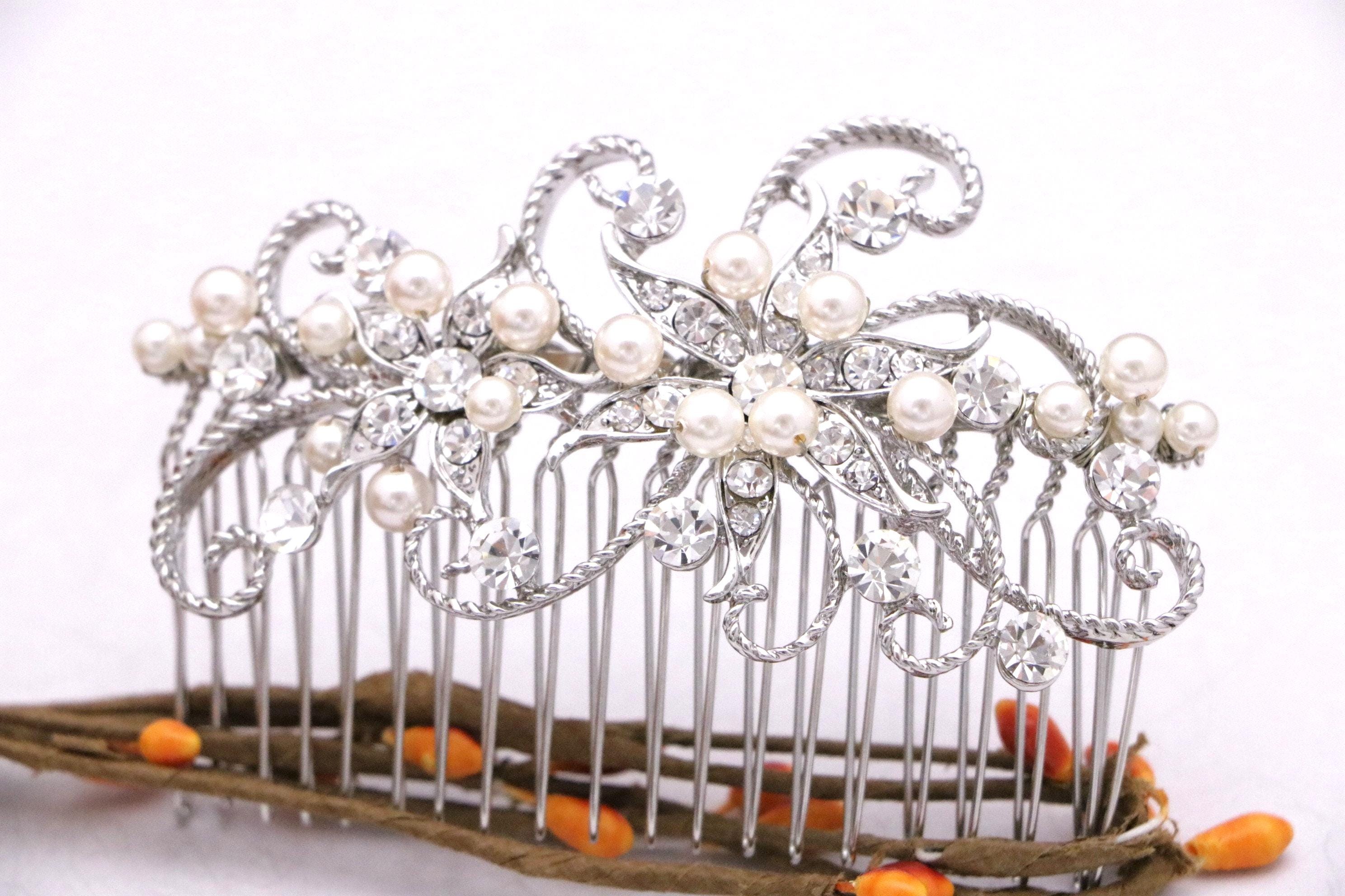 This sparkle rhinestone hair comb features a very beautiful vintage style Rhinestone piece and set it on a metal hair comb. The rhinestone part measures approximately 3.5 X 1.75 inches.