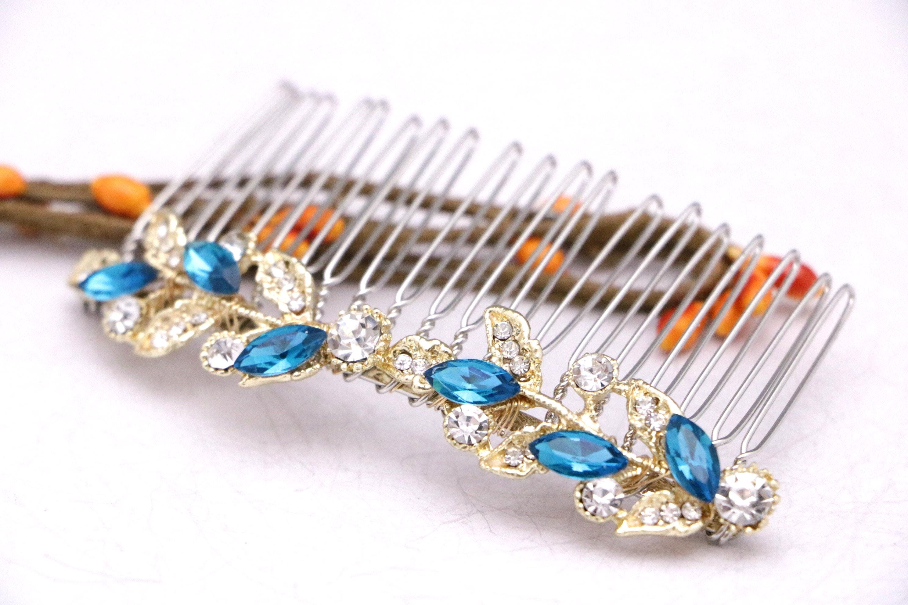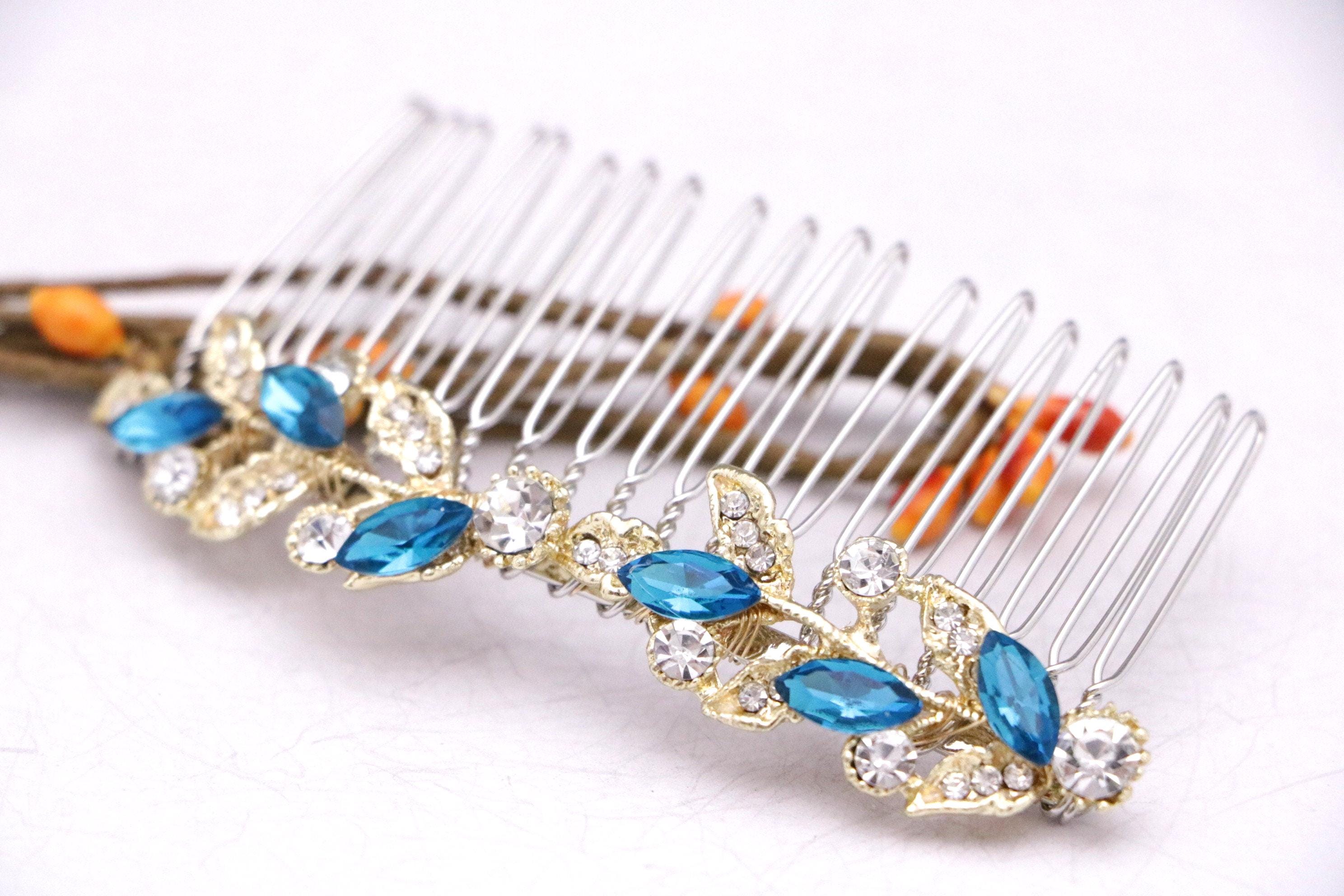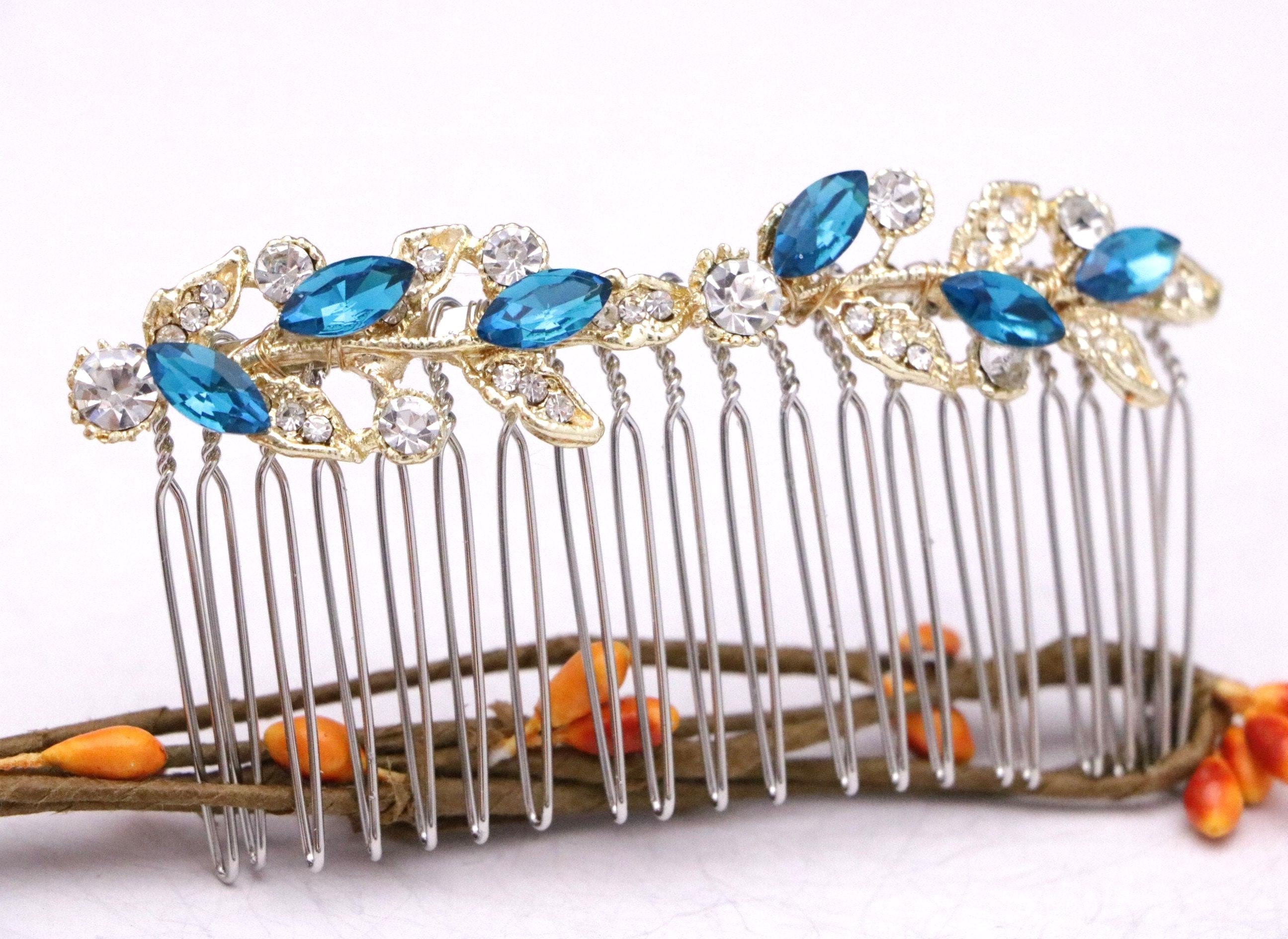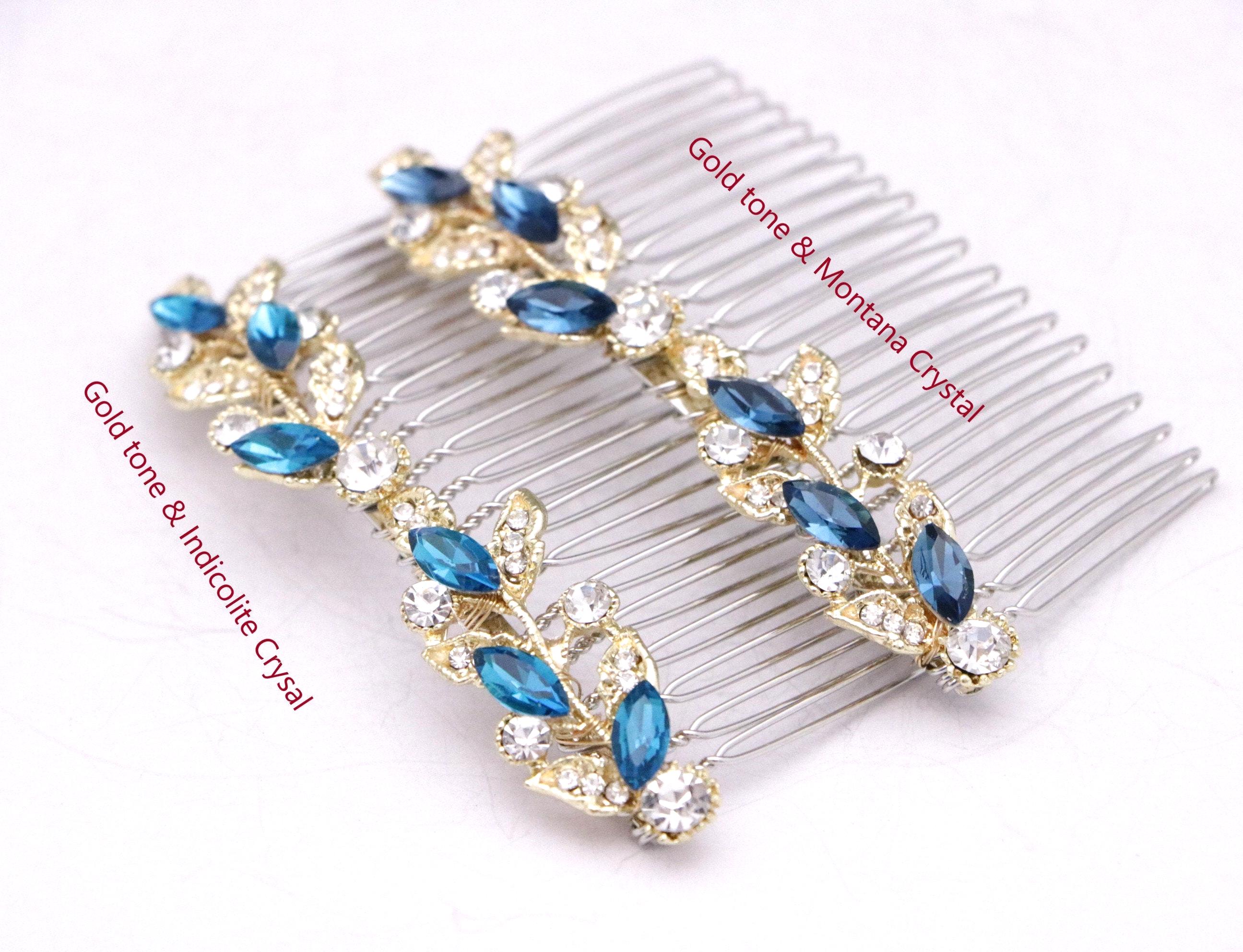 This beautiful Clear rhinestone and Indicolite Crystal hair comb is a perfect compliment for the wedding party and can easily fit into any hair style. The Rhinestone part measured approximately 3.5 X 0.75 inches.