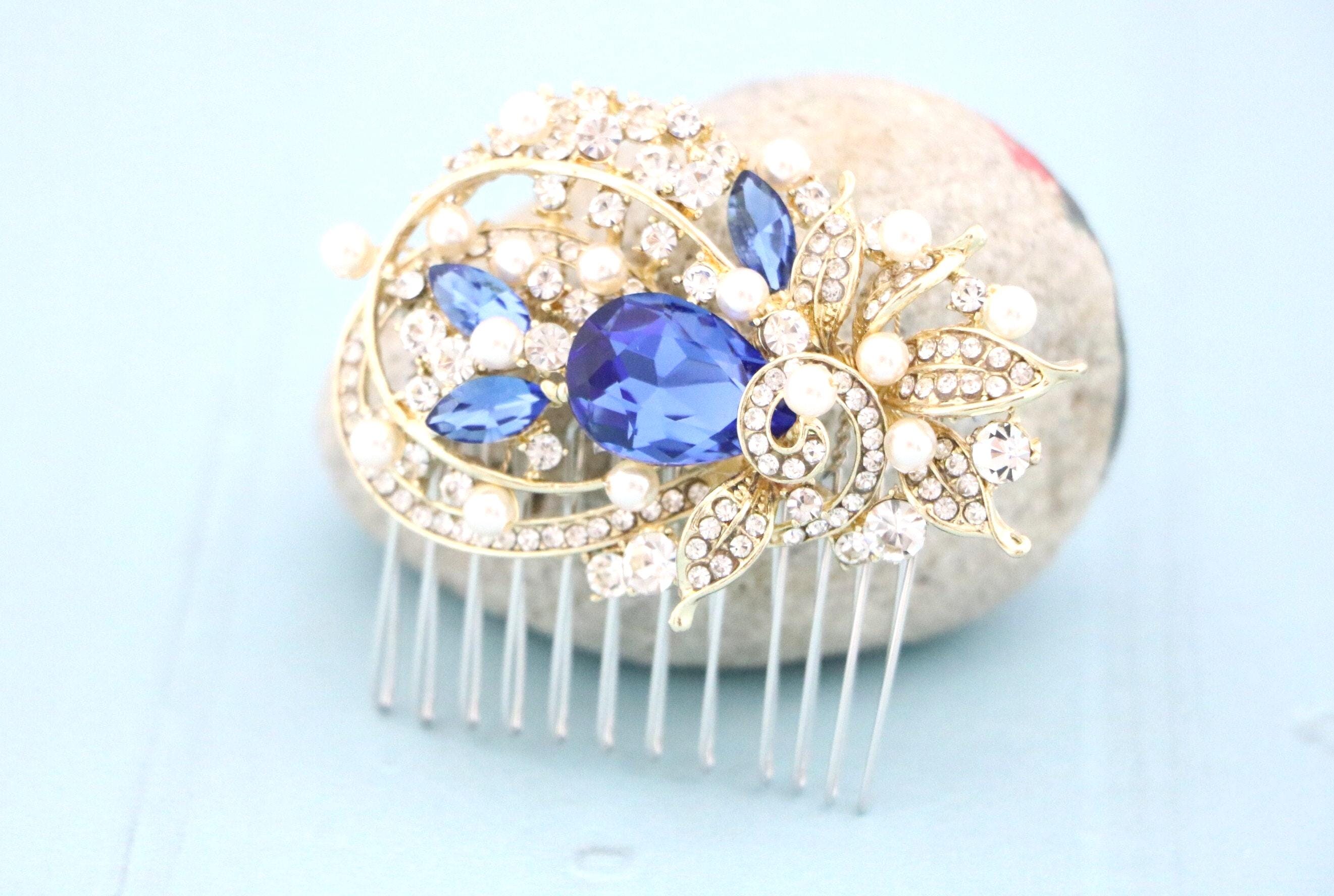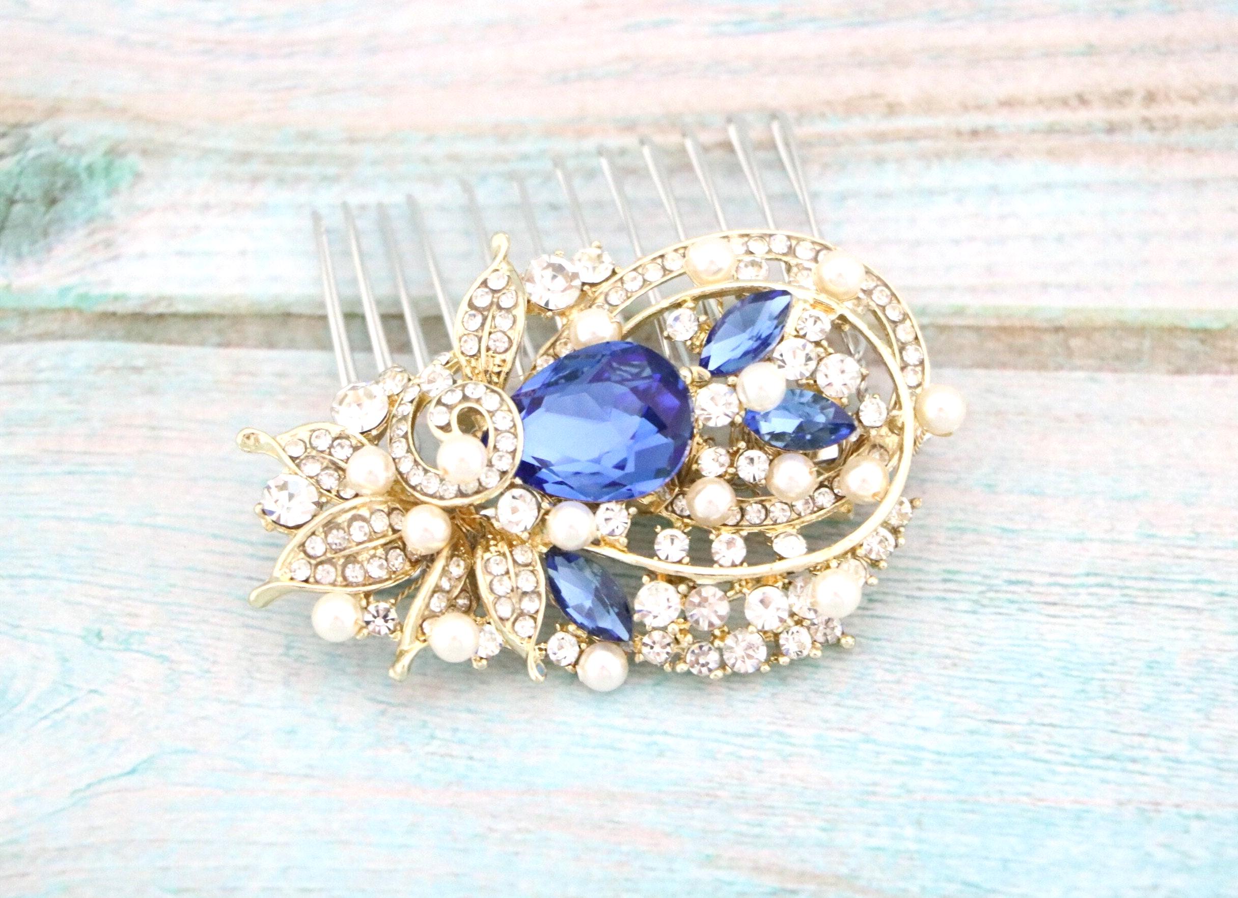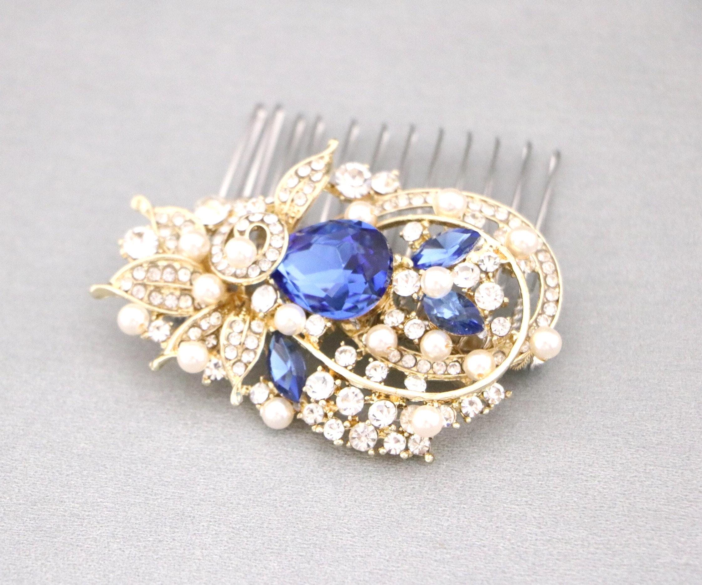 This beautiful Clear rhinestone and Sapphire Crystal Pearl hair comb is a perfect compliment for the wedding party and can easily fit into any hairstyle. The Rhinestone part measured approximately 2.75 X 1.75 inches.