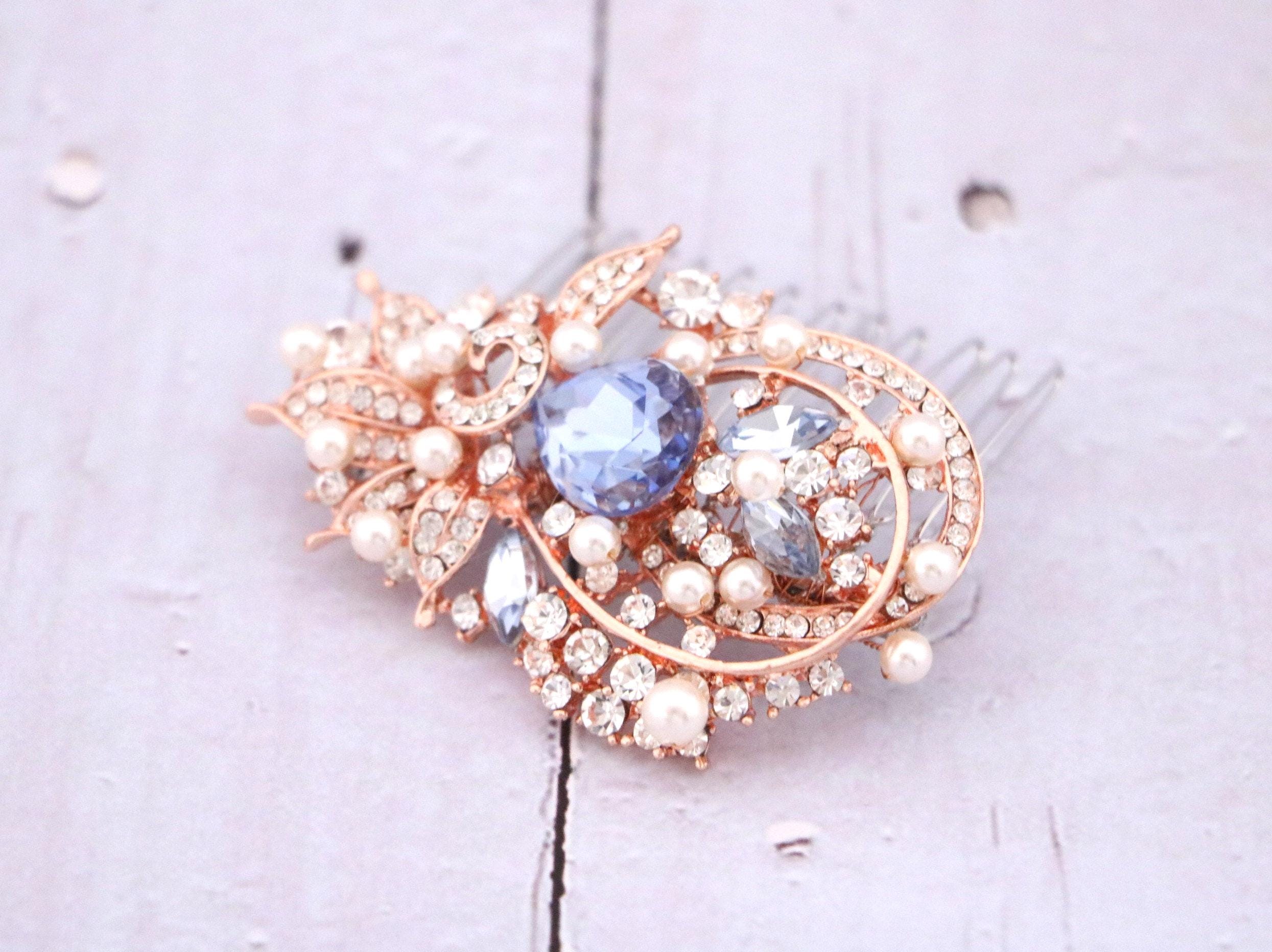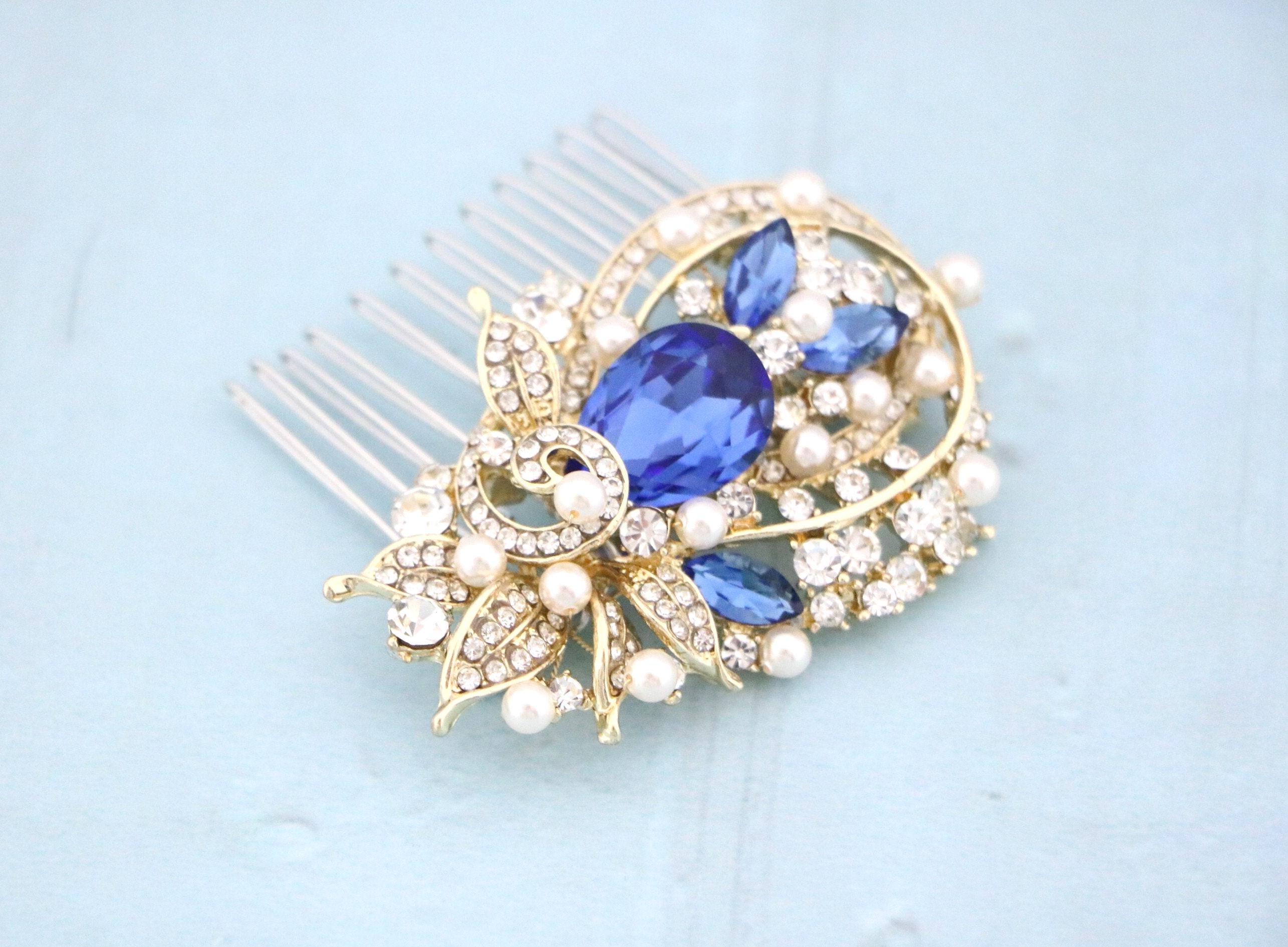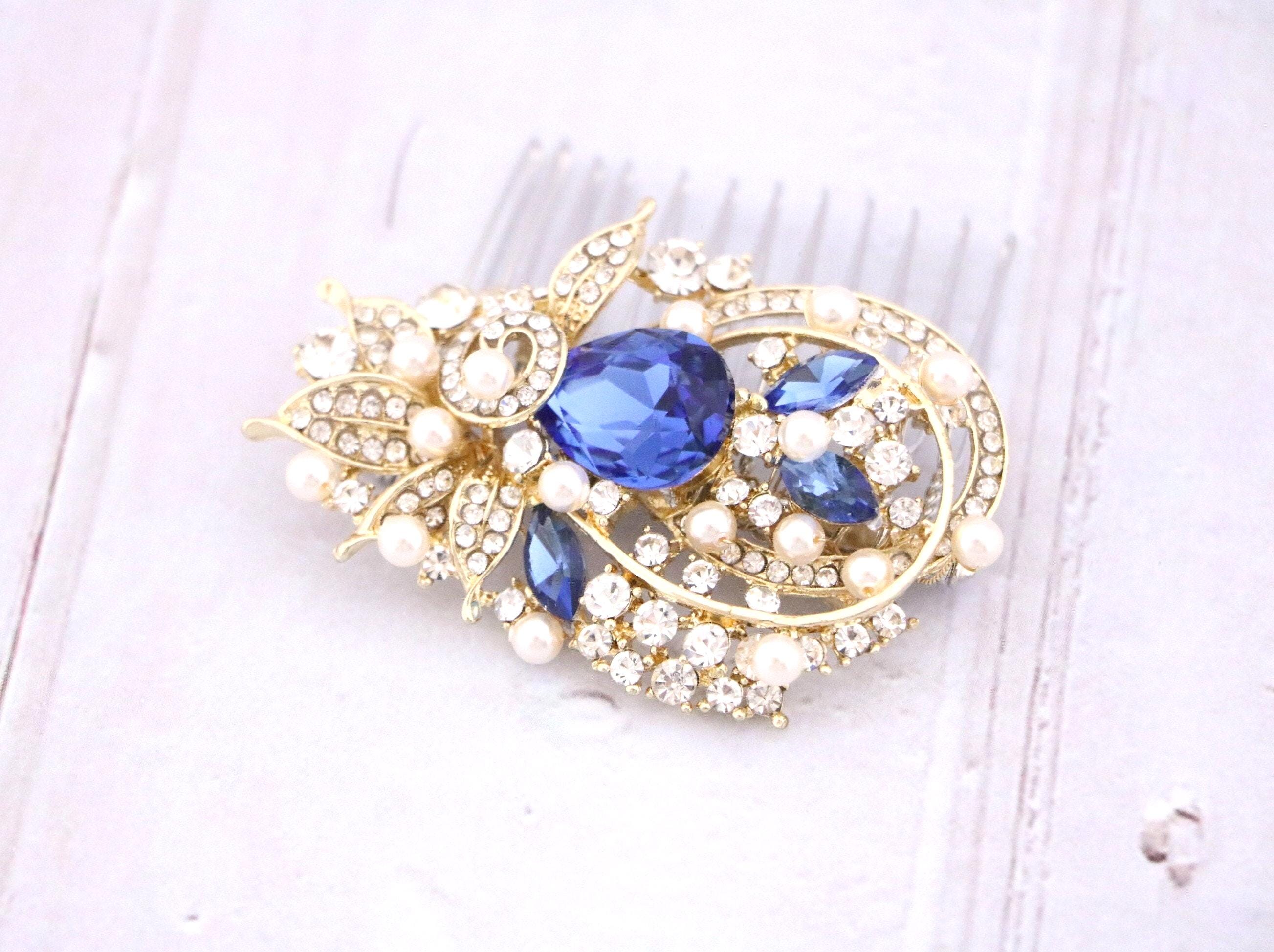 This beautiful Clear rhinestone and Sapphire Crystal Pearl hair comb is a perfect compliment for the wedding party and can easily fit into any hairstyle. The Rhinestone part measured approximately 2.75 X 1.75 inches.