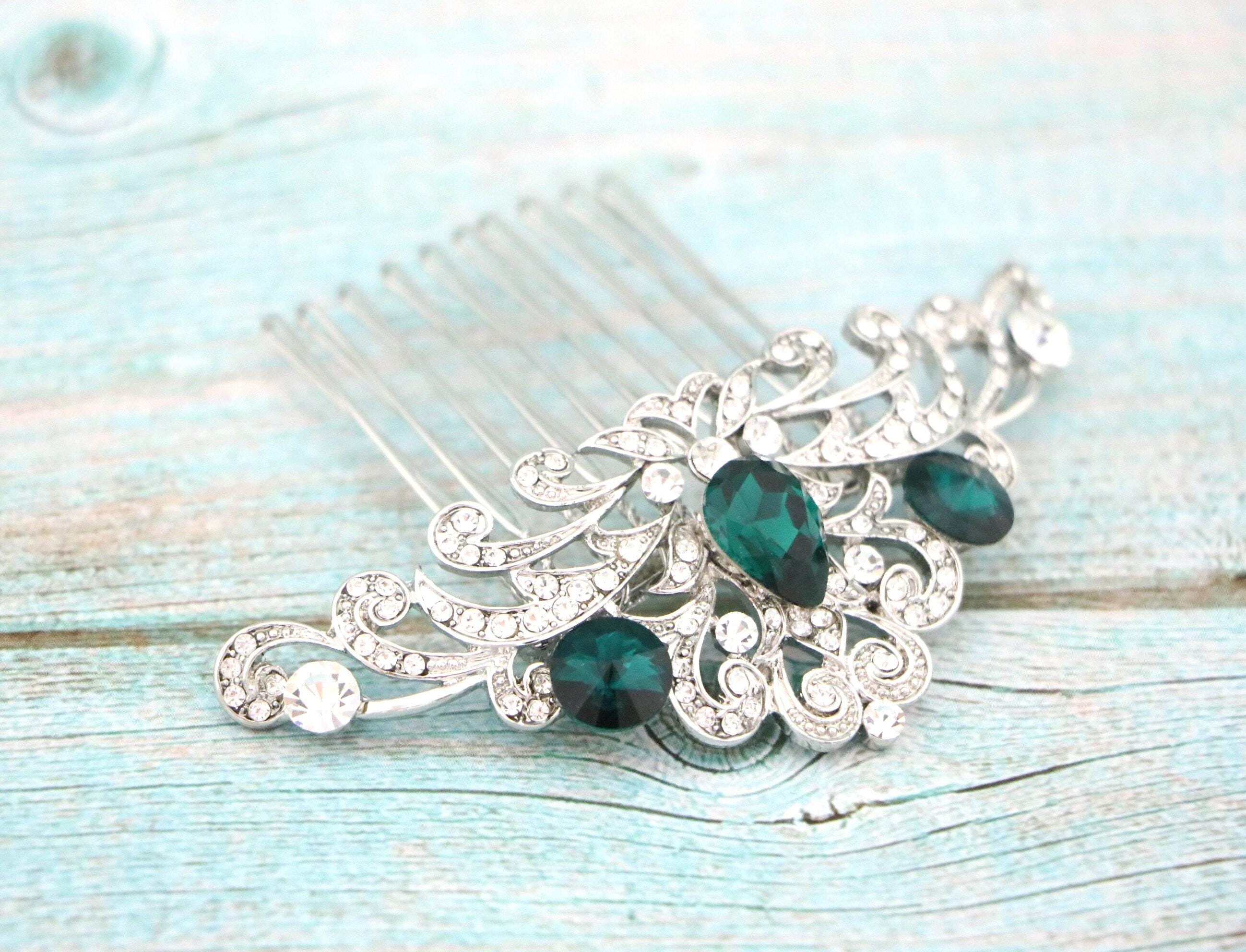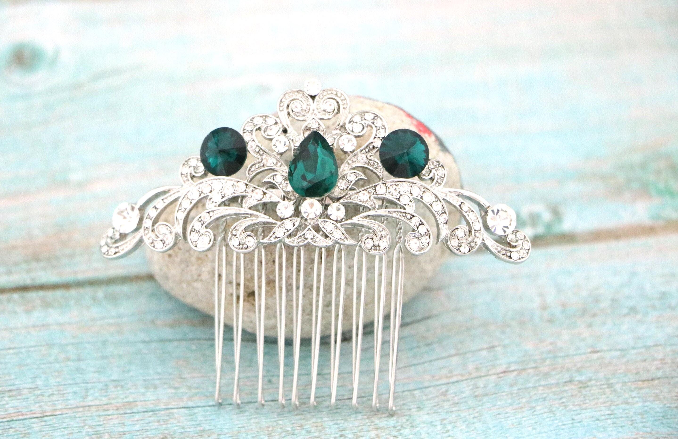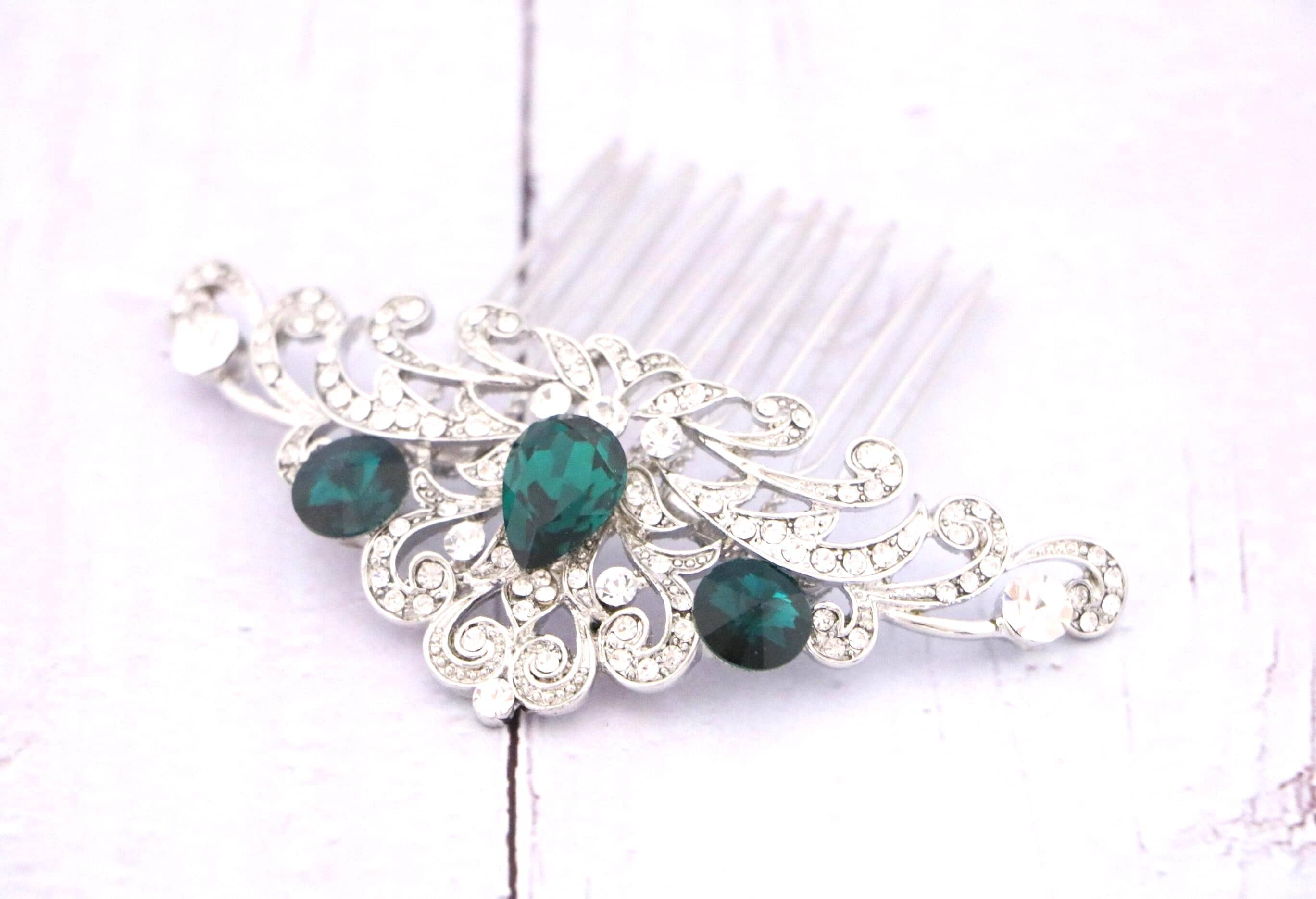 This beautiful Clear rhinestone and Emerald Crystal hair comb is a perfect compliment for the wedding party and can easily fit into any hair style. The Rhinestone part measured approximately 3.75 X 1.5 inches.