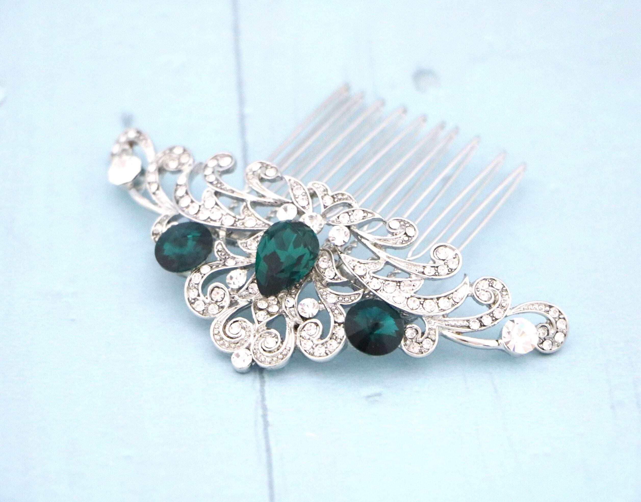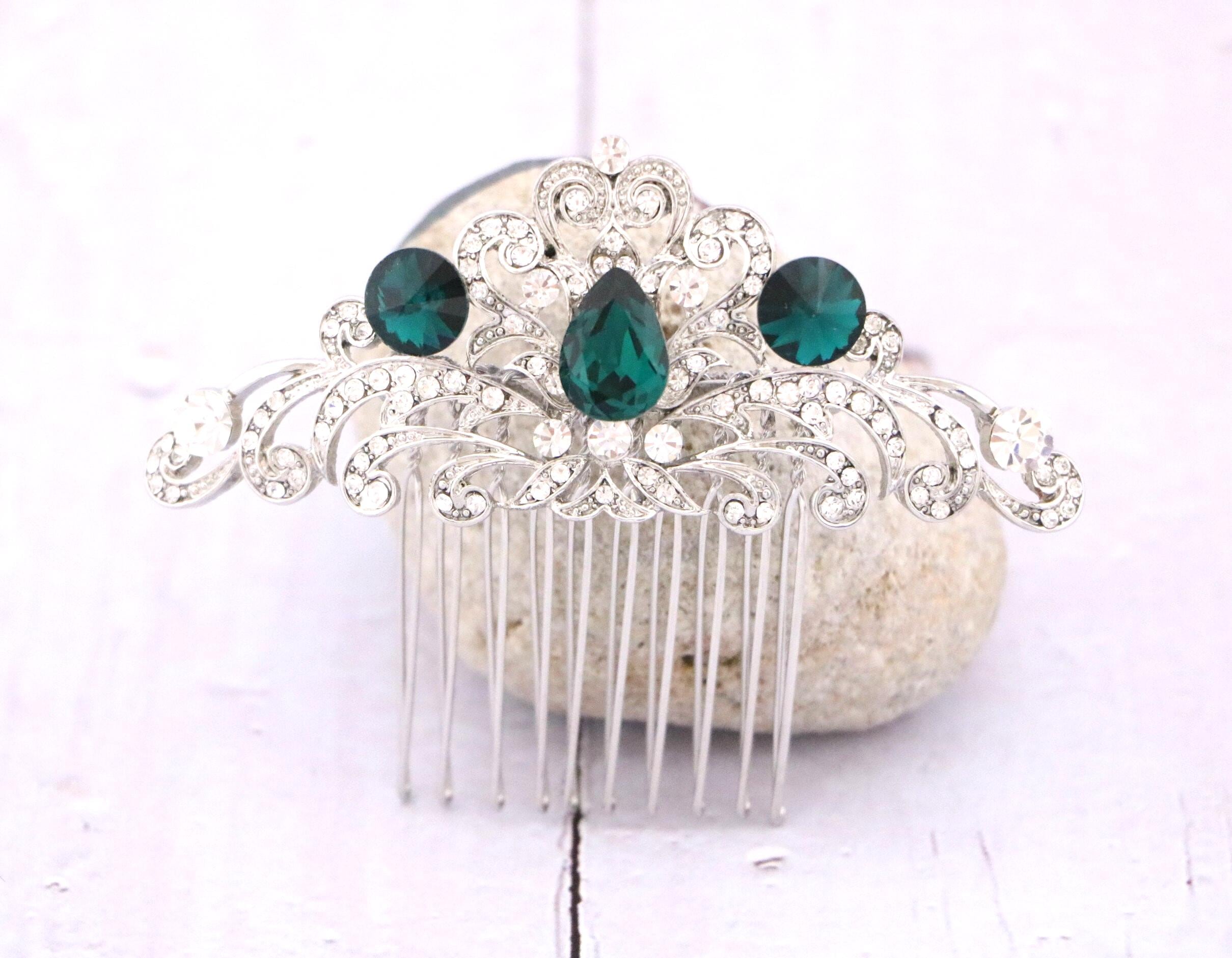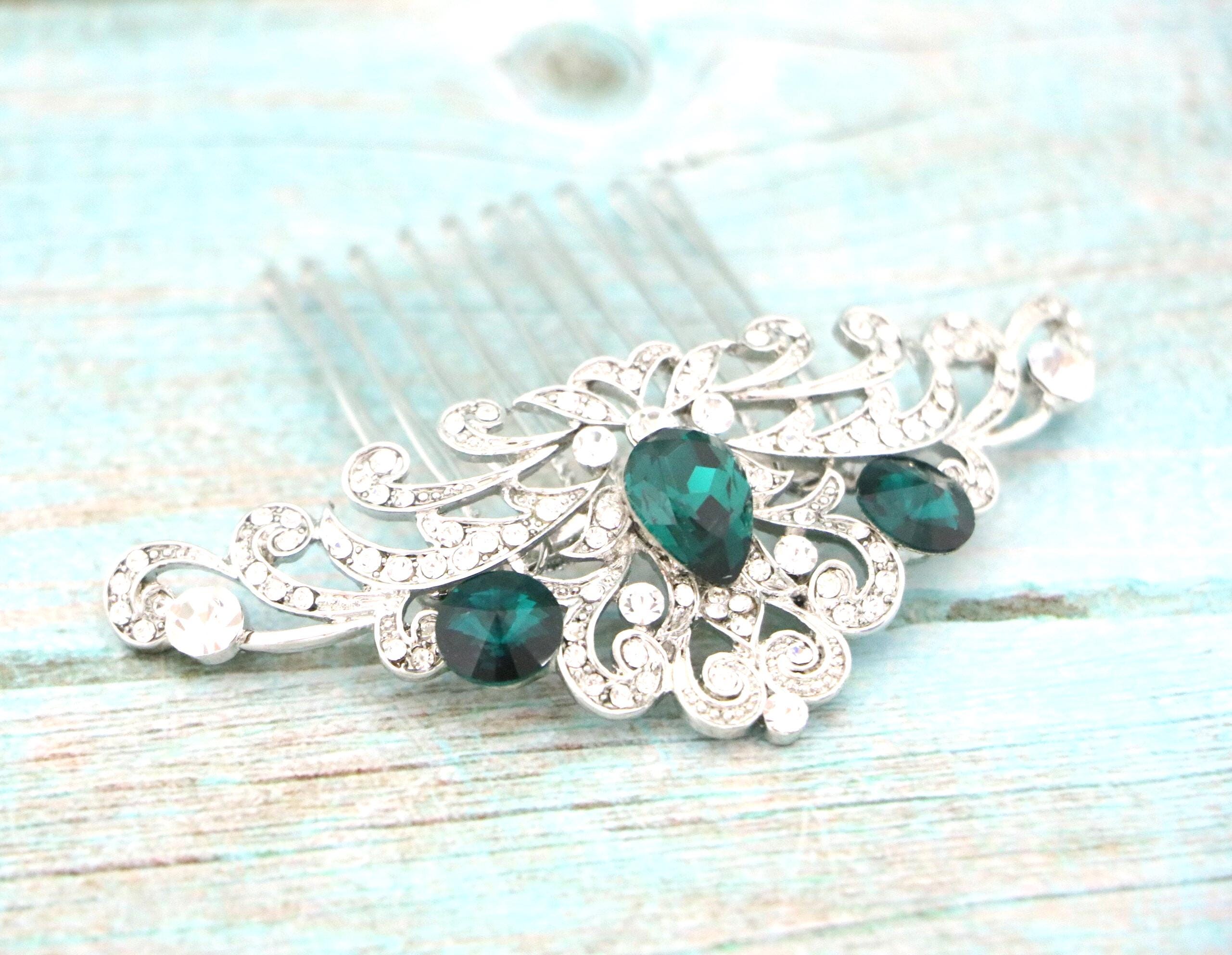 This beautiful Clear rhinestone and Emerald Crystal hair comb is a perfect compliment for the wedding party and can easily fit into any hair style. The Rhinestone part measured approximately 3.75 X 1.5 inches.