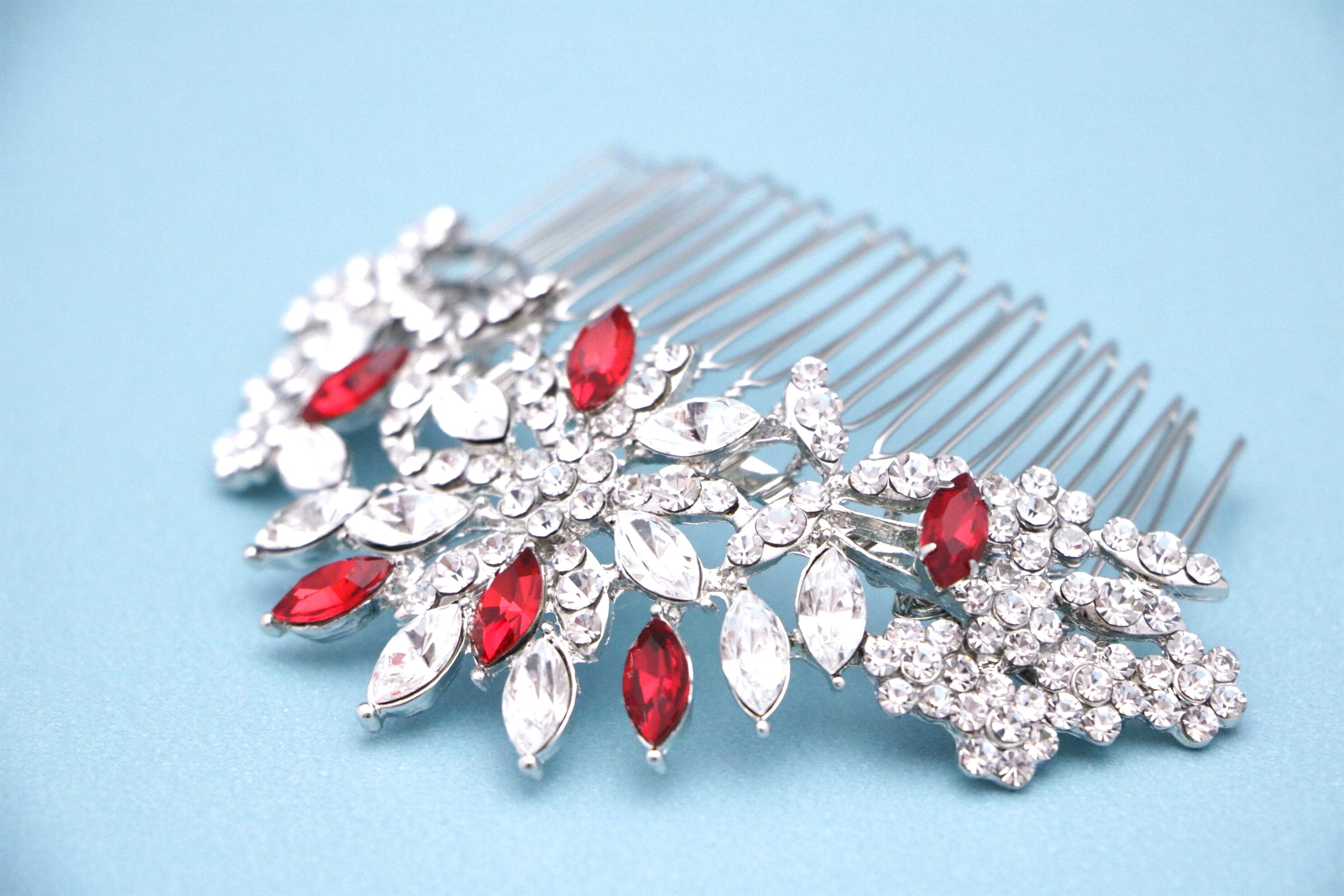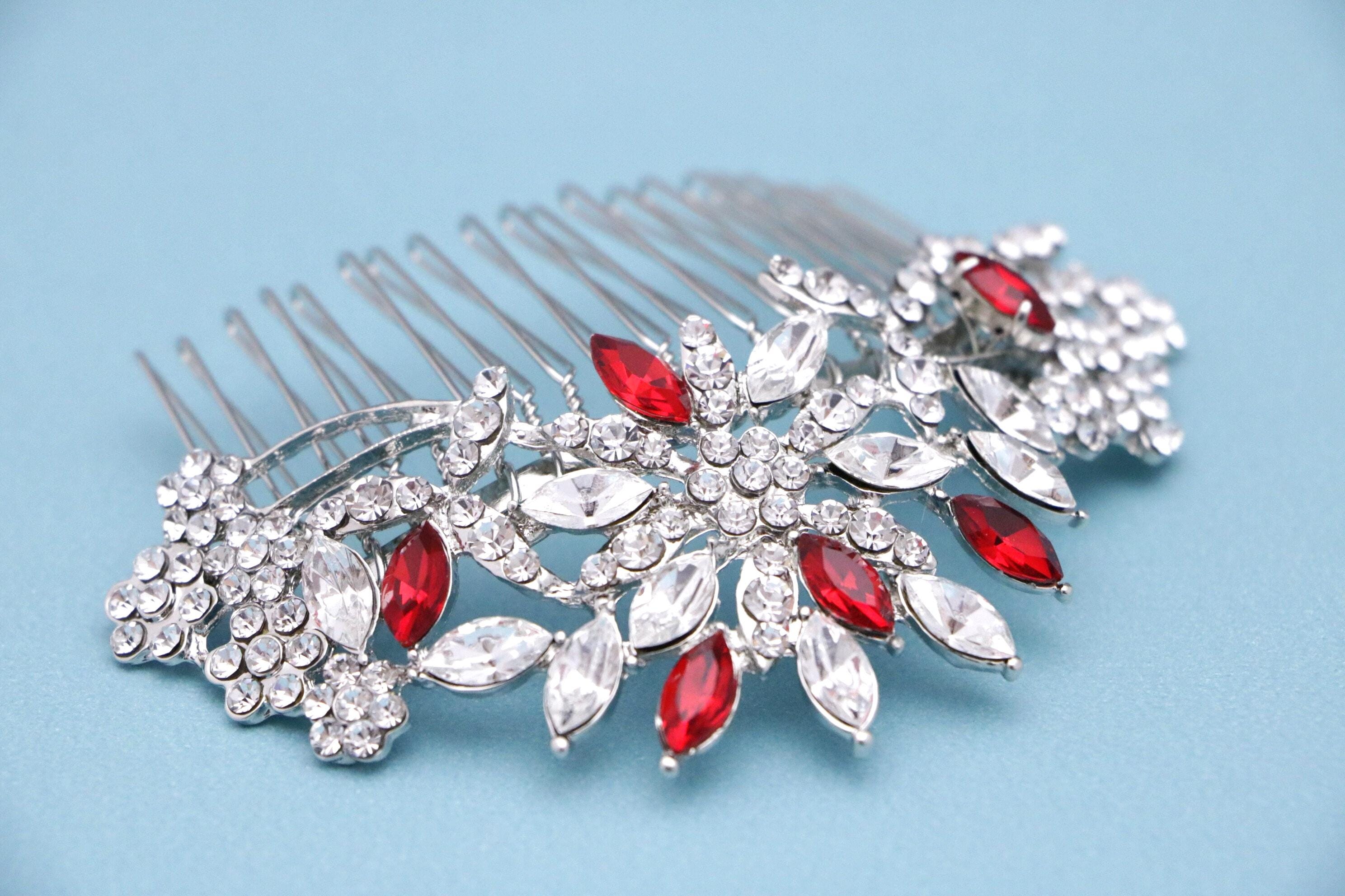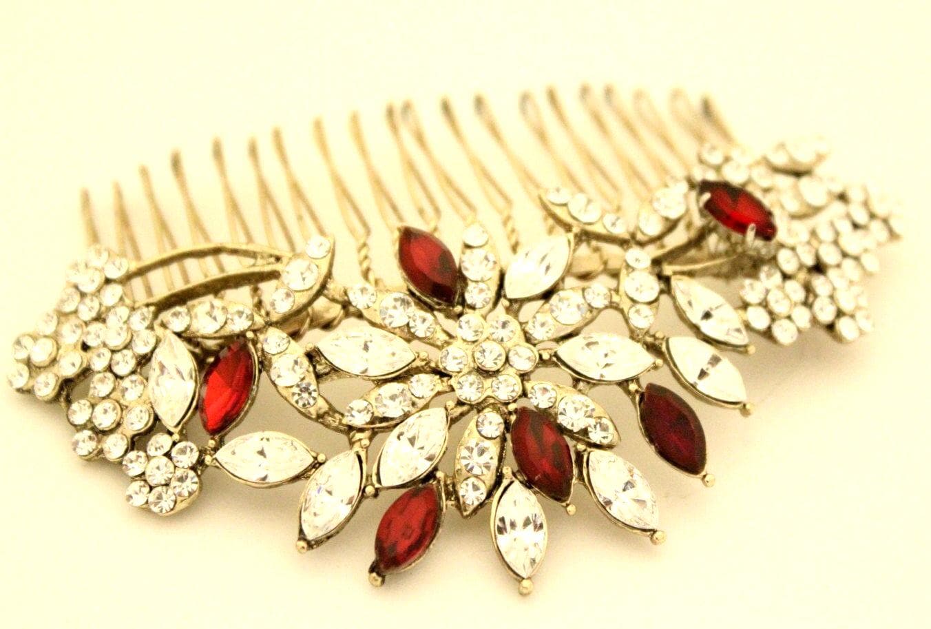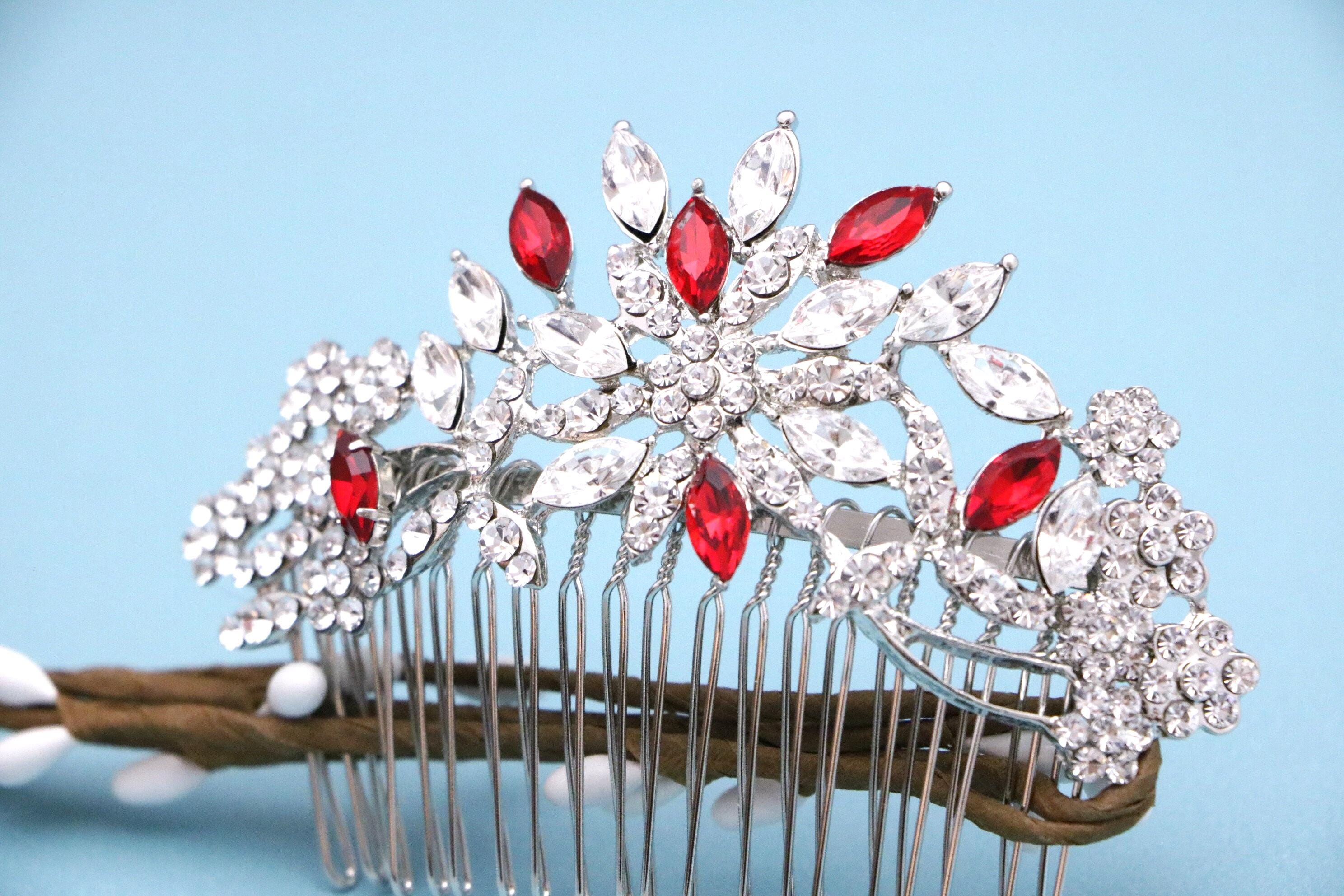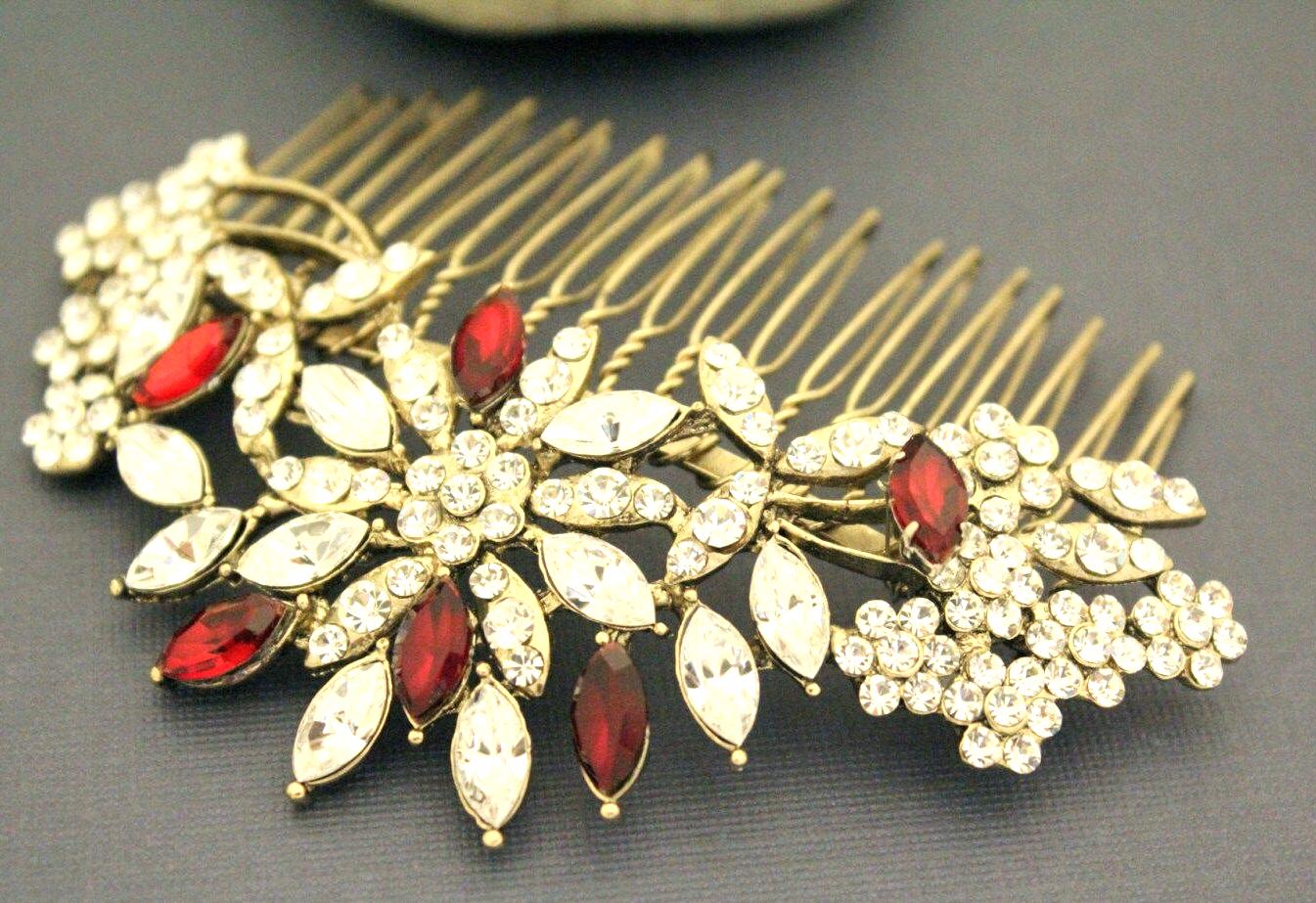 This beautiful Vintage gold tone Clear rhinestone and Red Crystal hair comb is a perfect compliment for the wedding party and can easily fit into any hair style. The Rhinestone part measured approximately 4 X 1.5 inches.