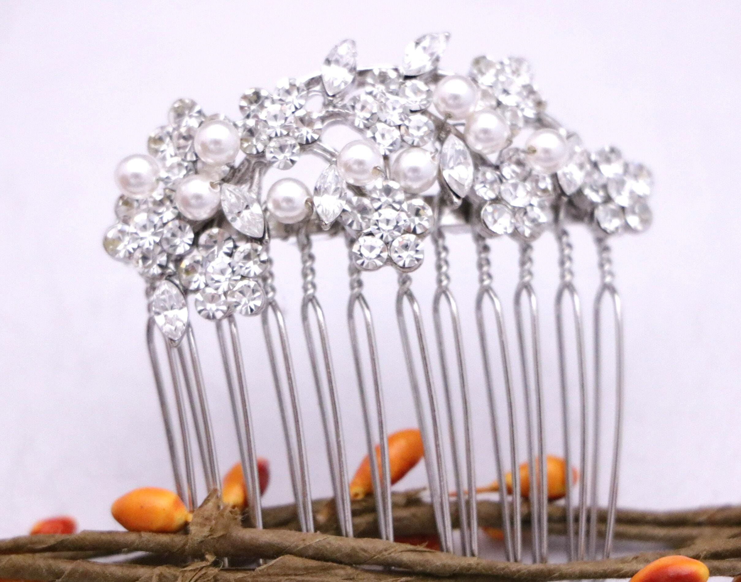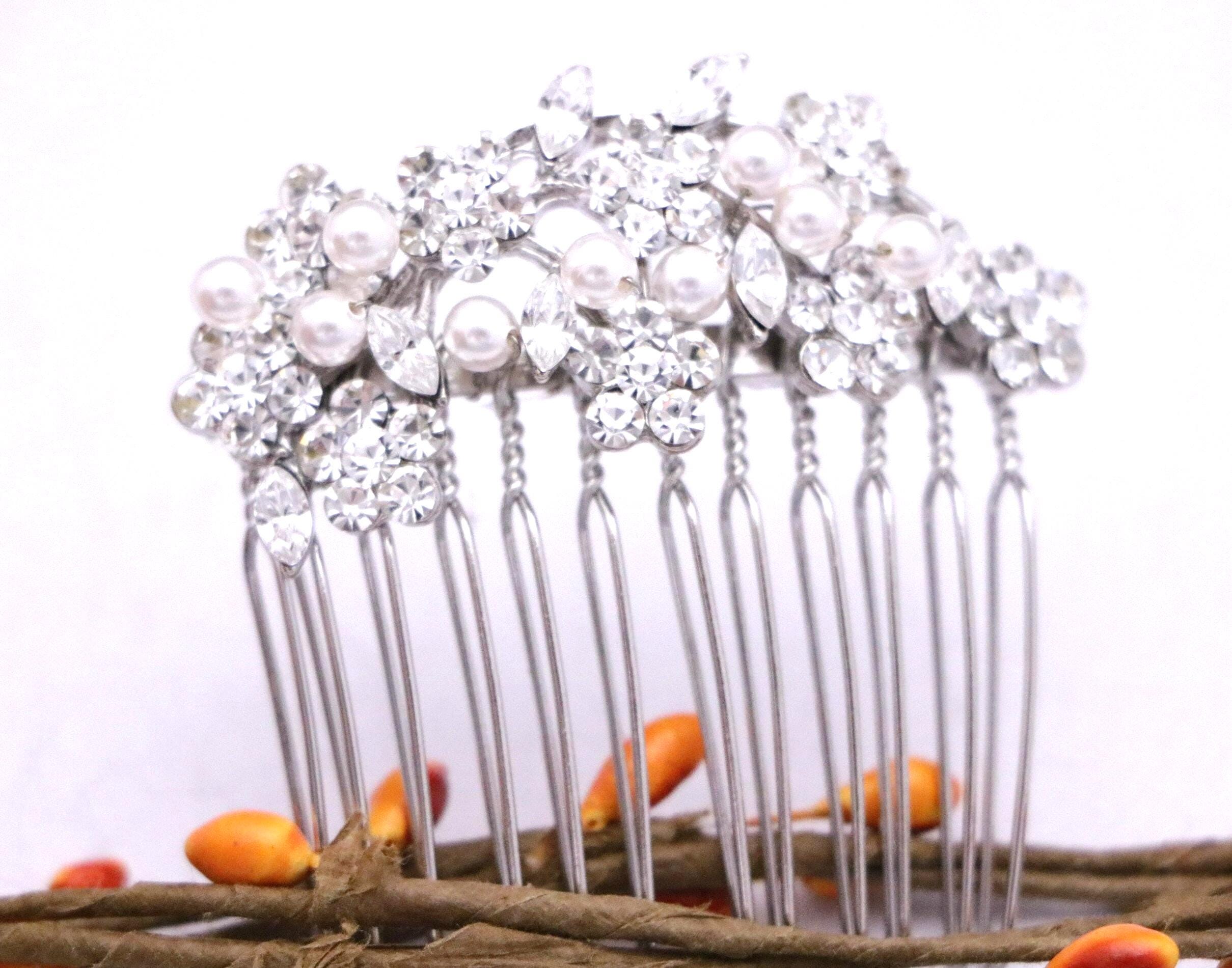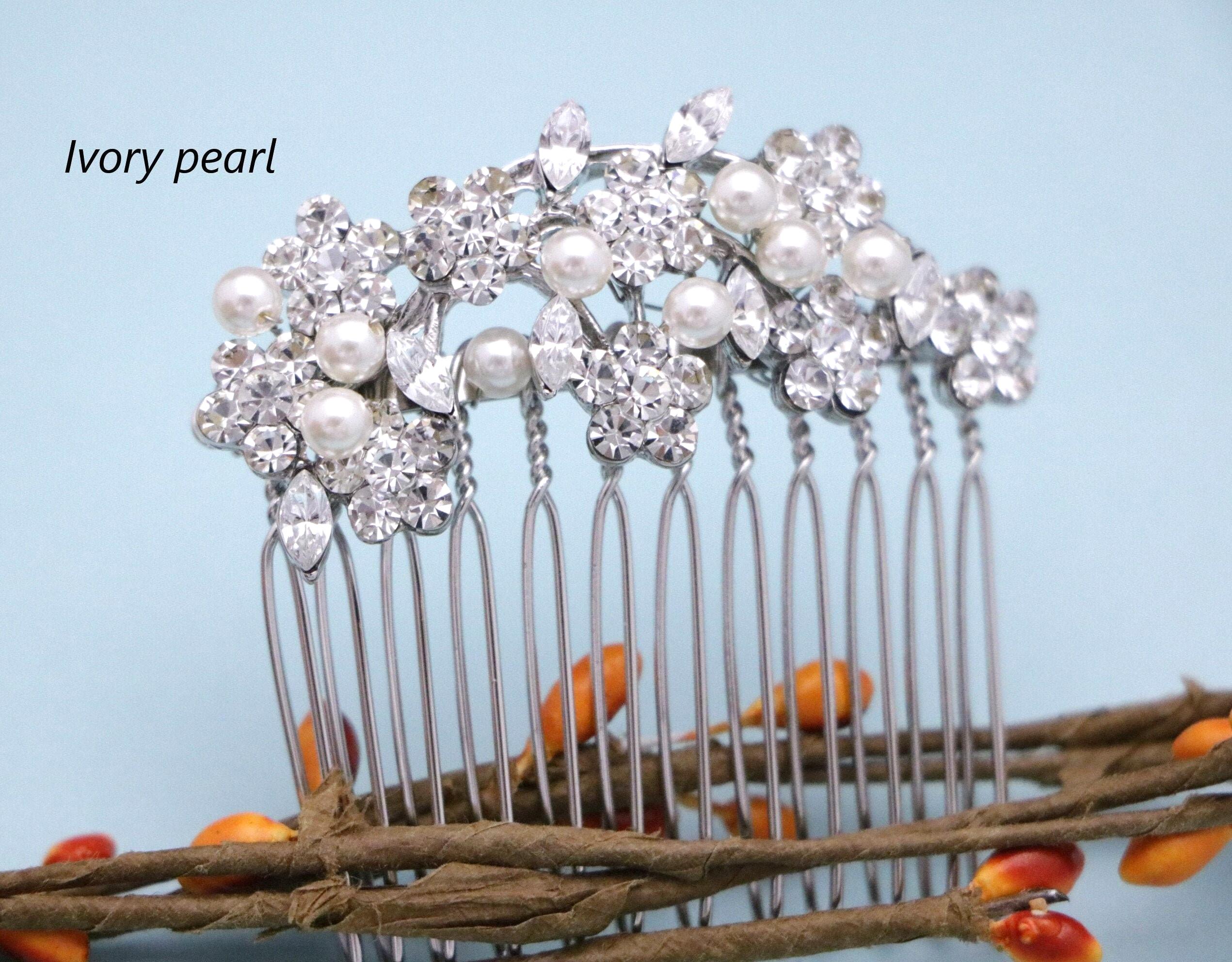 This spectacular Ivory Swarovski pearl and rhinestone piece is attached to a metal comb. Perfect for your big day or a gift for your bridesmaids! The rhinestone piece is measure about 2 X 1 inches. This is not a large headpiece.