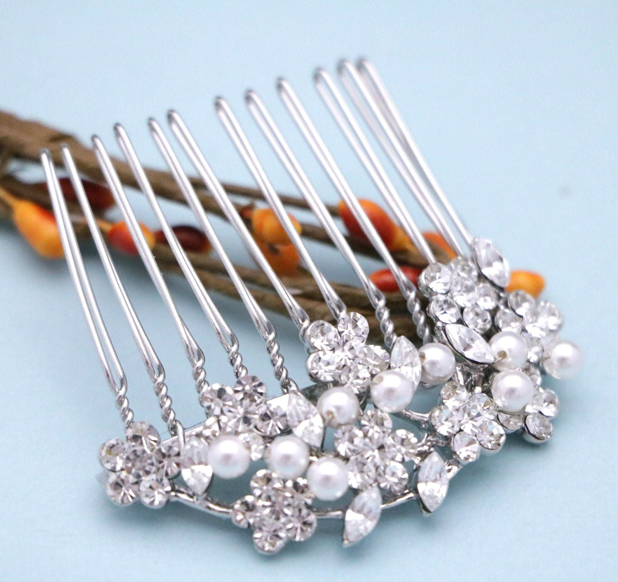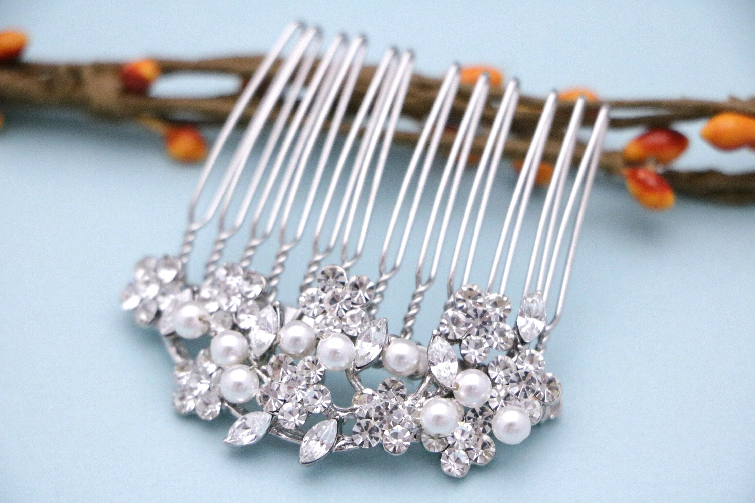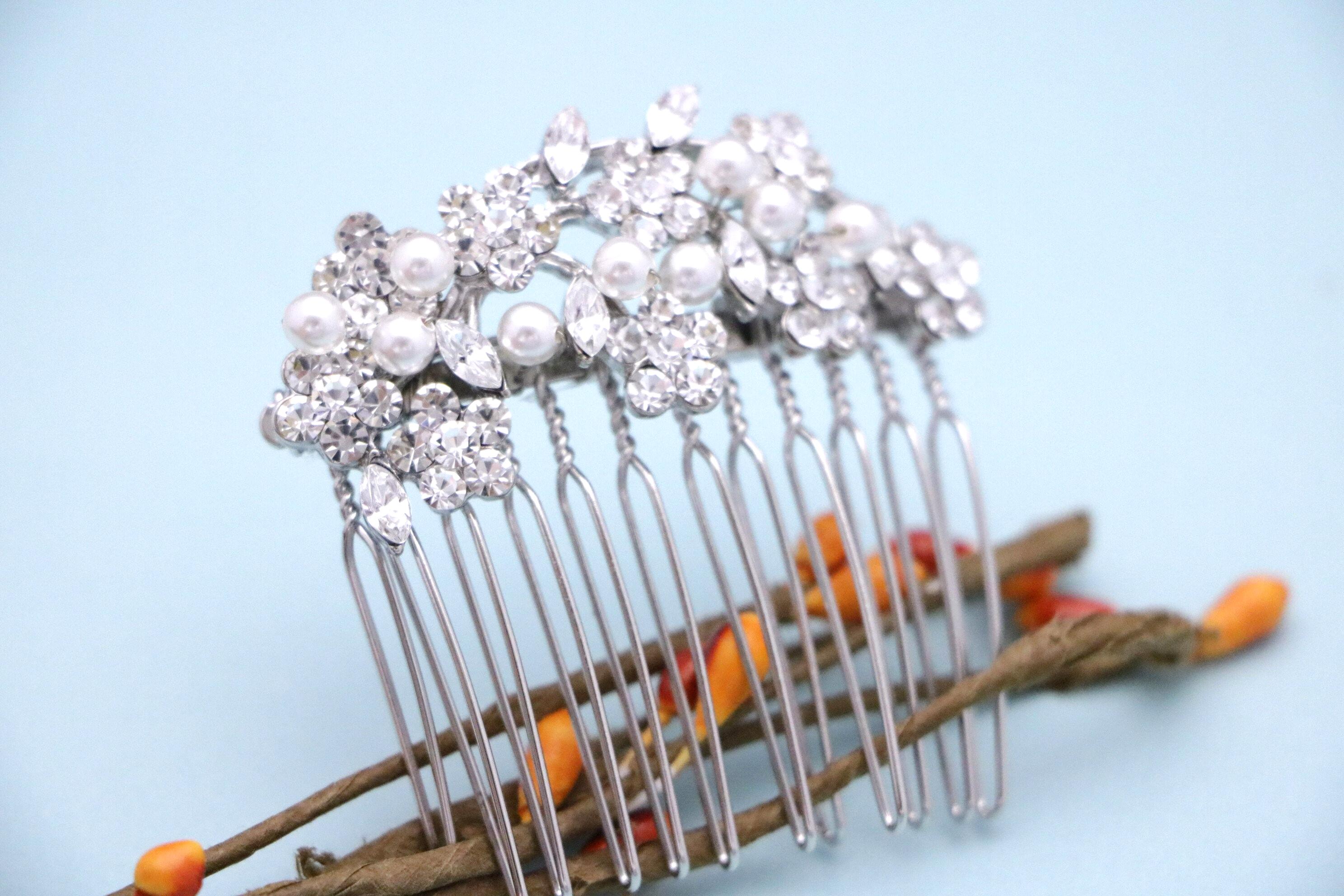 This spectacular Ivory Swarovski pearl and rhinestone piece is attached to a metal comb. Perfect for your big day or a gift for your bridesmaids! The rhinestone piece is measure about 2 X 1 inches. This is not a large headpiece.
