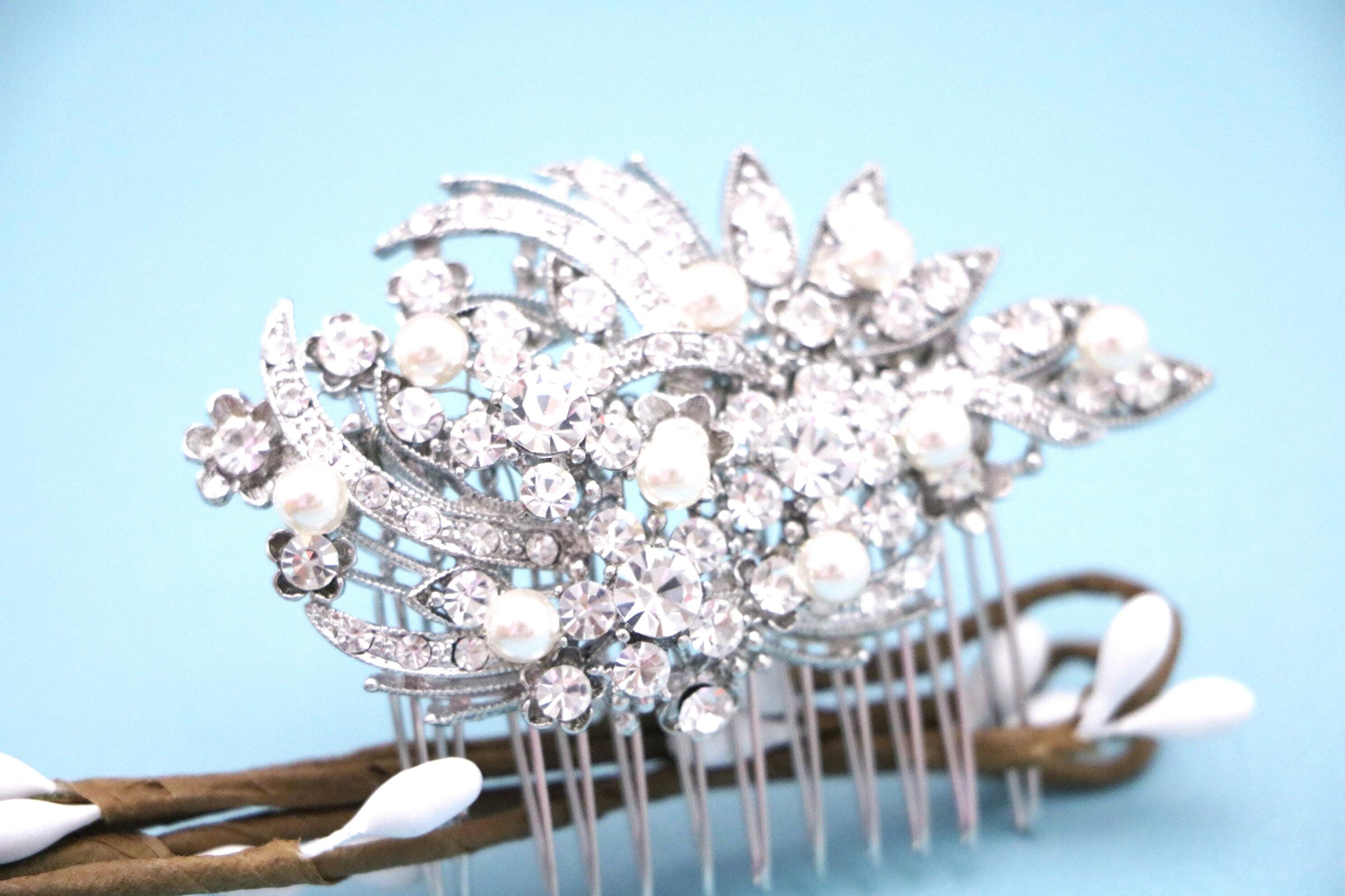 This sparkle rhinestone hair comb features a very beautiful vintage style rhinestone piece. Rhinestone piece can set on a metal barrette or on a metal hair comb. The rhinestone part measures approximately 3 X 1.75 inches.