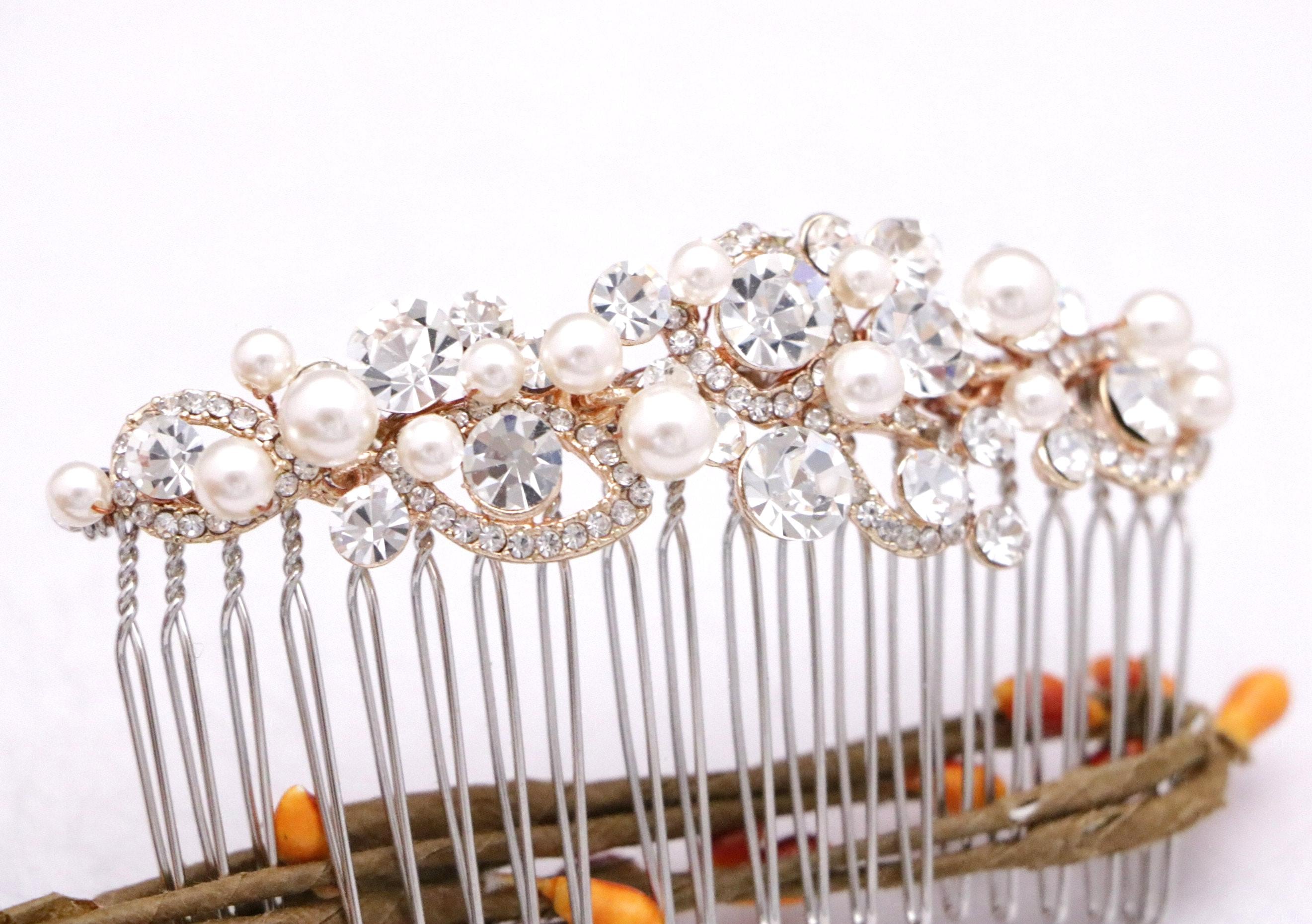 This sparkle rhinestone hair comb features a very beautiful vintage style rhinestone piece and swarovski ivory pearls. Rhinestone piece and pearls are wired on a silver tone metal comb.