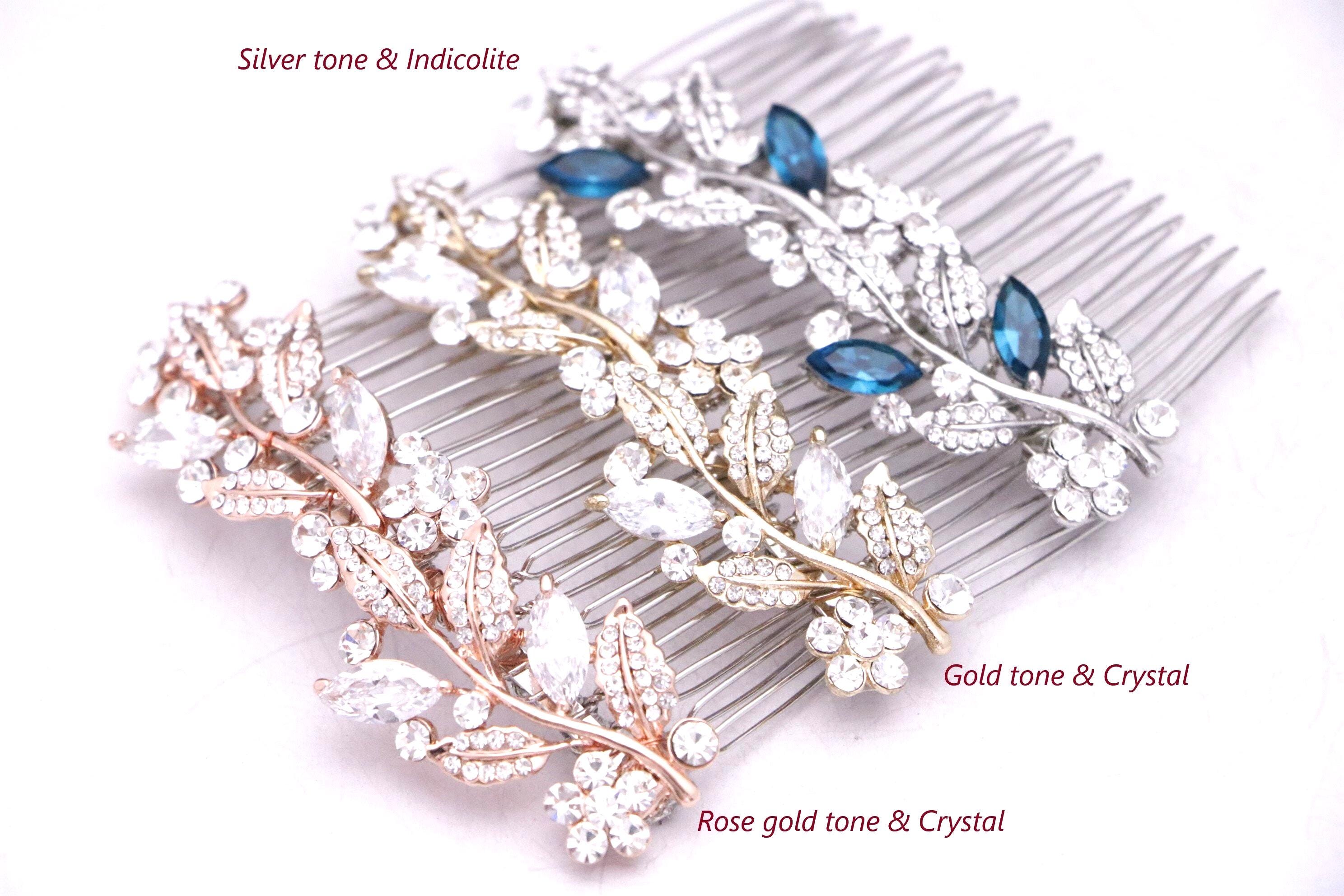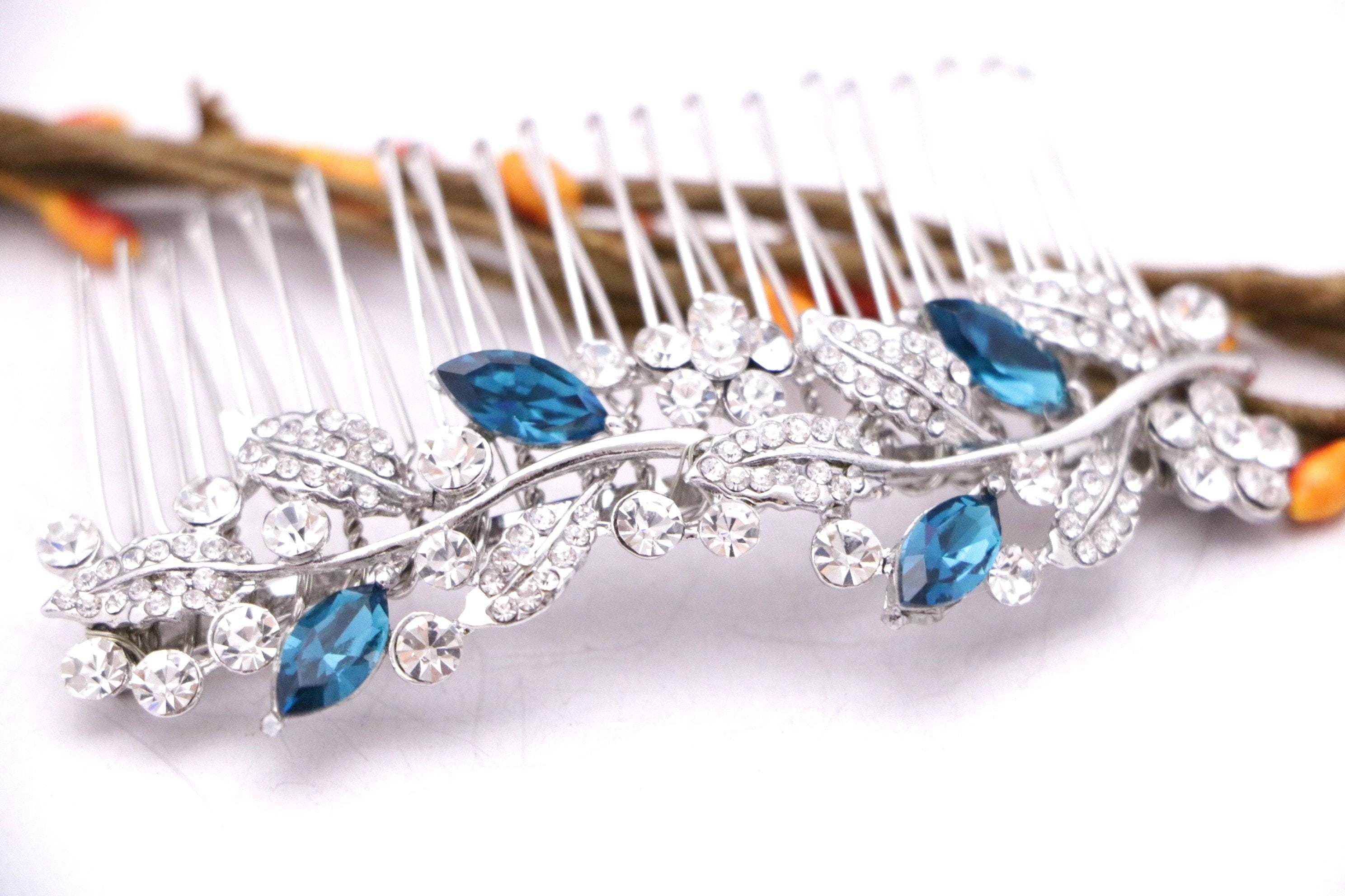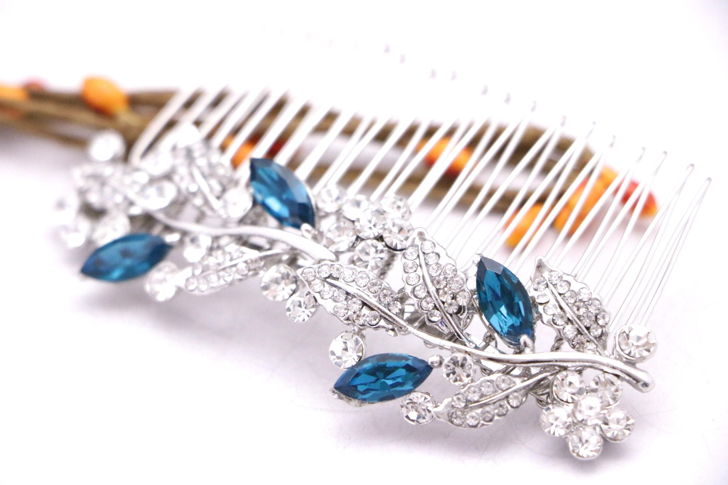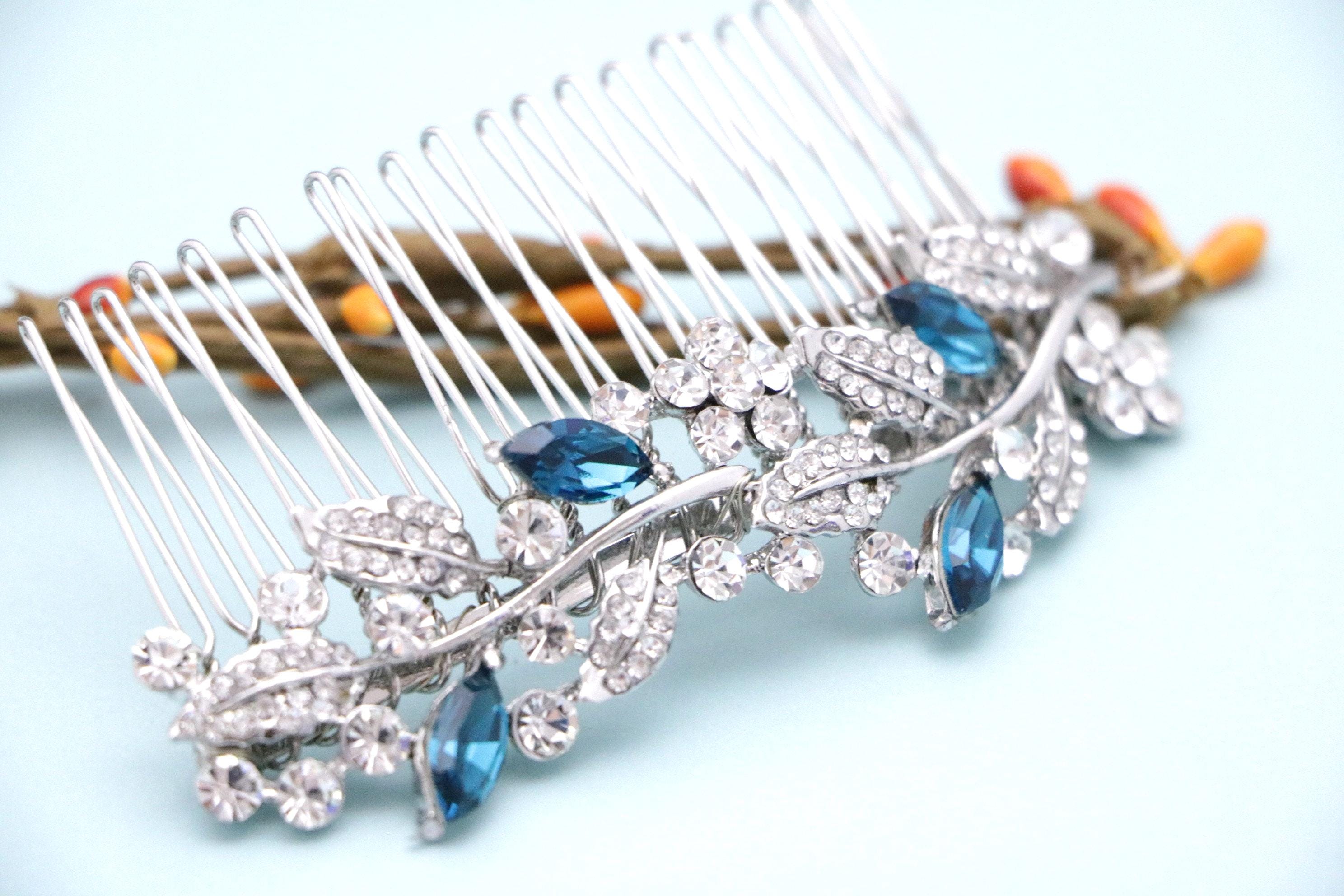 This beautiful Clear rhinestone and Sapphire crystal hair comb is a perfect compliment for the wedding party and can easily fit into any hairstyle. The Rhinestone part measured approximately 3.5 X 1 inch.