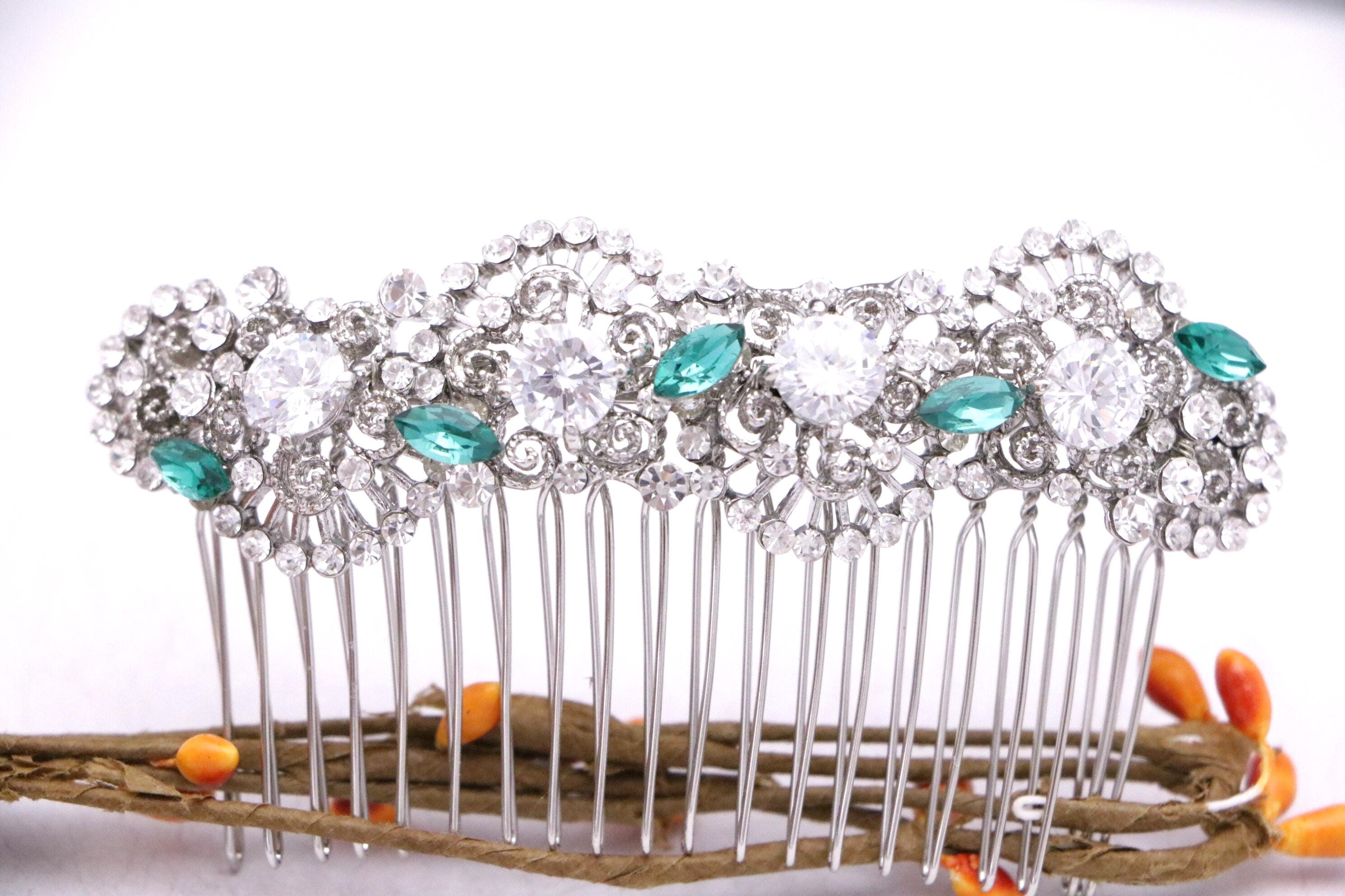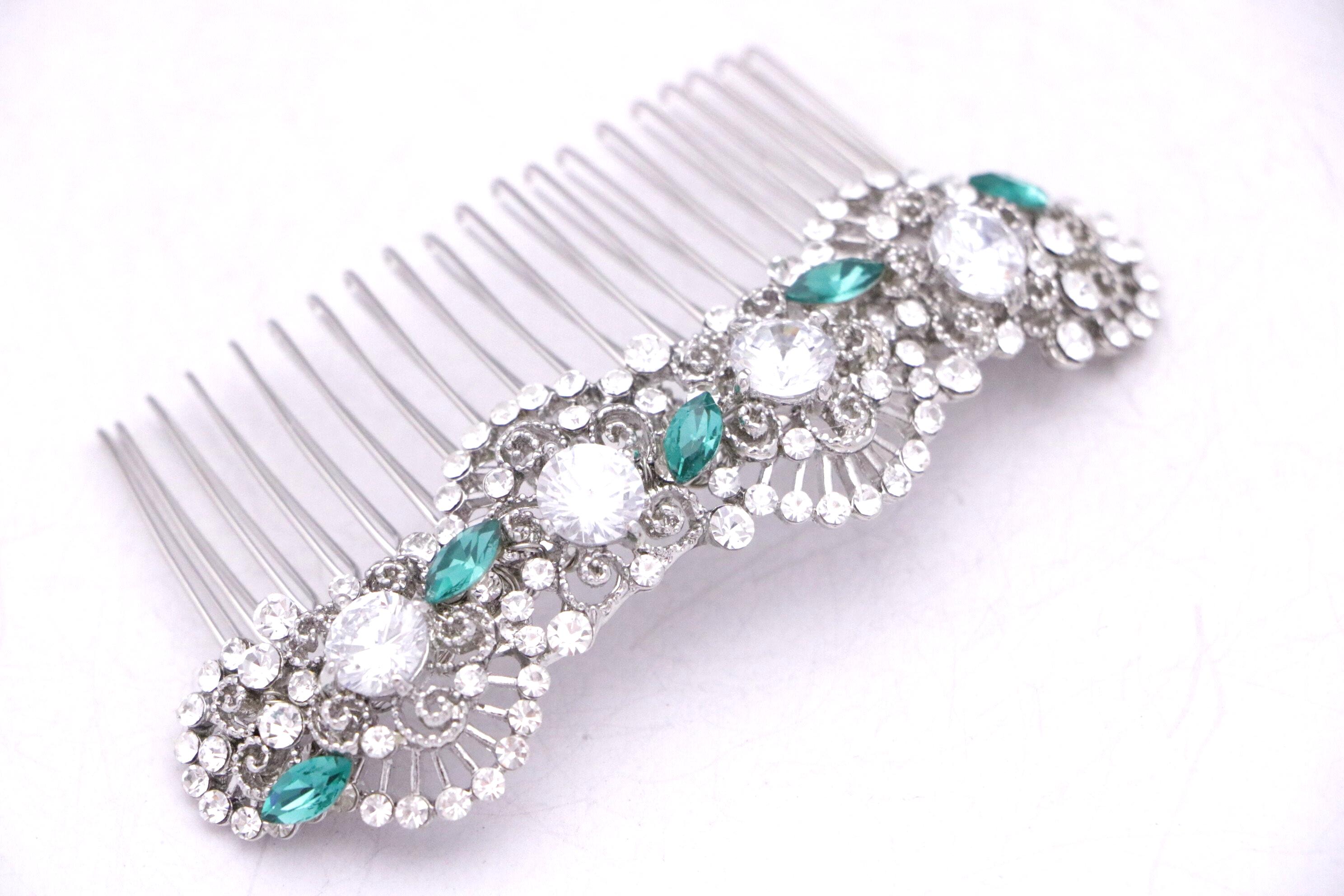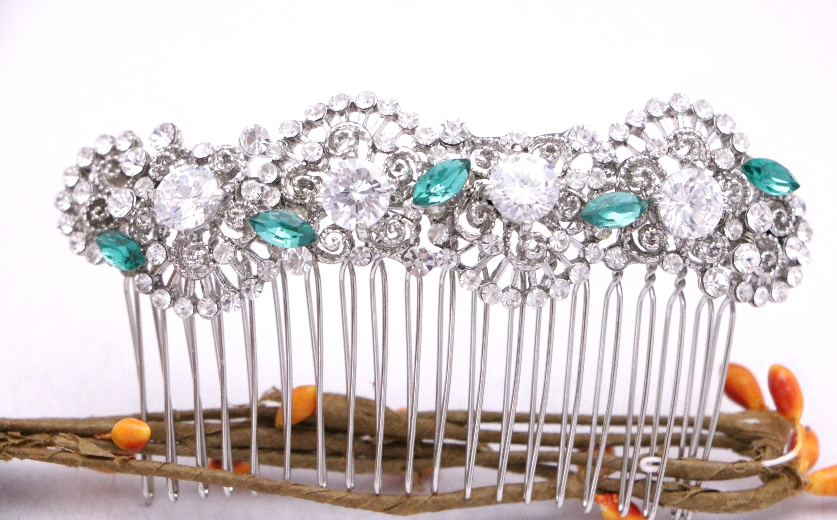 This beautiful Clear rhinestone and Emerald Crystal hair comb is a perfect compliment for the wedding party and can easily fit into any hair style. The Rhinestone part measured approximately 4 X 1 inches.