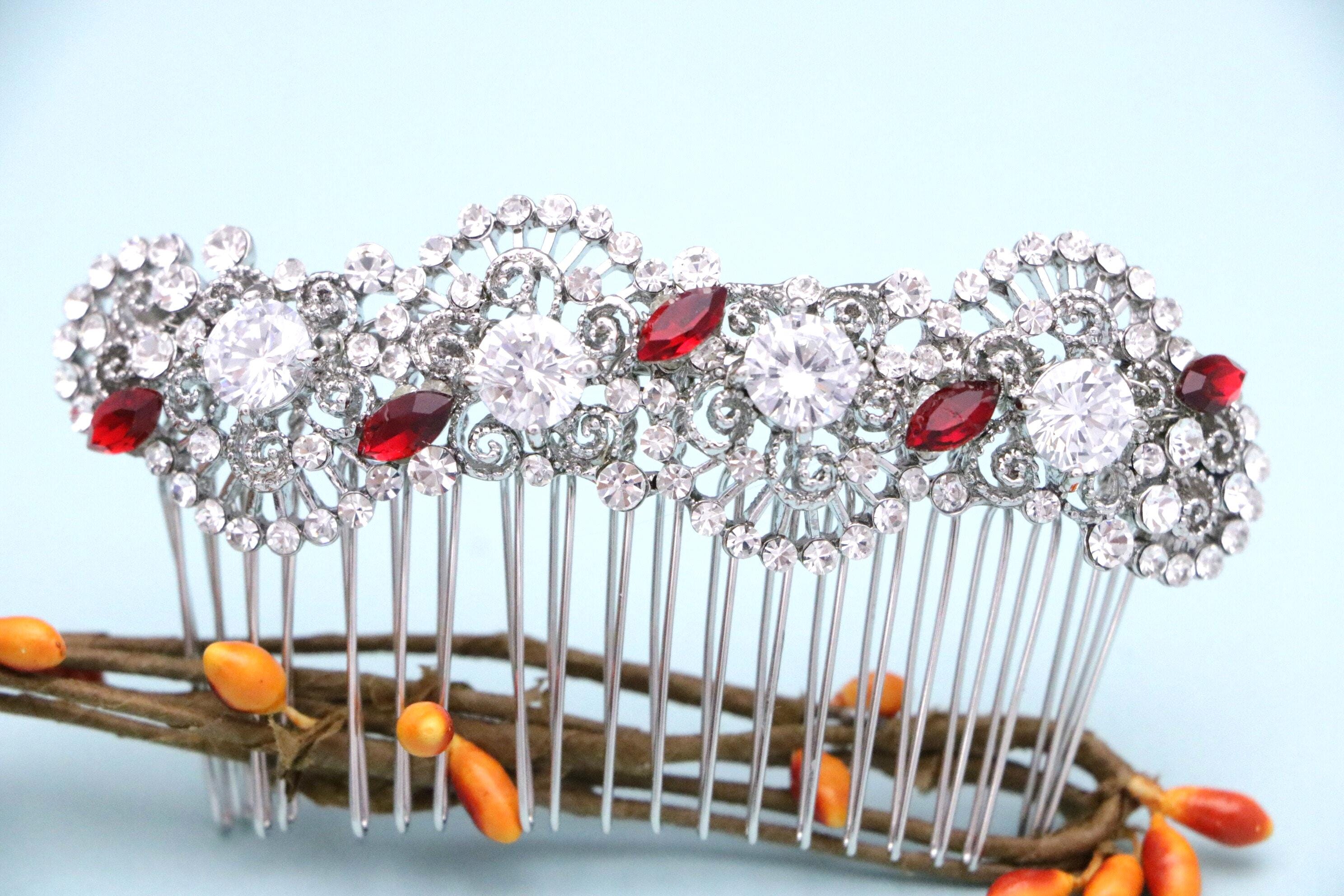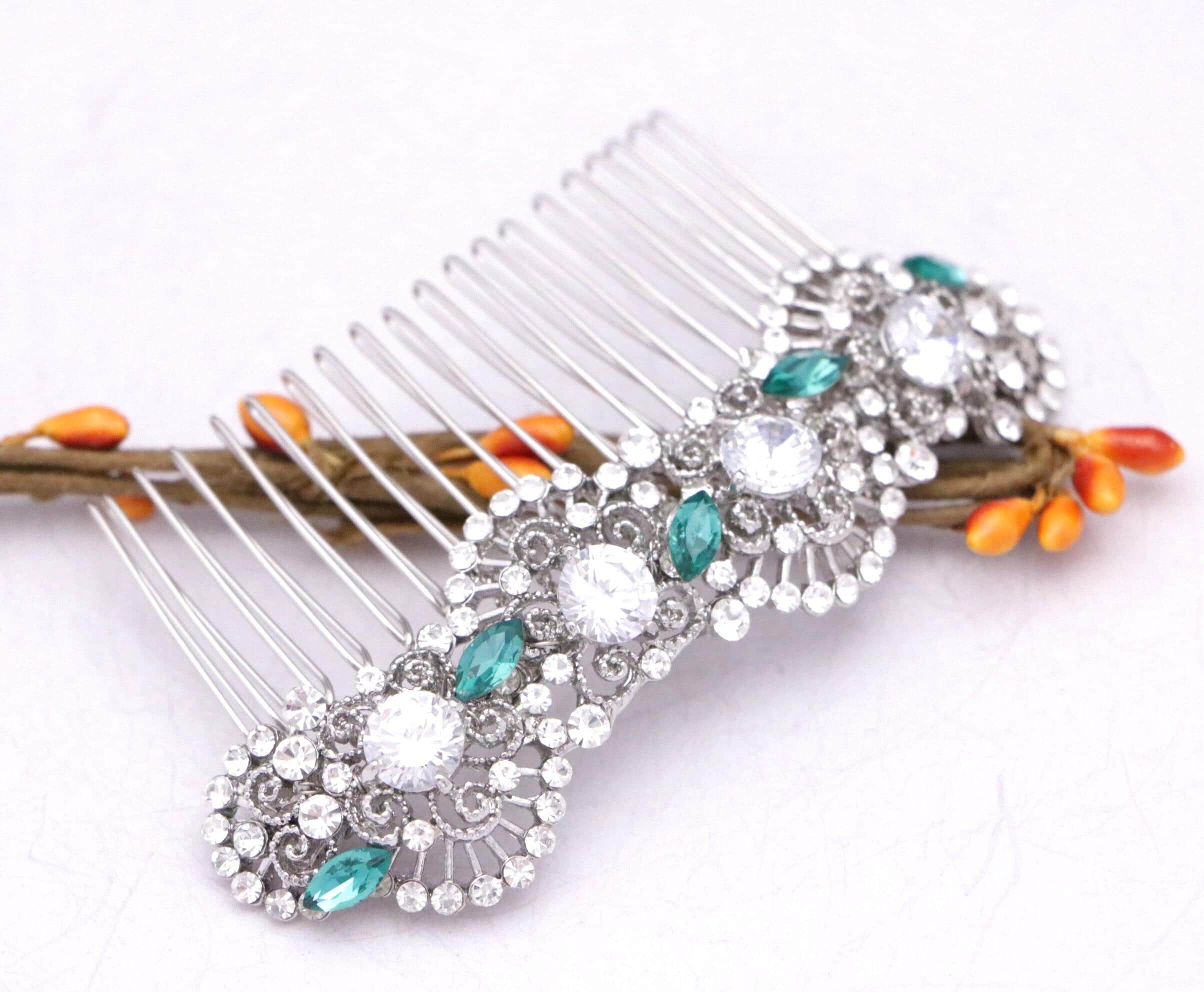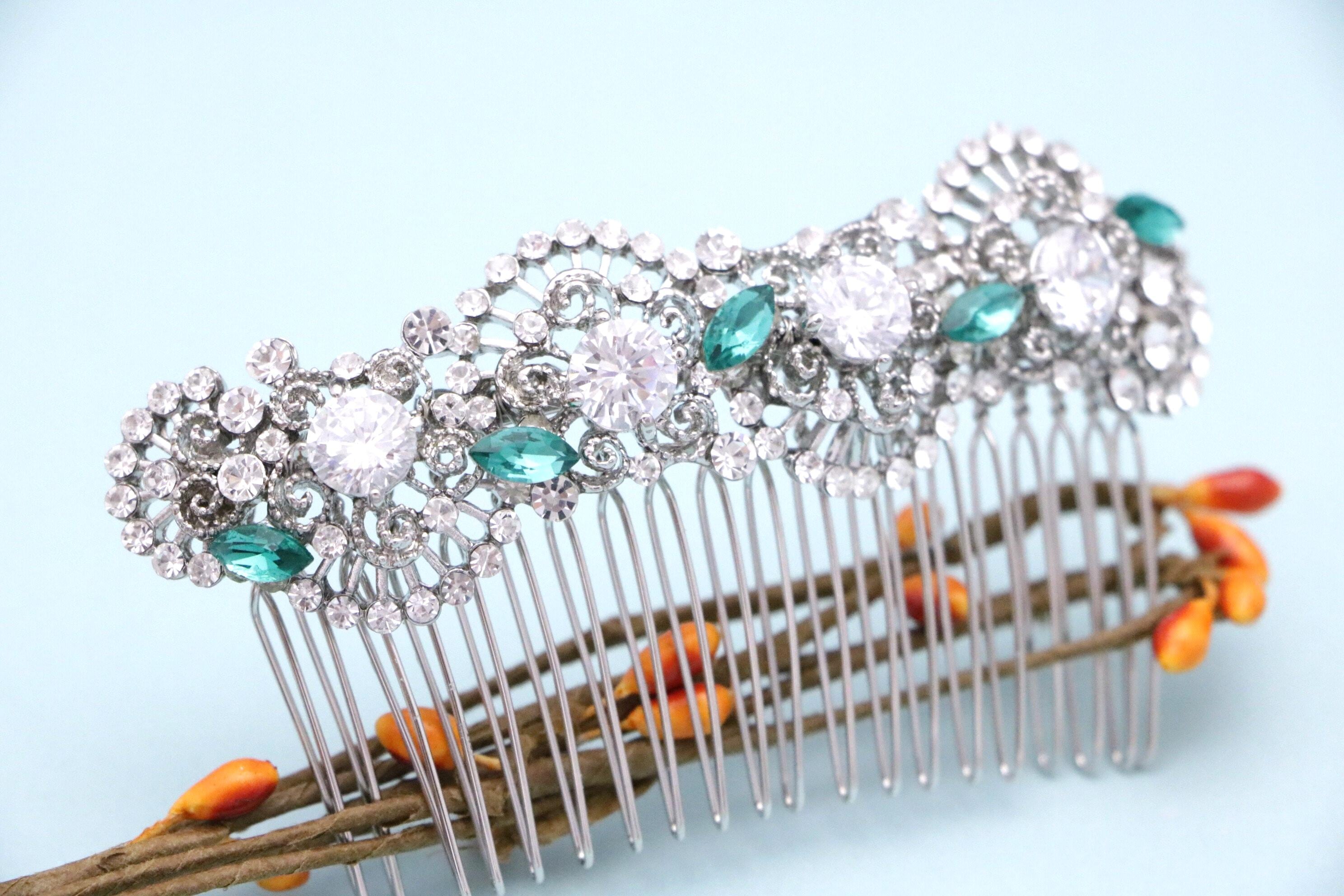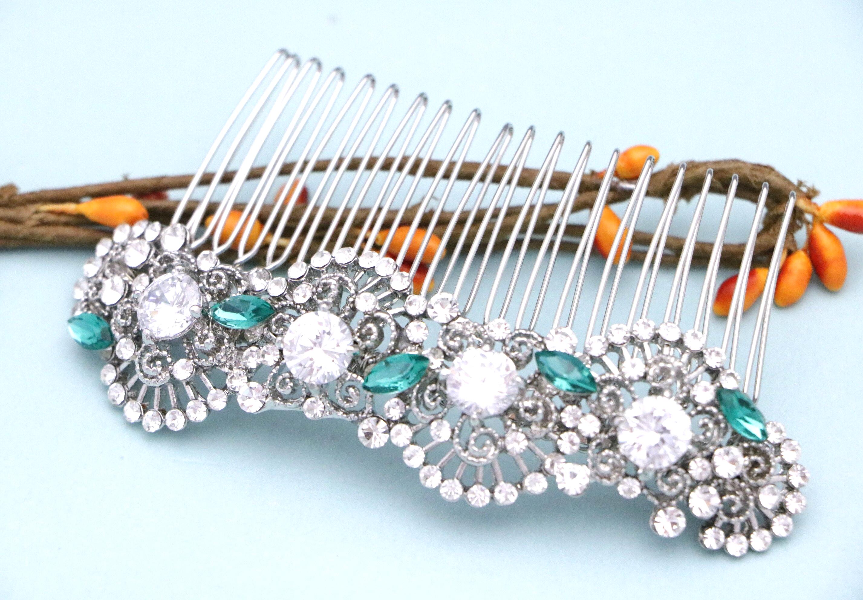 This beautiful Clear rhinestone and Emerald Crystal hair comb is a perfect compliment for the wedding party and can easily fit into any hair style. The Rhinestone part measured approximately 4 X 1 inches.