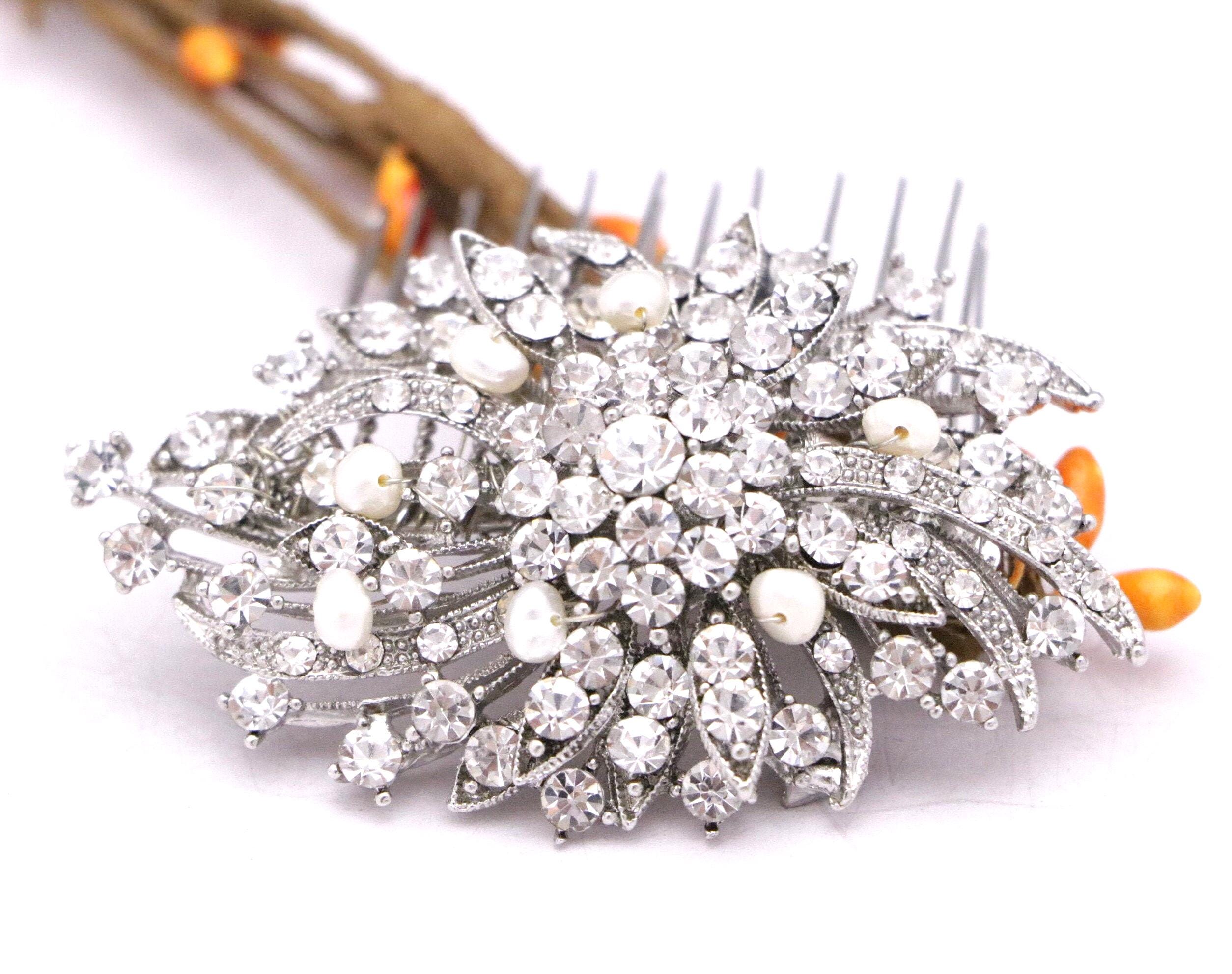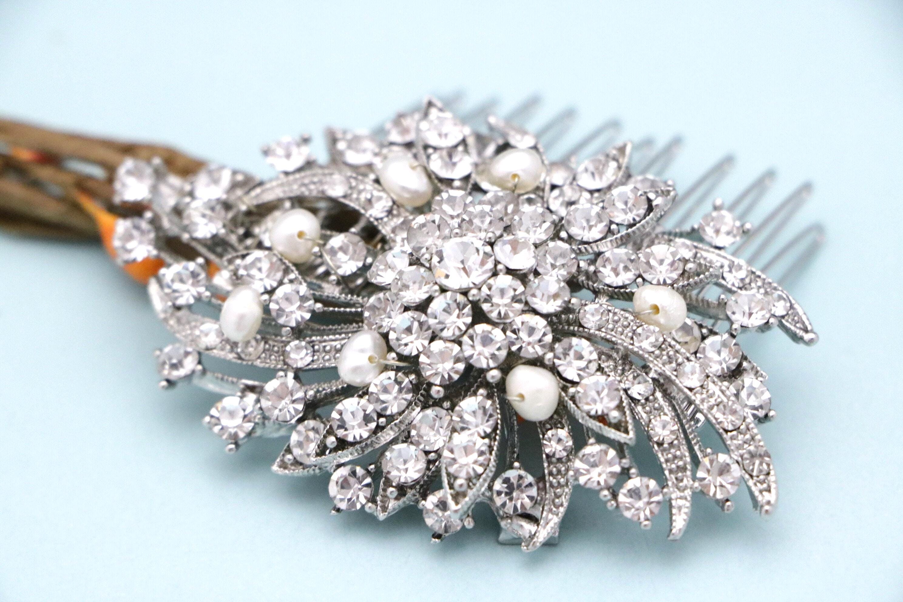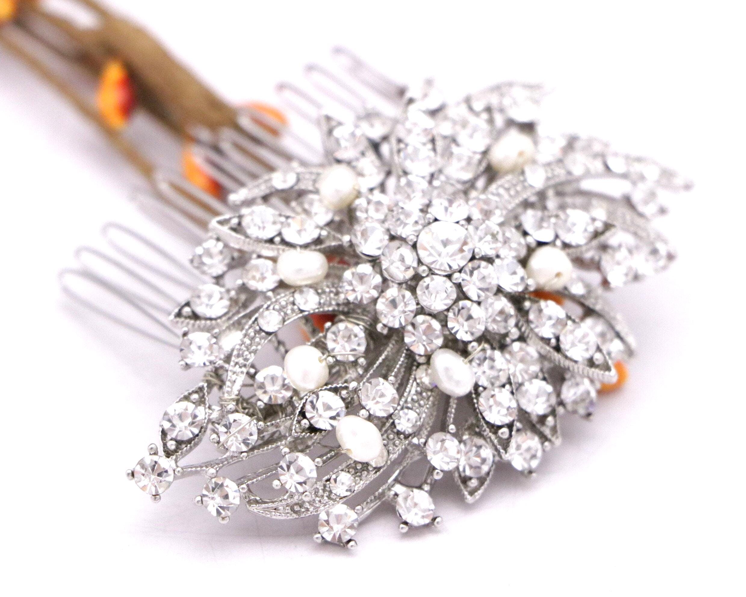 This sparkle rhinestone hair comb features a very beautiful vintage style Rhinestone piece and set it on a metal hair comb. The rhinestone part measures approximately 3 X 2 inches.