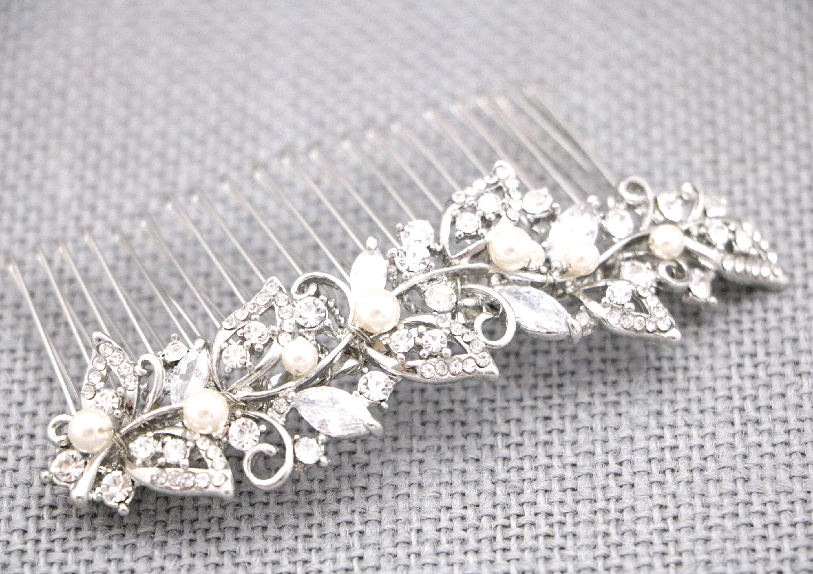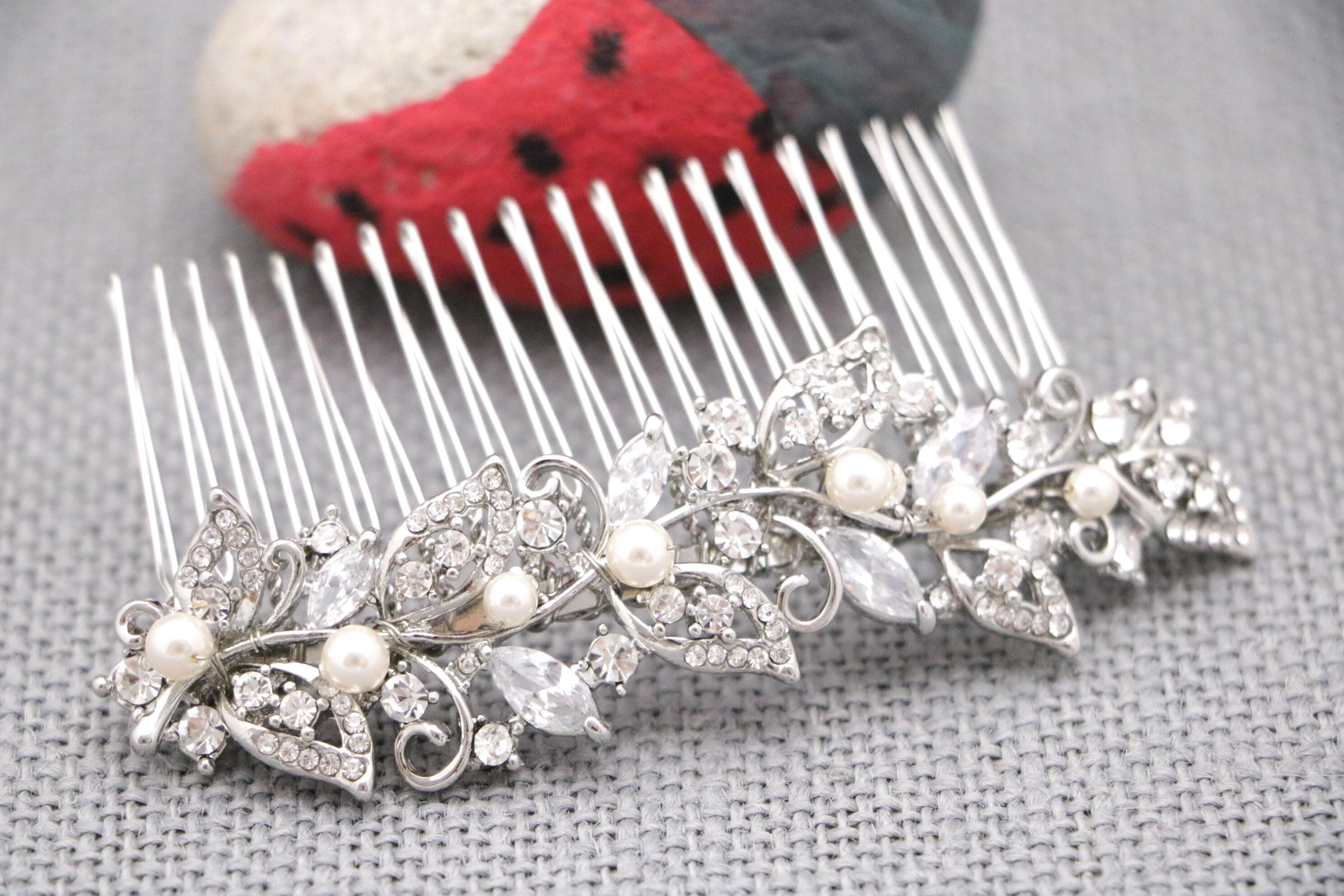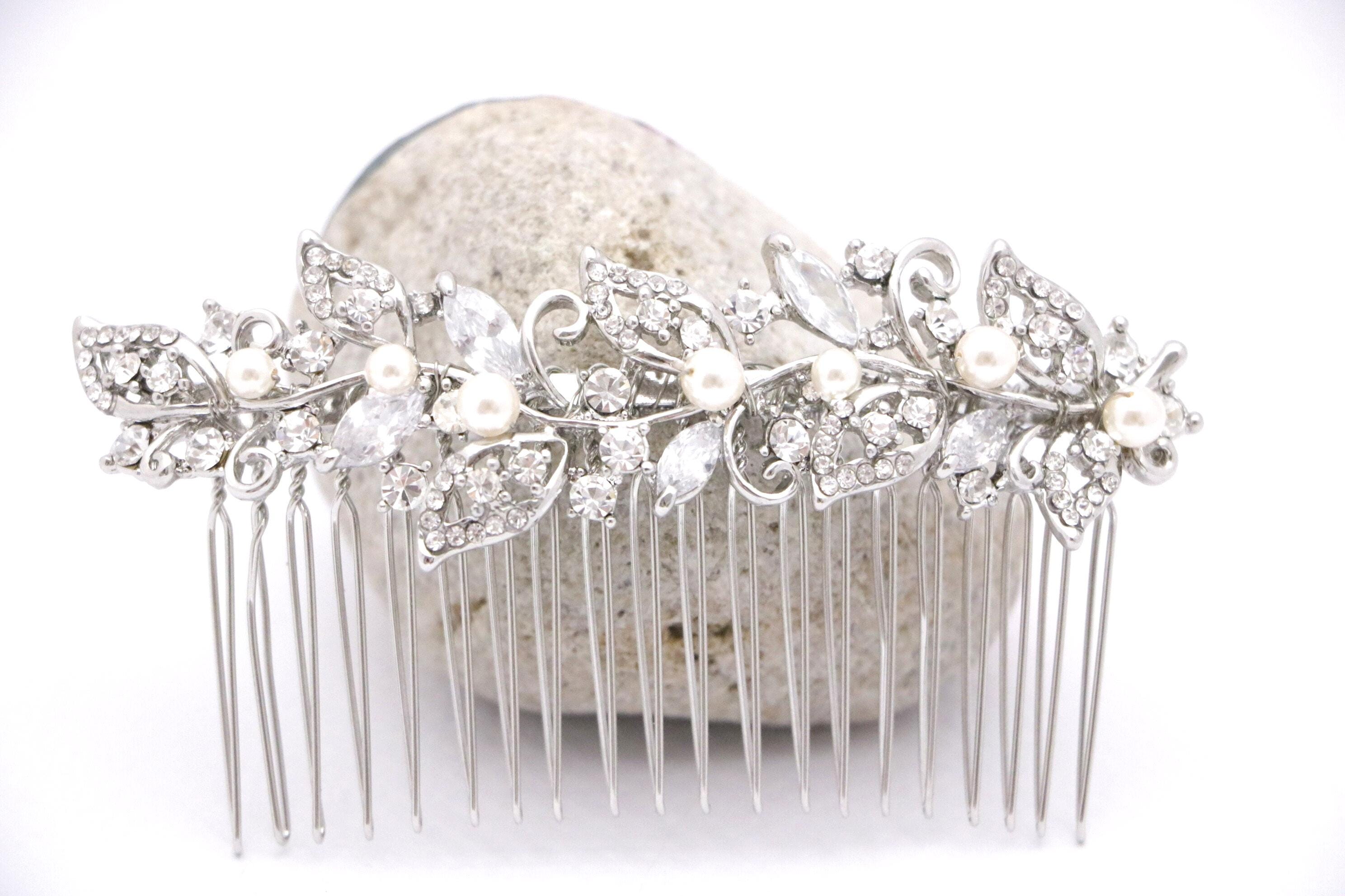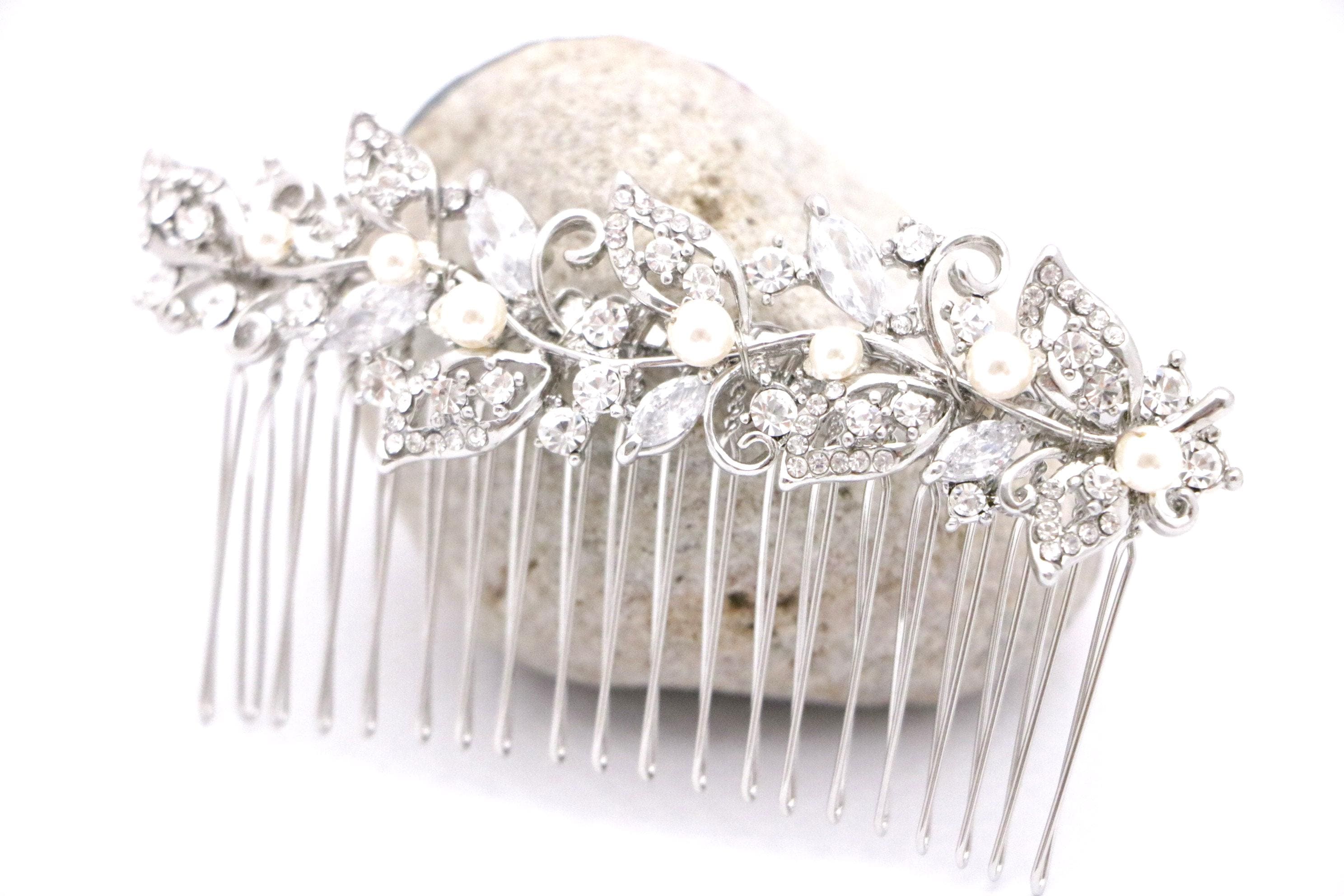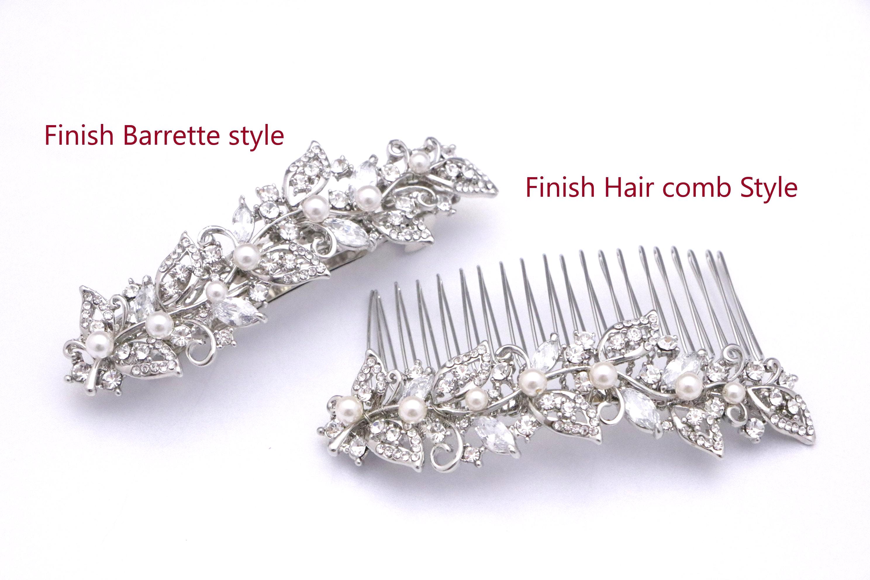 This sparkle rhinestone hair comb features a very beautiful vintage style rhinestone piece and Swarovski ivory pearls. Rhinestone piece and pearls are set it on a metal barrette or on a metal hair comb. The rhinestone part measures approximately 3.75 X 1 inches.