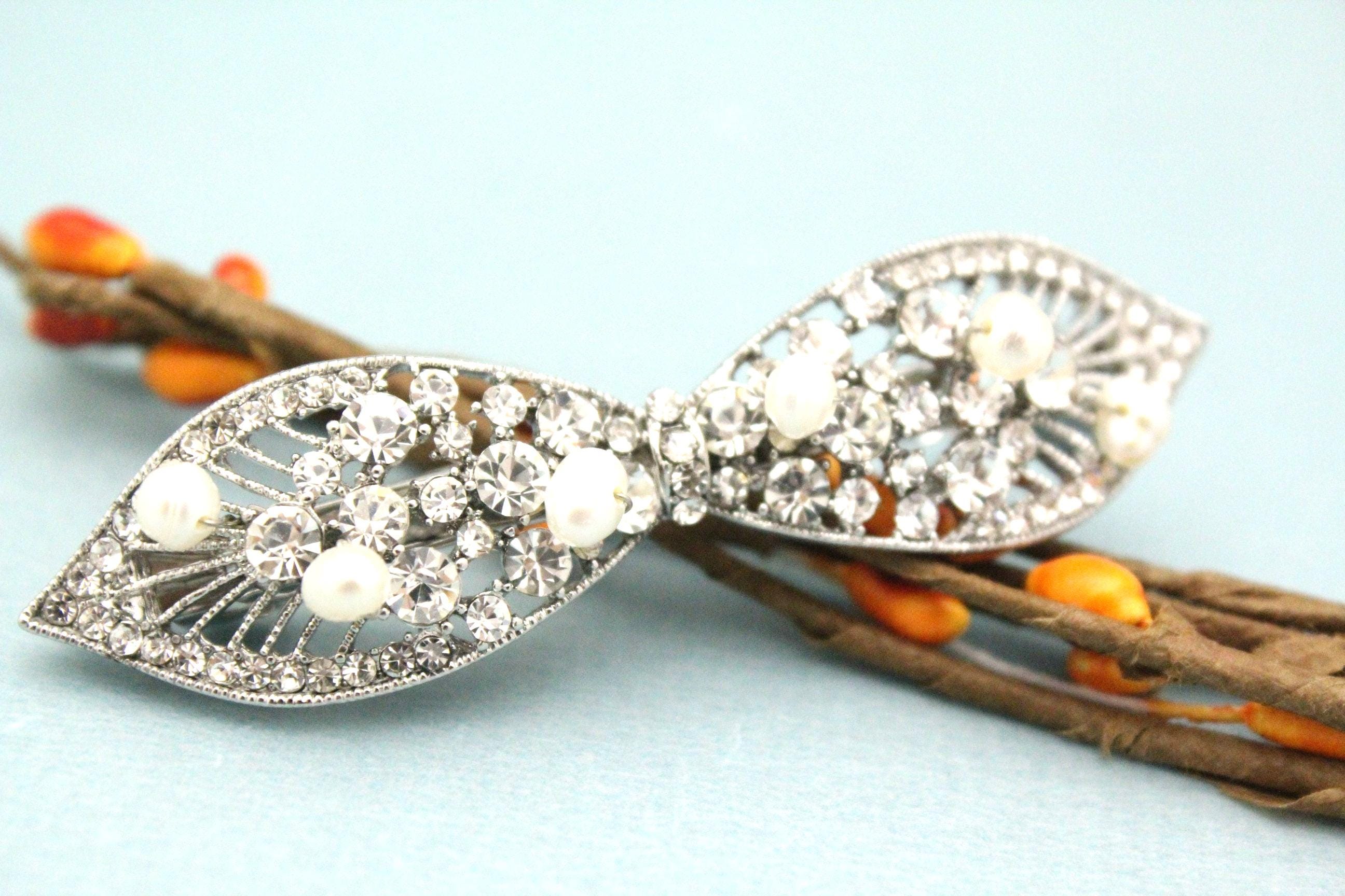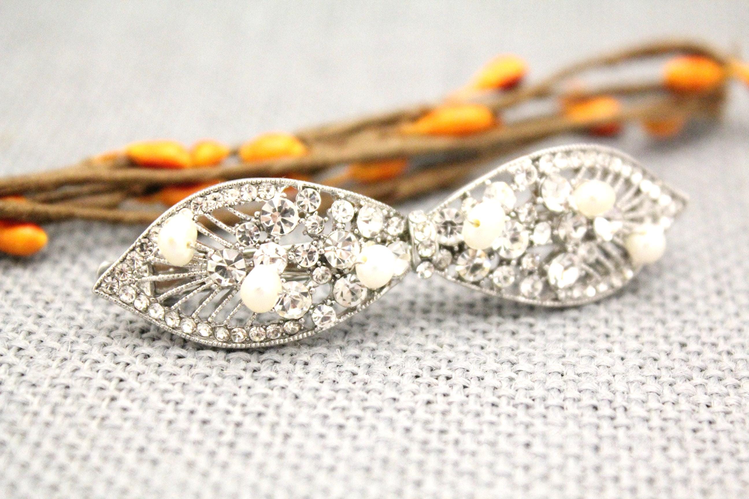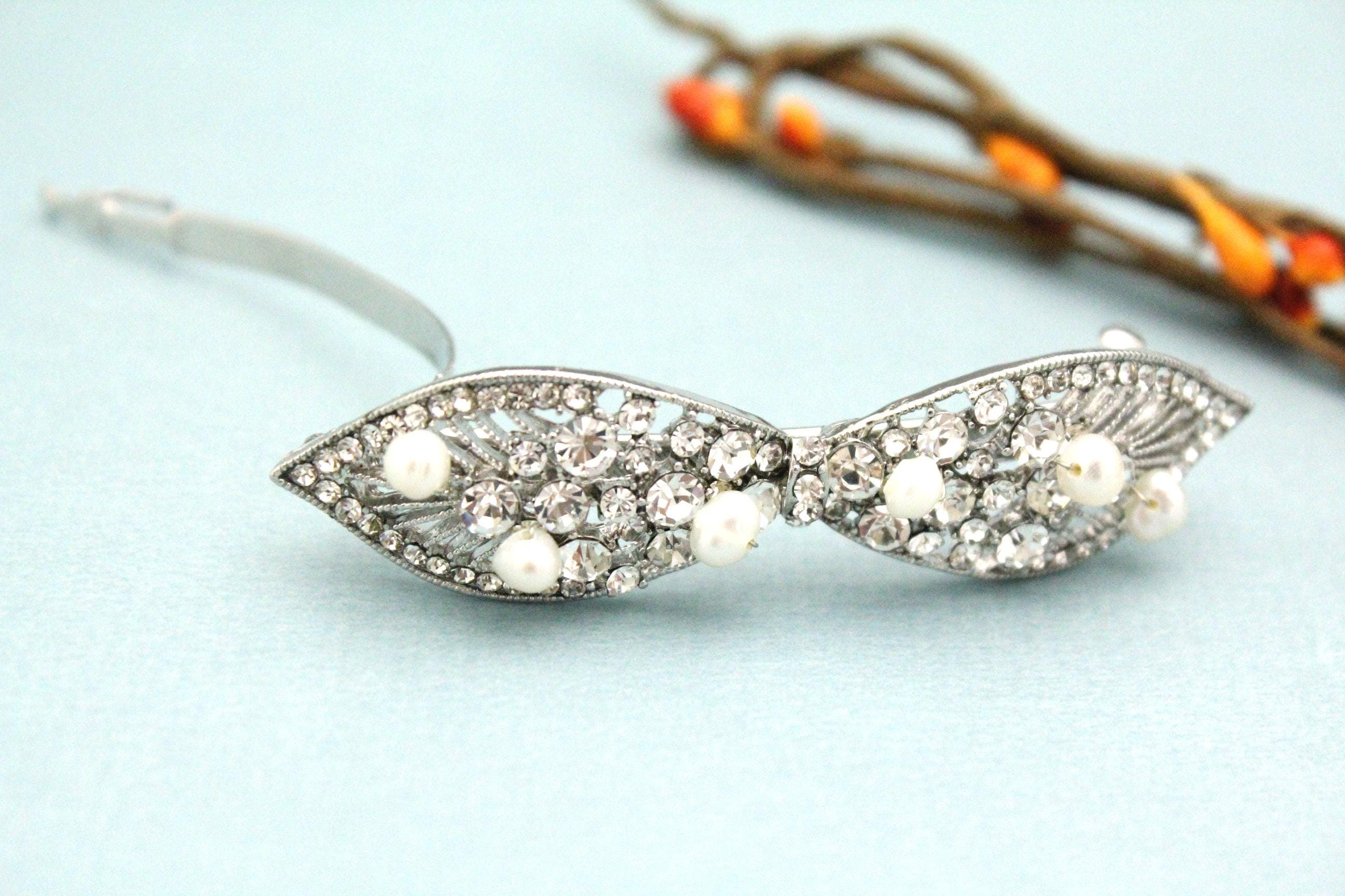 This sparkle rhinestone hair Barrettes features a very beautiful vintage style rhinestone piece and Swarovski ivory pearls. Rhinestone piece and pearls are wired on a silver tone metal comb.