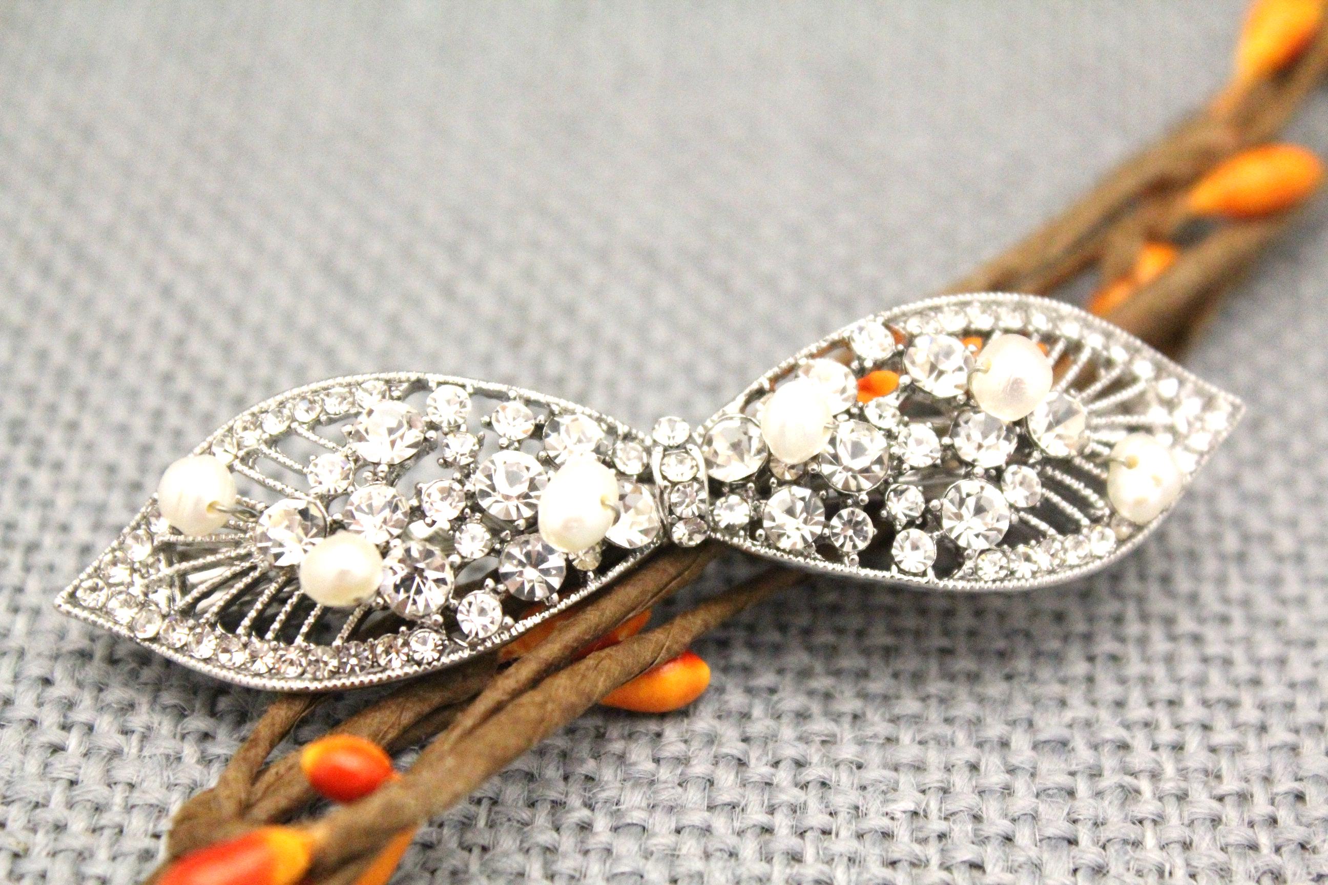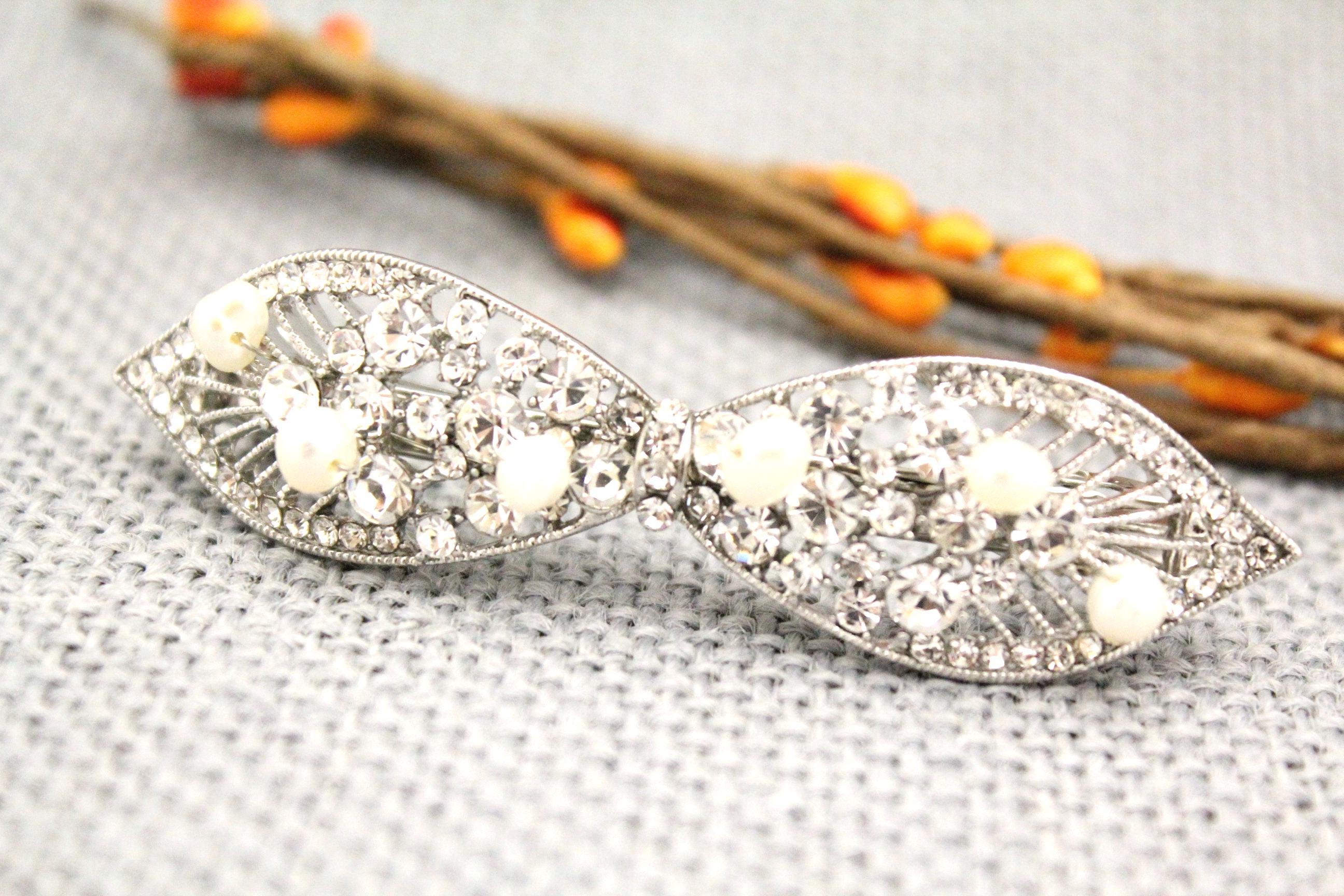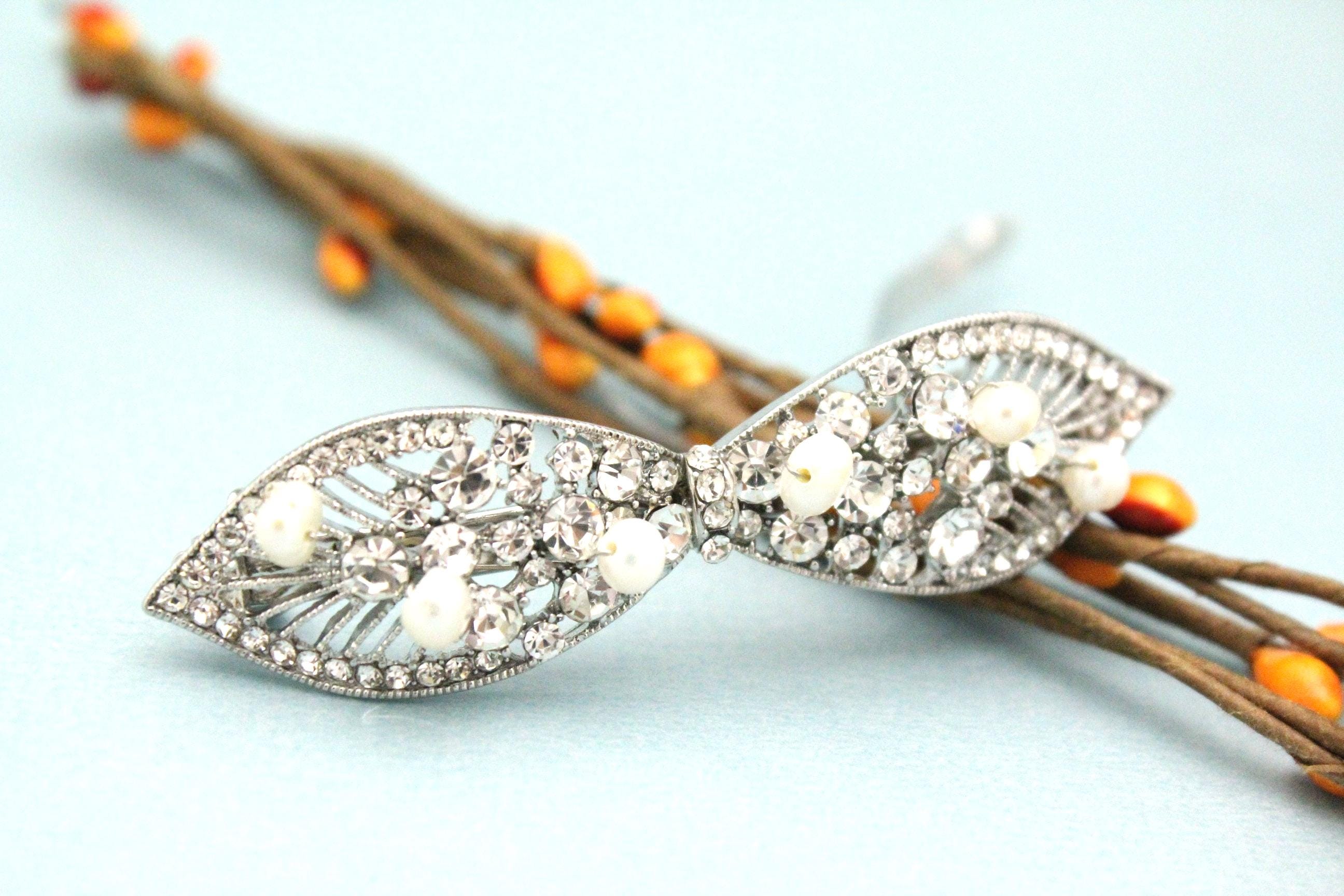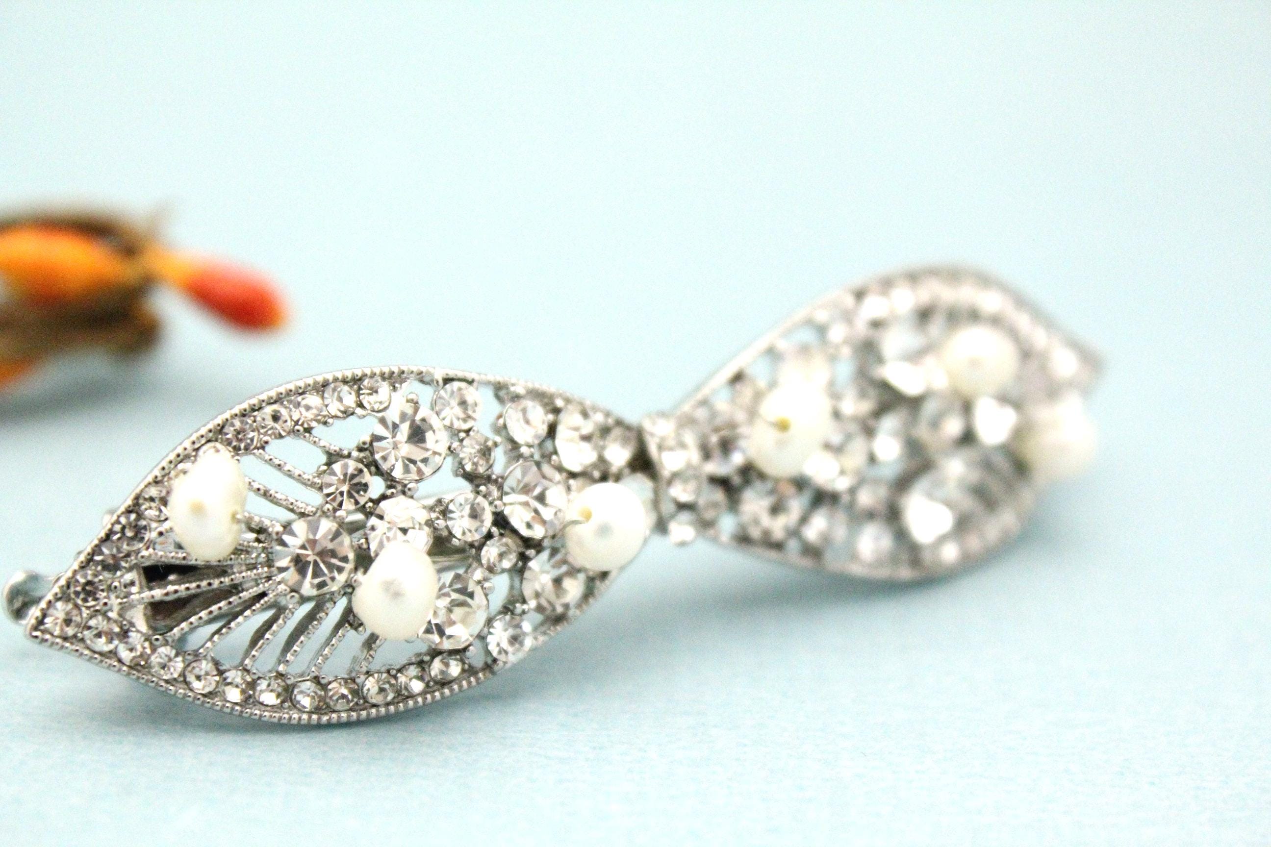 This sparkle rhinestone hair Barrettes features a very beautiful vintage style rhinestone piece and Swarovski ivory pearls. Rhinestone piece and pearls are wired on a silver tone metal comb.