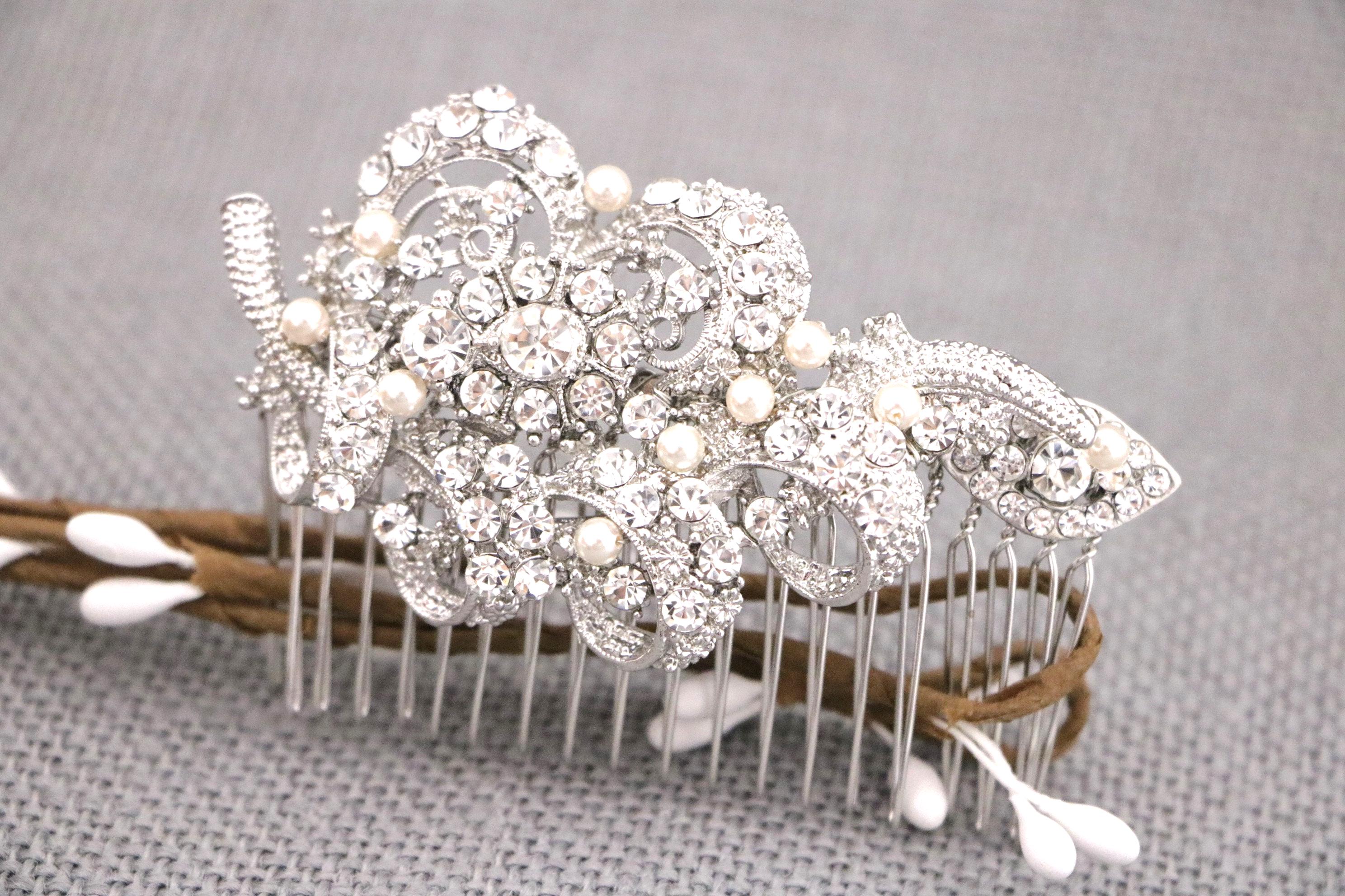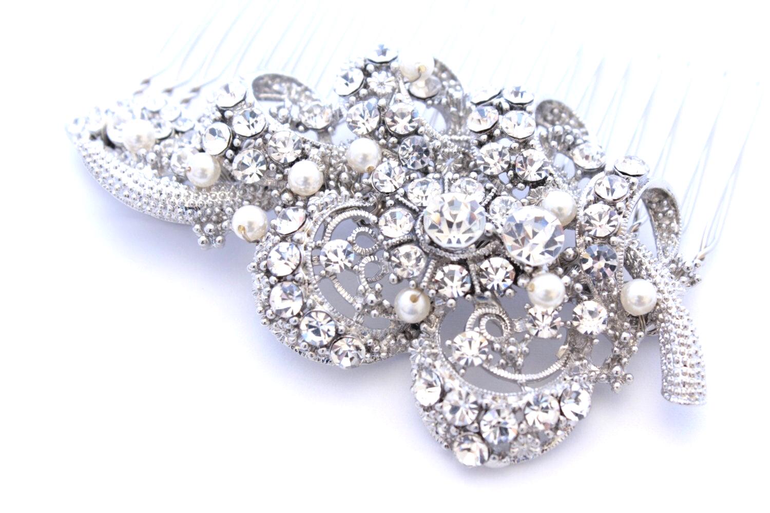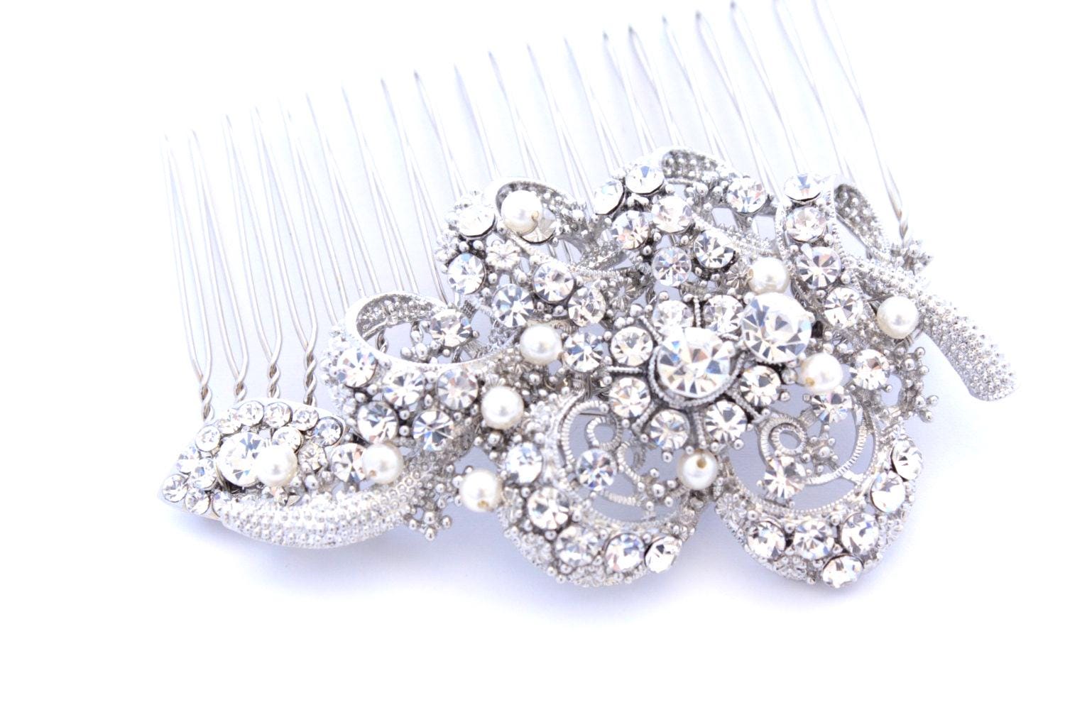 This sparkle rhinestone hair comb features a very beautiful vintage style rhinestone piece and swarovski ivory pearls. Rhinestone piece and pearls are wired on a silver tone metal comb. The Rhinestone part measures approximately 3.5 X 1.75 inches.