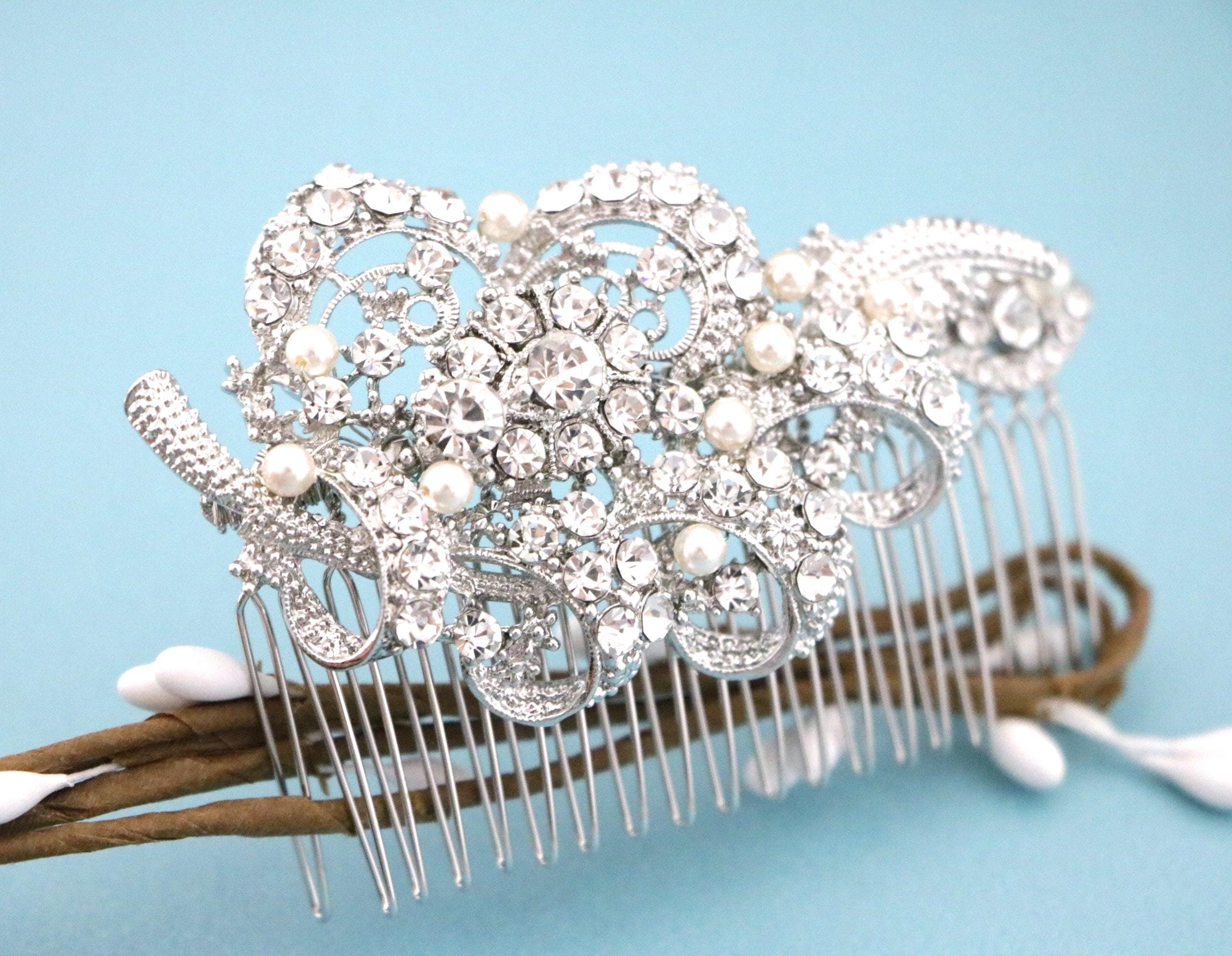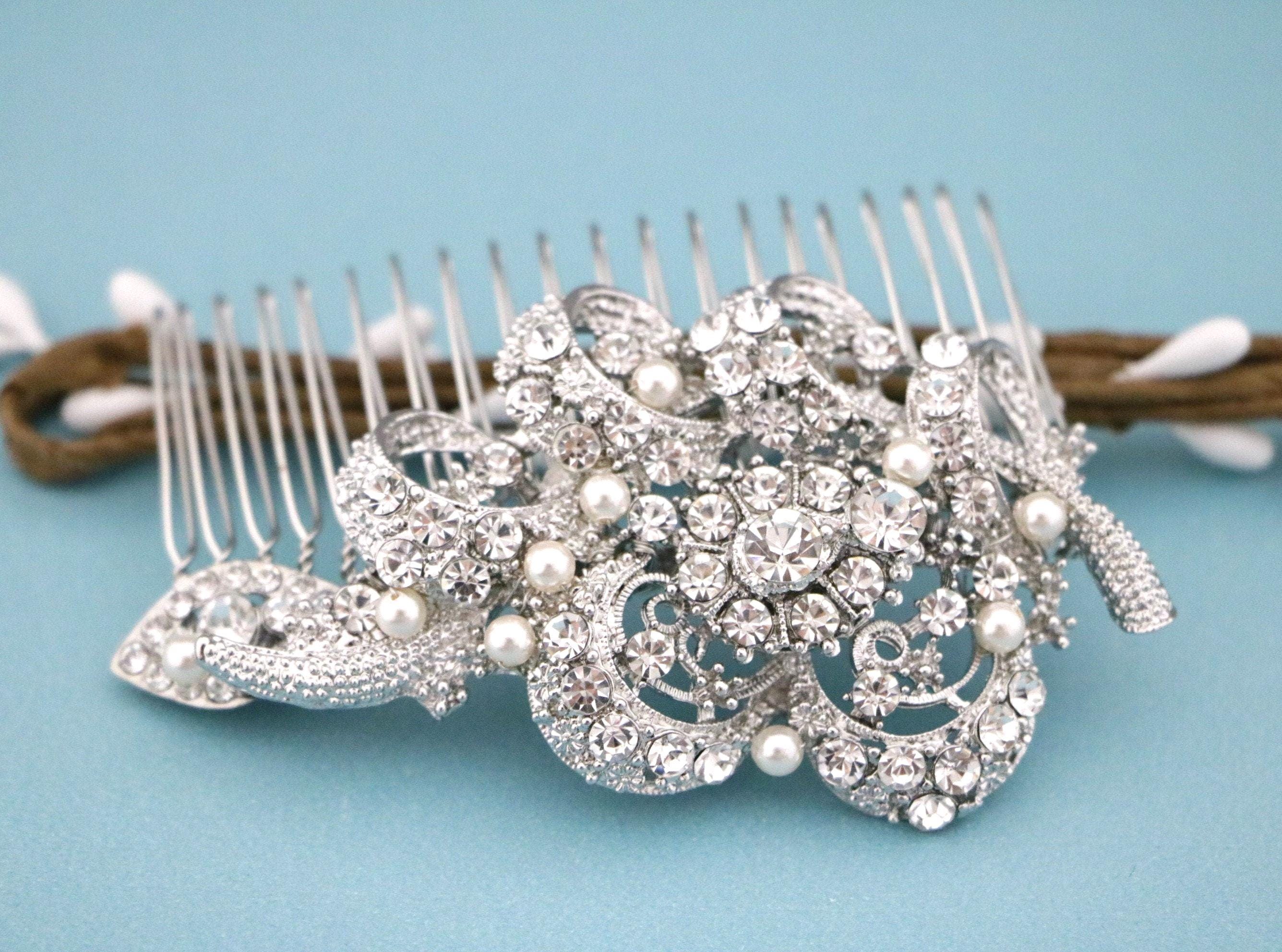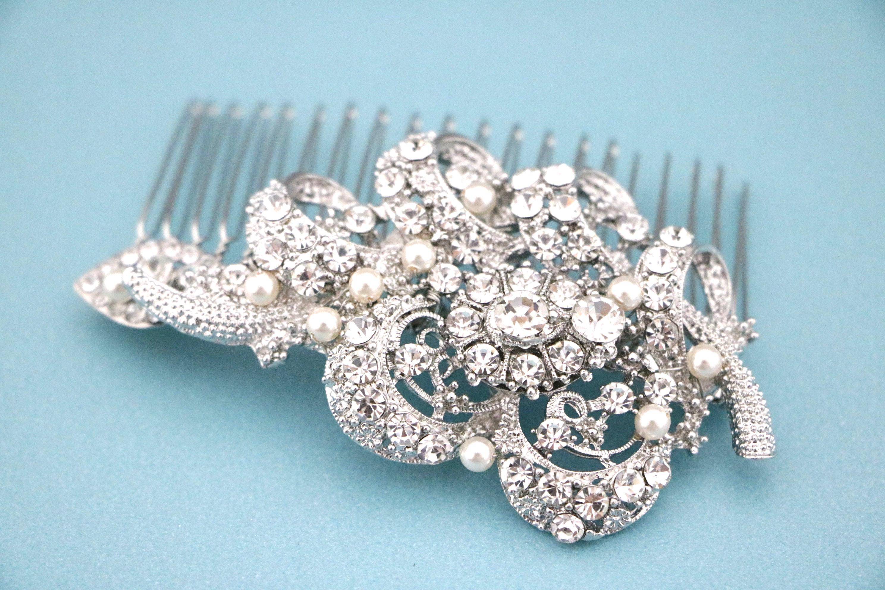 This sparkle rhinestone hair comb features a very beautiful vintage style rhinestone piece and swarovski ivory pearls. Rhinestone piece and pearls are wired on a silver tone metal comb. The Rhinestone part measures approximately 3.5 X 1.75 inches.
