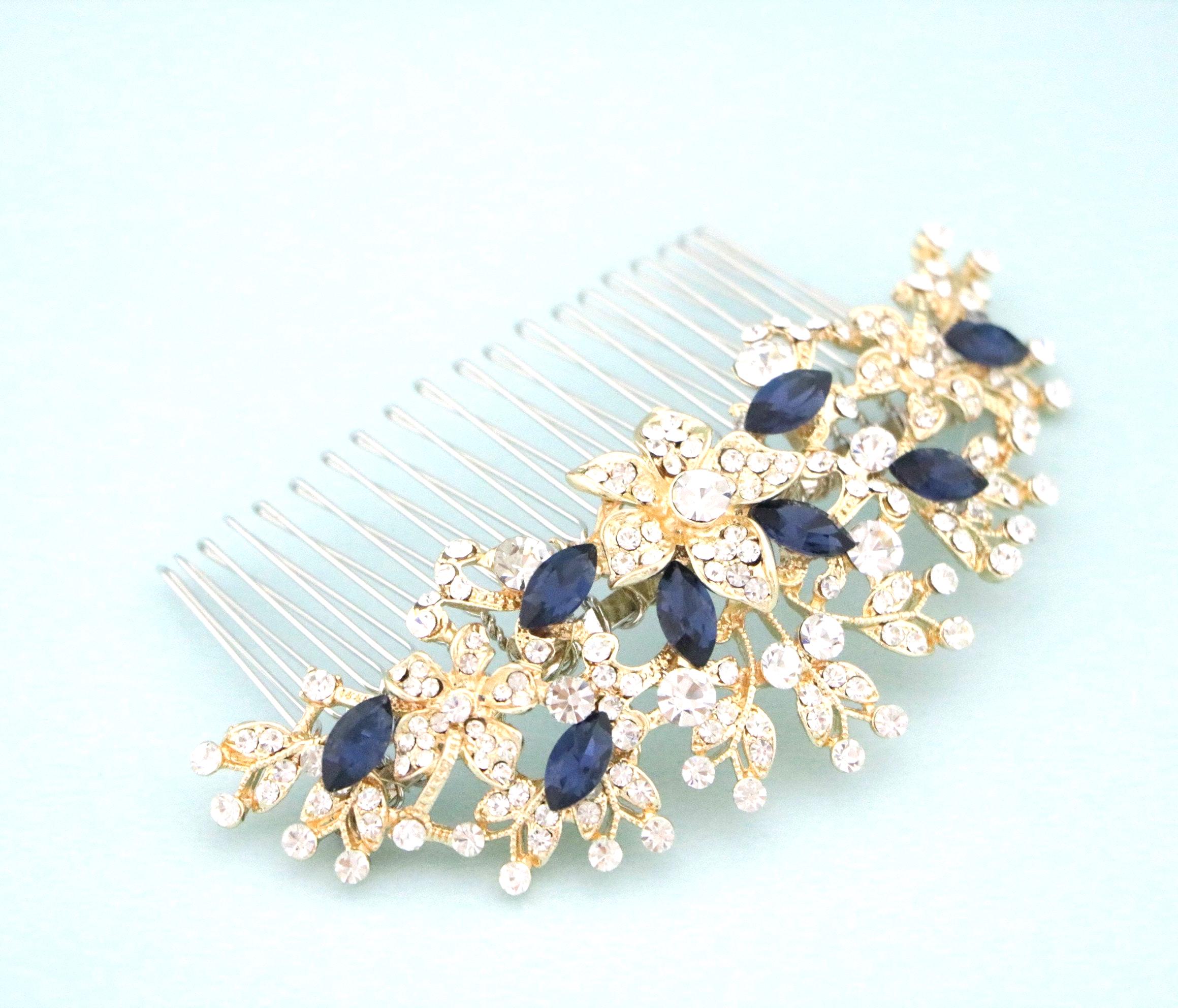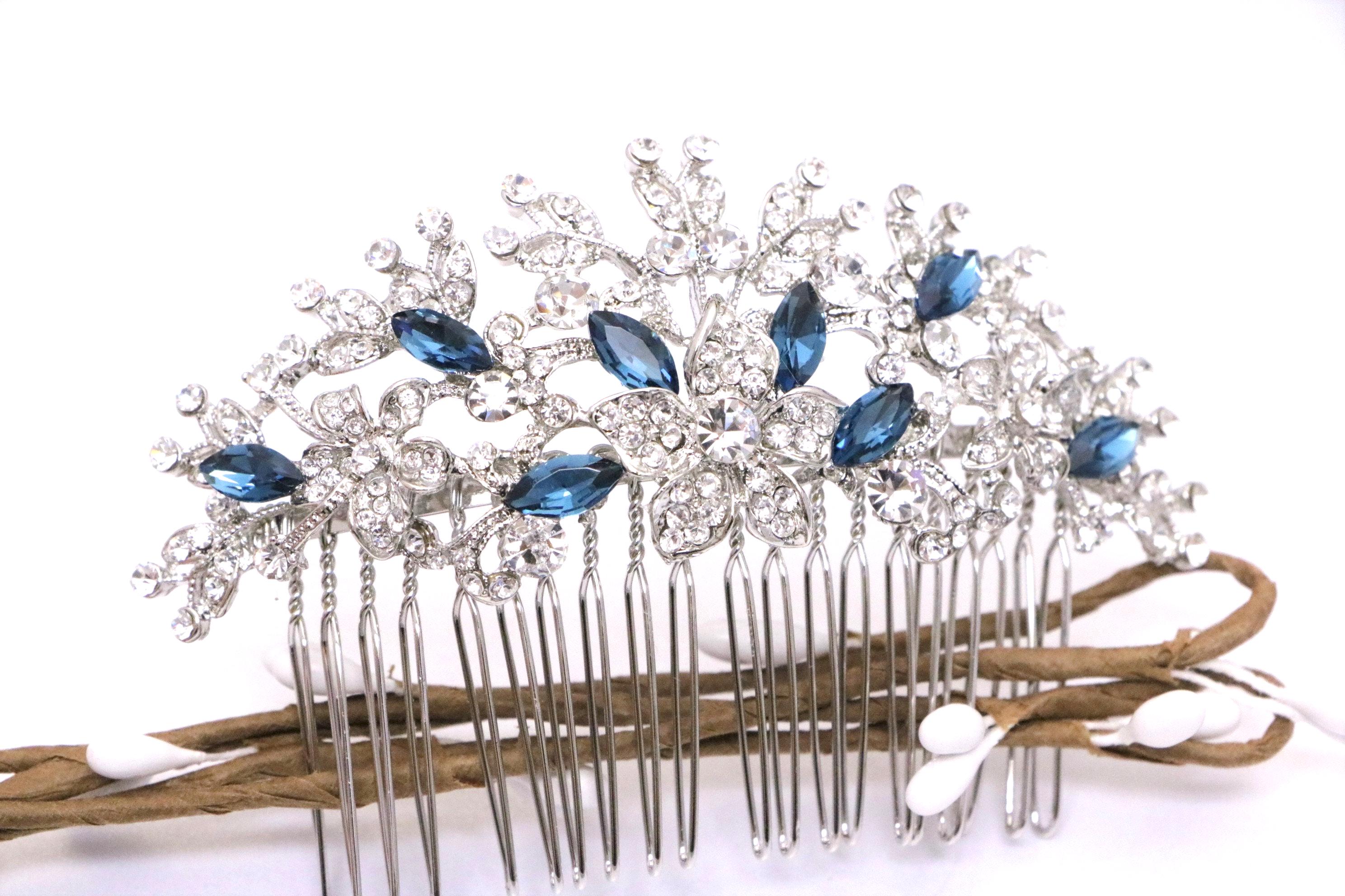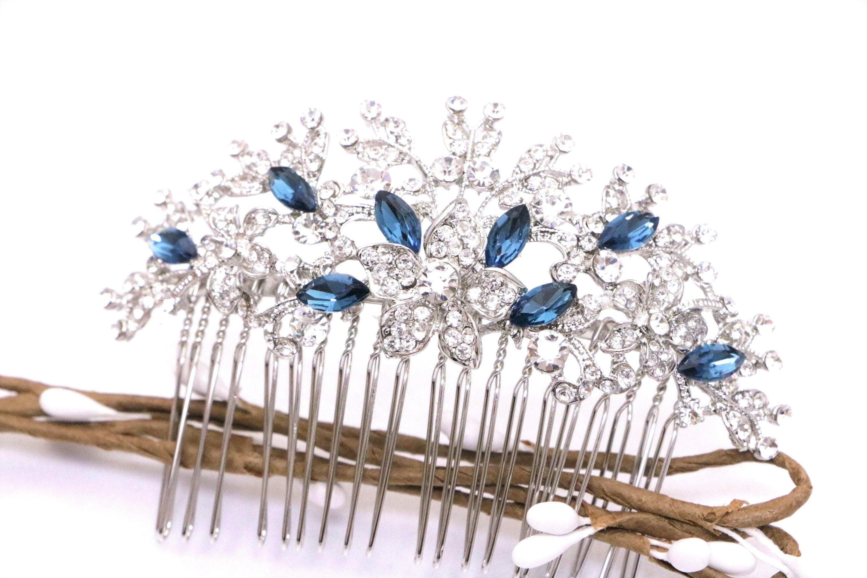 This beautiful Clear rhinestone and Sapphire crystal hair comb is a perfect compliment for the wedding party and can easily fit into any hair style. The Rhinestone part measured approximately 4 X 1.75 inches.
