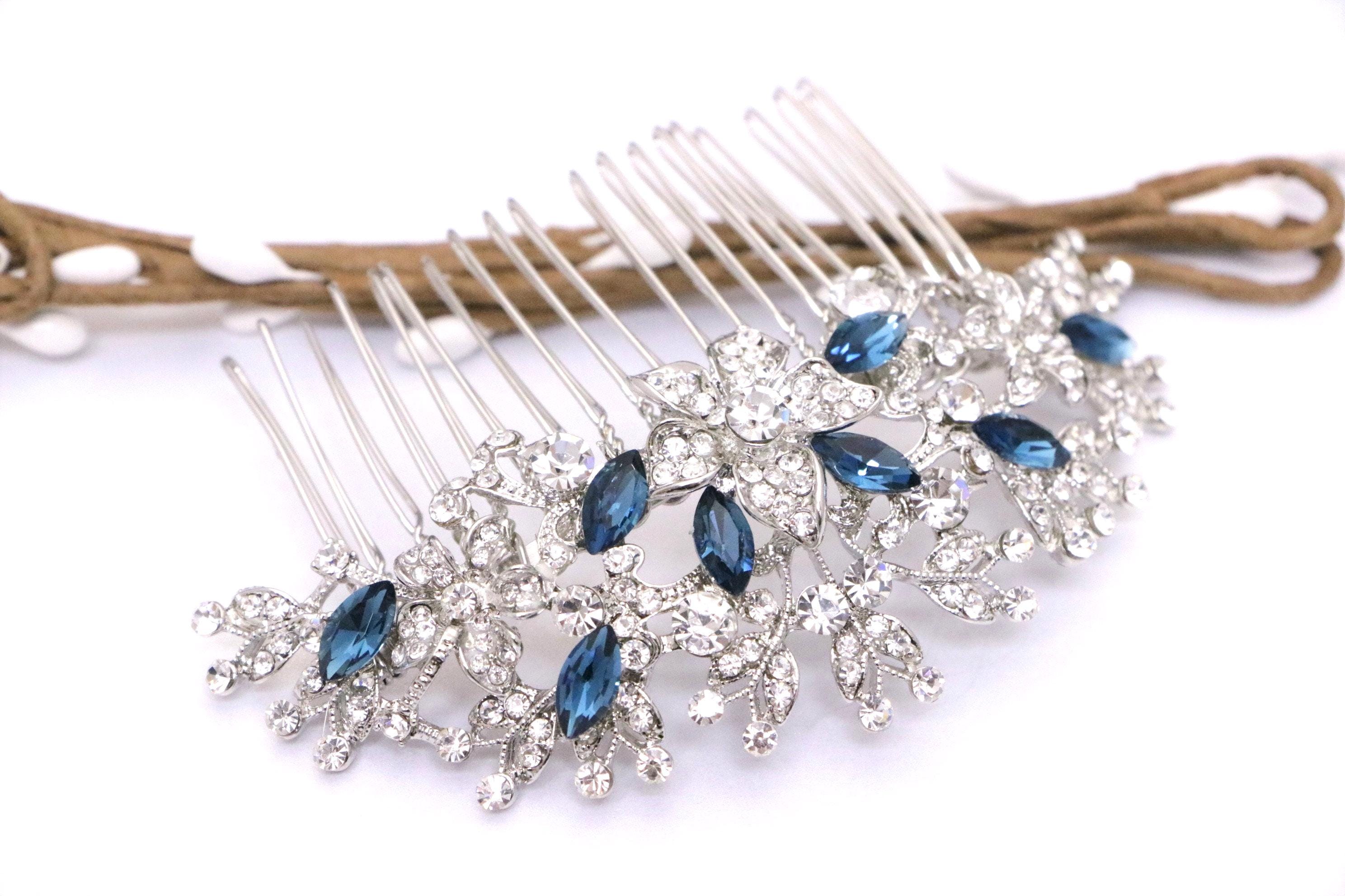 Something Blue Wedding Hair Comb, Sapphire & Clear Rhinestone Bridal Great Gatsby Art Deco Silver Brooch 1920s Accessory Navy Blue Headpiece