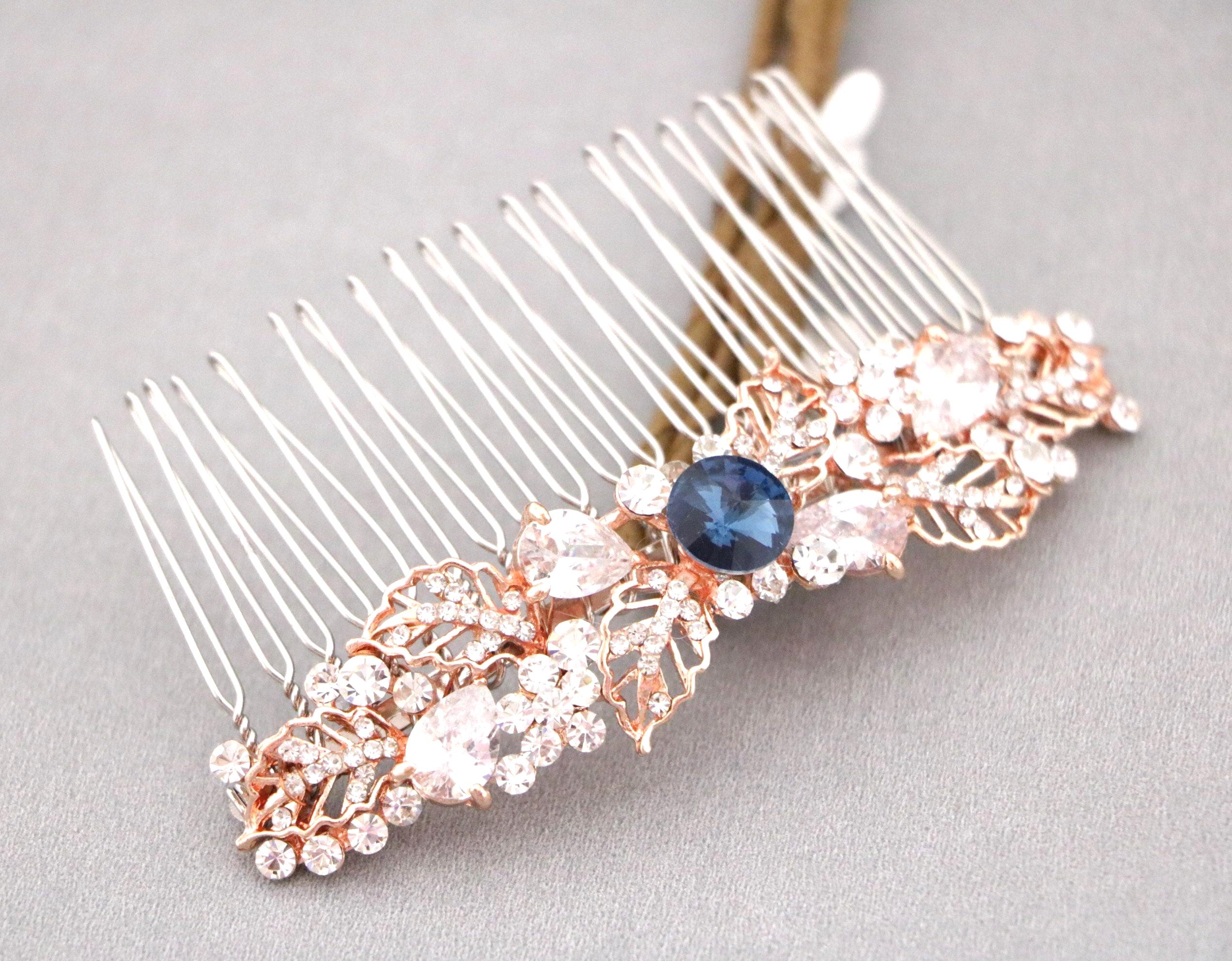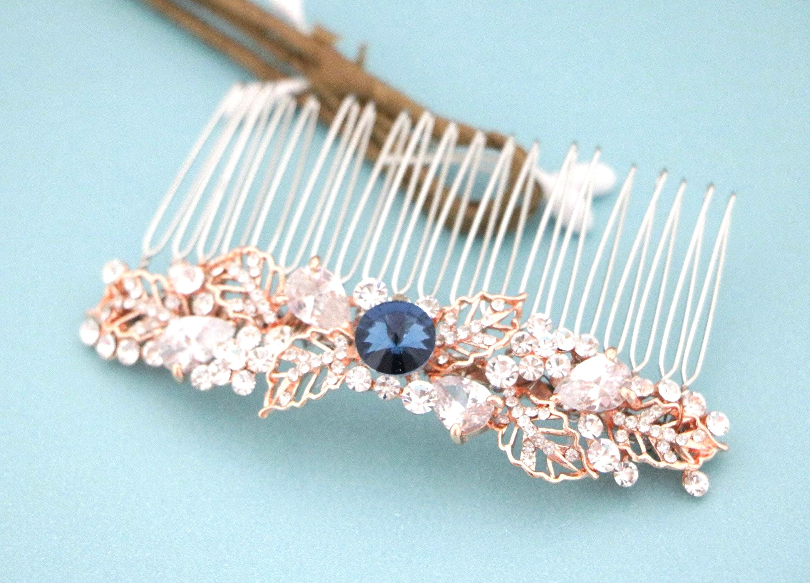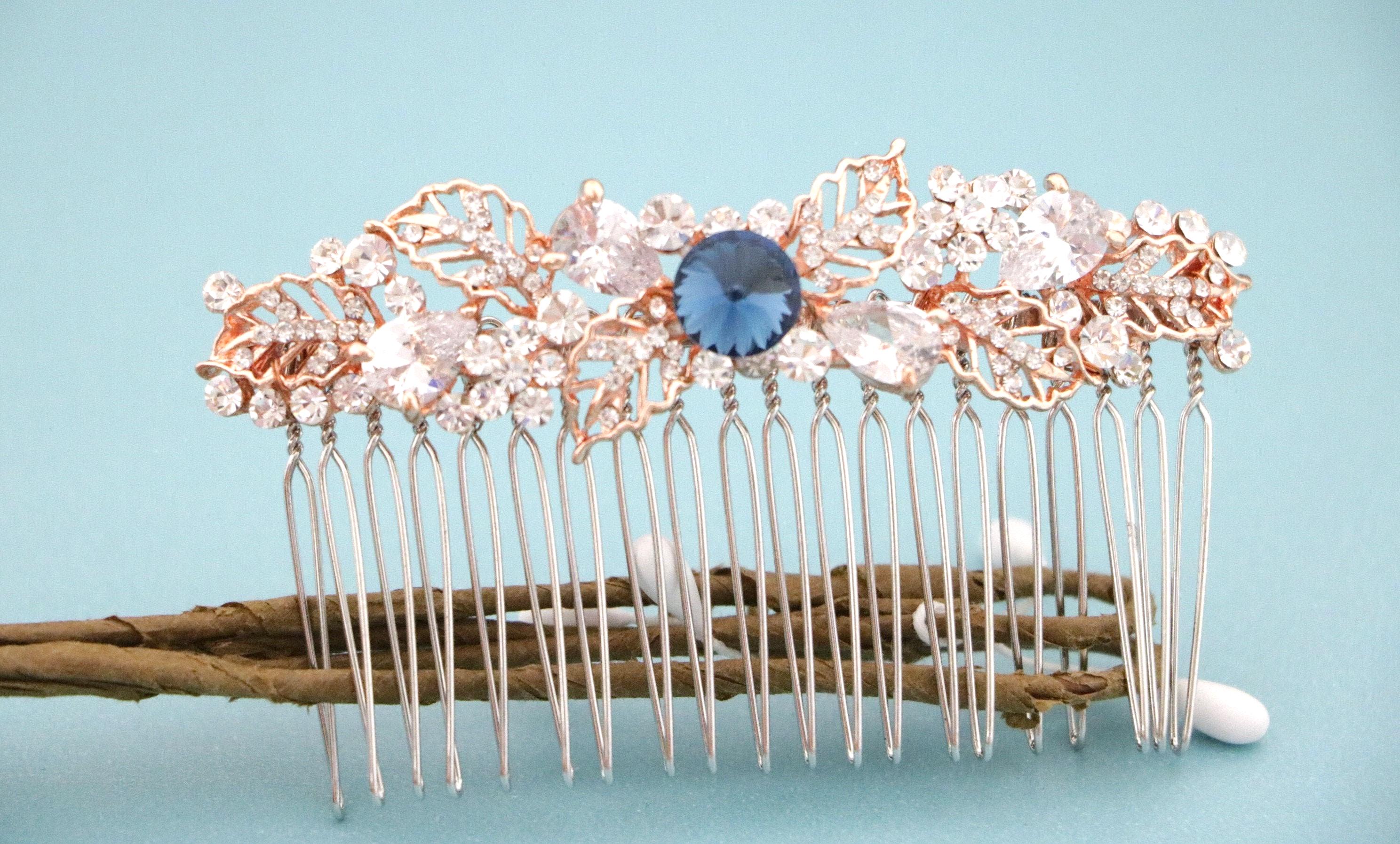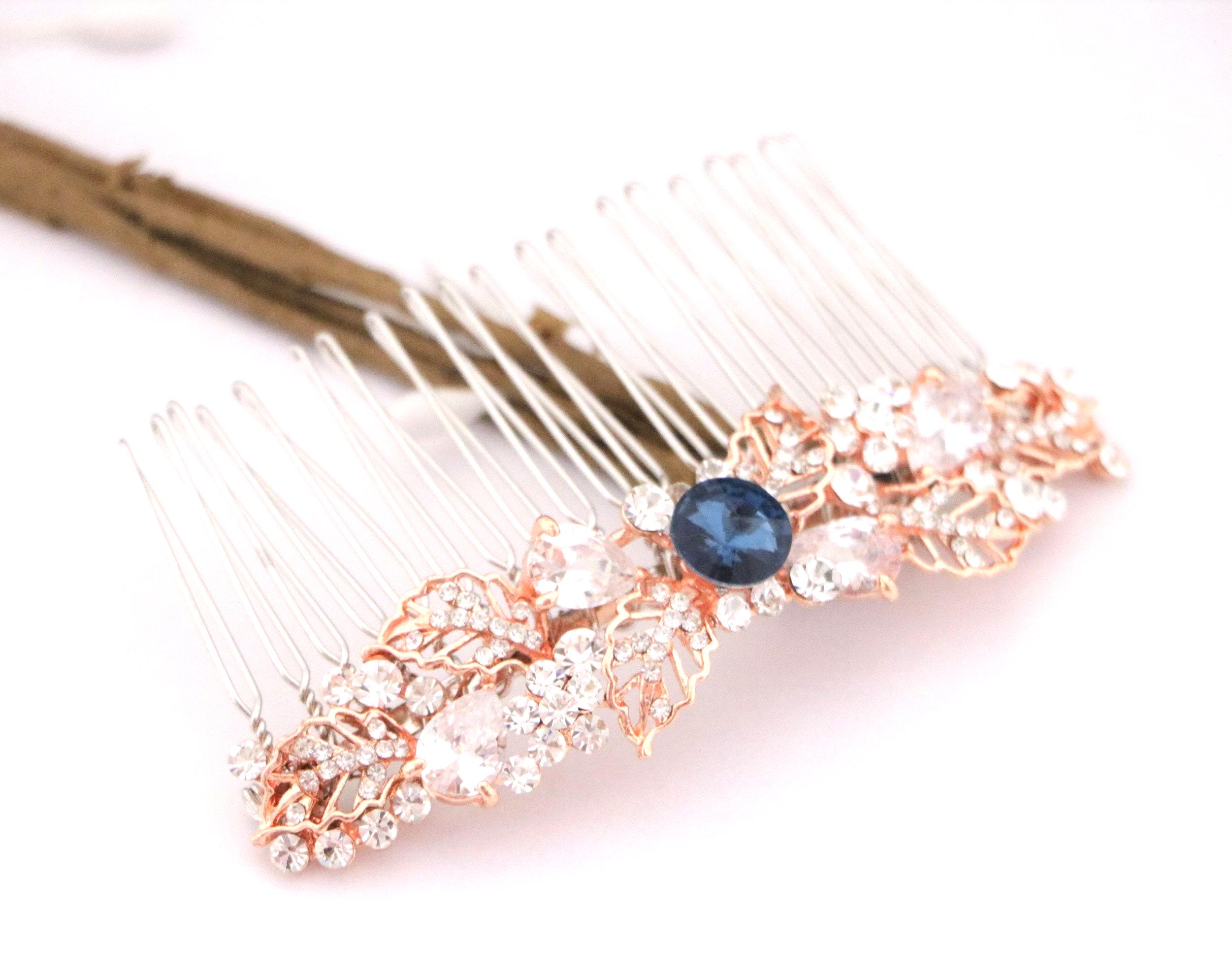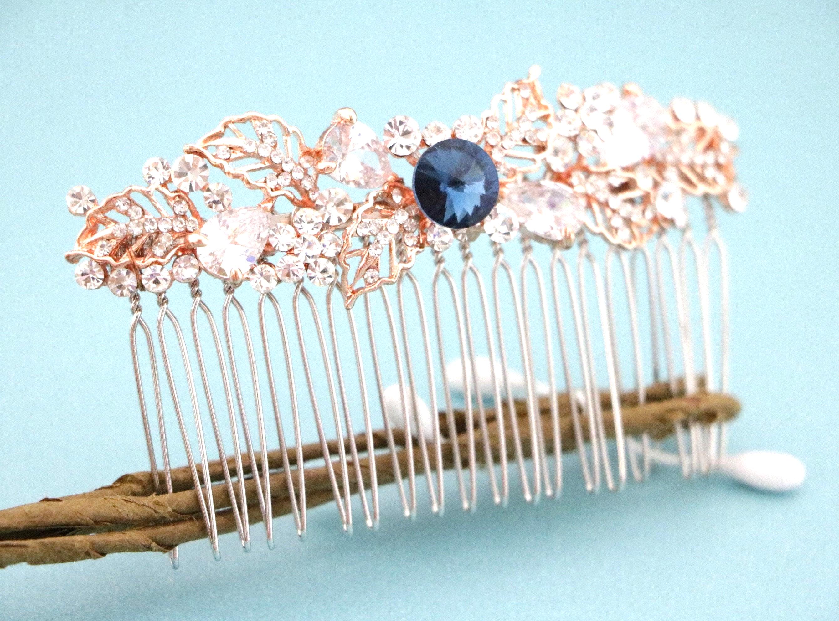 Bridal Hair Comb,Wedding Hair Accessory,Navy blue Hair Comb,Wedding headpiece,Crystal hair comb,rose gold head piece,Vintage style Headpiece