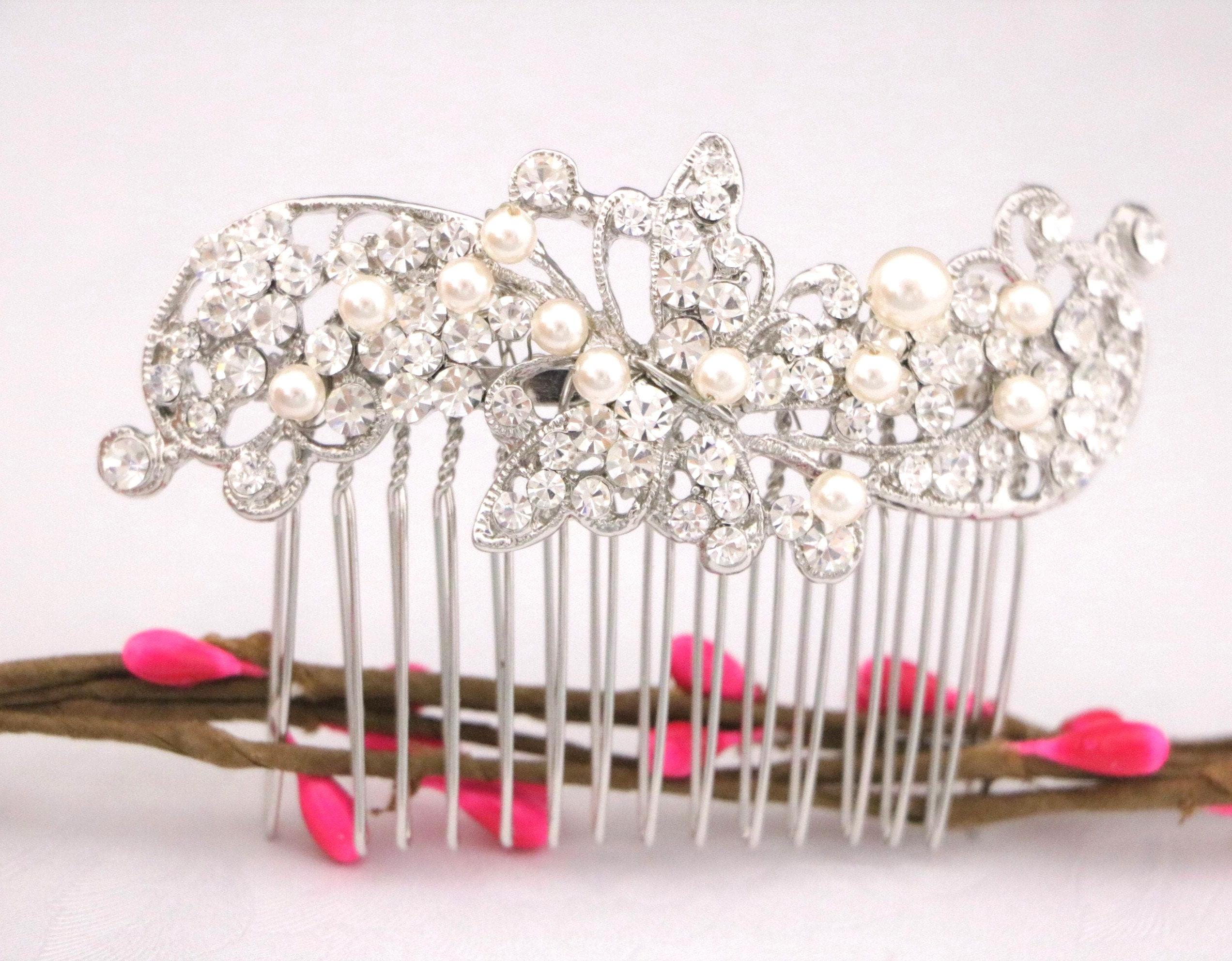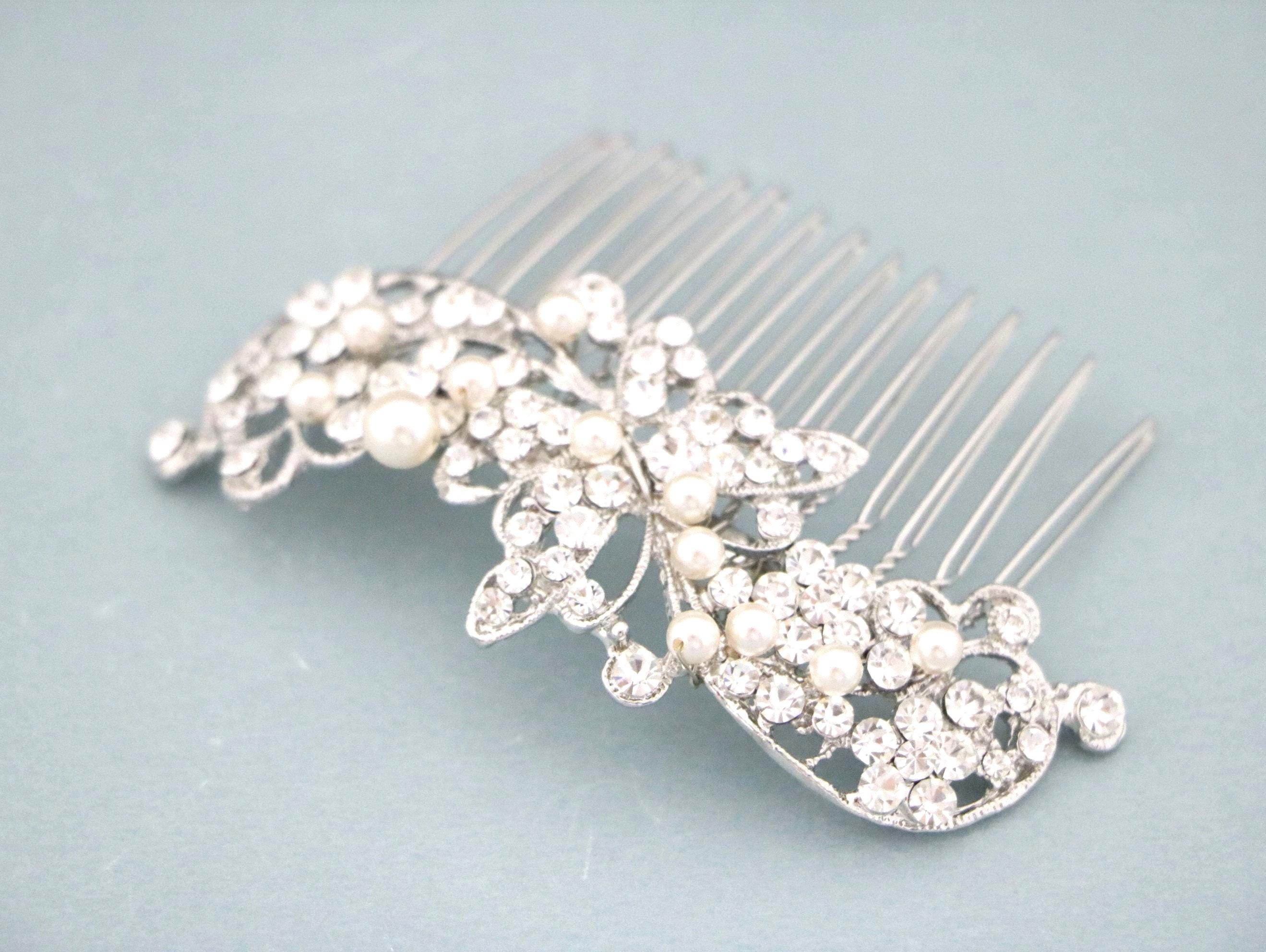 This sparkle rhinestone hair comb features a very beautiful vintage style rhinestone piece and Swarovski ivory pearls. Rhinestone piece and pearls are wired on a silver tone metal comb. The Rhinestone part measures approximately 3.5X 1.25 inches.