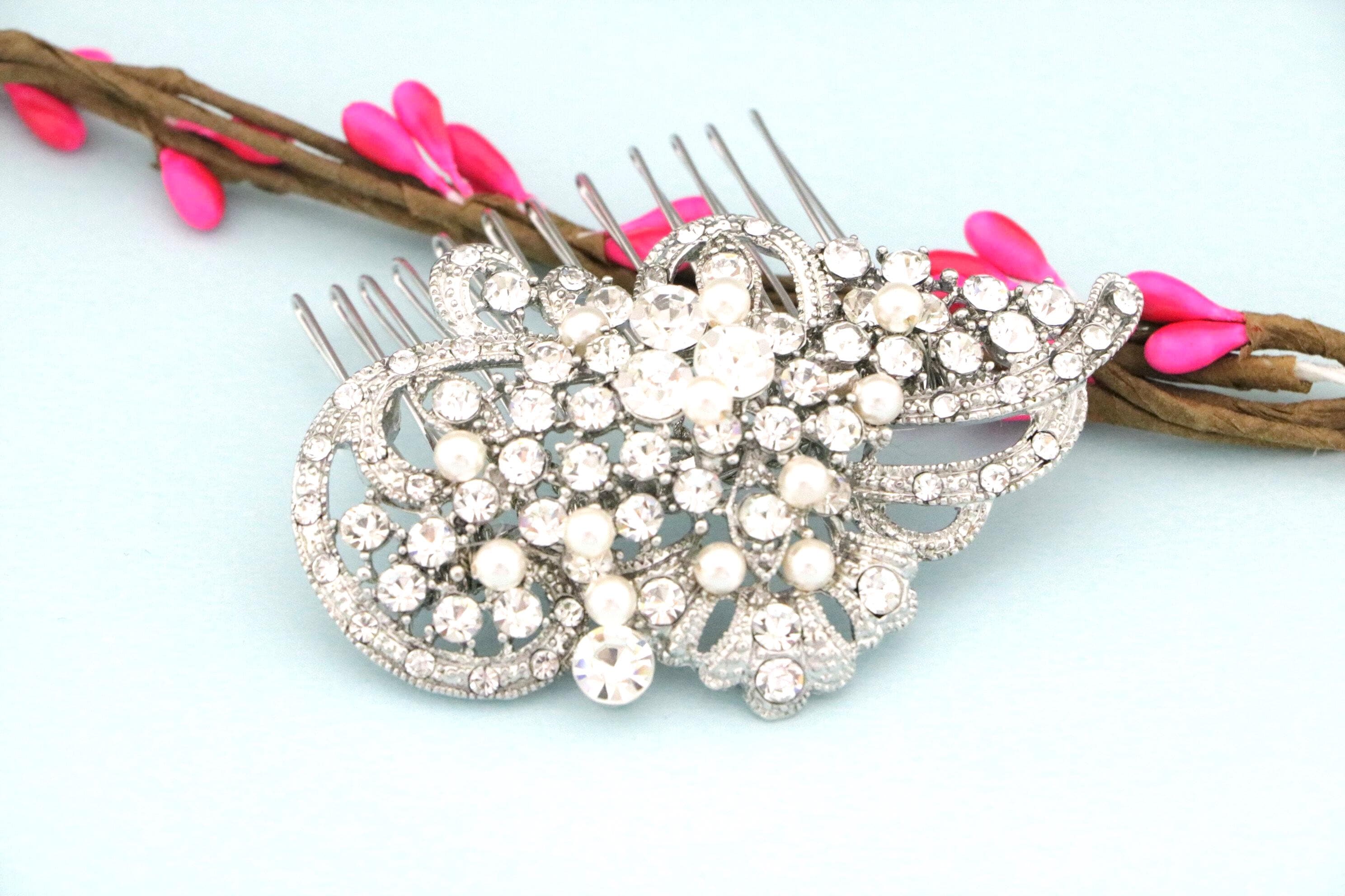 This sparkle rhinestone hair comb features a very beautiful sparkle rhinestone piece and Swarovski ivory pearls. Rhinestone piece and pearls are wired on a silver tone metal comb. The Rhinestone part measures approximately 3 X 2 inches.