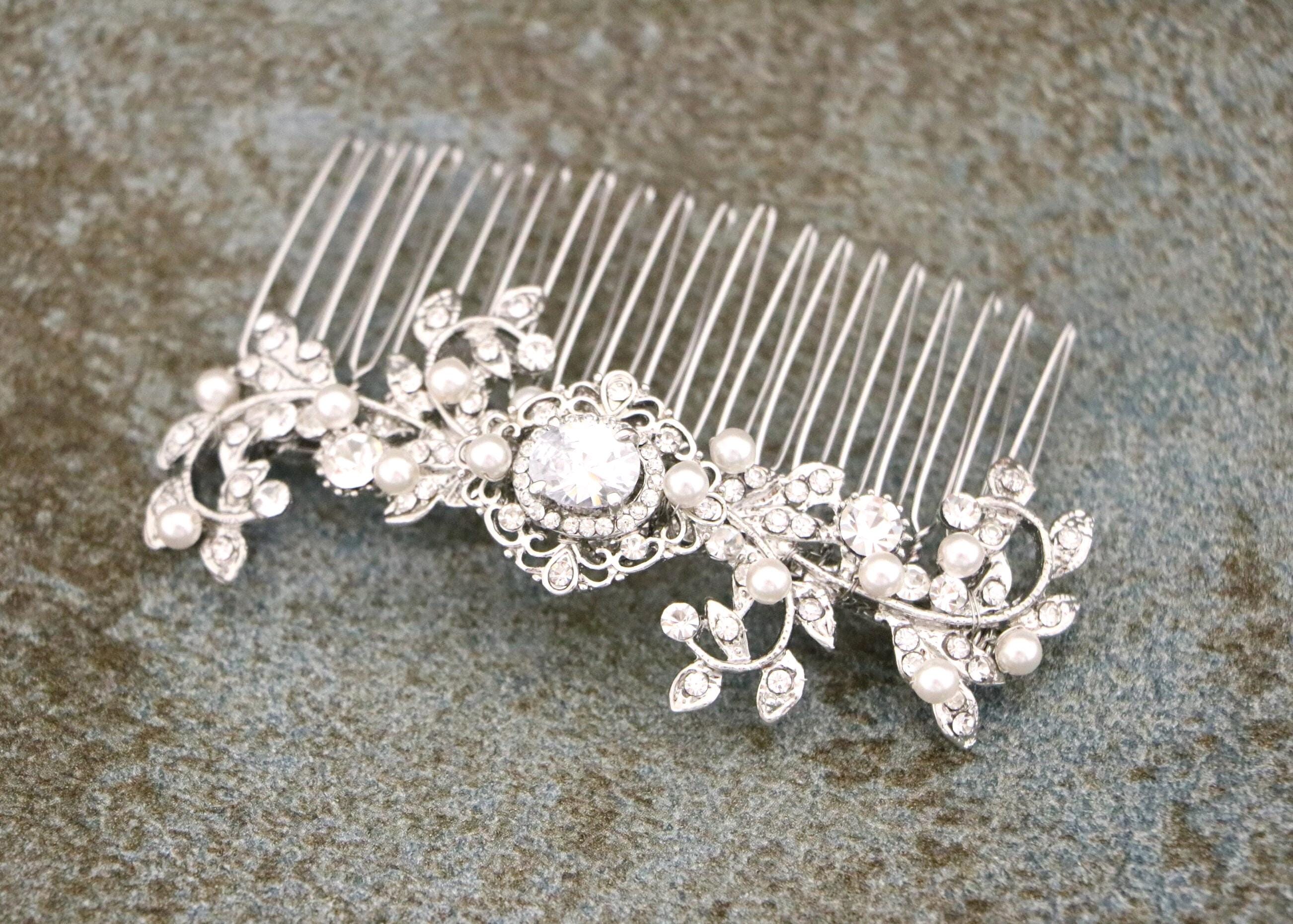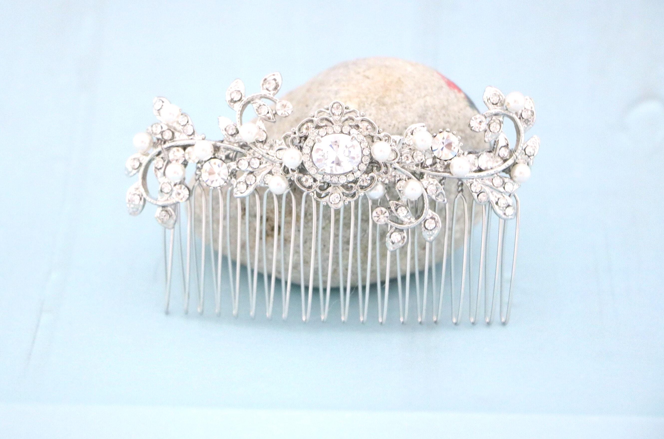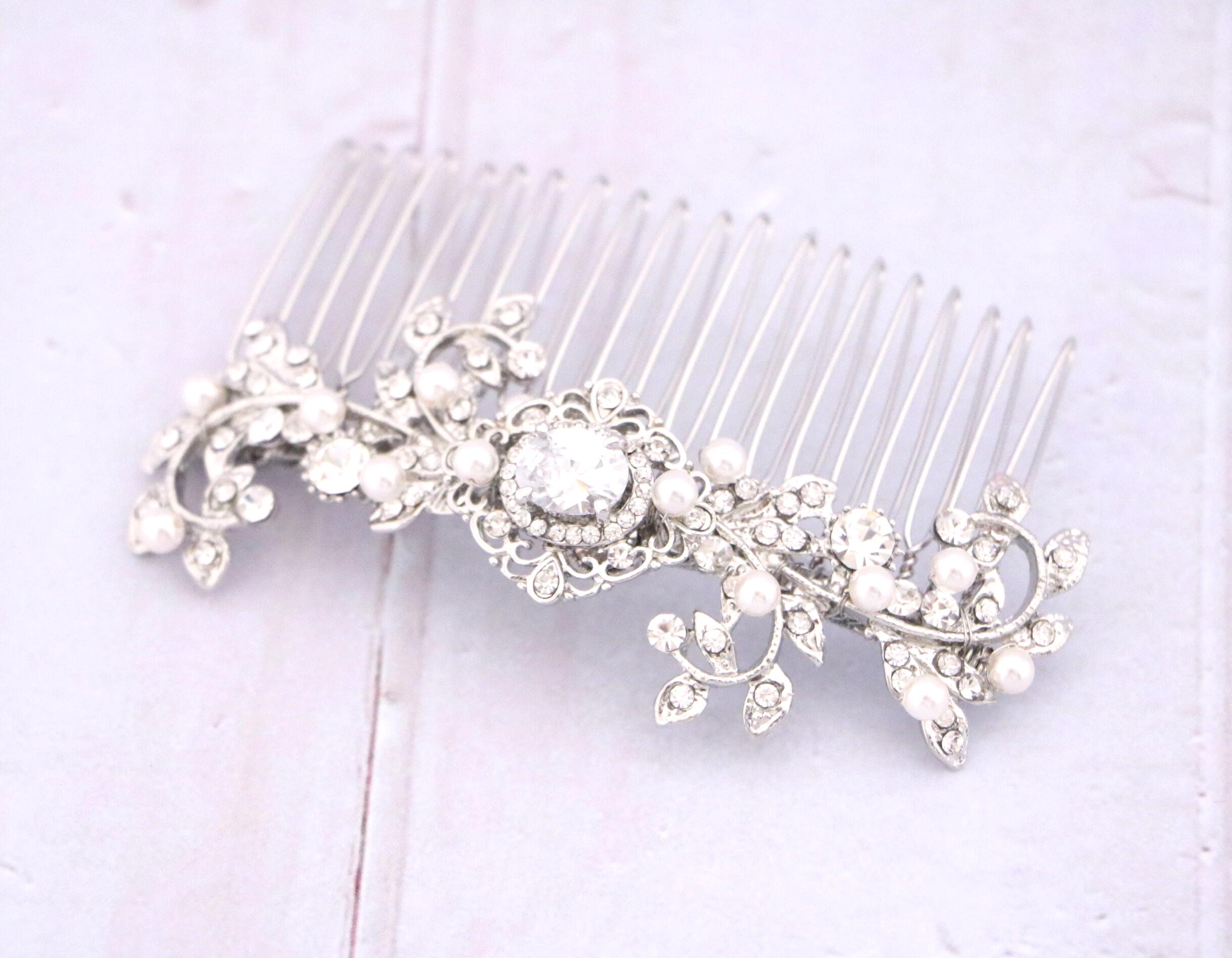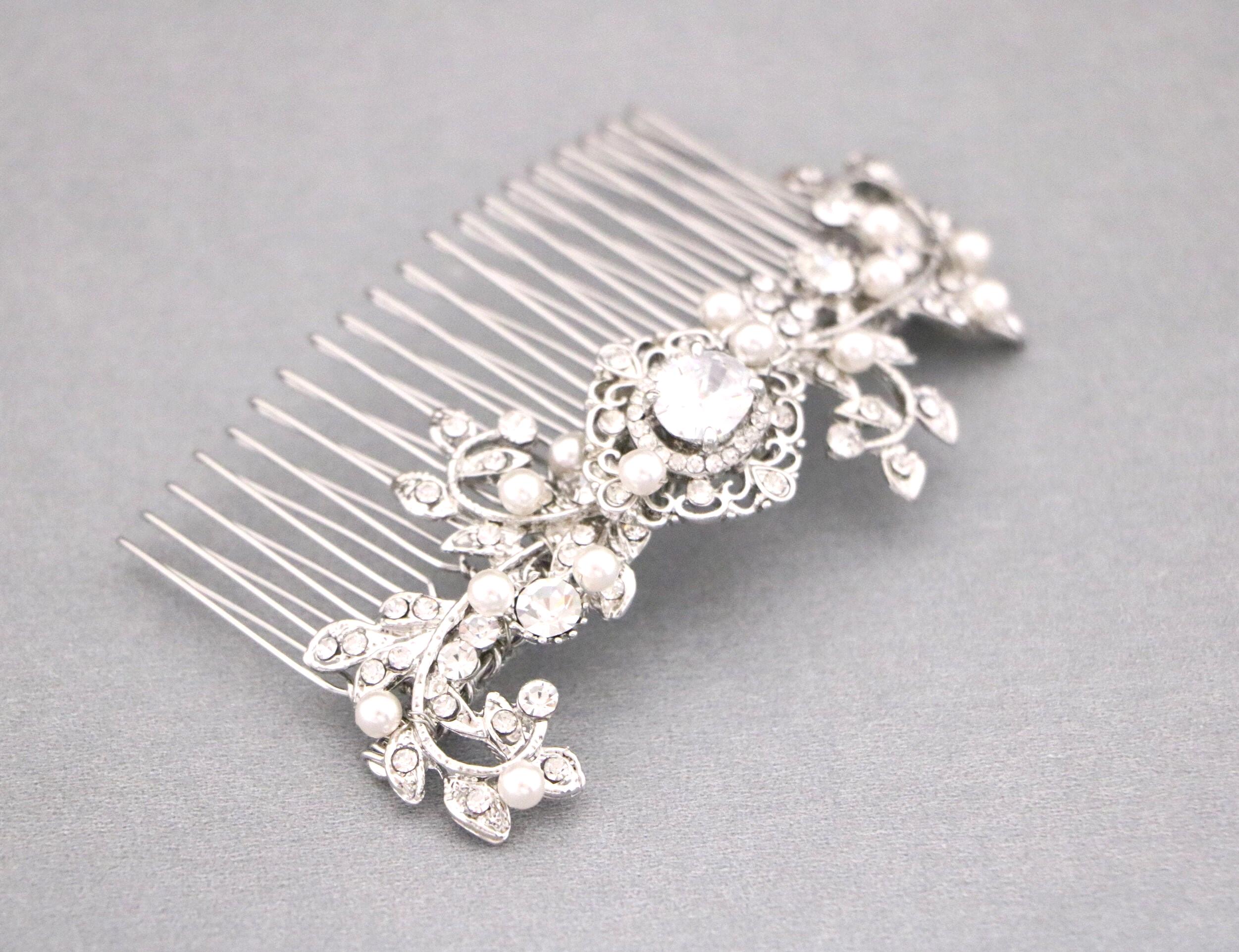 This sparkle rhinestone hair comb features a very beautiful vintage style rhinestone piece and swarovski ivory pearls. Rhinestone piece and pearls are wired on a silver tone metal comb. The rhinestone part measures approximately 3.5 X 1 inches.