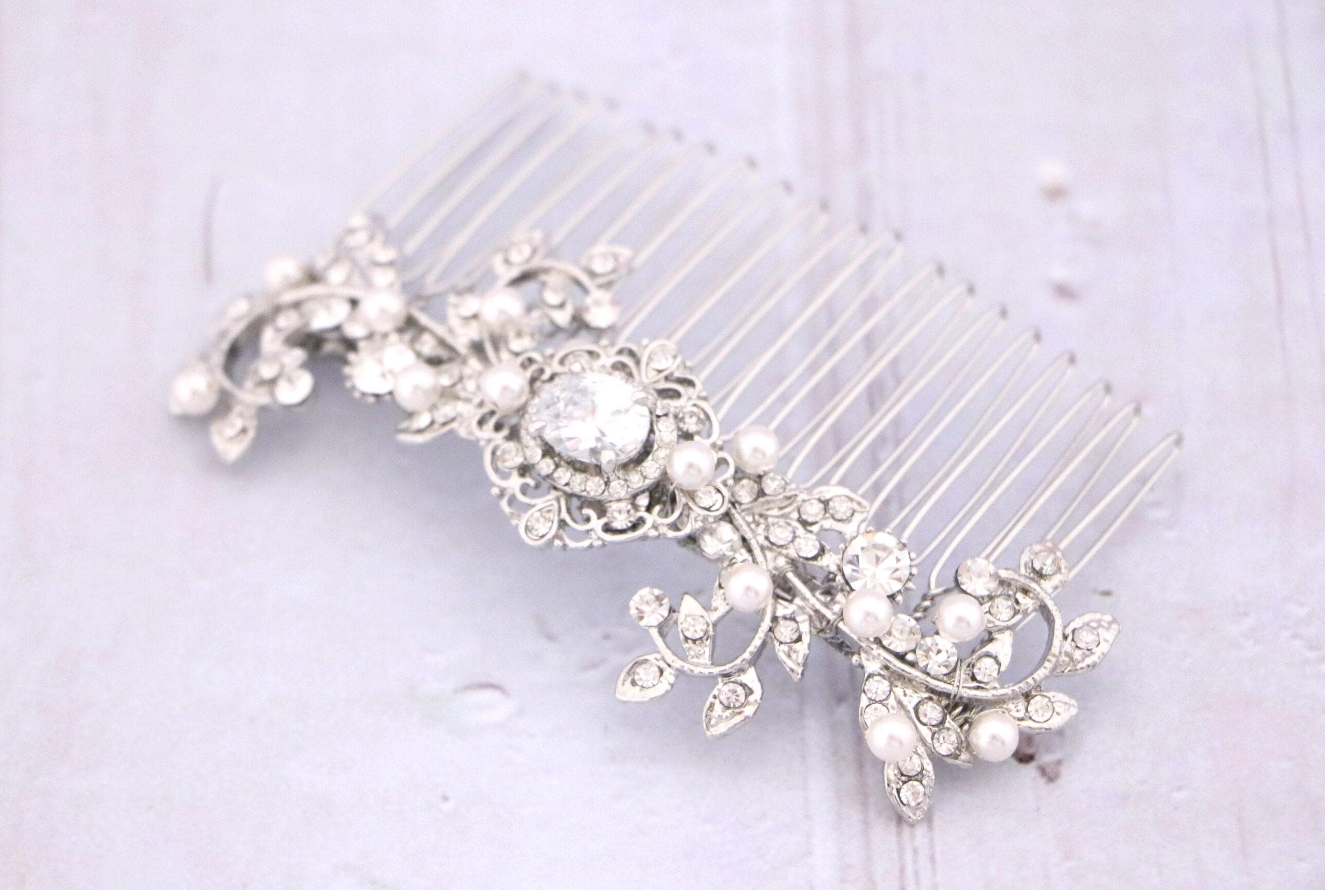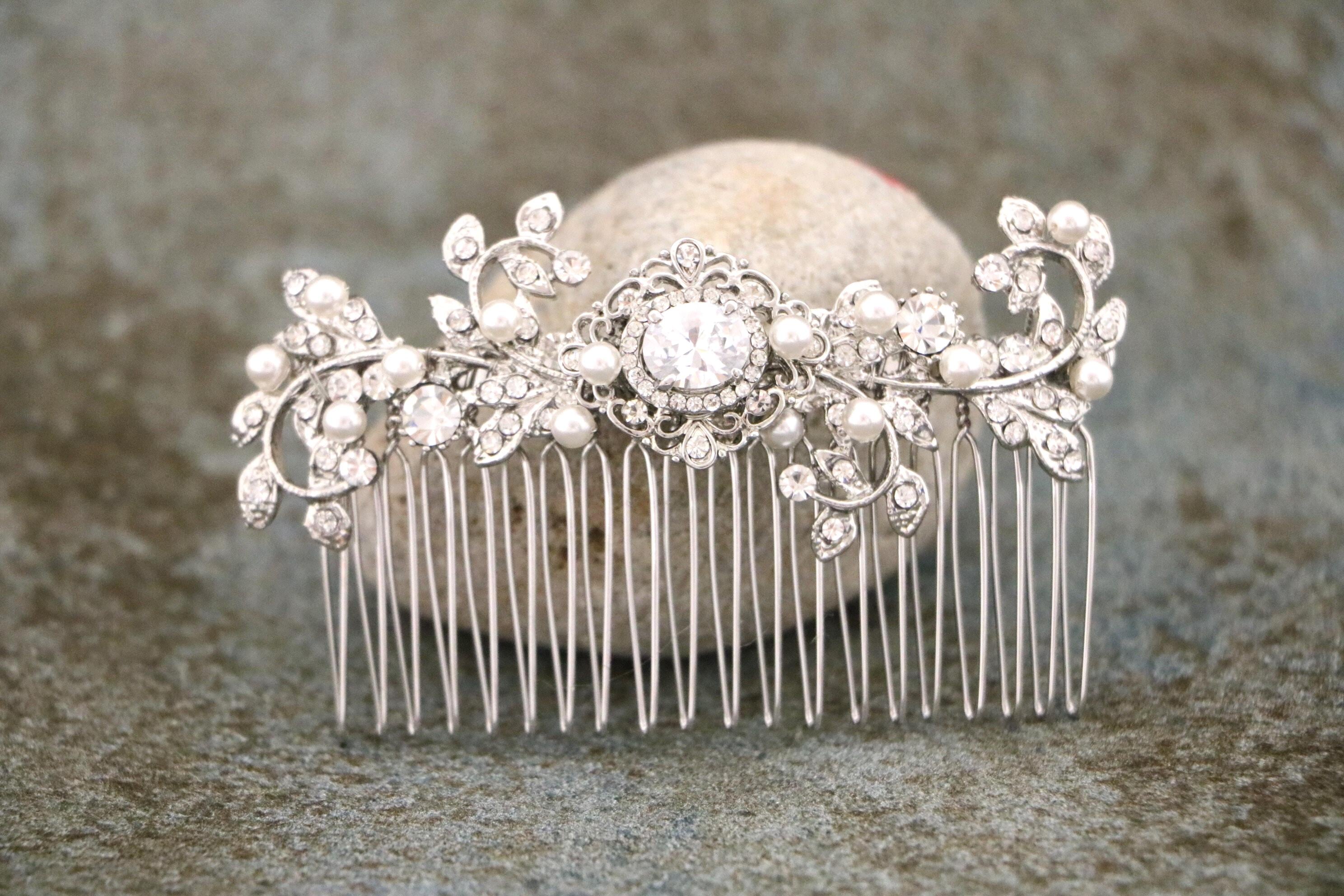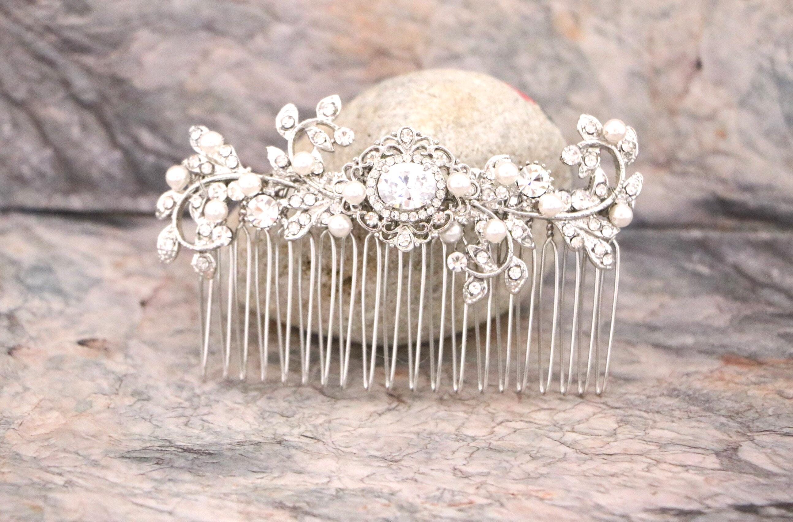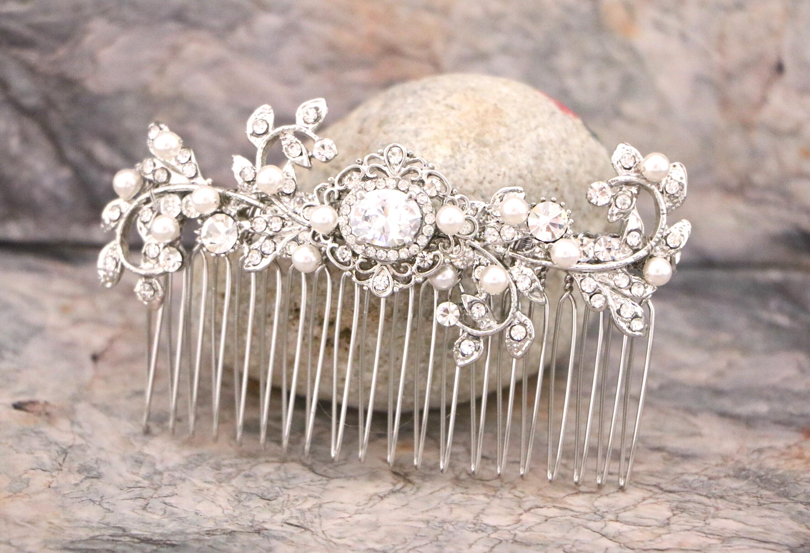 This sparkle rhinestone hair comb features a very beautiful vintage style rhinestone piece and swarovski ivory pearls. Rhinestone piece and pearls are wired on a silver tone metal comb. The rhinestone part measures approximately 3.5 X 1 inches.