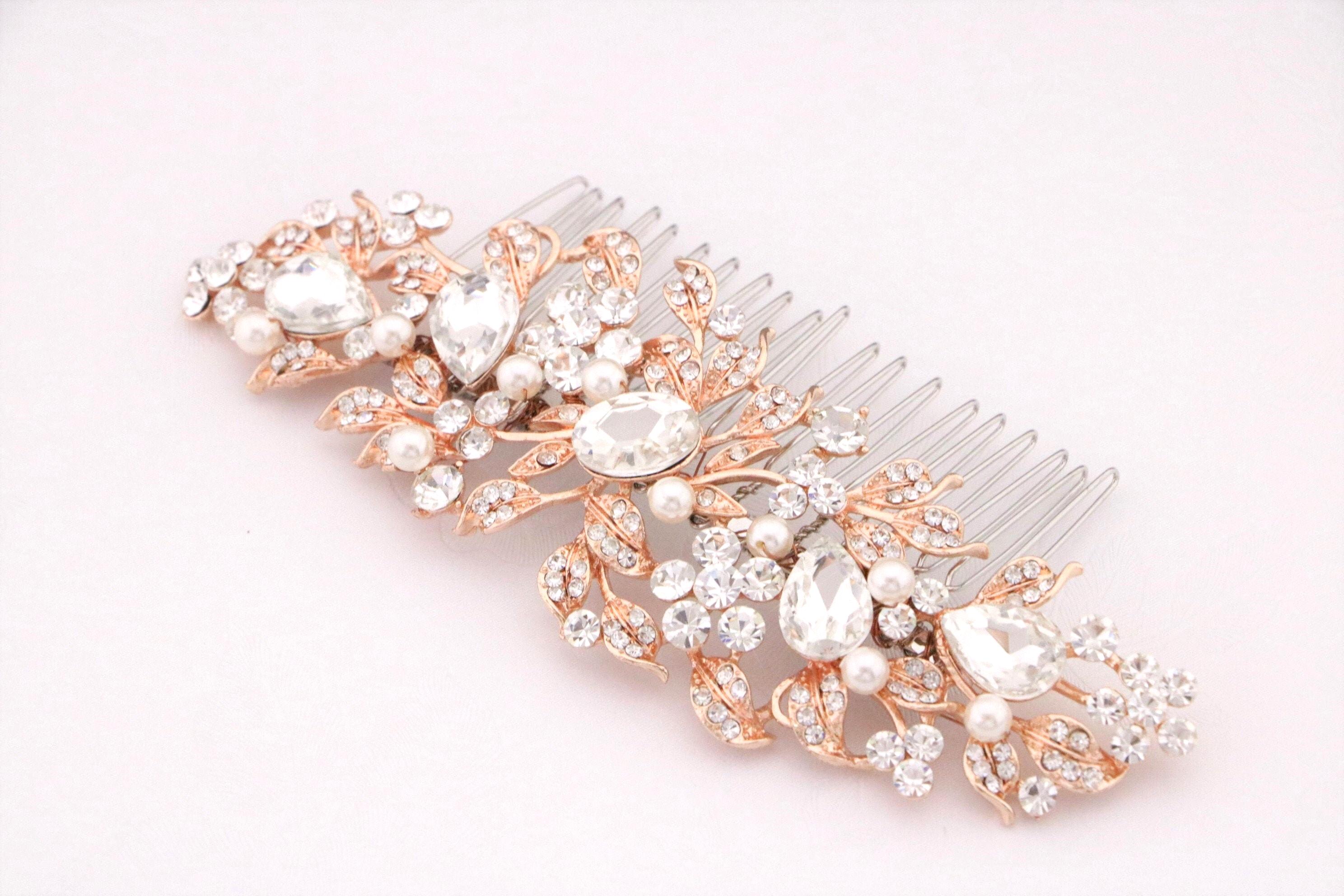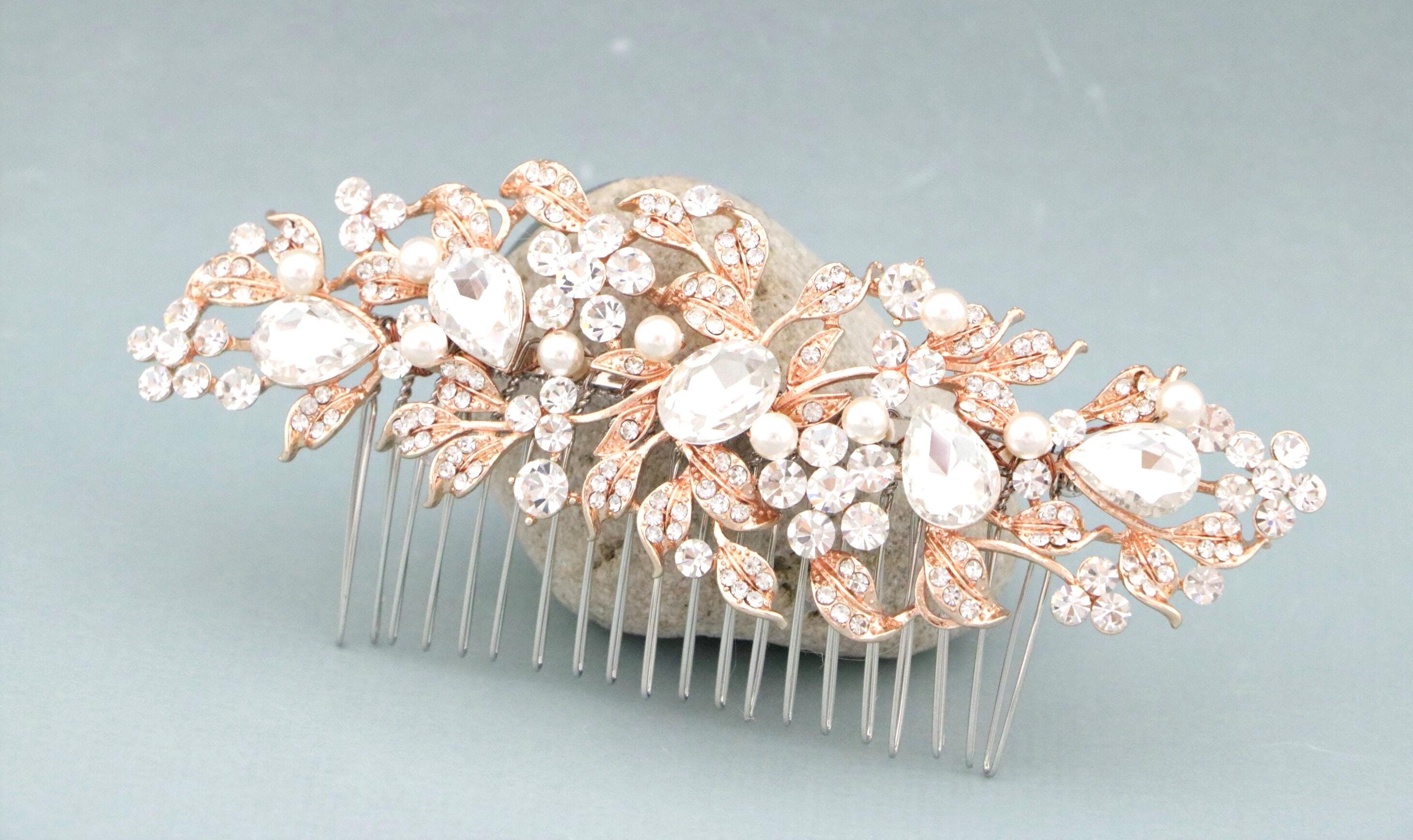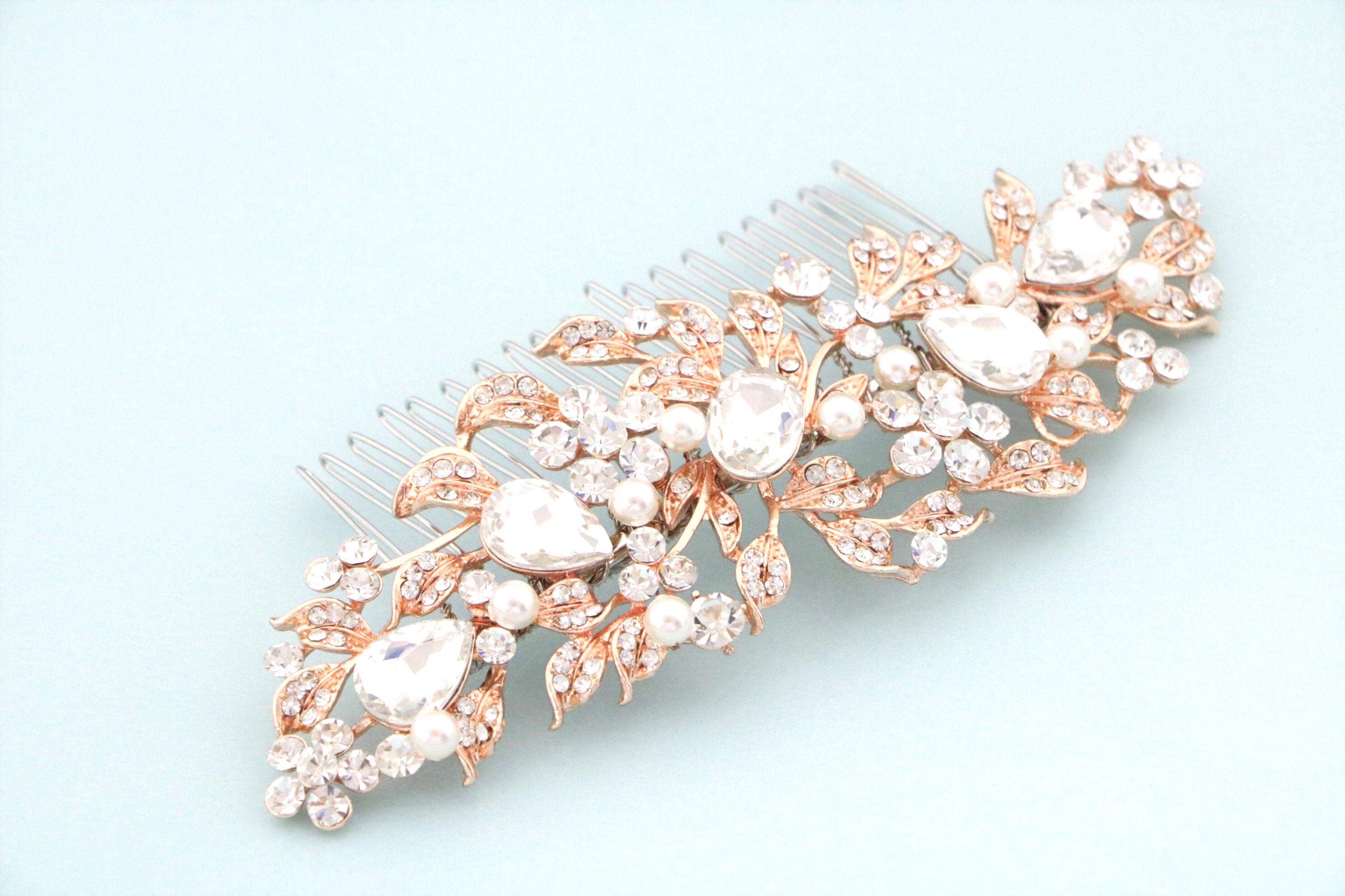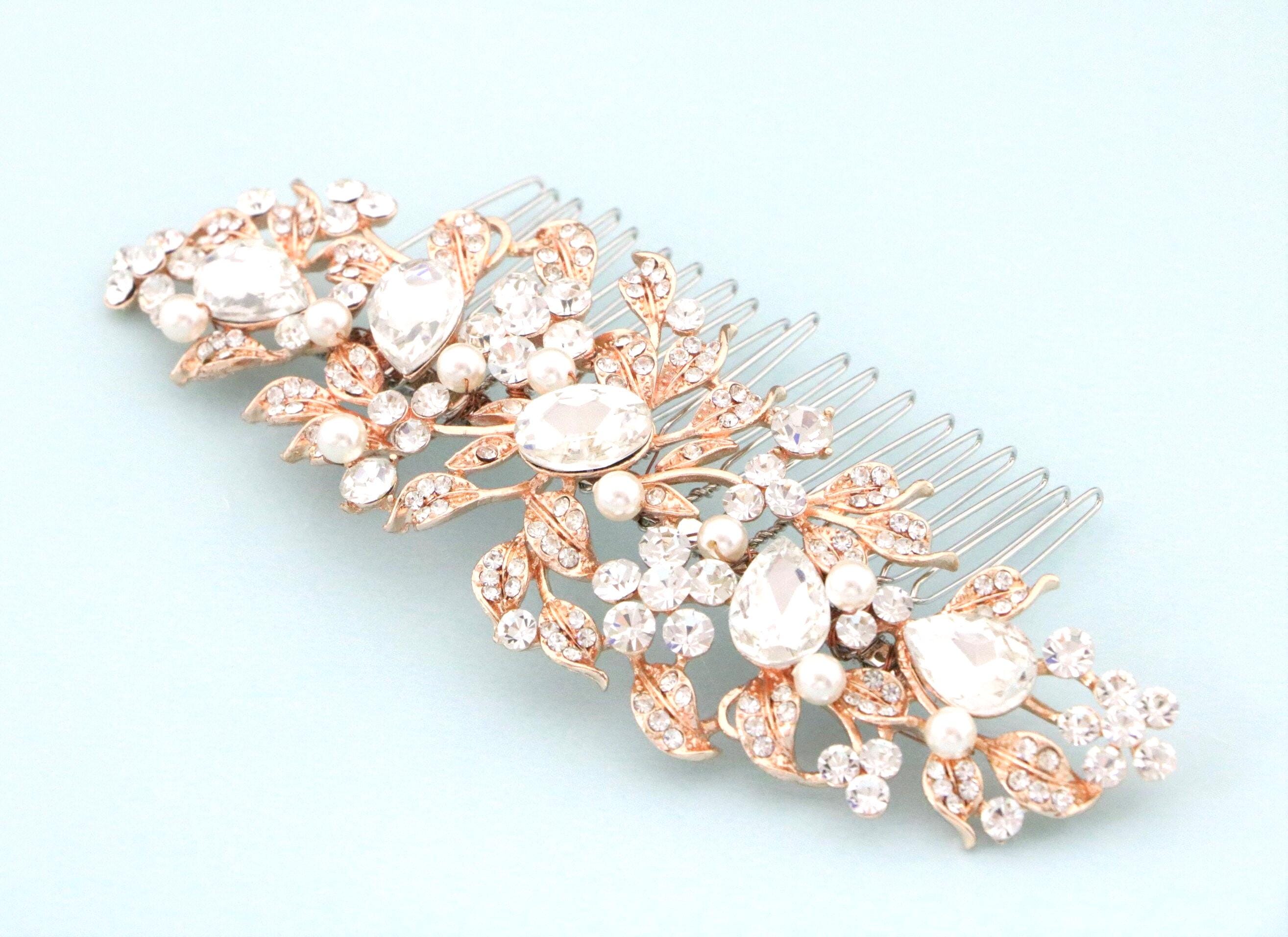 This sparkle rhinestone hair comb features a very beautiful vintage style rhinestone piece and Swarovski ivory pearls. Rhinestone piece and pearls are wired on a silver tone metal comb. The rhinestone part measures approximately 5.25 X 1.5 inches.