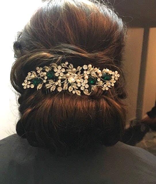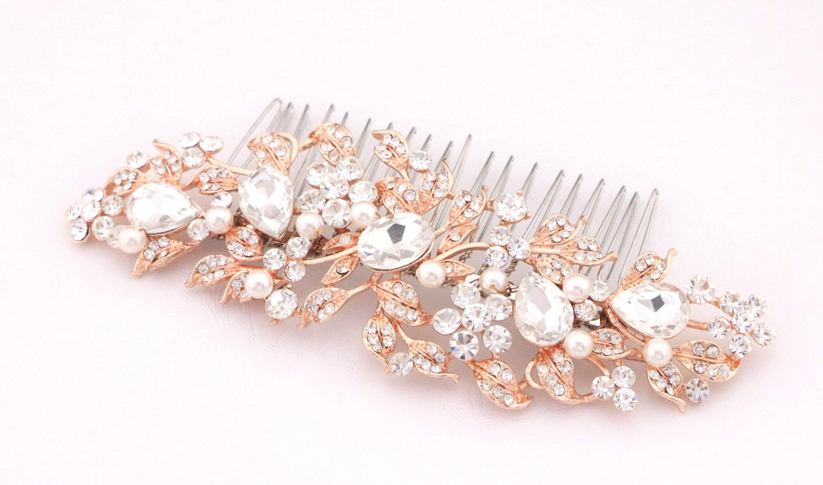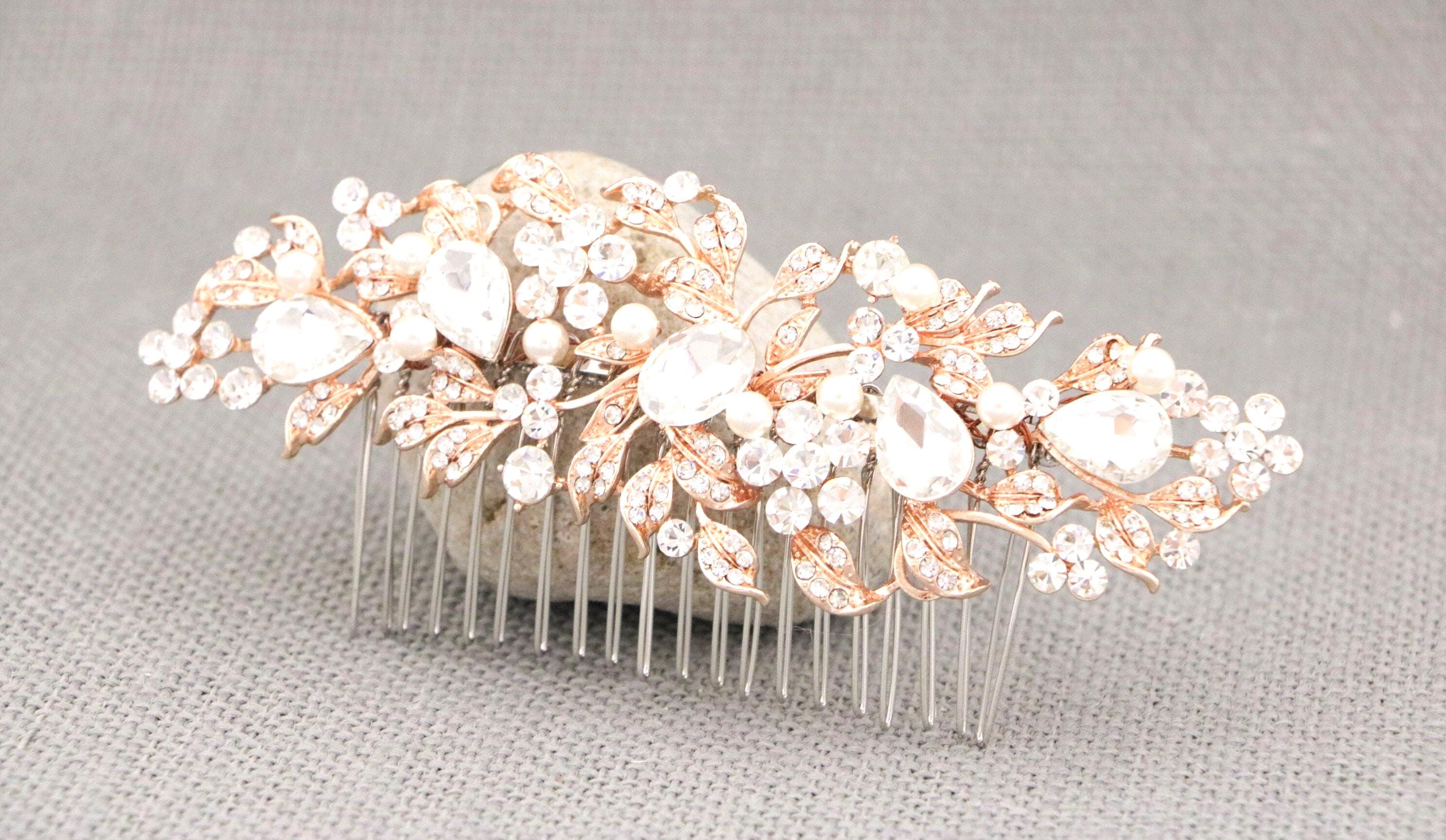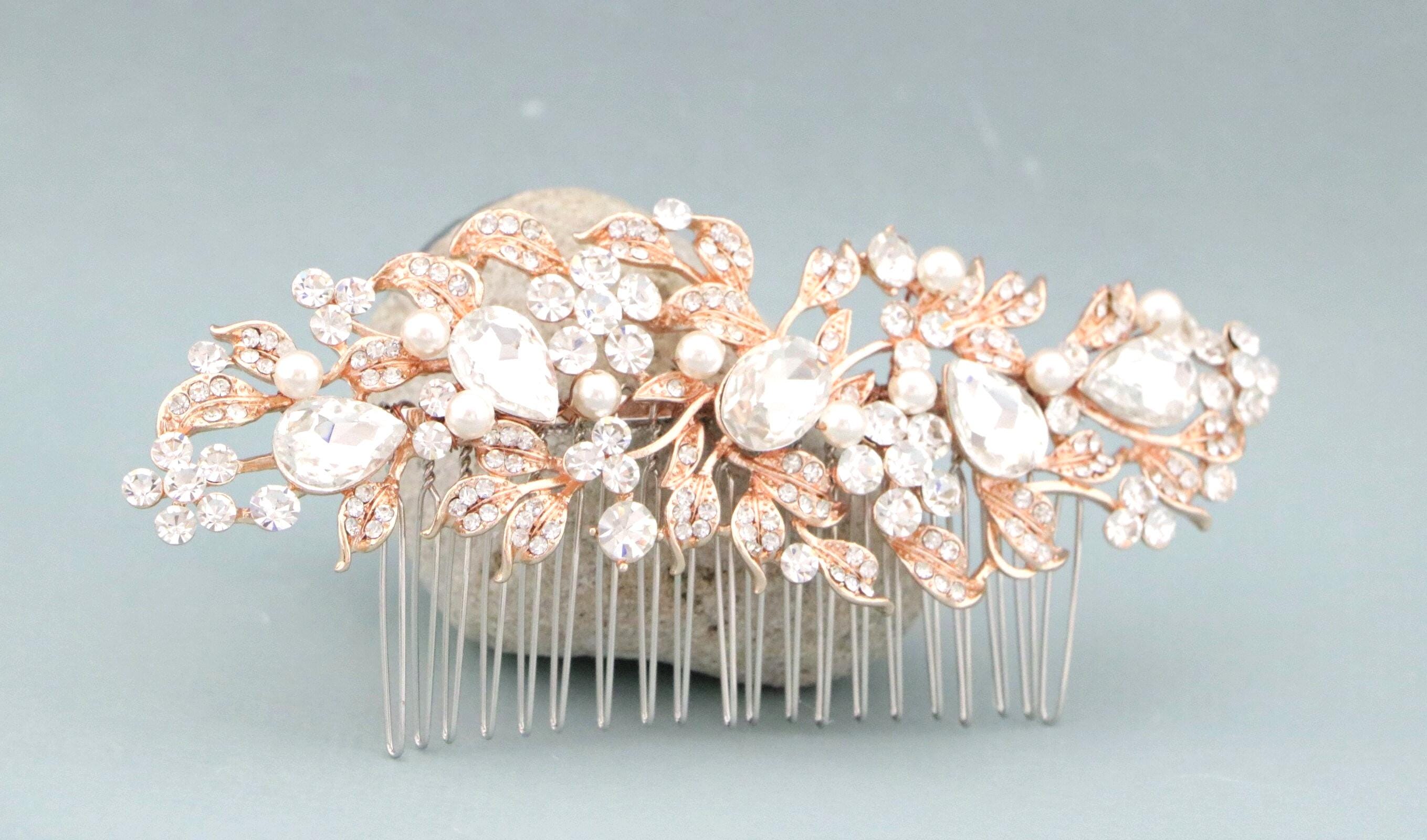 This sparkle rhinestone hair comb features a very beautiful vintage style rhinestone piece and Swarovski ivory pearls. Rhinestone piece and pearls are wired on a silver tone metal comb. The rhinestone part measures approximately 5.25 X 1.5 inches.