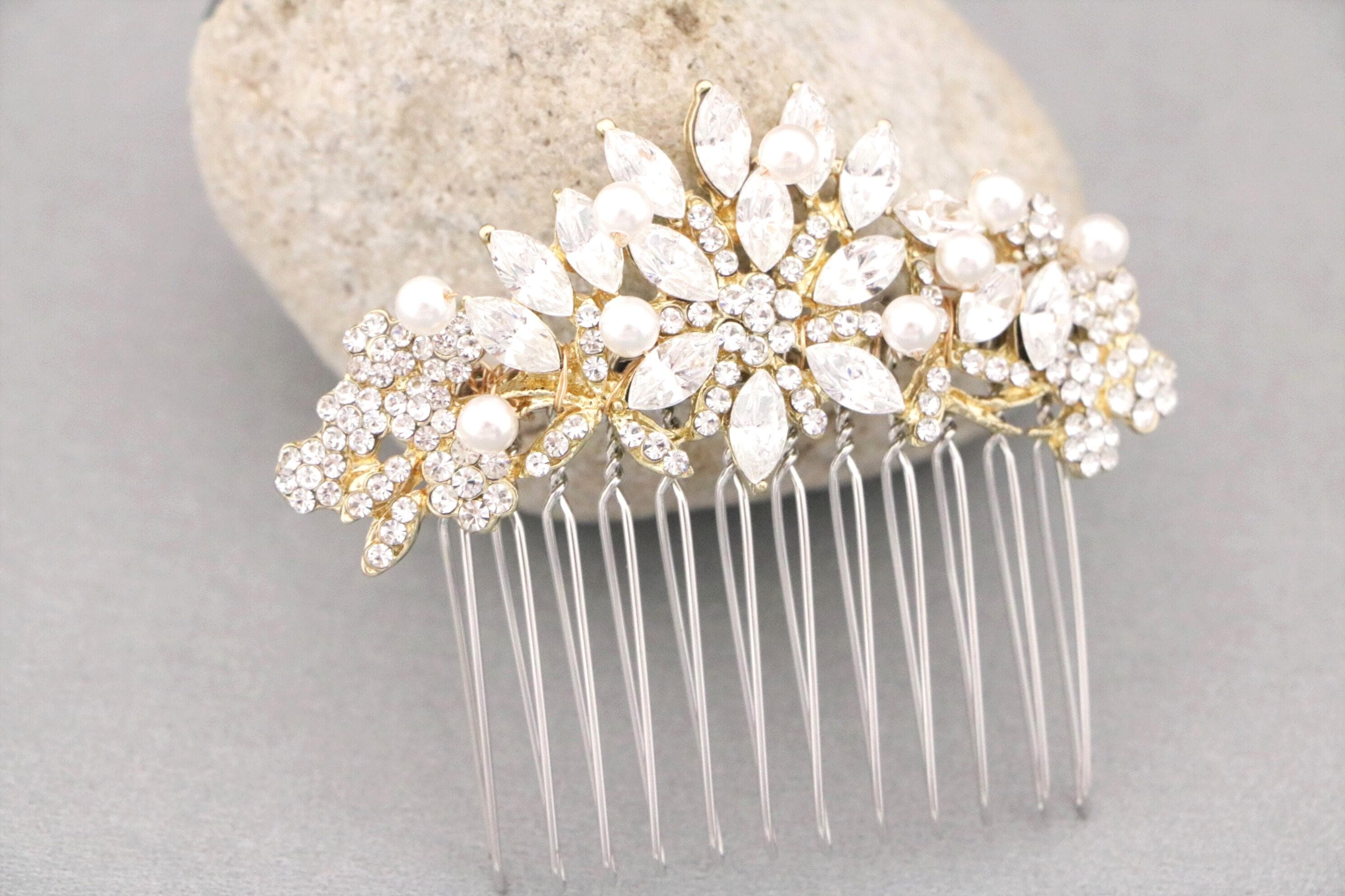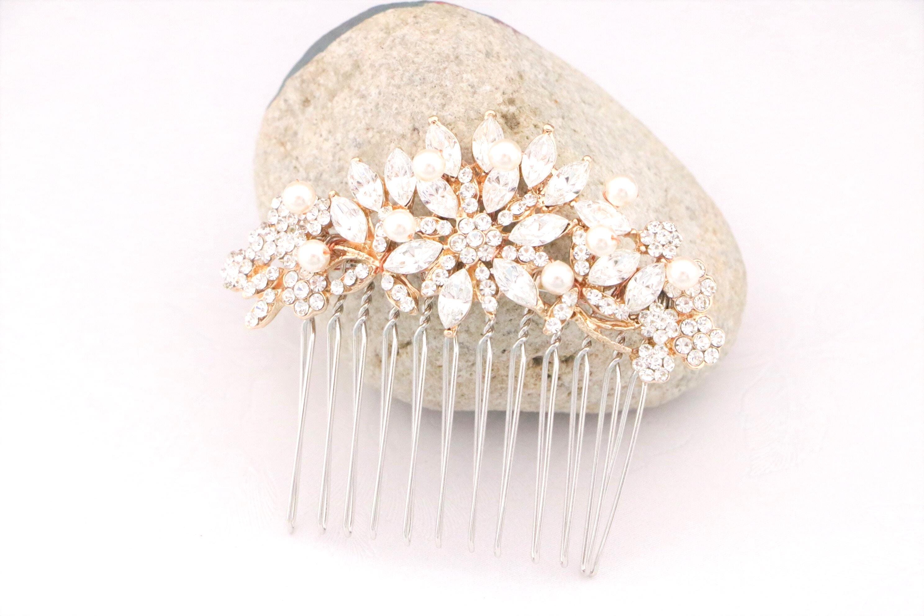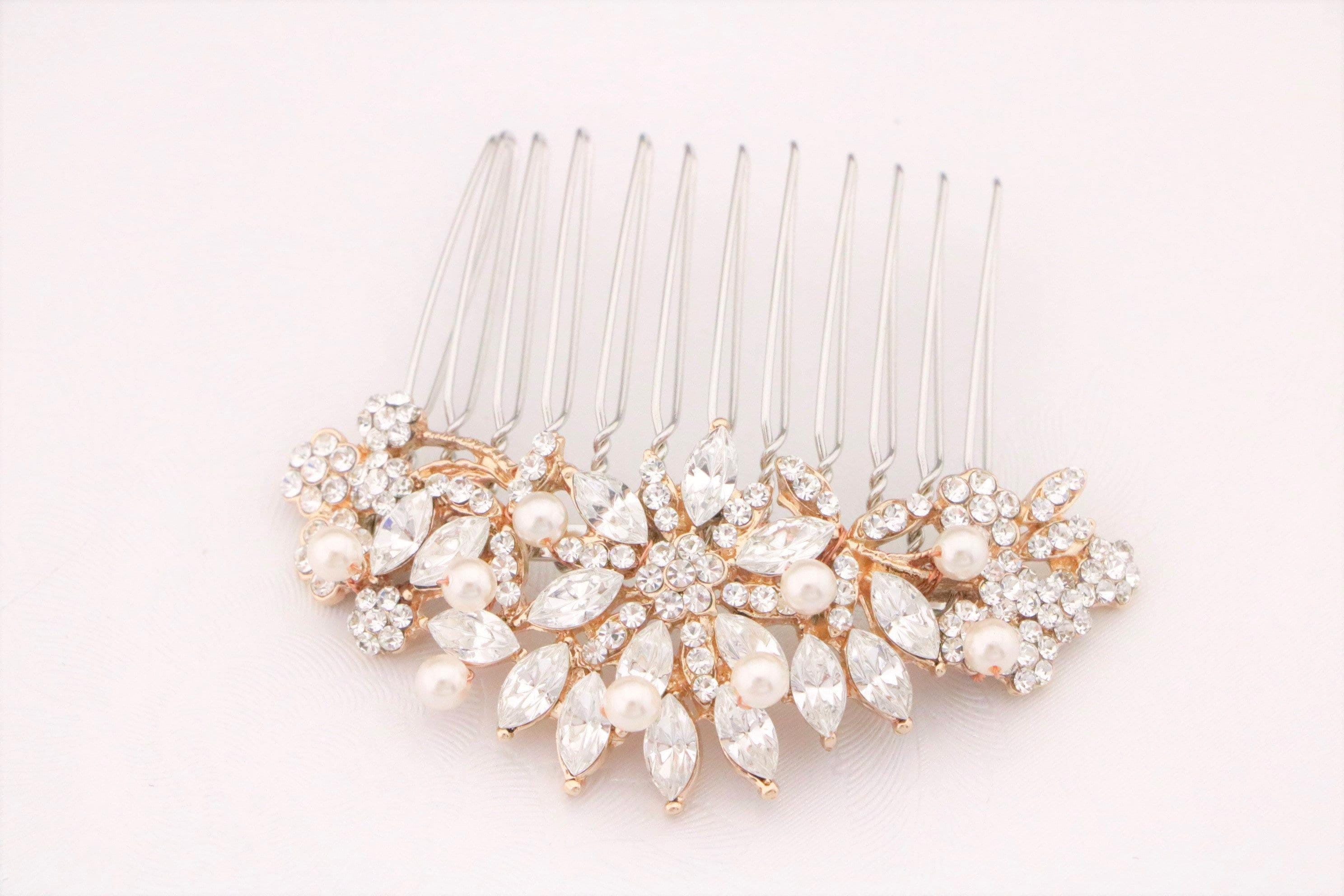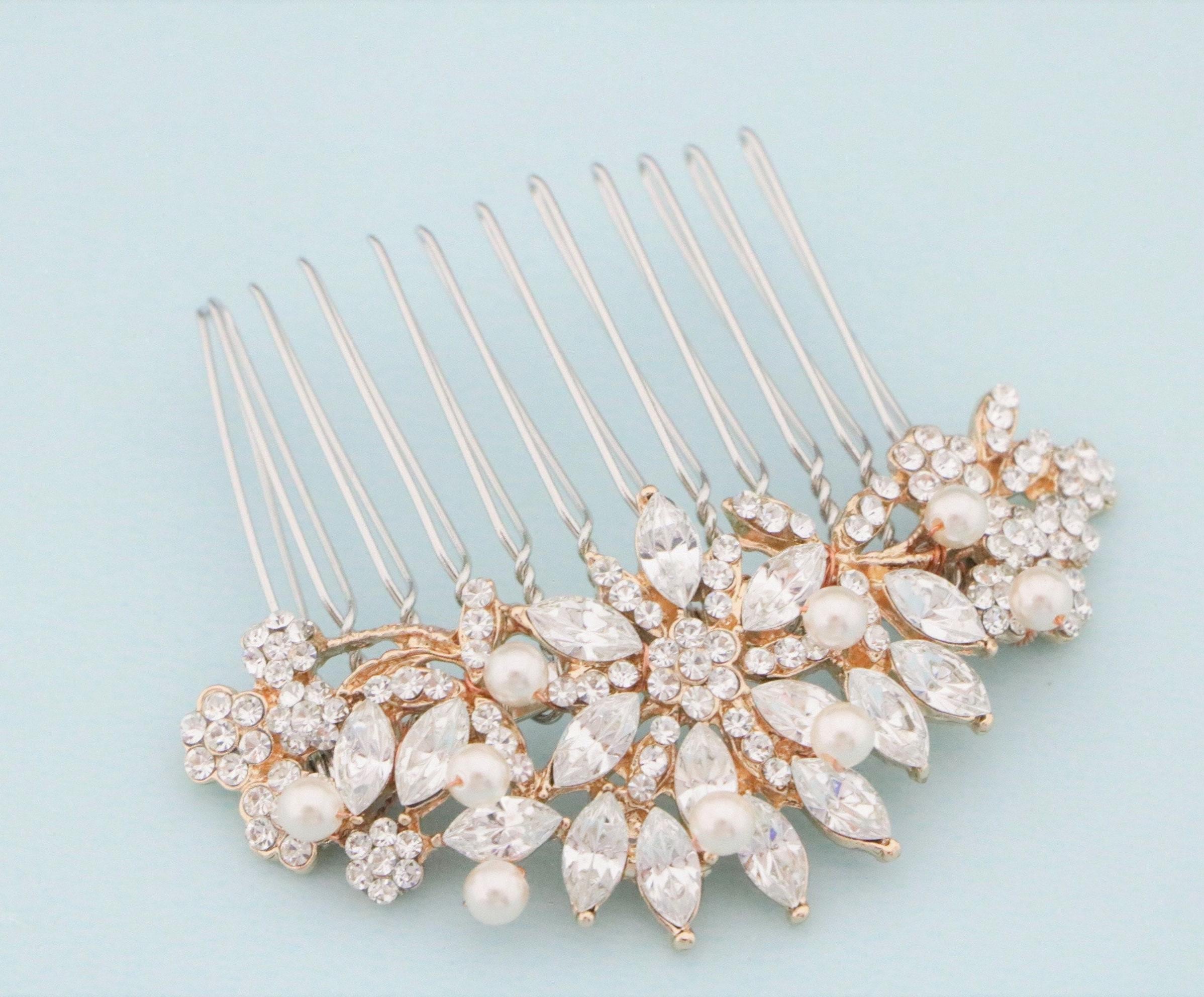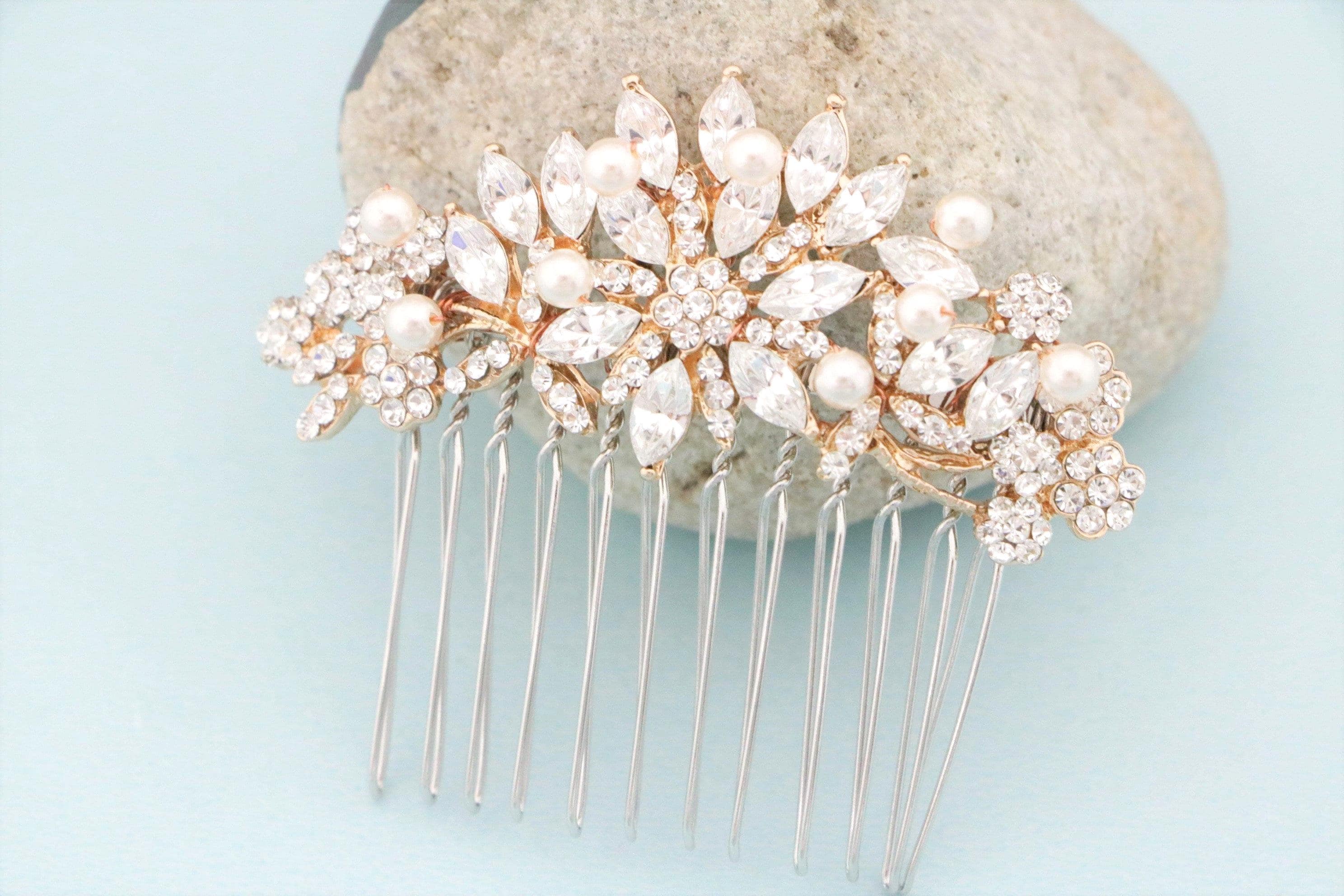 This beautiful Clear rhinestone Swarovski pearl hair comb is a perfect compliment for the wedding party and can easily fit into any hair style.