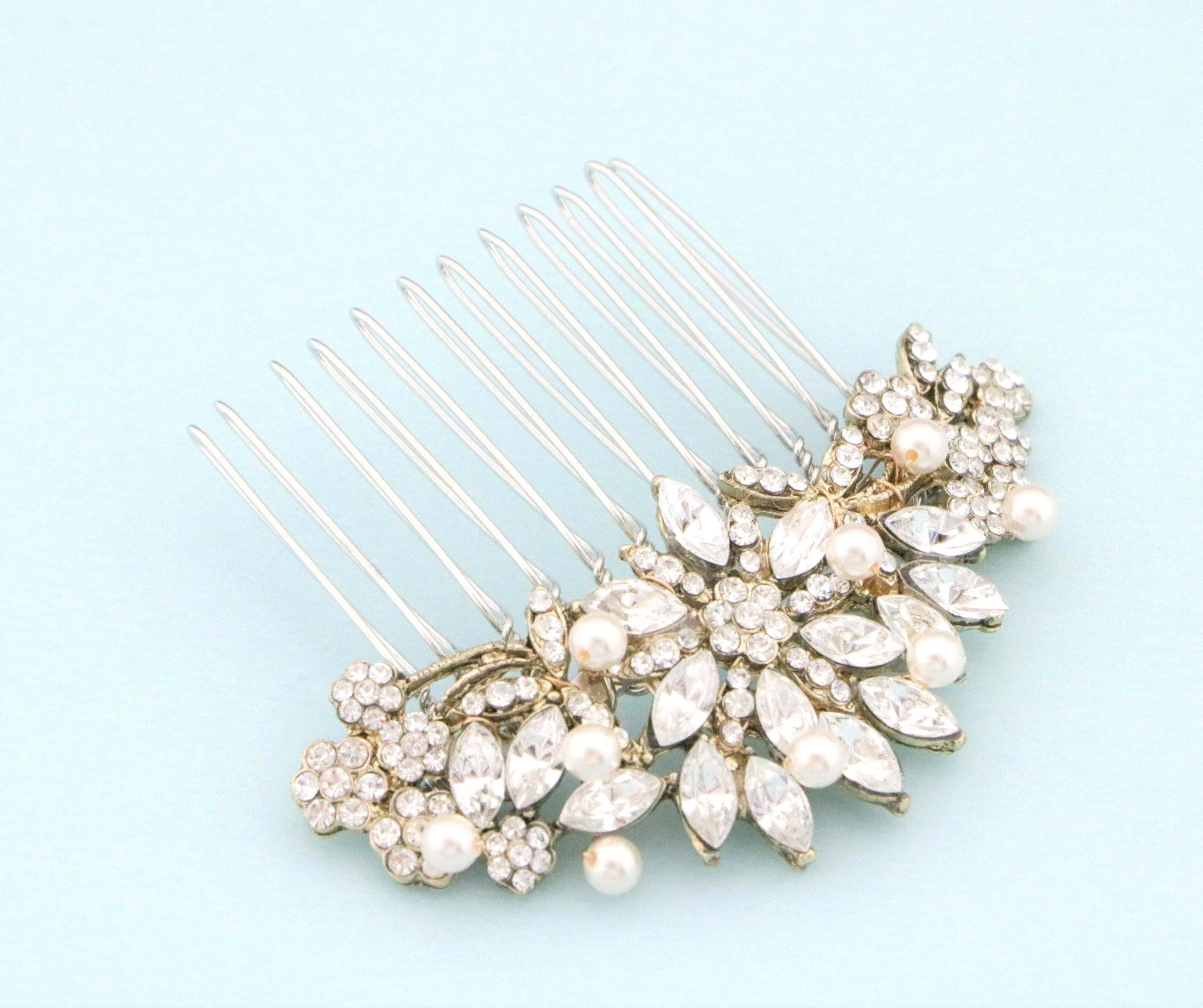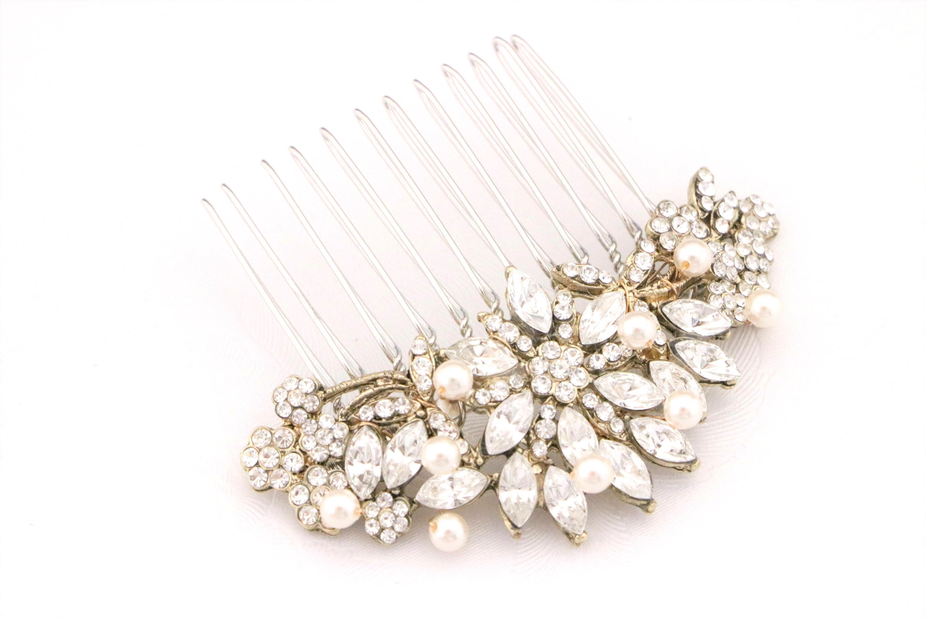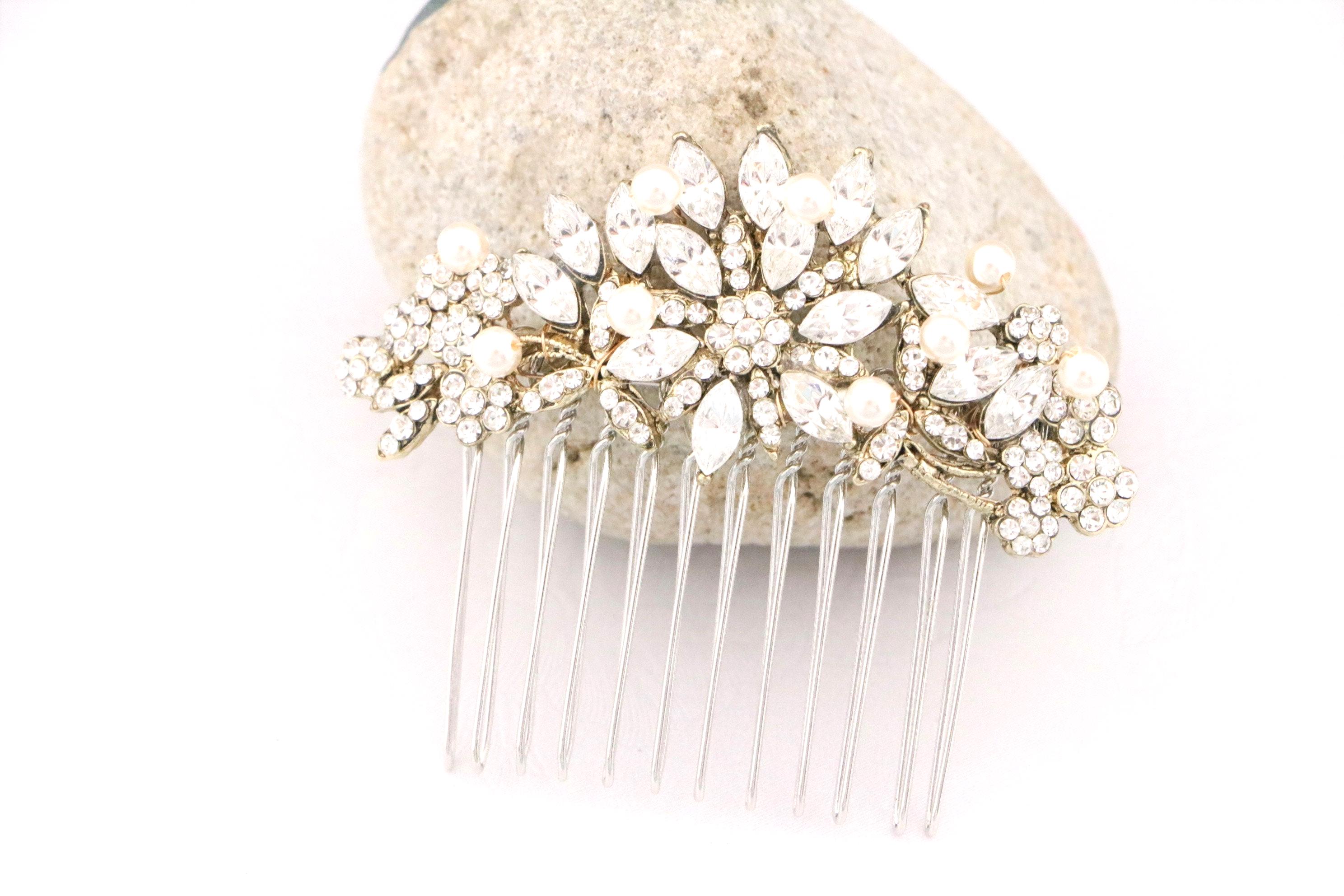 This beautiful Clear rhinestone Swarovski pearl hair comb is a perfect compliment for the wedding party and can easily fit into any hair style.