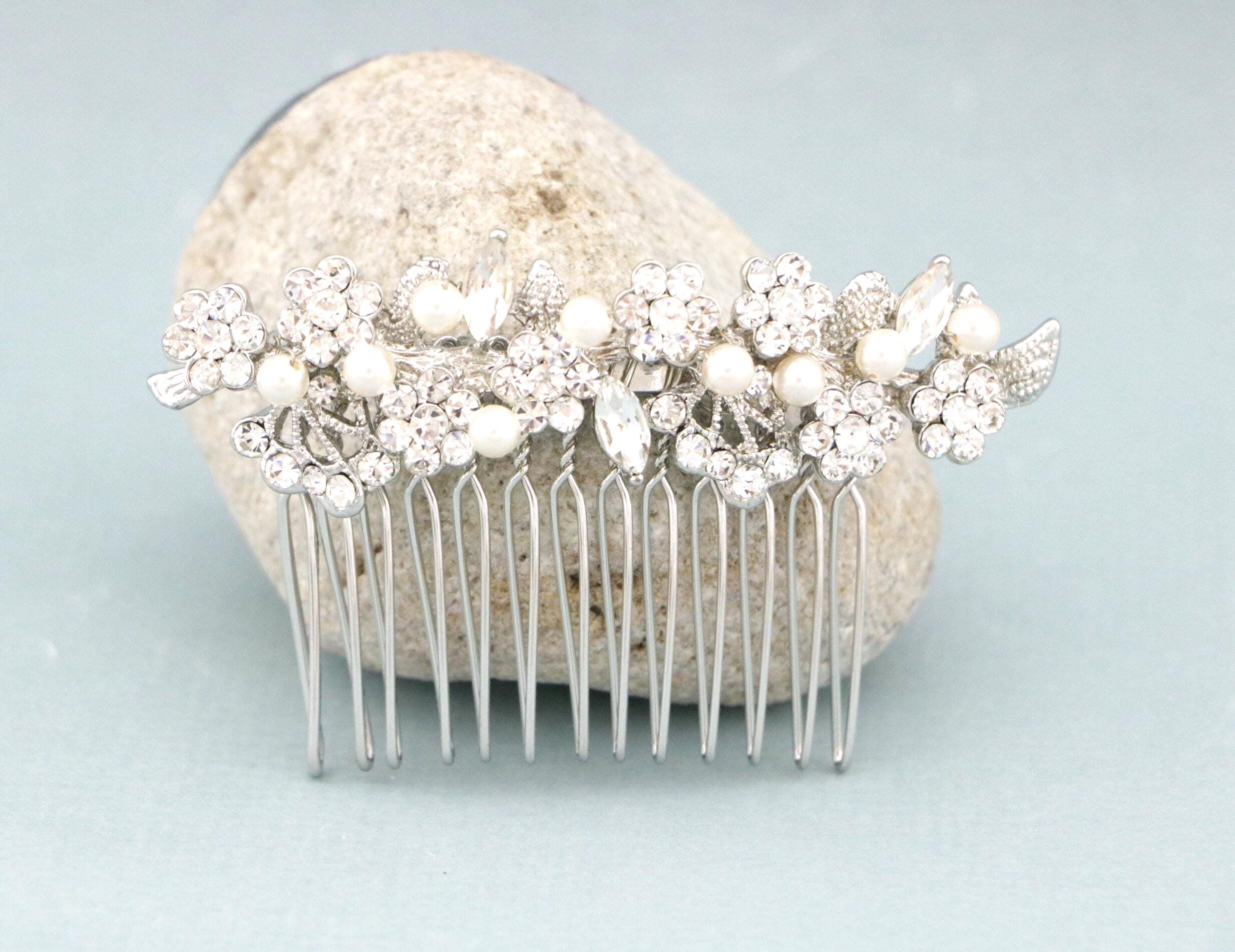 This sparkle rhinestone hair comb features a very beautiful vintage style rhinestone piece and swarovski ivory pearls. Rhinestone piece and pearls are wired on a silver tone metal comb. The Rhinestone part measures approximately 3 X 0.75 inches. This is not a large headpiece.
